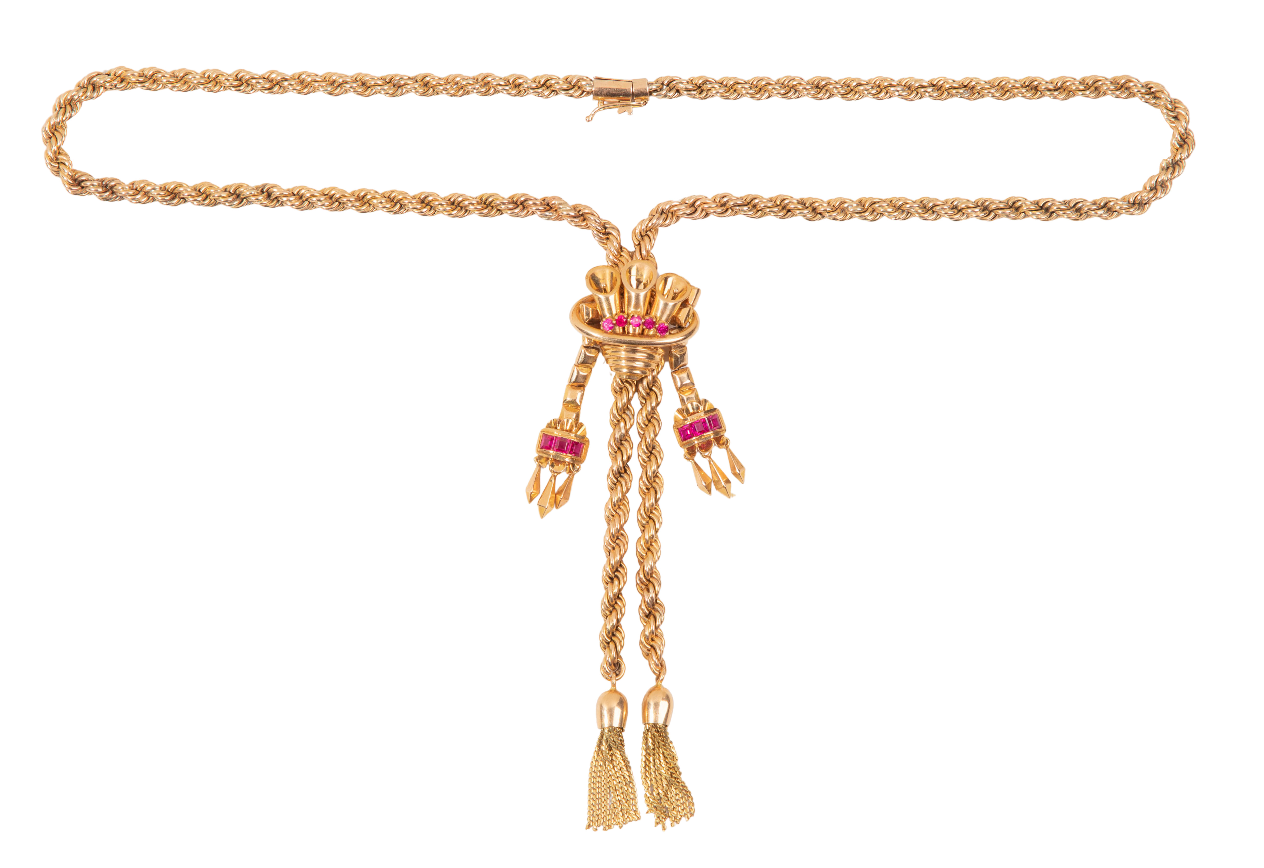 A twisted rope, bolo style necklace having tassels and a floral motif faux slider with ruby accents (unmarked gold)