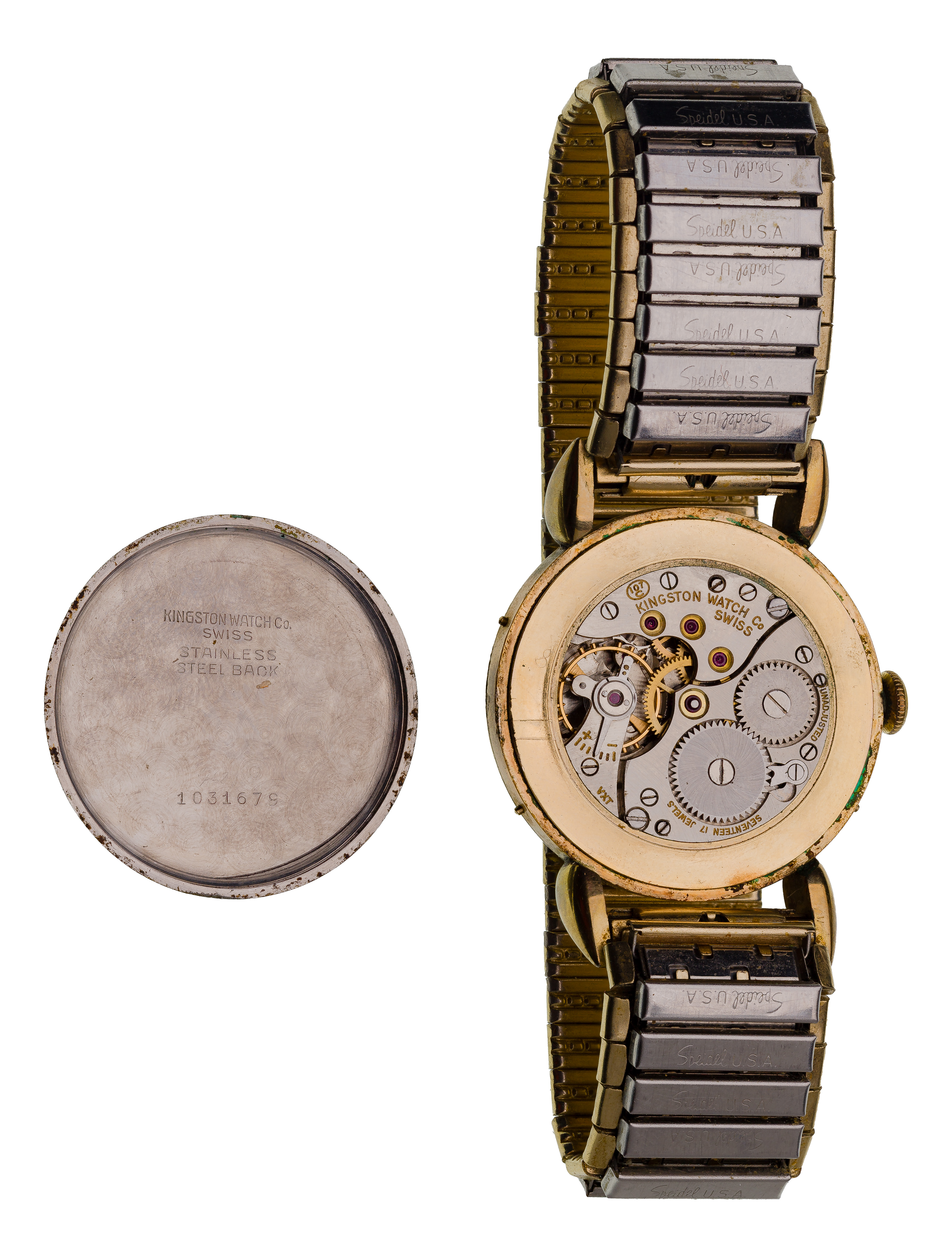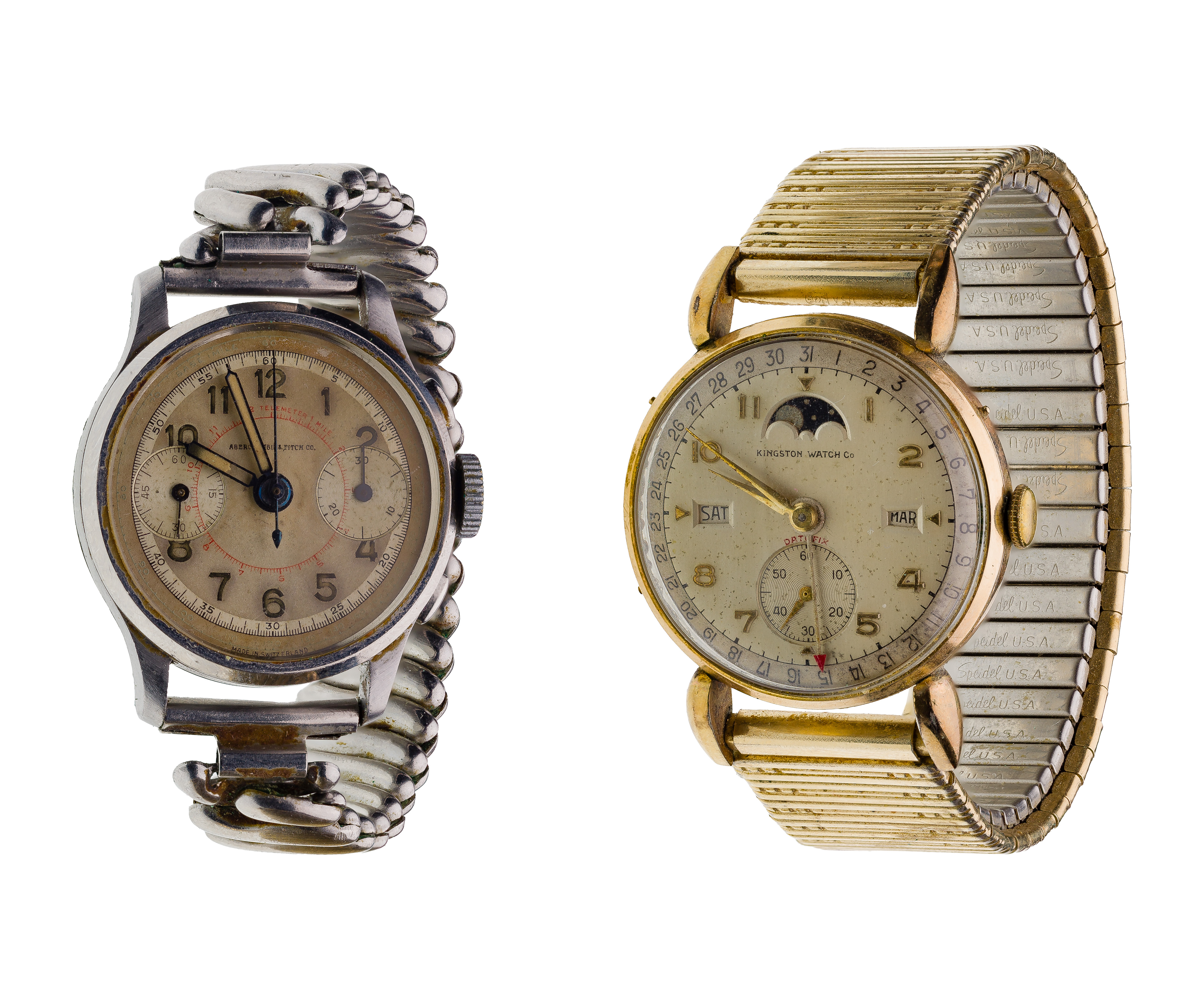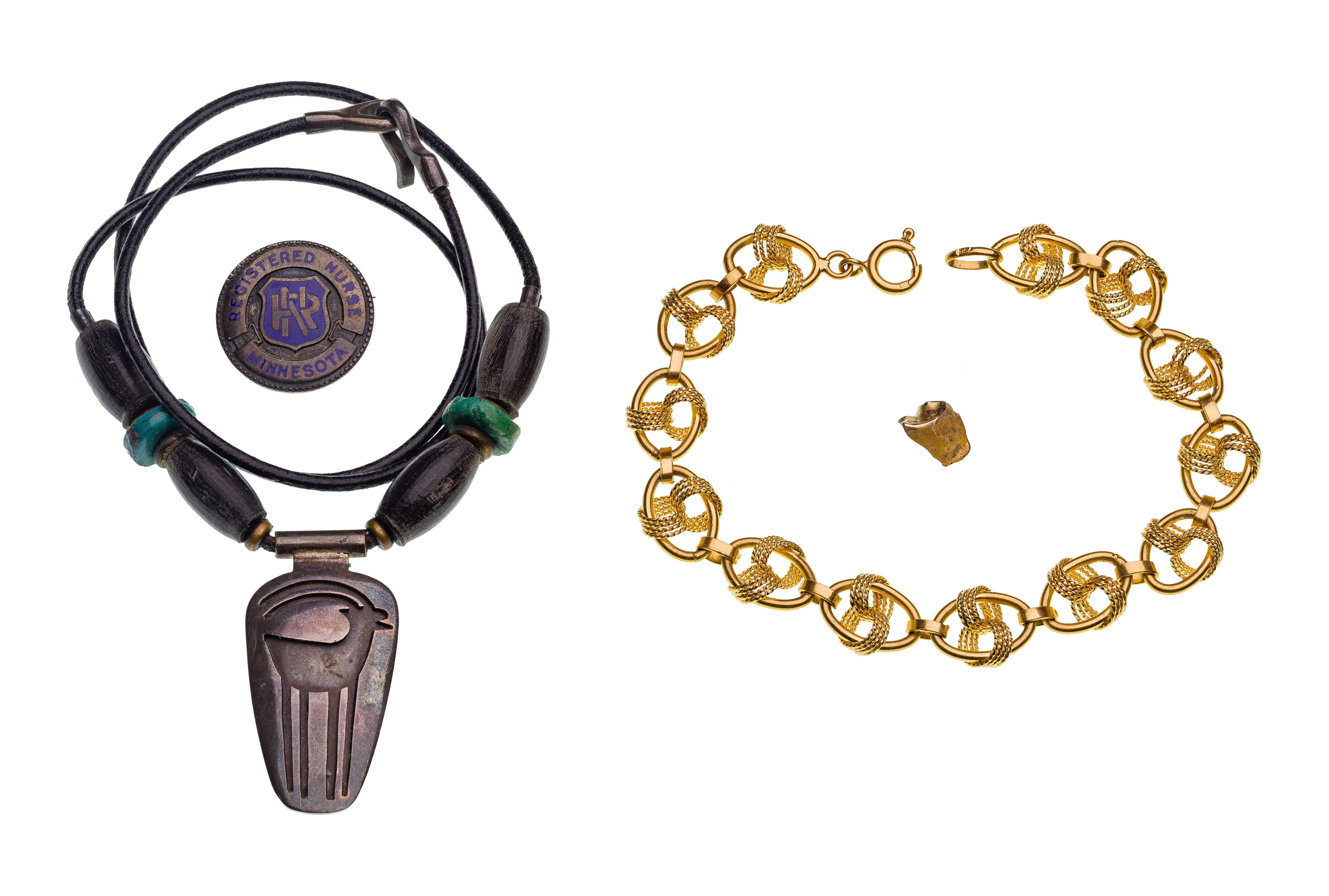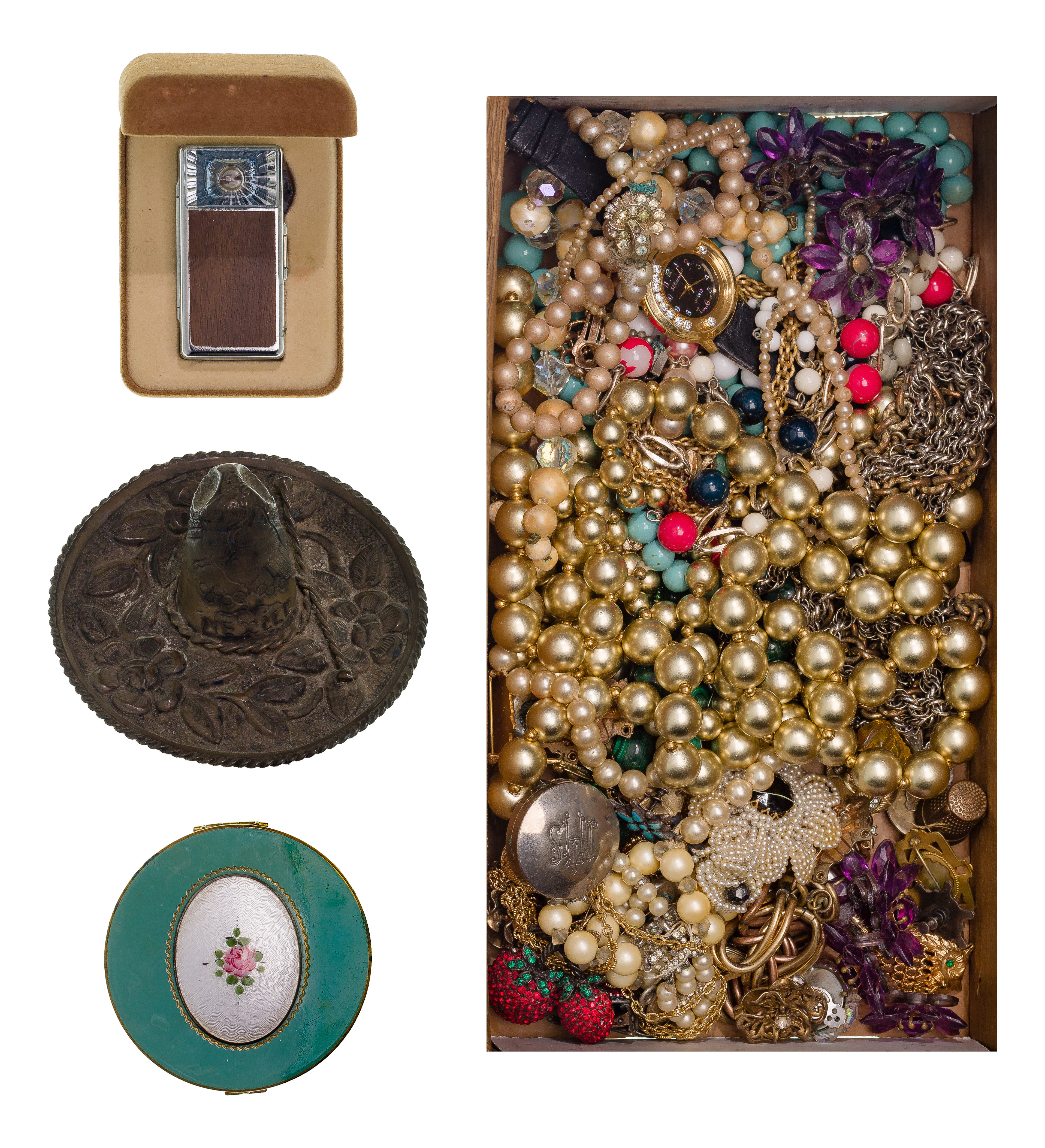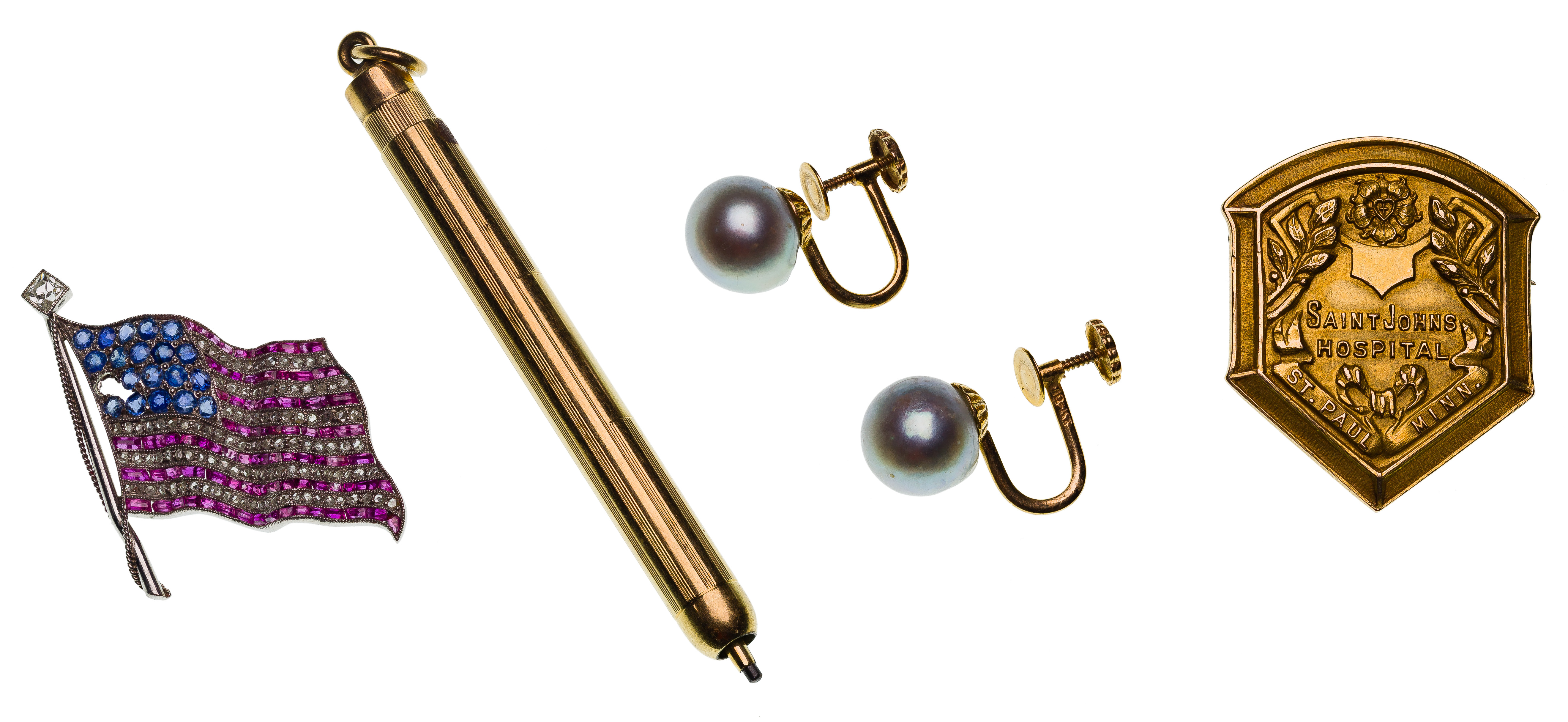 Including an American flag pin (unmarked platinum), an oval link style bracelet and dental gold (some marked ’18k’), a miniature pencil (marked ’14k’), a pair of grey pearl screw post earrings and a service pin (some marked ’10k’) and a necklace, pin and (4) olive forks (marked ‘925’) as well as wristwatches from makers Abercrombie and Fitch, Kingston, Waltham, a horn handle bar set and fashion jewelry necklaces, bracelets and earrings