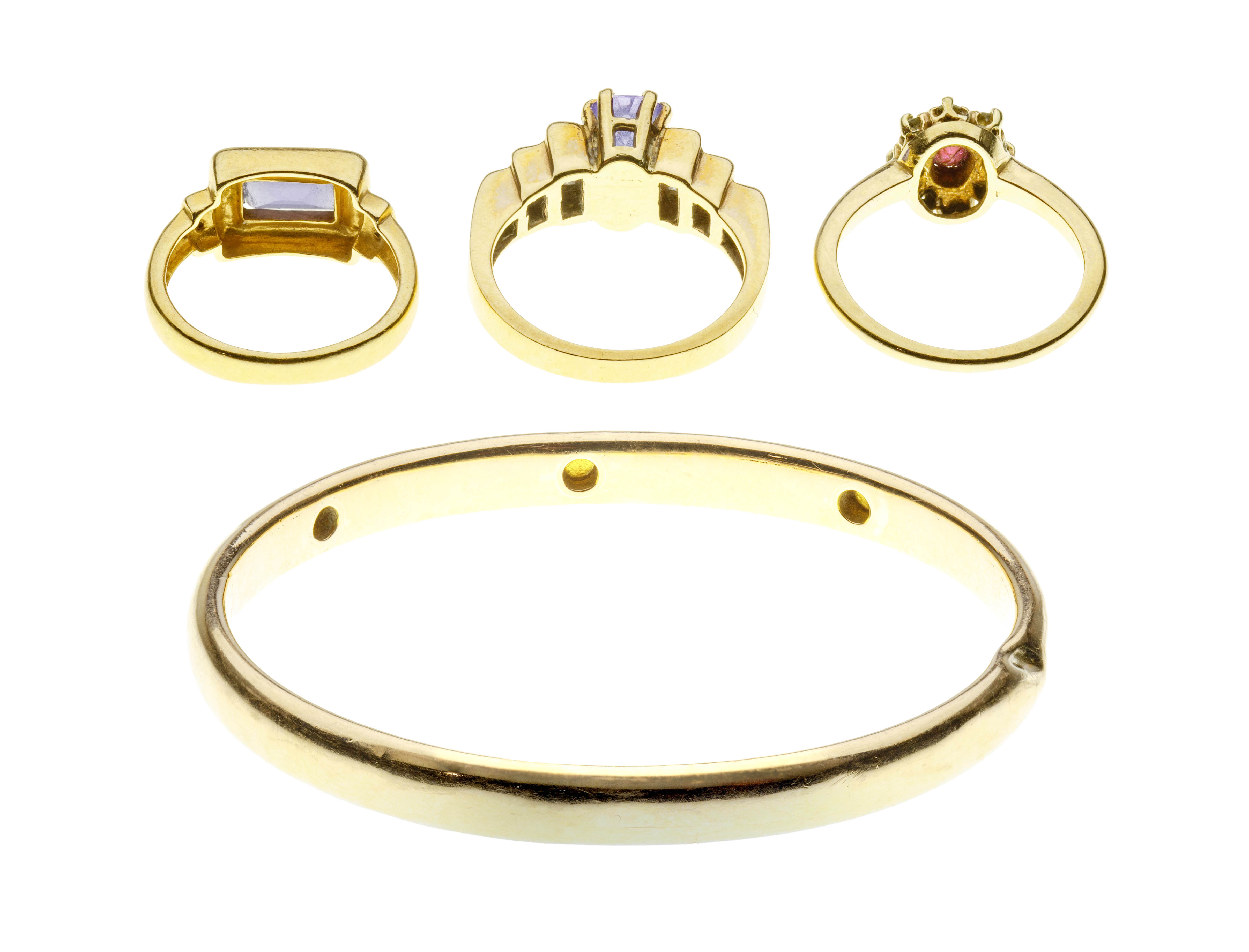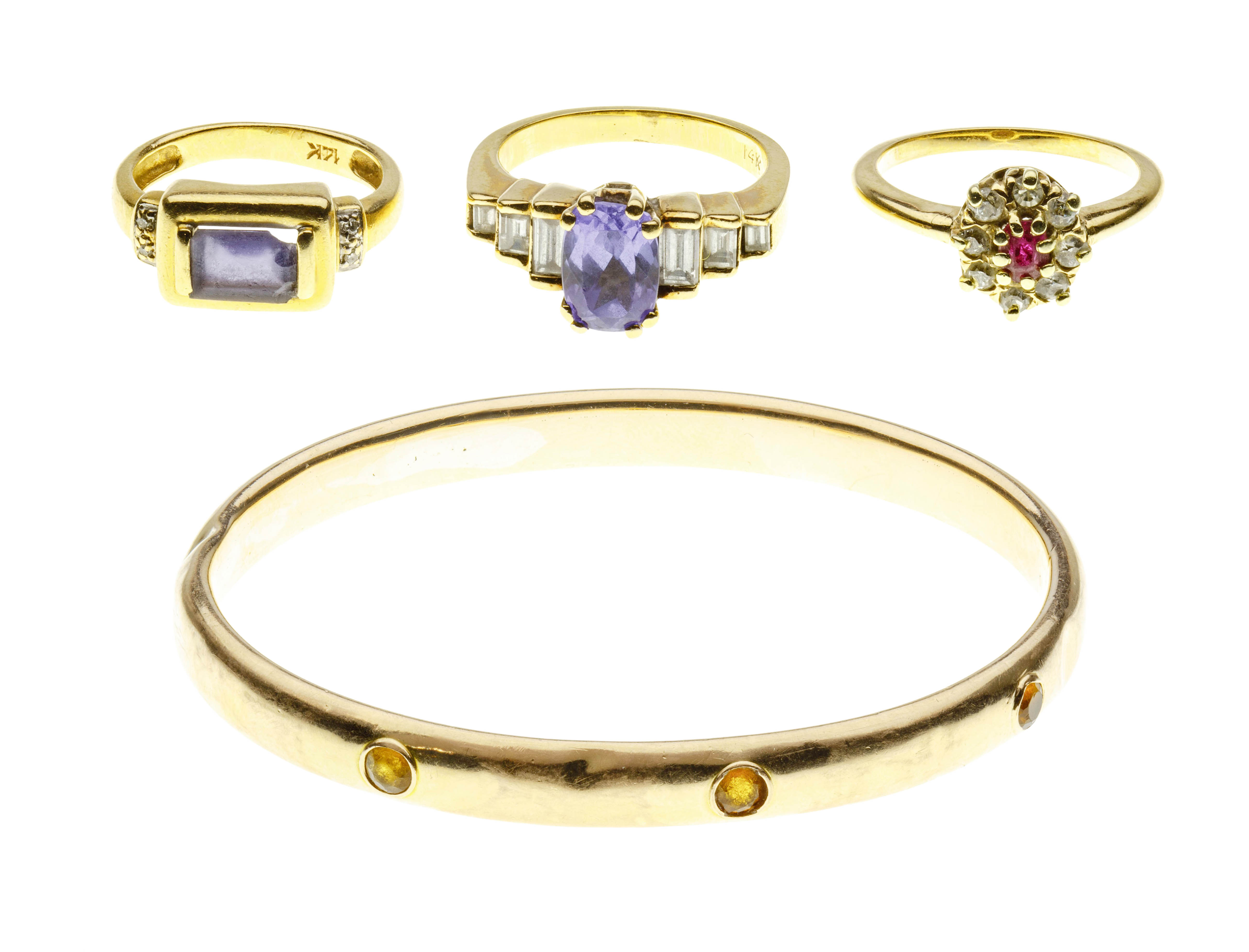 (4) items including (3) rings consisting of an oval cut ruby surrounded by accent diamonds, a rectangle cut tourmaline in a byzantine style setting and an oval cut tourmaline flanked on each side by three baguette cut diamonds in a stepped setting as well as a bangle bracelet having three round cut citrines (most marked ’14k’)