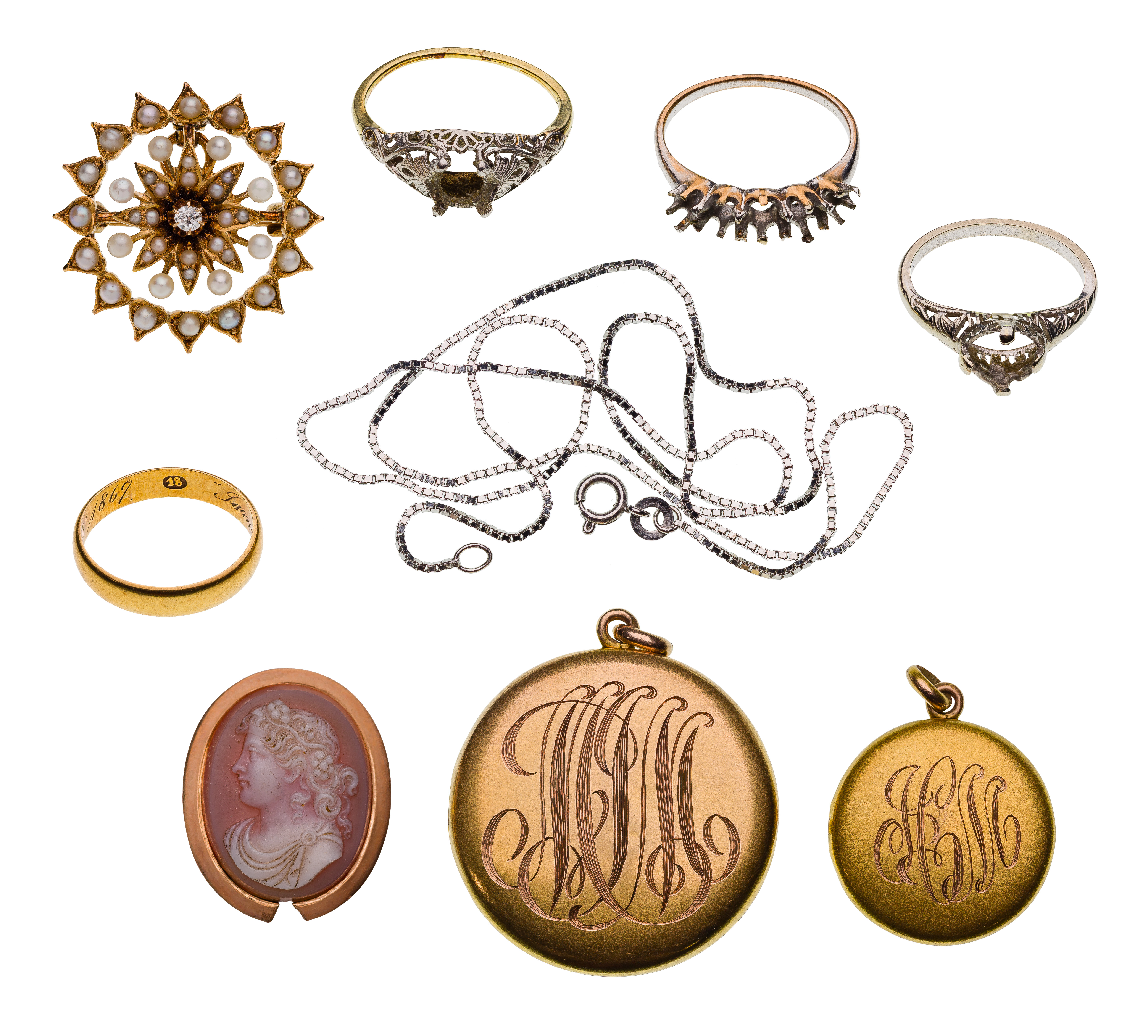 (9) items including a band style ring (marked ’18k’), (3) ring settings and a pearl pin (unmarked 14k), (2) lockets, a cameo style pin (some marked ’10k’) and a chain style necklace (marked ‘9k’)