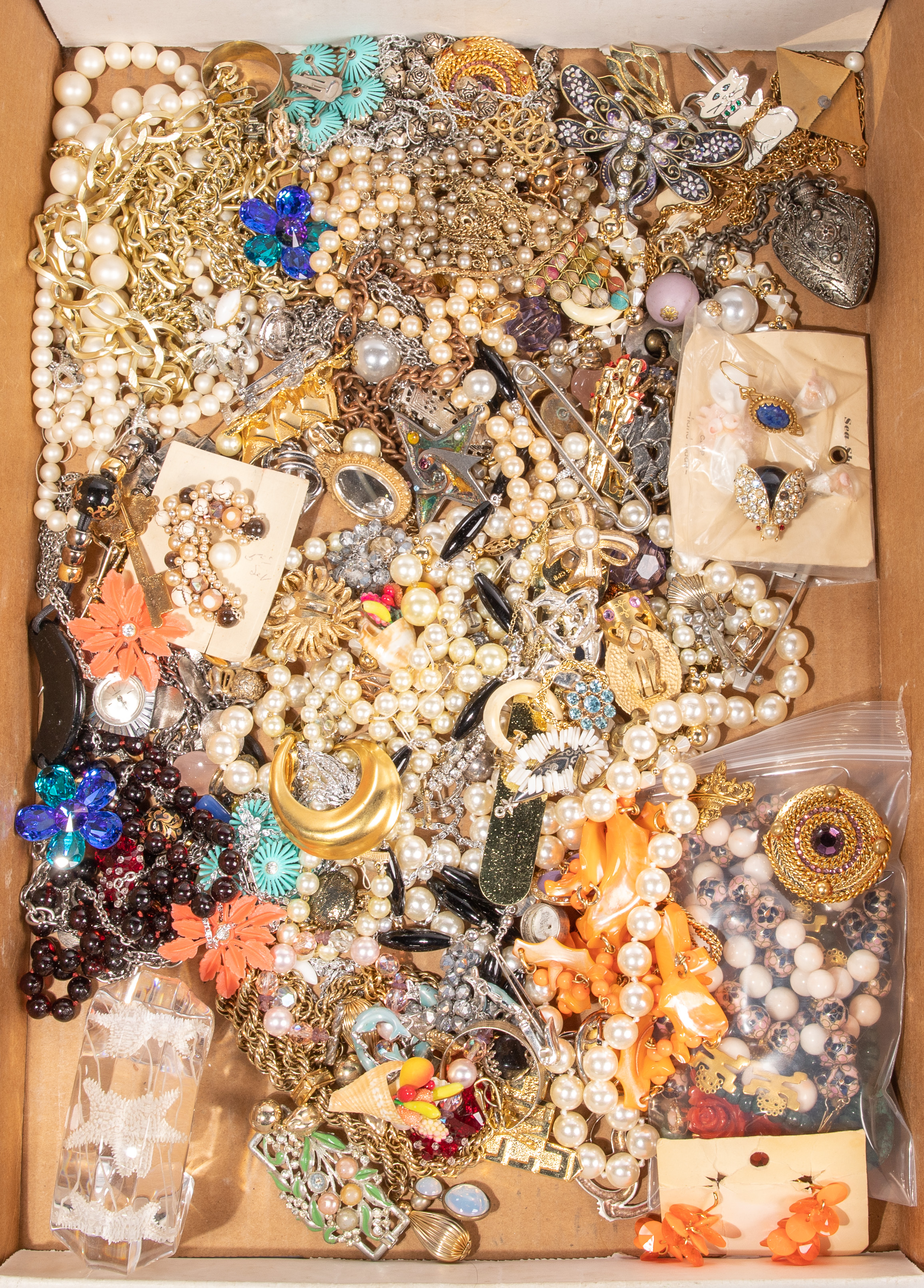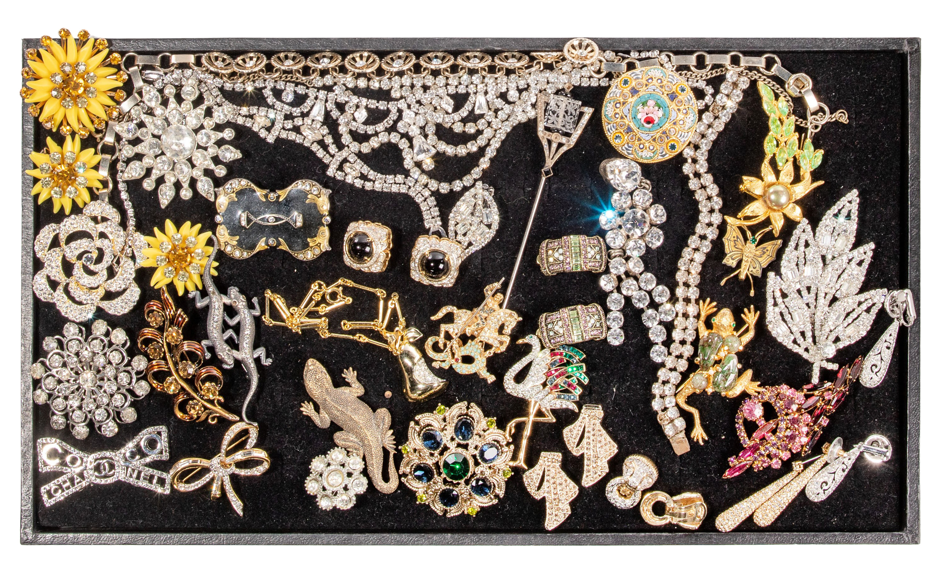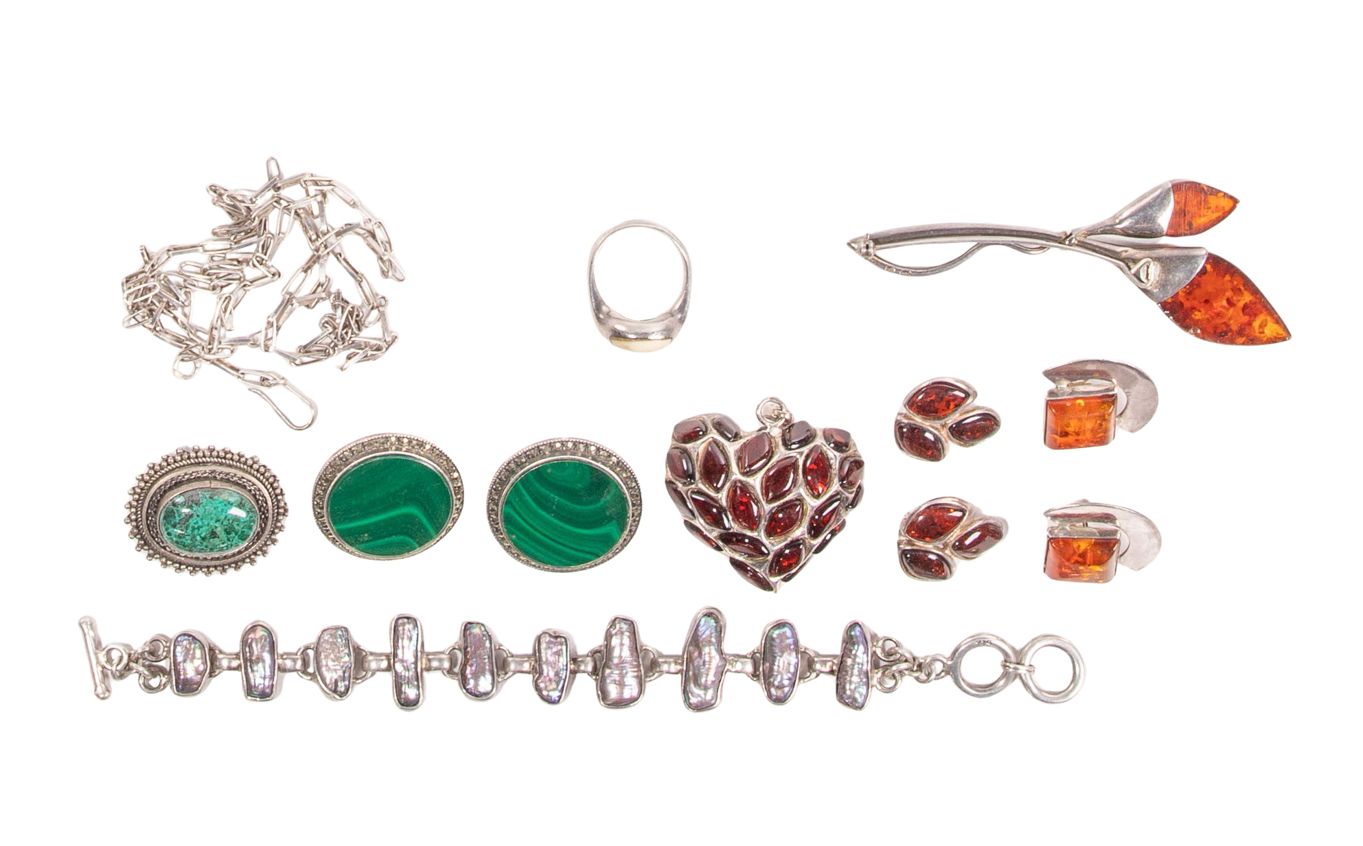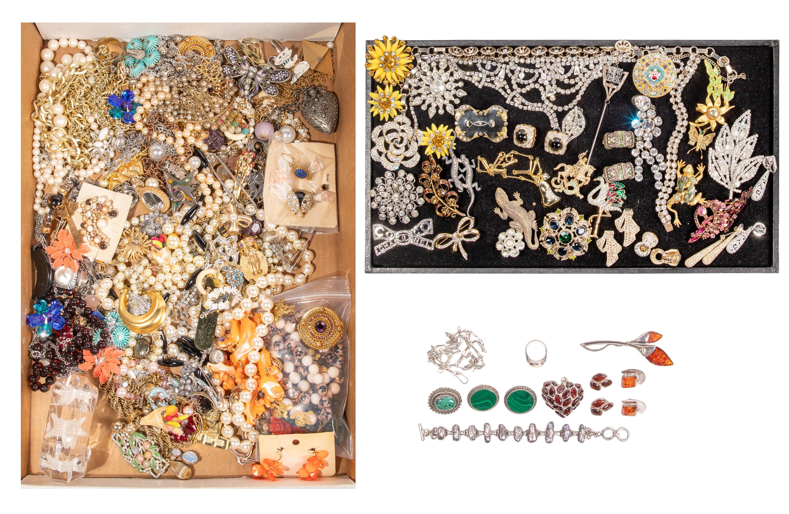 Including earrings, a ring, a pendant, pins, a necklace and a bracelet (most marked ‘sterling’ / ‘925’) as well as approximately (7) pounds of rhinestone and costume jewelry