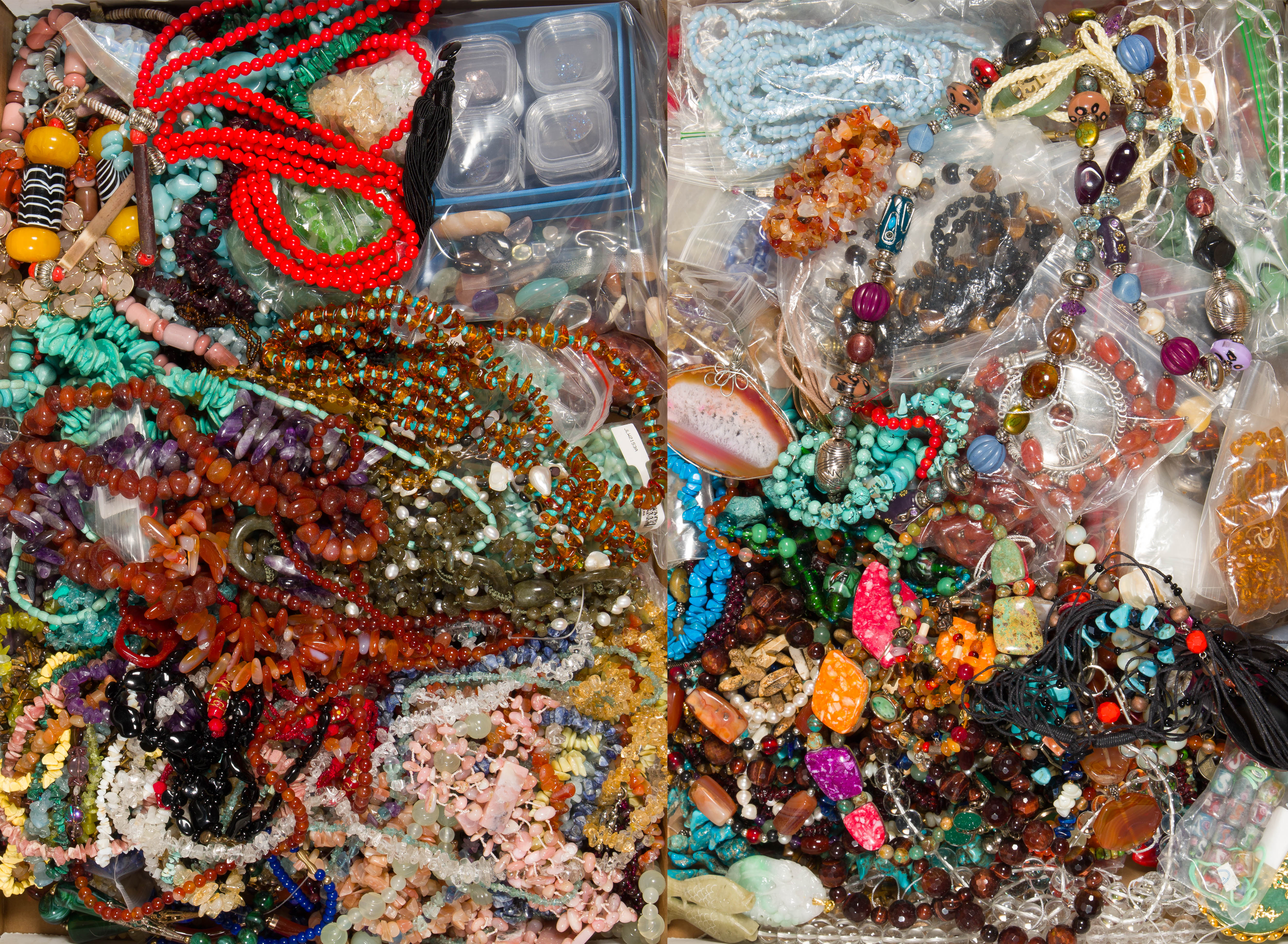 Approximately (30) pounds of loose, strands and beads, some gemstones including amethyst, jade, lapis lazuli and turquoise for jewelry making as well as some fashion jewelry