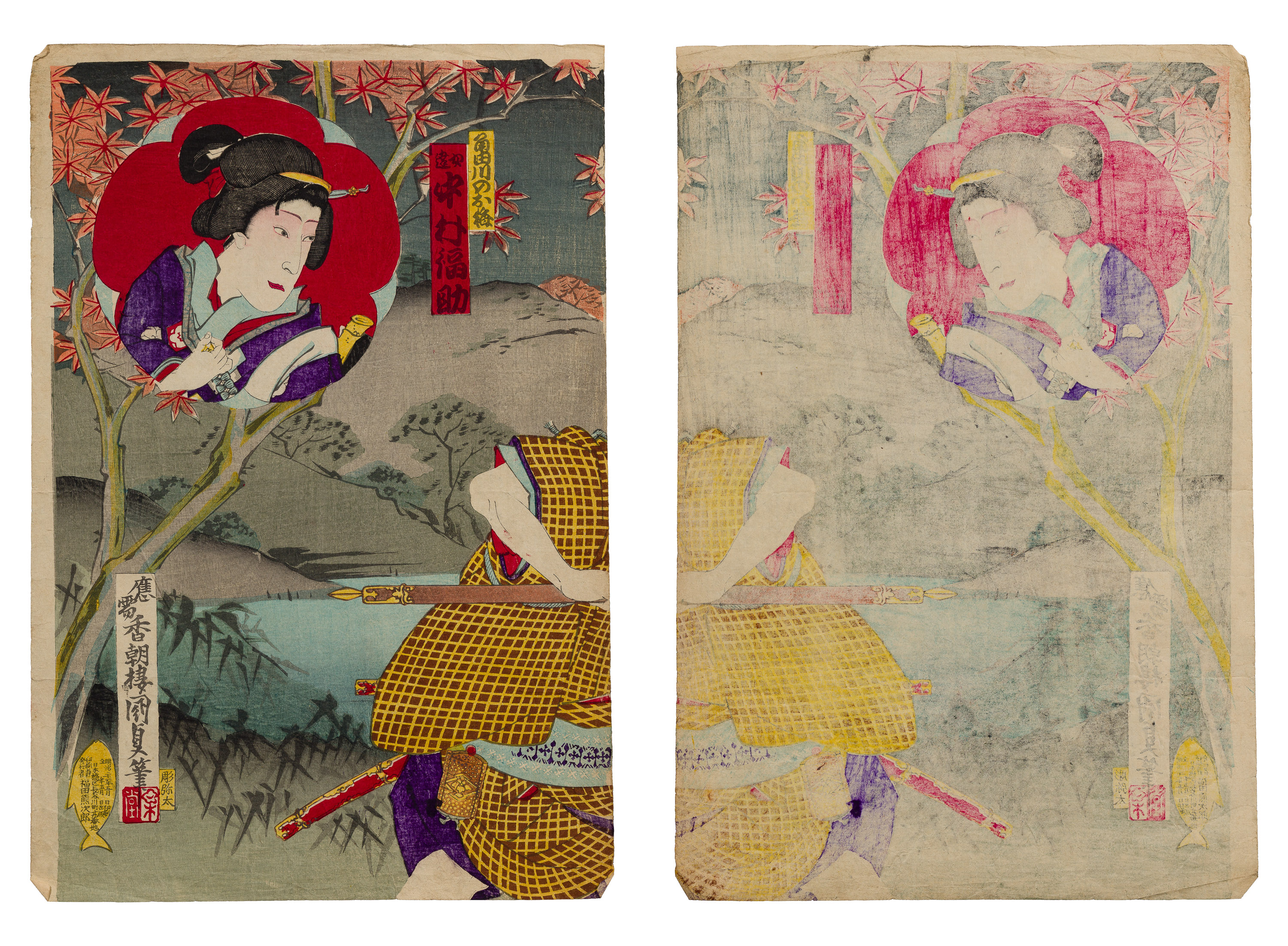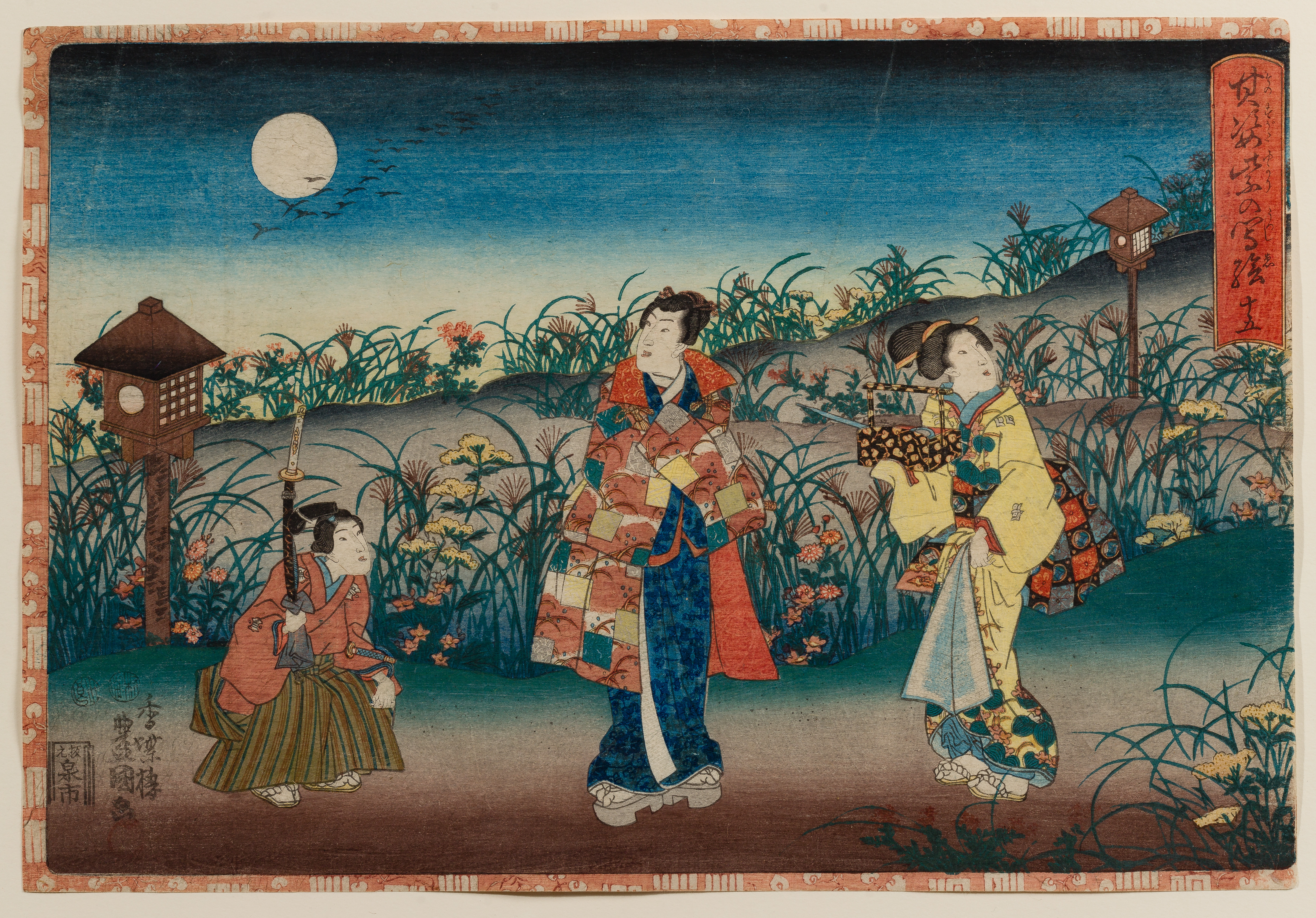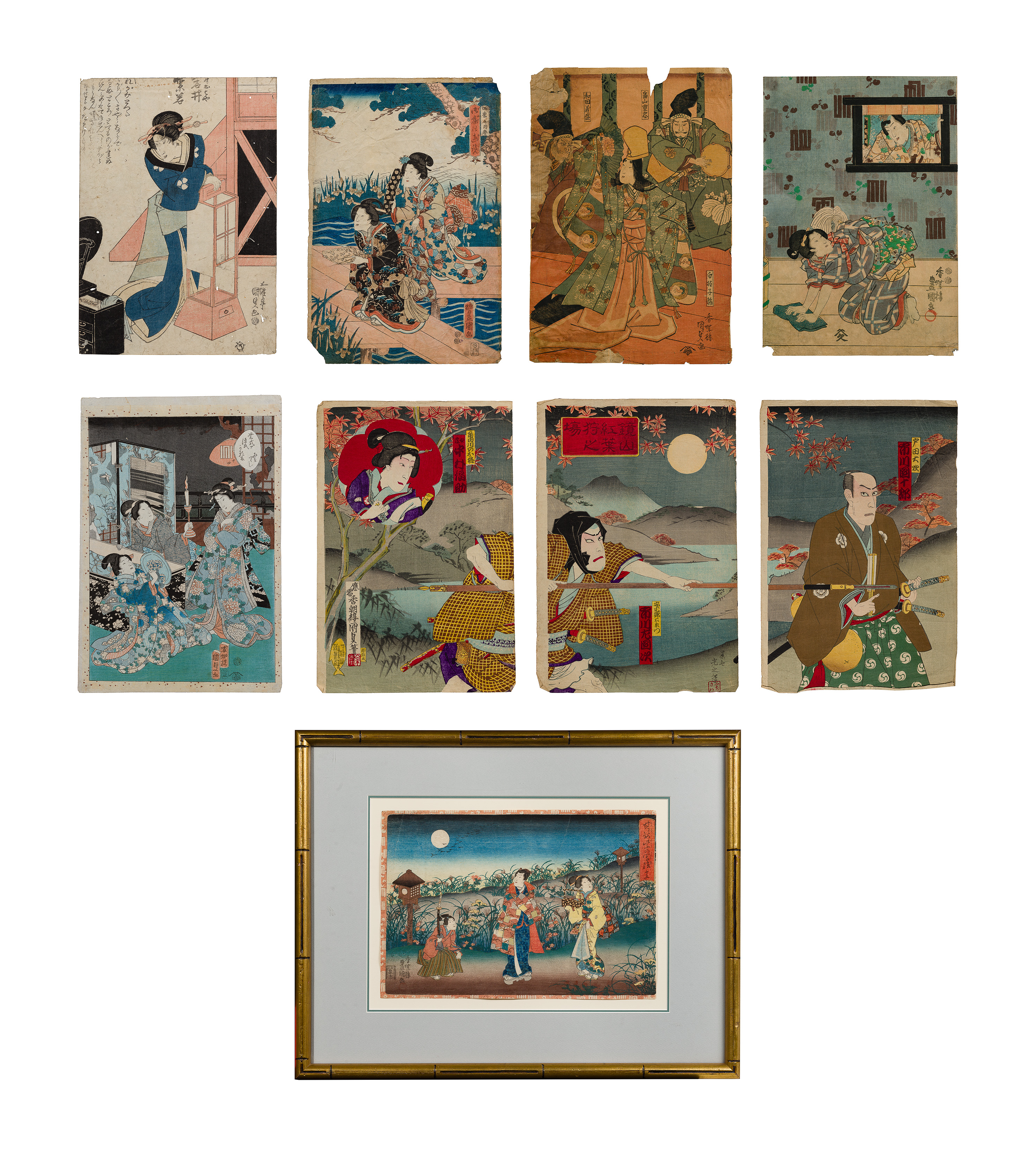 (9) total items including a center woodcut from the triptych ‘Shizuki Gozen Dancing for Yorimoto’, a complete triptych ‘Kagamiyama Nishiki no Mornijba’ and ‘Genji Walking Along River #15’ matted under glass in faux bamboo gold frame as well as (4) other prints, all having signatures and seals for the different names Kunisada used in his career, all but one unframed