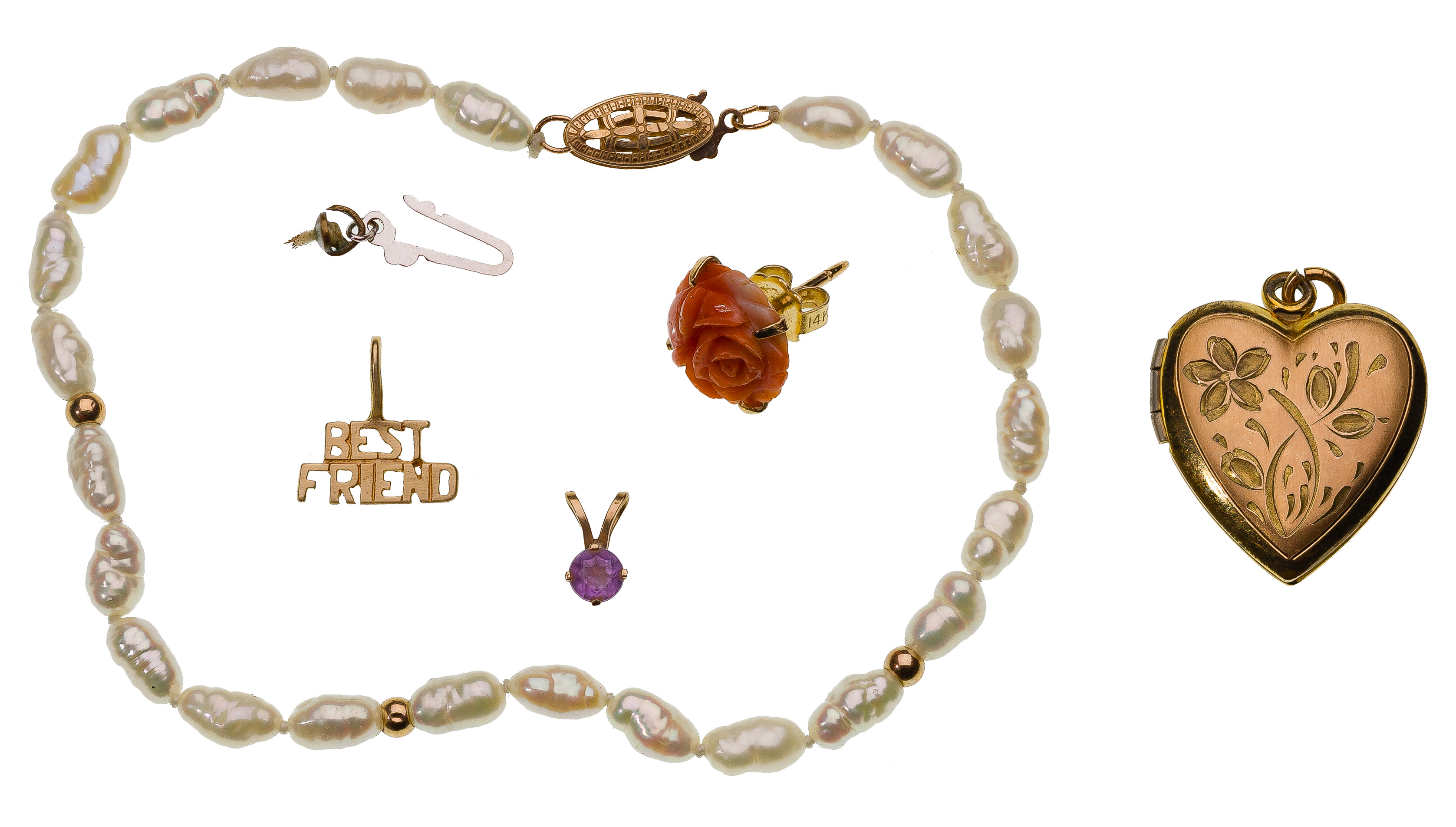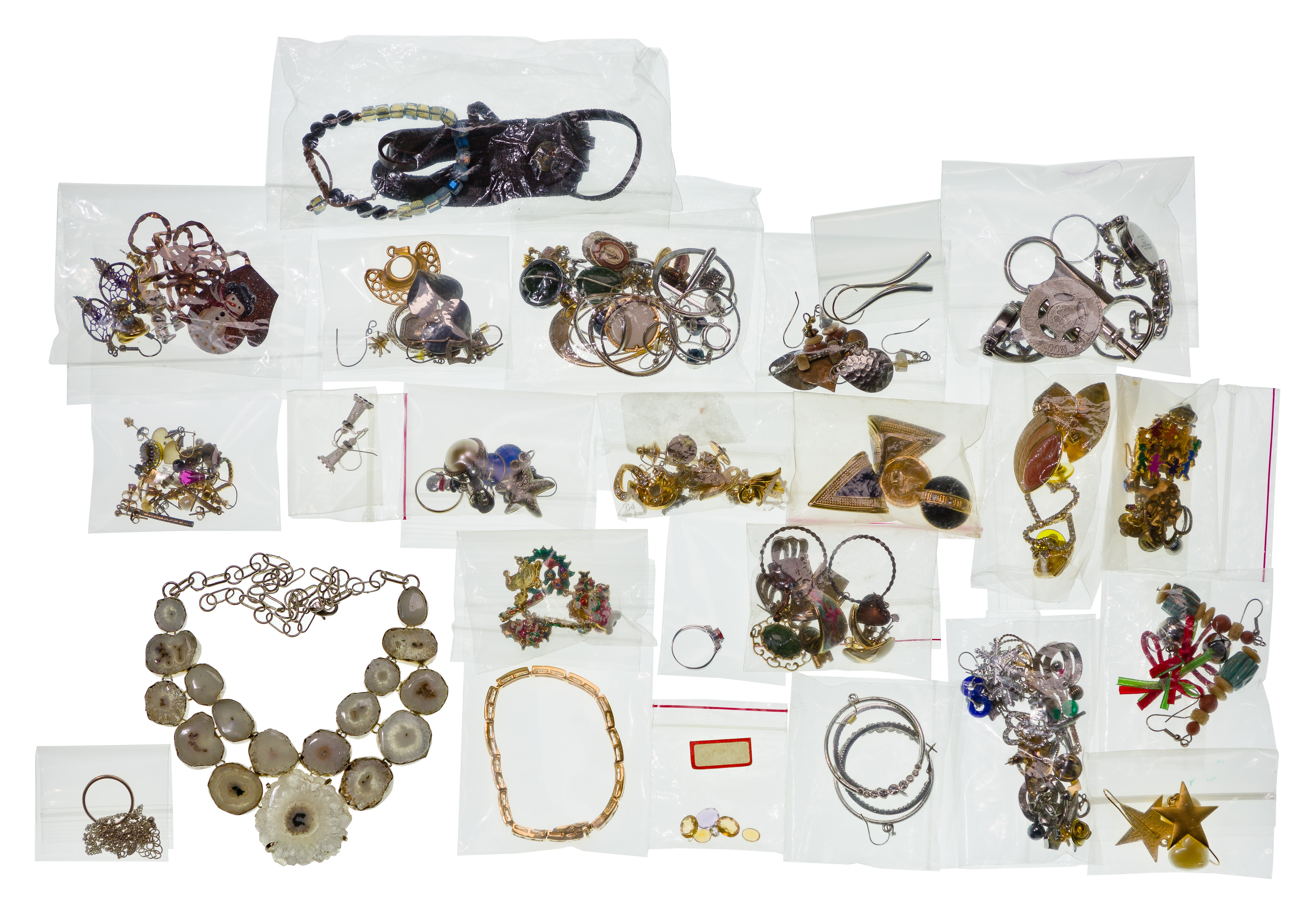 Including a bracelet, single earring, (2) pendants and a clasp (most marked ’14k’), a heart locket (unmarked 10k), various bracelets, earrings and necklaces (most marked ‘sterling’ / ‘925’) as well as approximately a pound of fashion jewelry