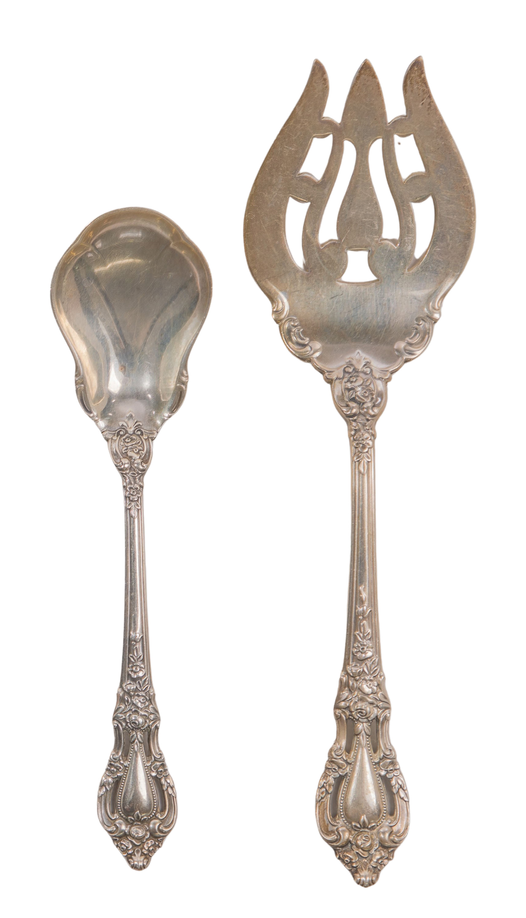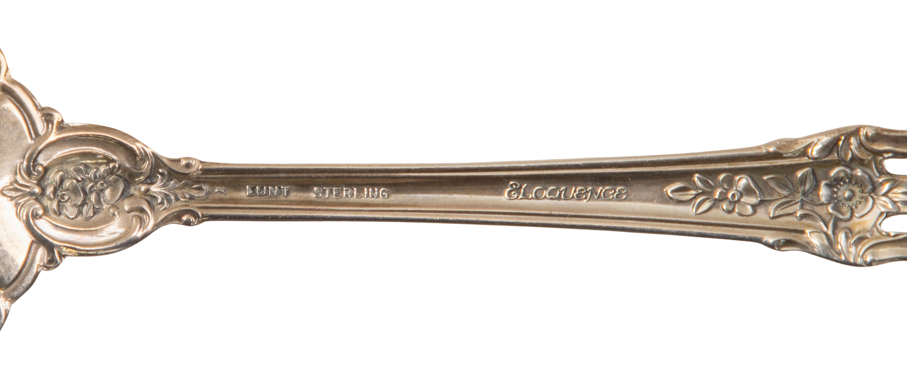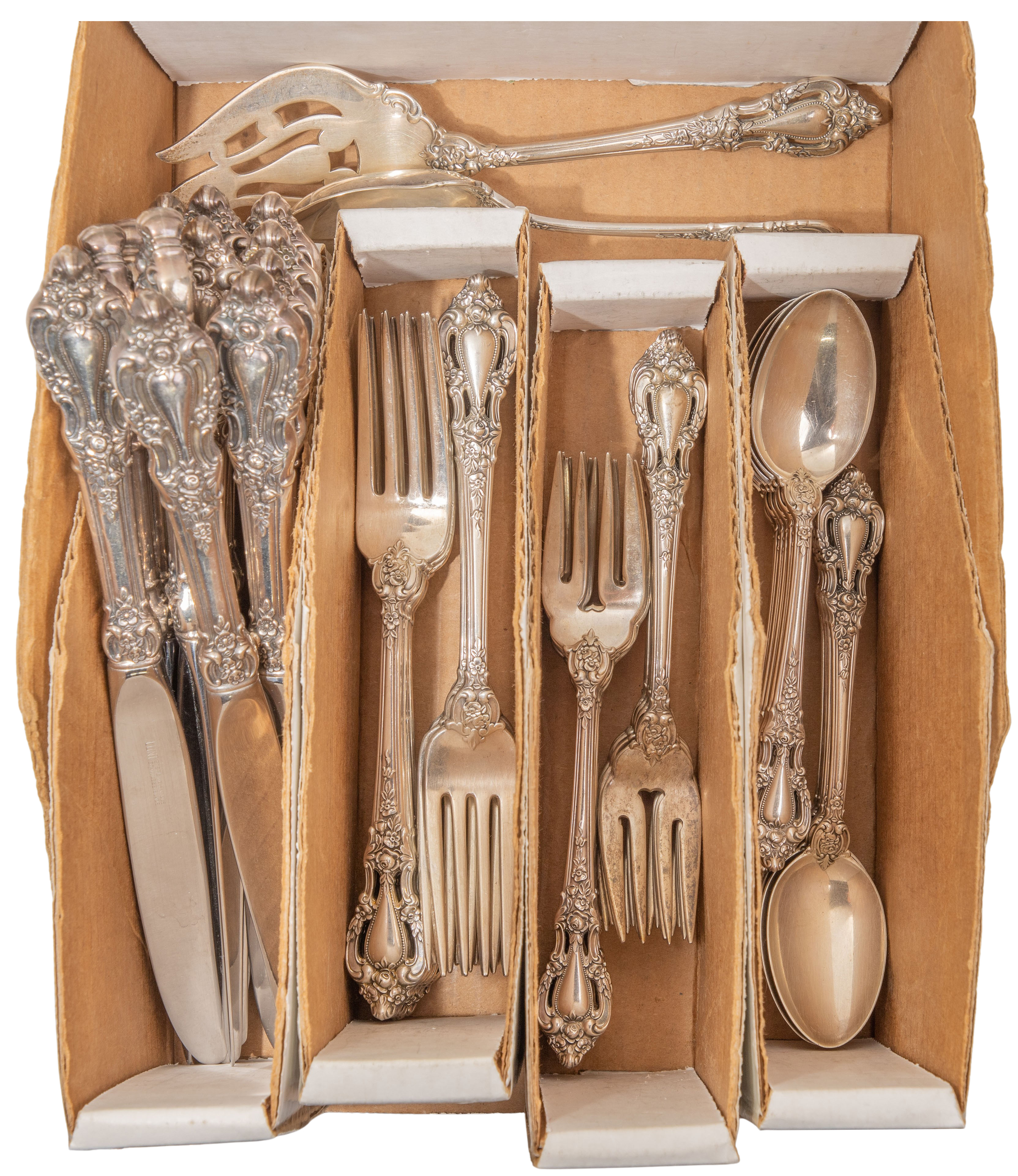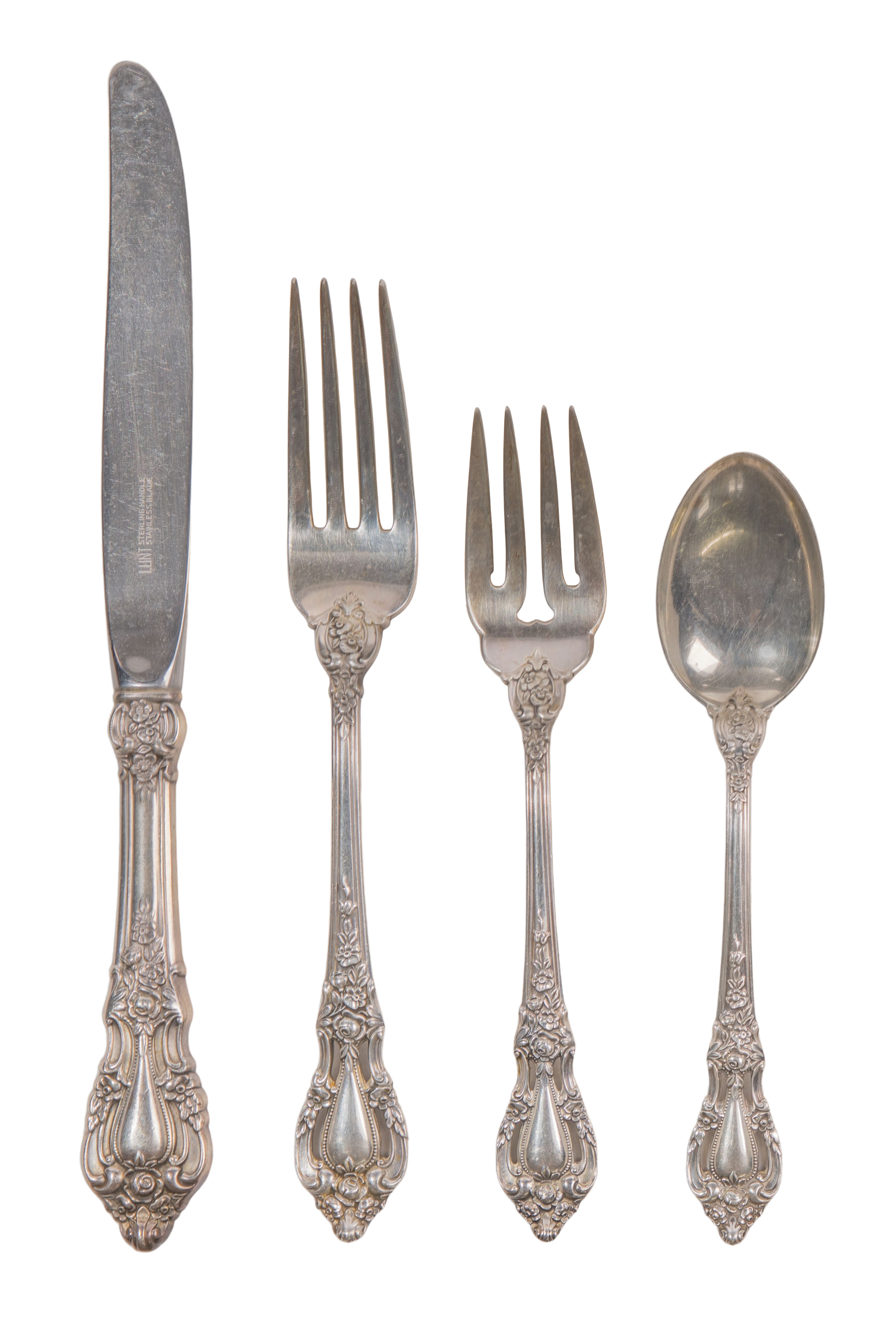 (50) items including (12) 9 1/8-inch dinner knives, (12) 7 1/4-inch dinner forks, (12) 6 1/2-inch salad forks, (12) 6 1/4-inch teaspoons and (2) serving utensils (all marked ‘sterling’ on back)