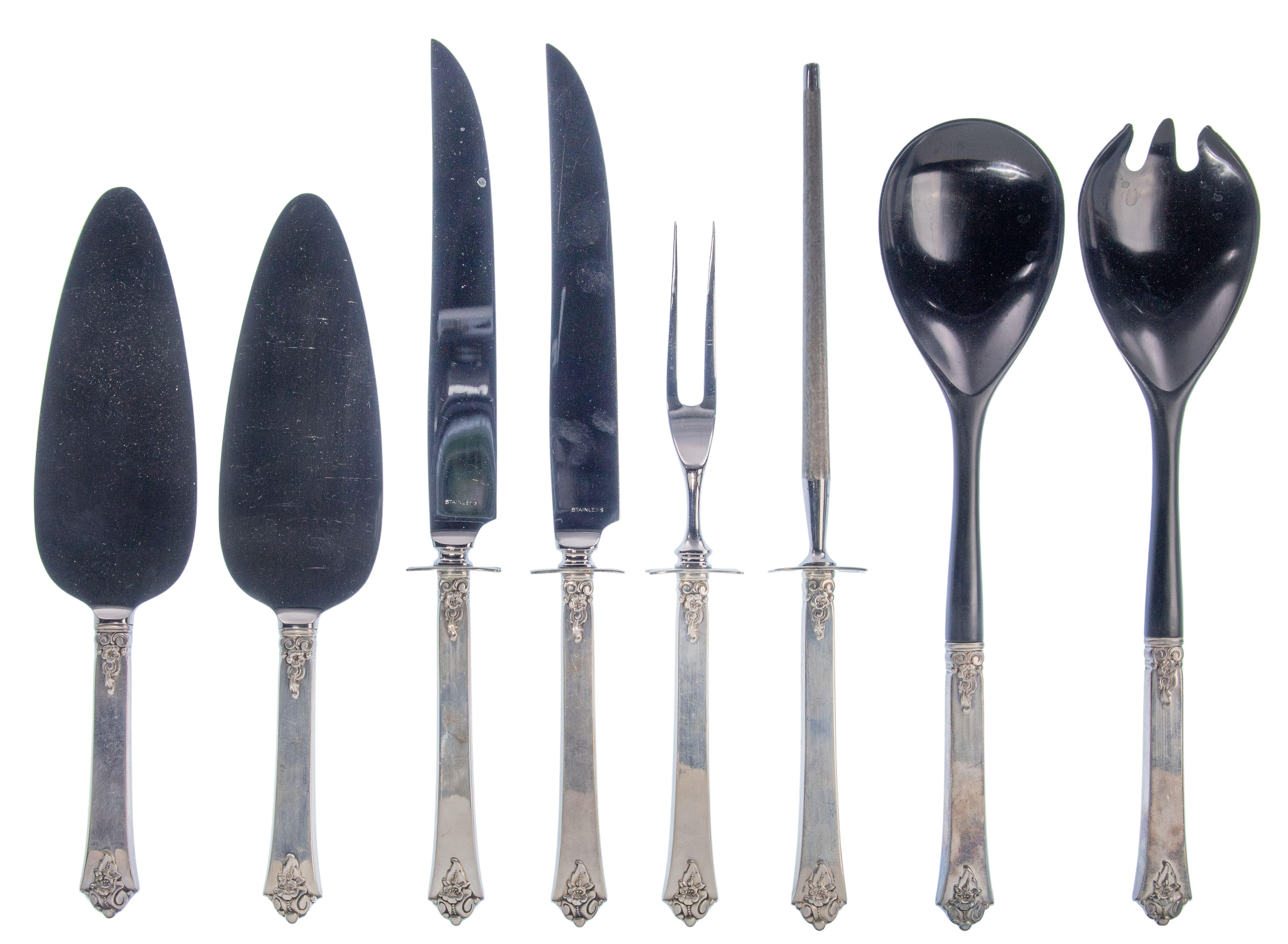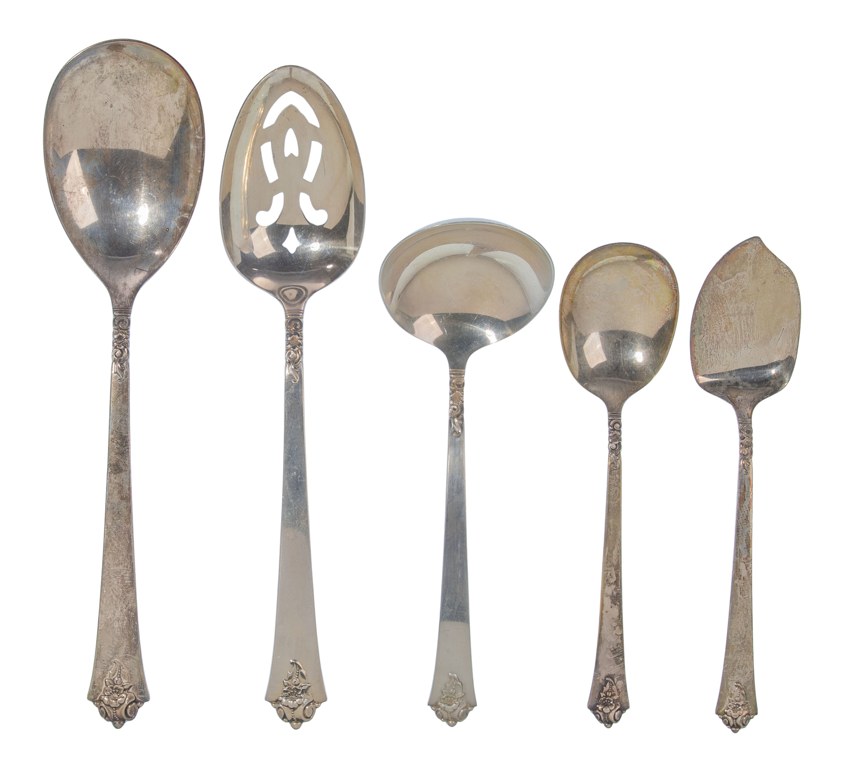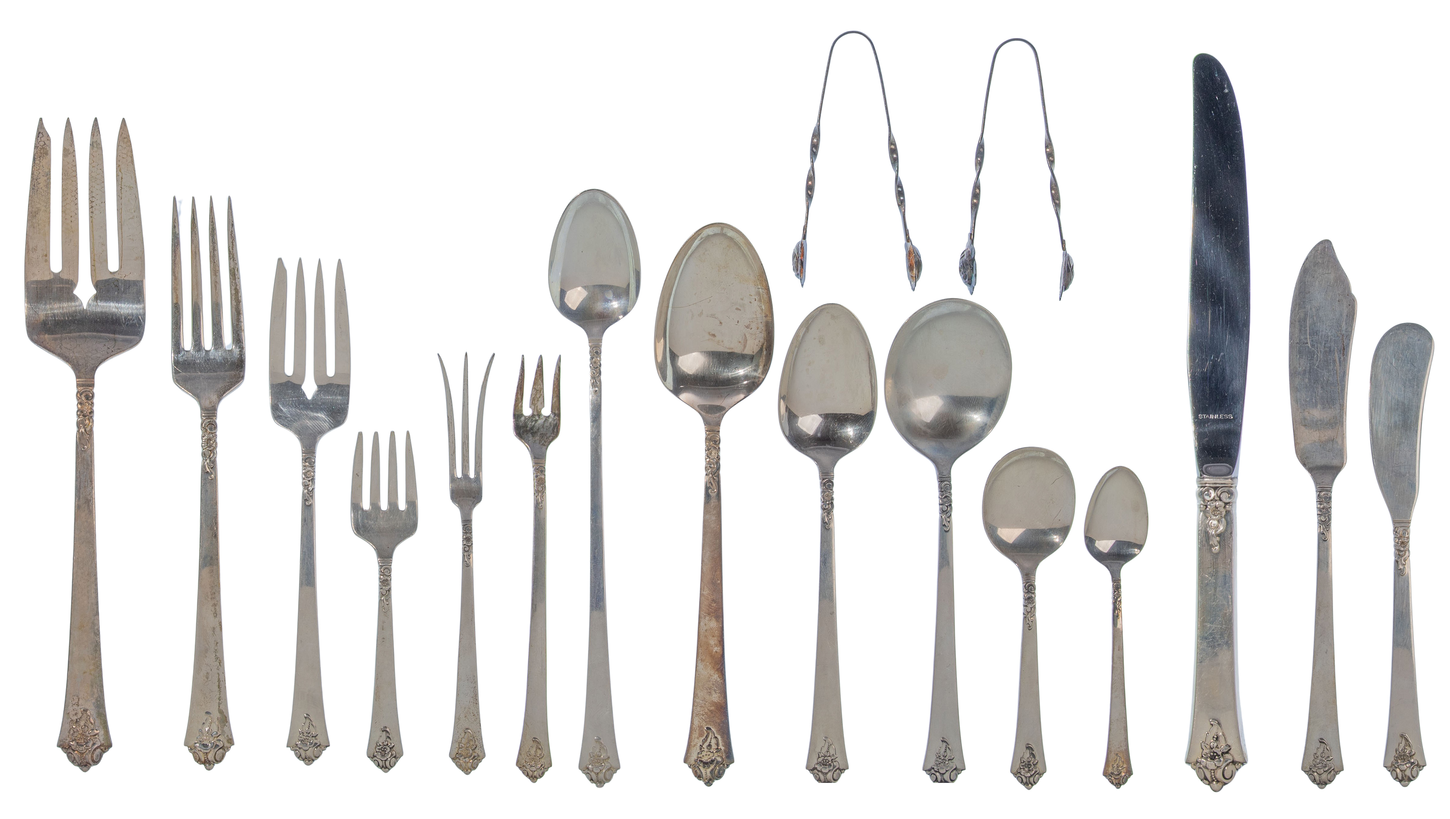 (270) items including (24) 9-inch dinner knives, (20) 5 3/4-inch solid butter knives, (22) 7-inch dinner forks, (32) 6 1/4-inch salad forks, (24) 5 1/4-inch cocktail forks, (3) 4 1/4-inch youth forks, (32) 6-inch teaspoons, (15) 7-inch tablespoons, (27) 4-inch demitasse spoons, (21) 6-inch round soup spoons, (19) 7 1/4-inch iced tea spoons, (1) 4 1/4-inch youth spoon and (30) serving utensils (all marked ‘Royal Crest’ and ‘sterling’); together with (2) Raimond sterling silver sugar tongs