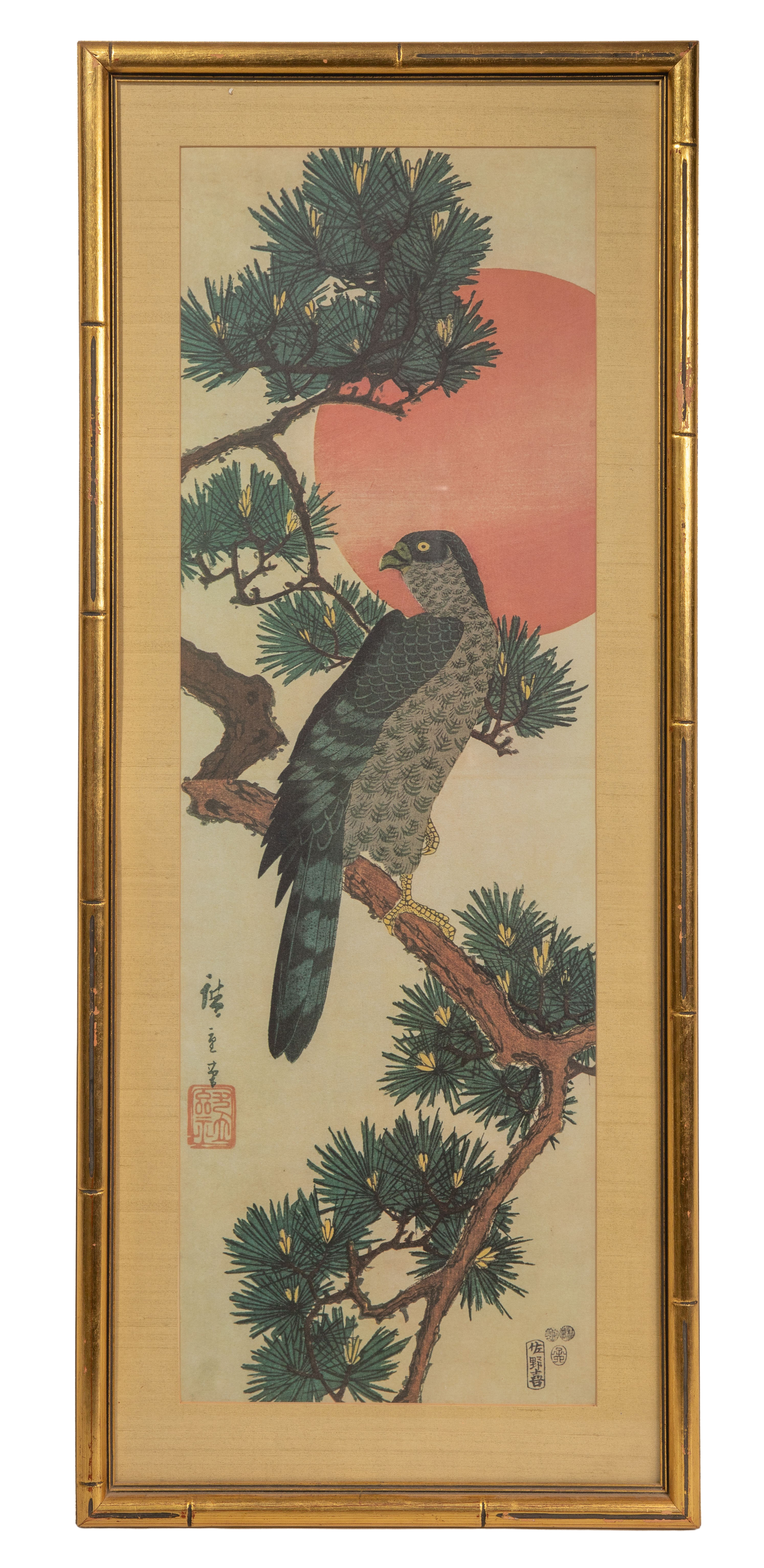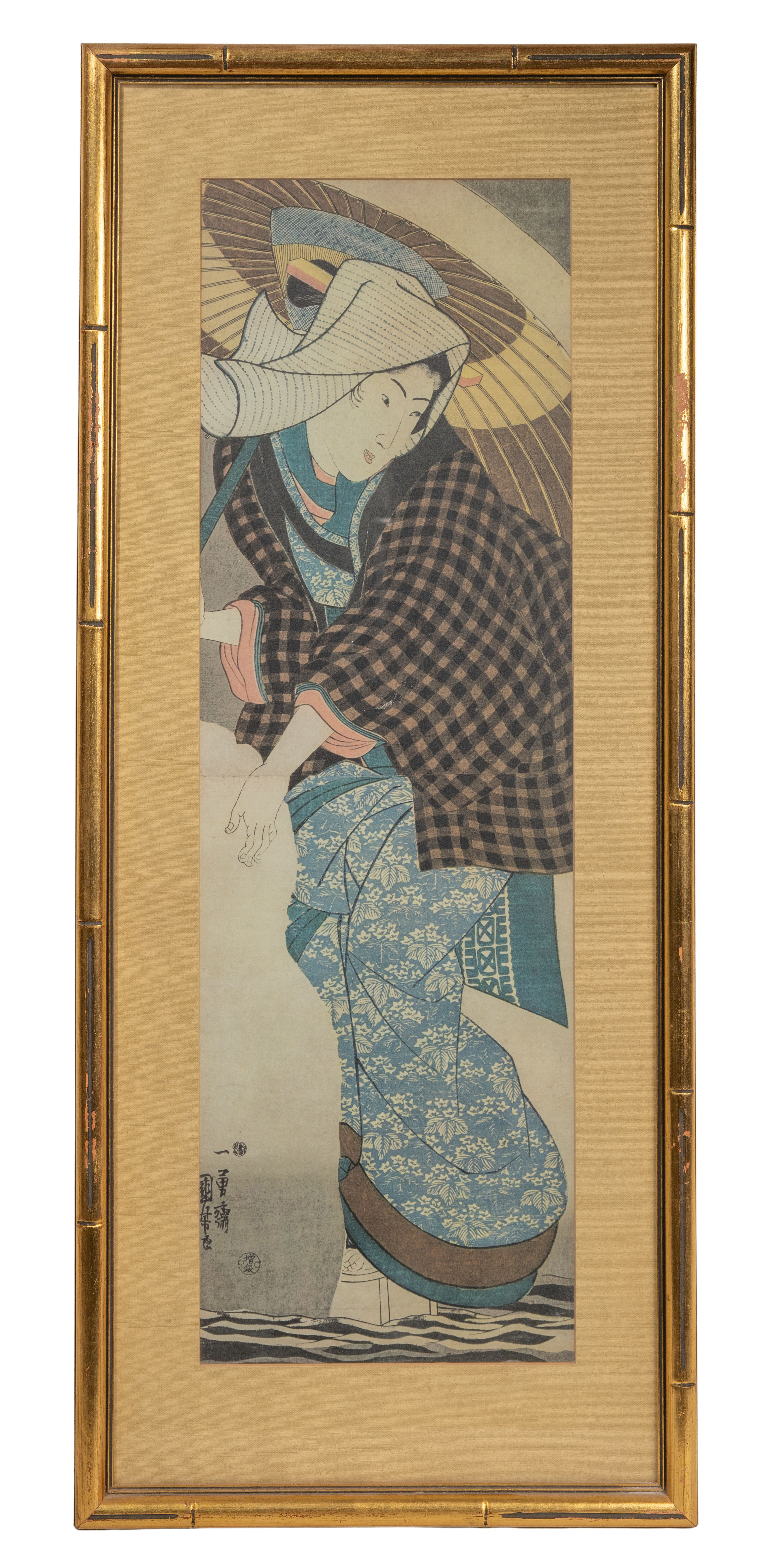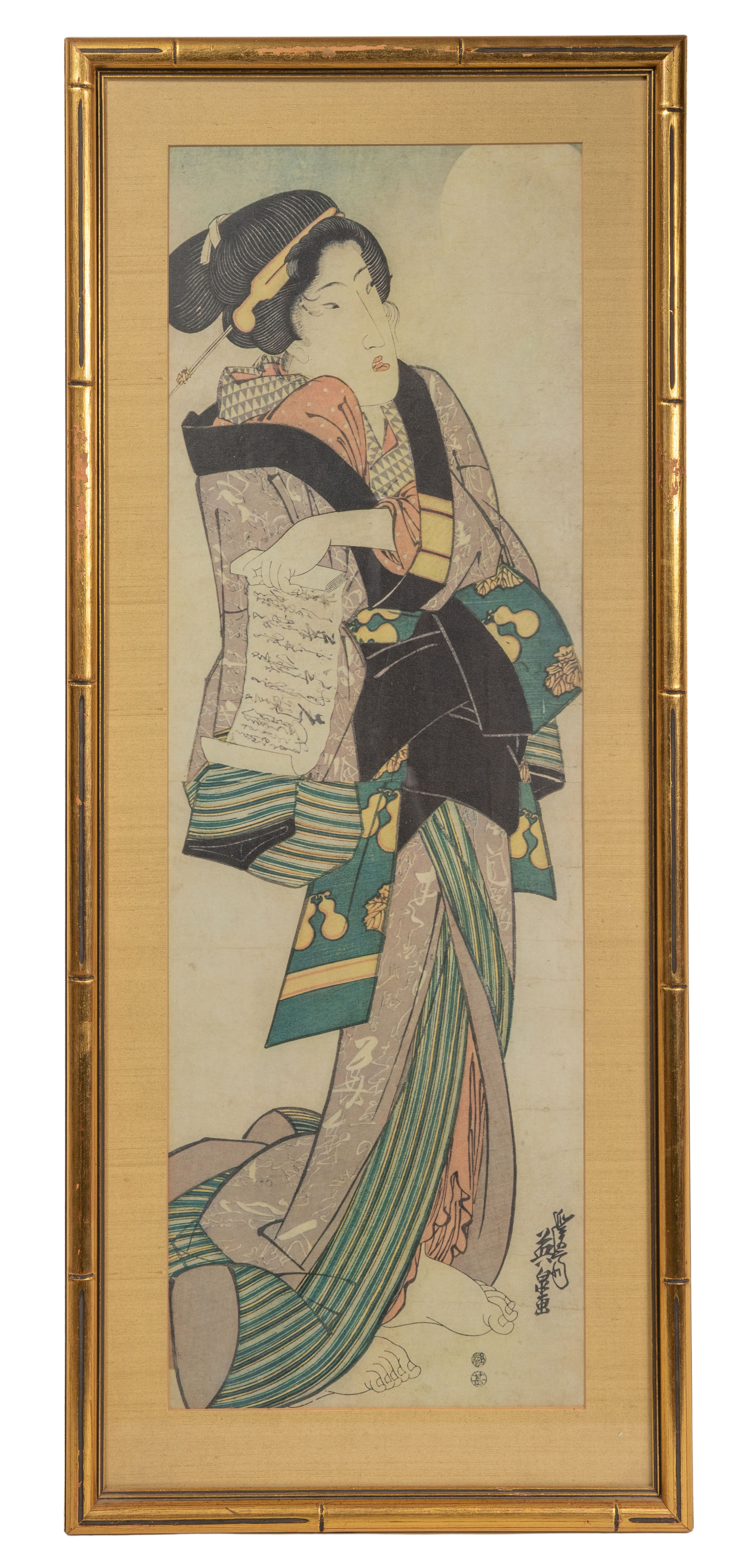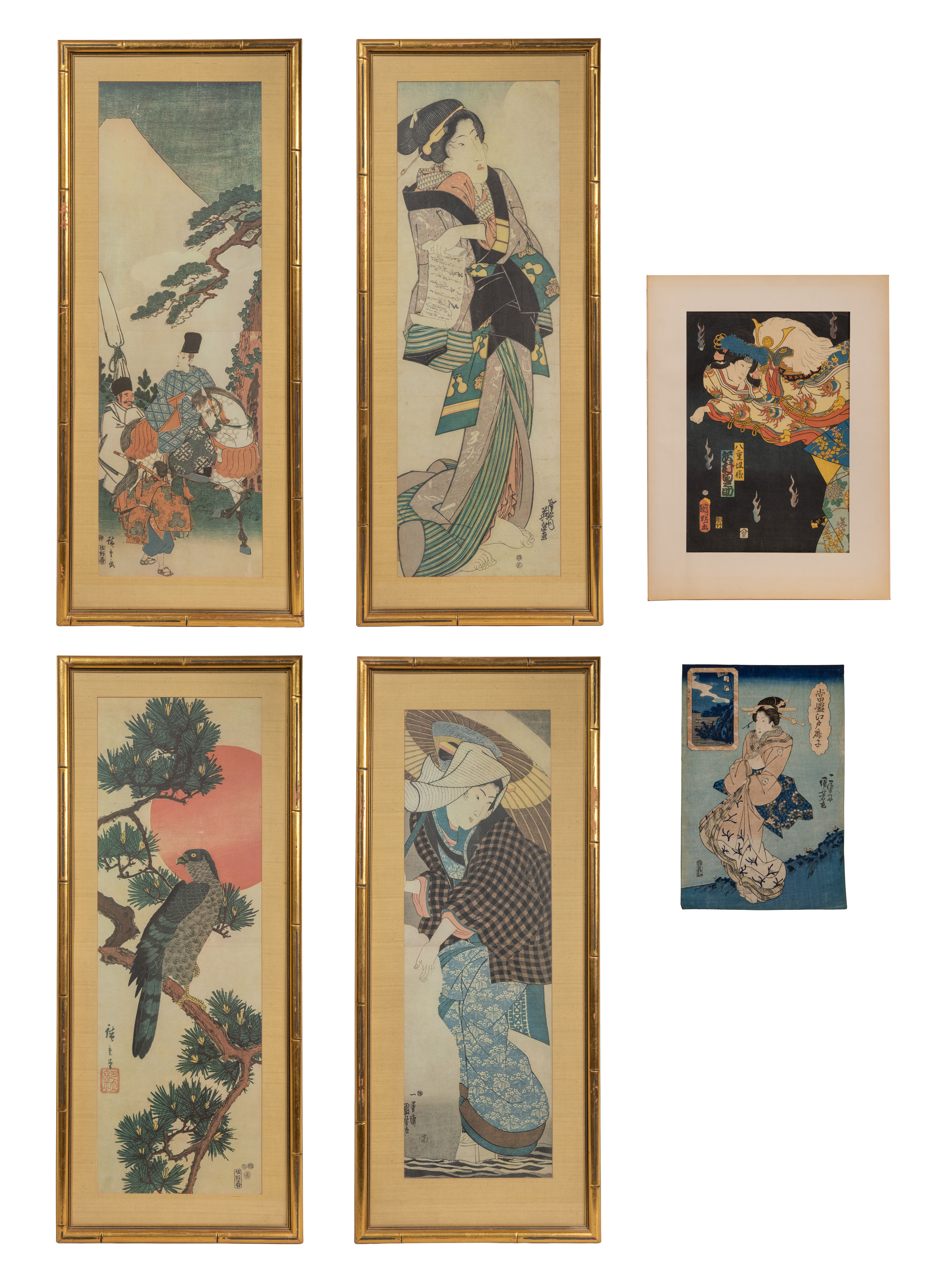 (6) total items including an undated Kuniyoshi, artist mark in print, depicting a geisha, unframed; together with an unidentified woodblock and (4) offset lithograph prints having identical gold-tone wood frames
