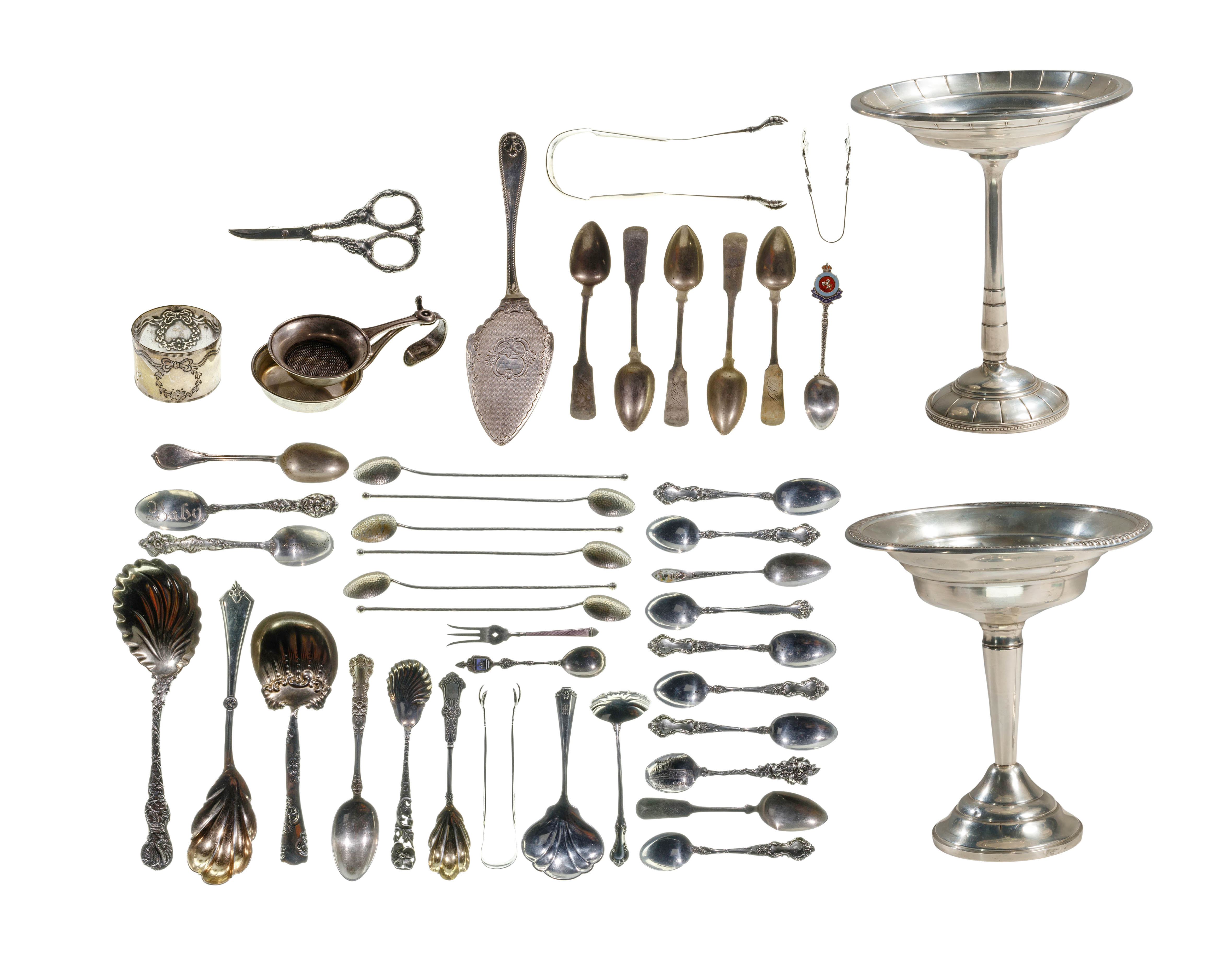 Including (2) compotes, various spoons and serving utensils, drink stirrers, a napkin ring, a pair of scissors and a tea caddy (most marked ‘sterling’ / ‘925’) as well as spoons and a spatula (unmarked)