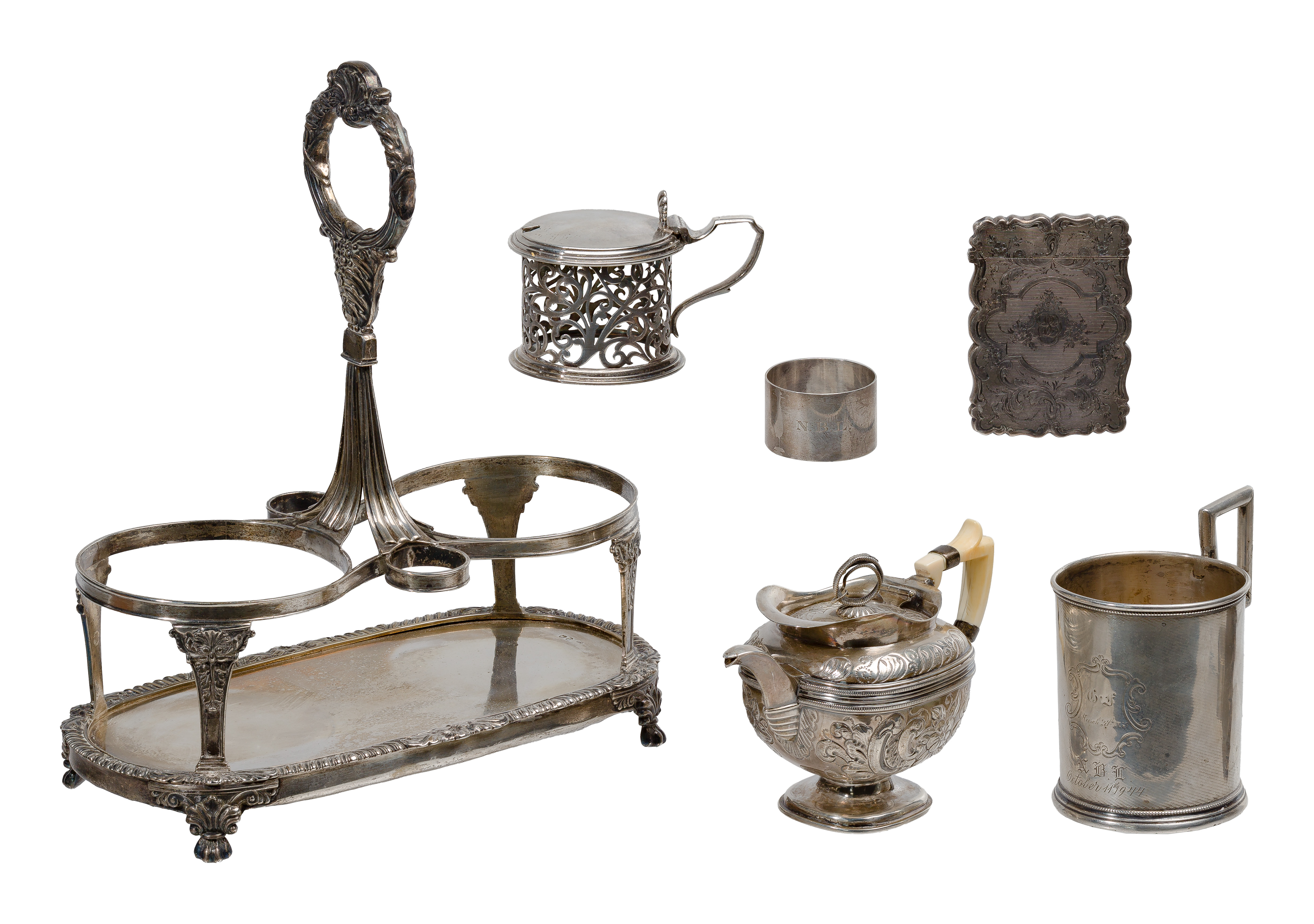 (6) items including a condiment holder (marked Solomon Hougham, 1814), a jam jar overlay (marked Charles Rawlings and George Storer, 1839), a card case (marked Frederick Marson, 1852), a lidded creamer (marked Thomas Mathews, 1809), a napkin ring (marked Sheffield, 1926) and a mug (marked with a right facing horses head)