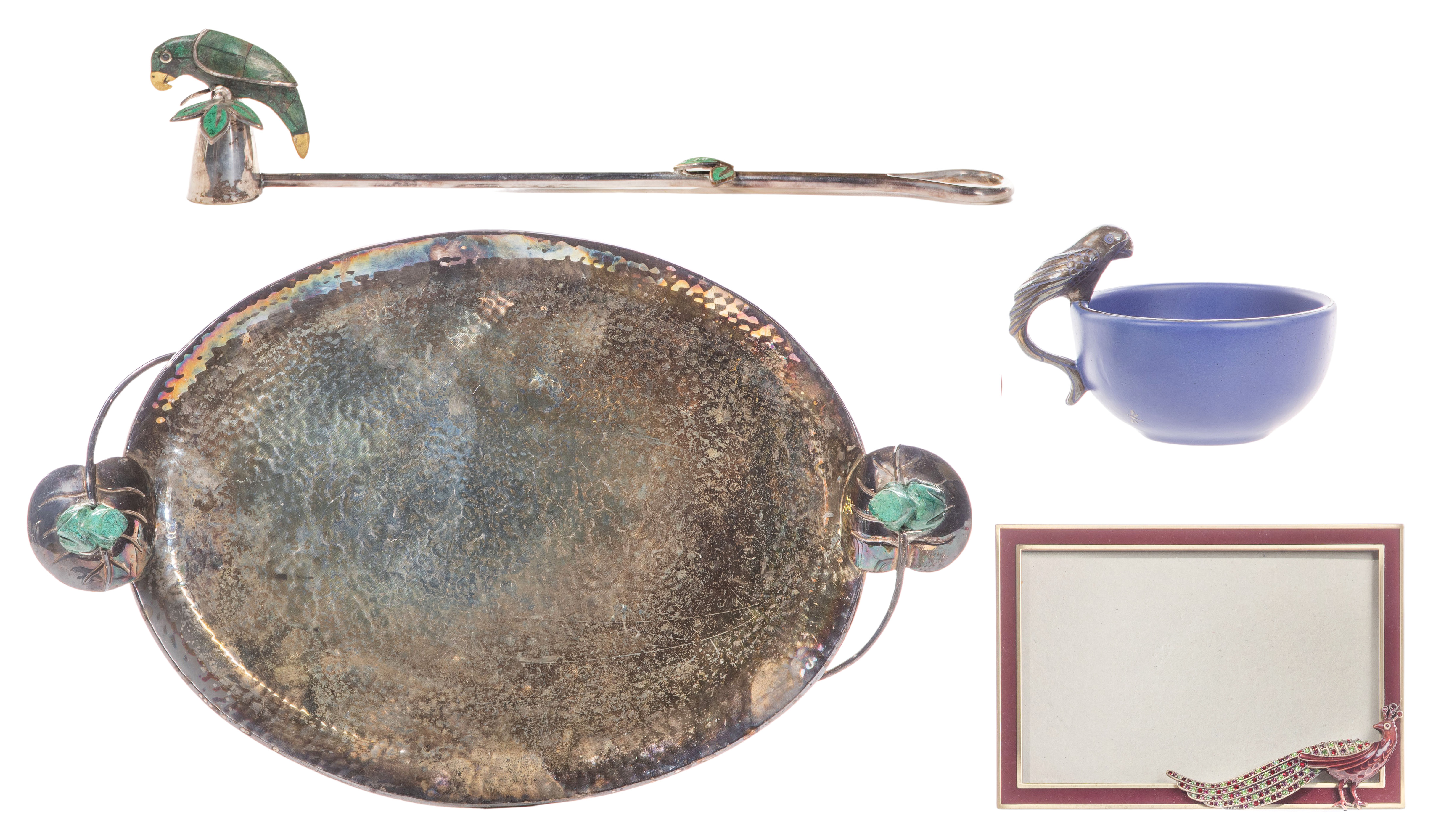 (4) total items including a silver plated oval tray having hammered texture with attached green stone frogs on lily pad form handles, a silver plated candle snuffer having attached green stone parrot finial and a blue ceramic cup having a silver glazed parrot handle, all having marks; together with an enameled Jay Strongwater 4 by 6-inch photo frame having applied peacock