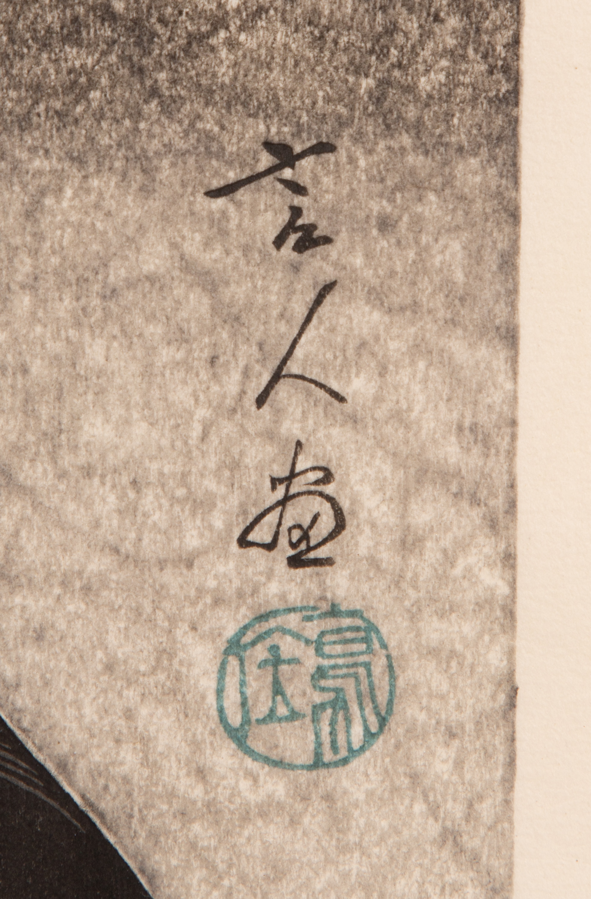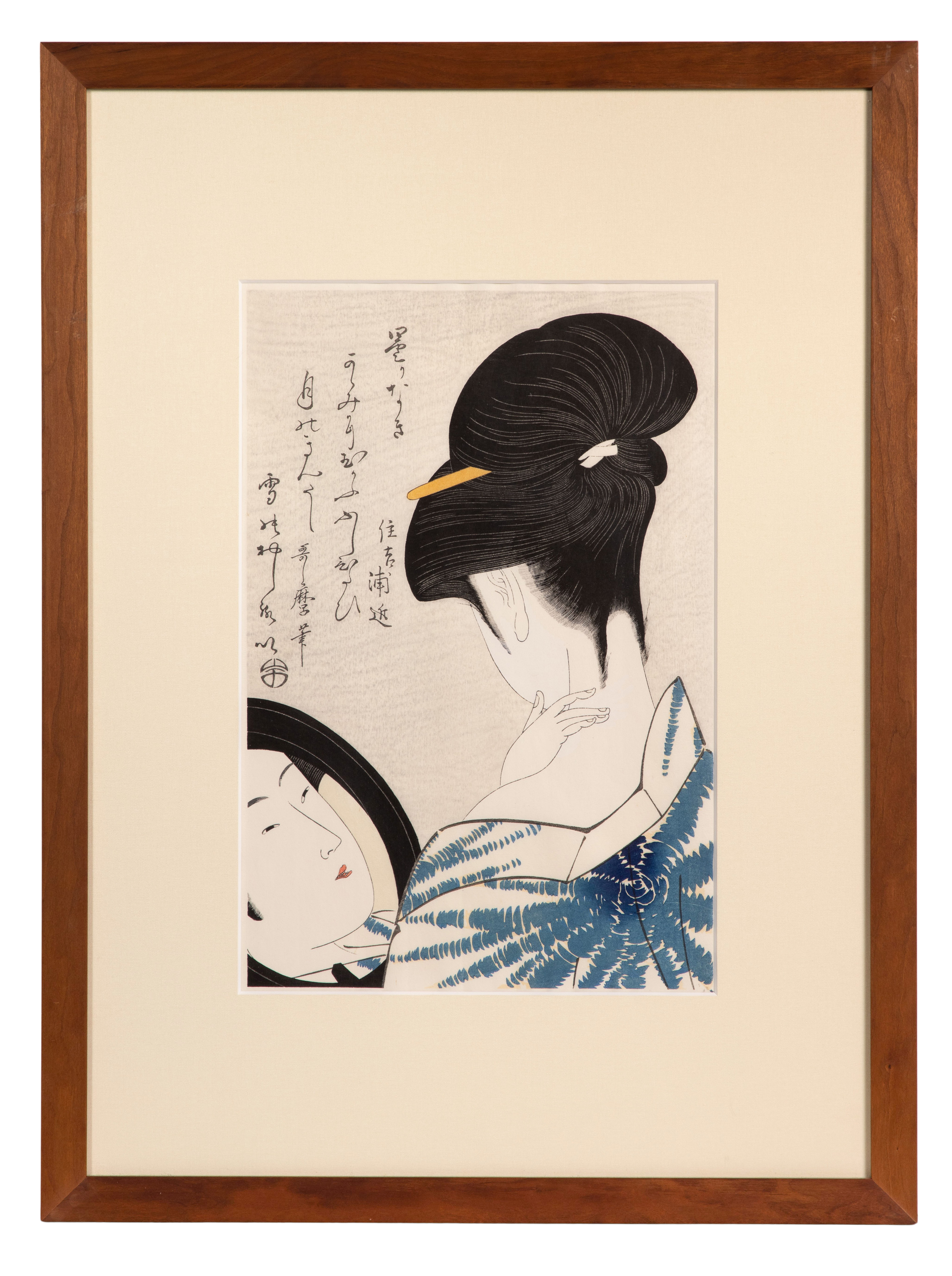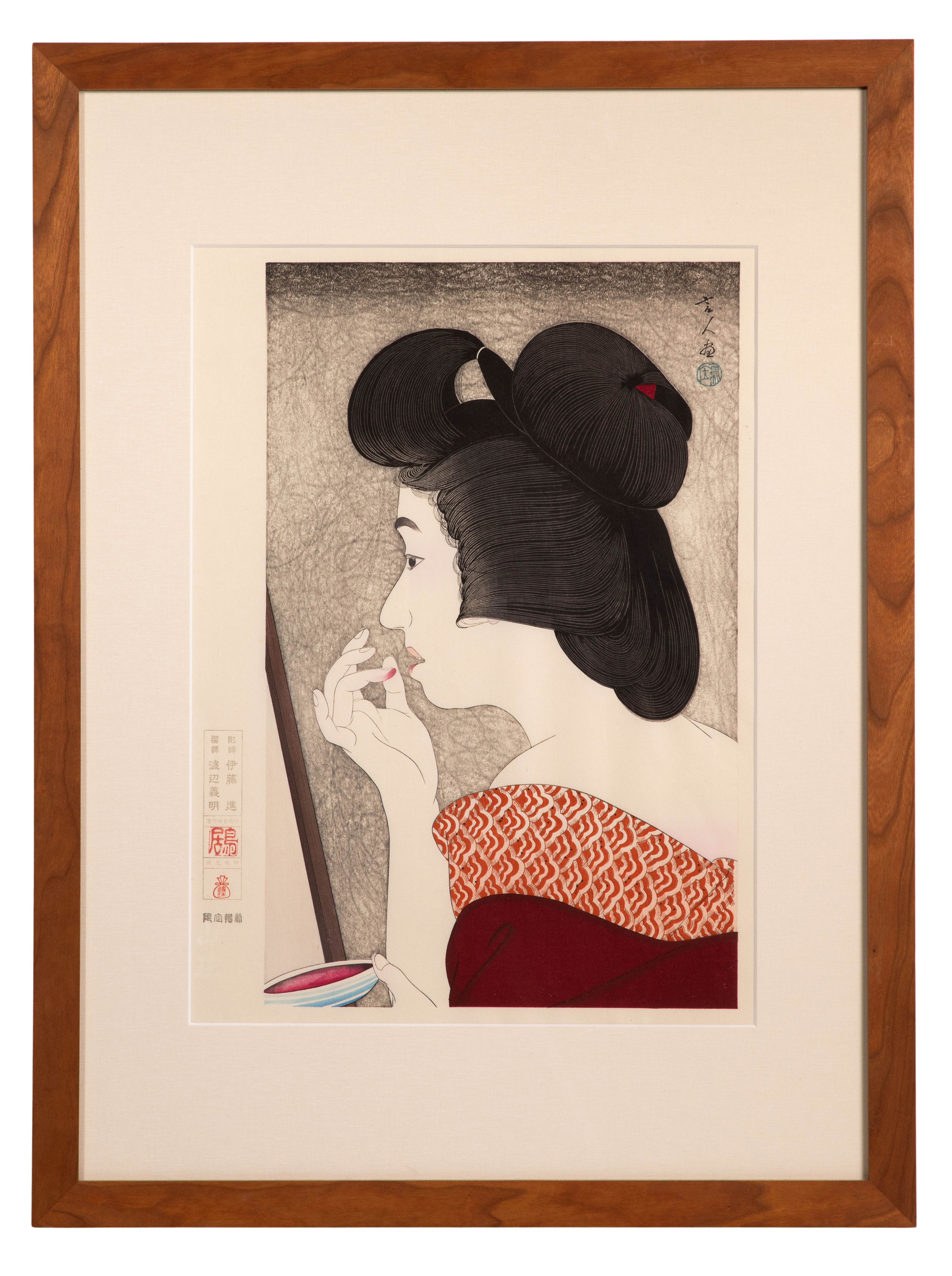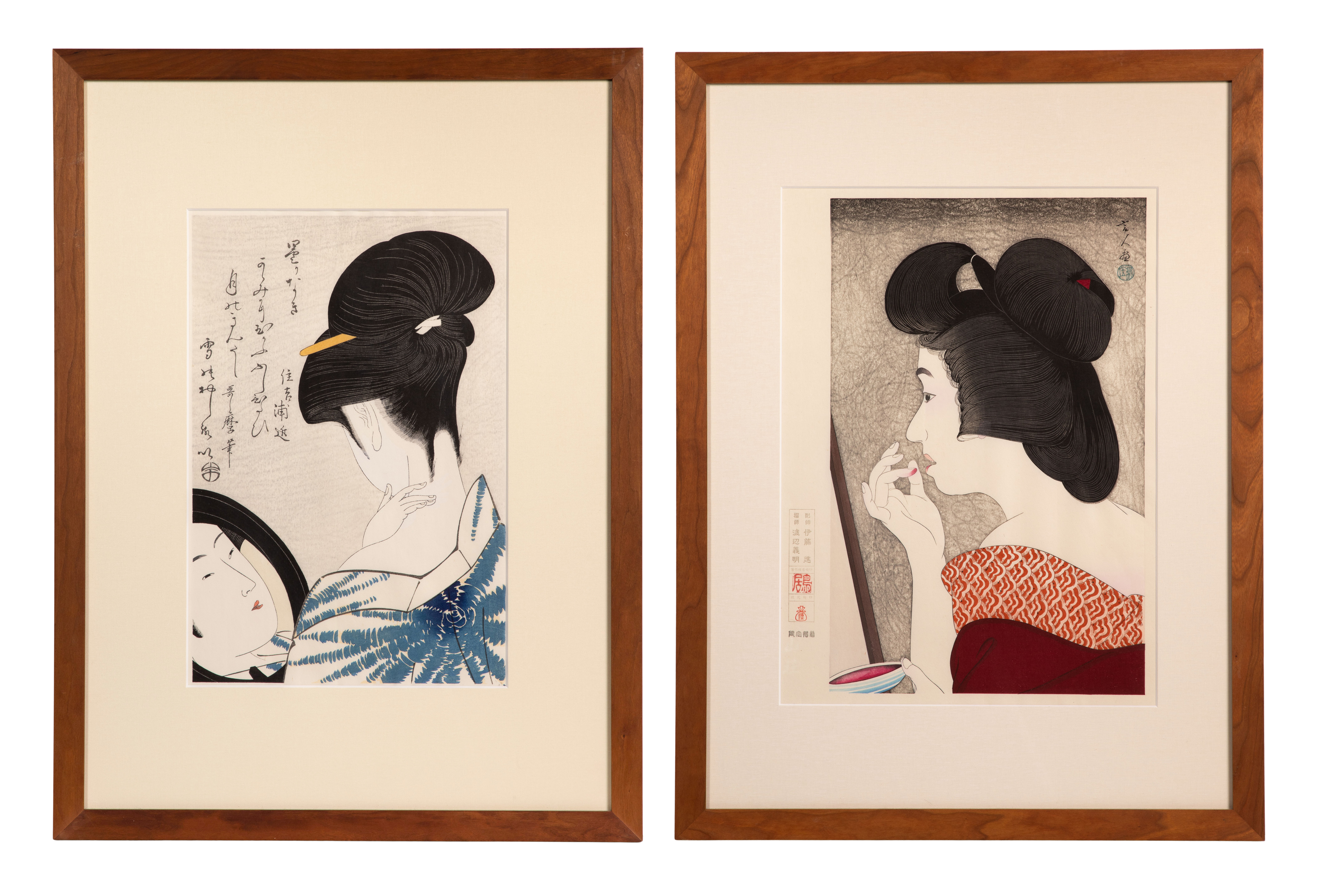 (2) items including a Tori Kotondo (Japanese, 1900-1976) part of his 1931 series titled ‘Twelve Aspects of Women’, ‘Rouge’ depicting a young woman applying red lip rouge while looking into a mirror, inscribed on the left side and a Kitagawa Tamaro (Japanese, 1753-1806) ‘Woman Powdering her Neck’, inscribed on the upper left side, both prints matted under acrylic in wood frames