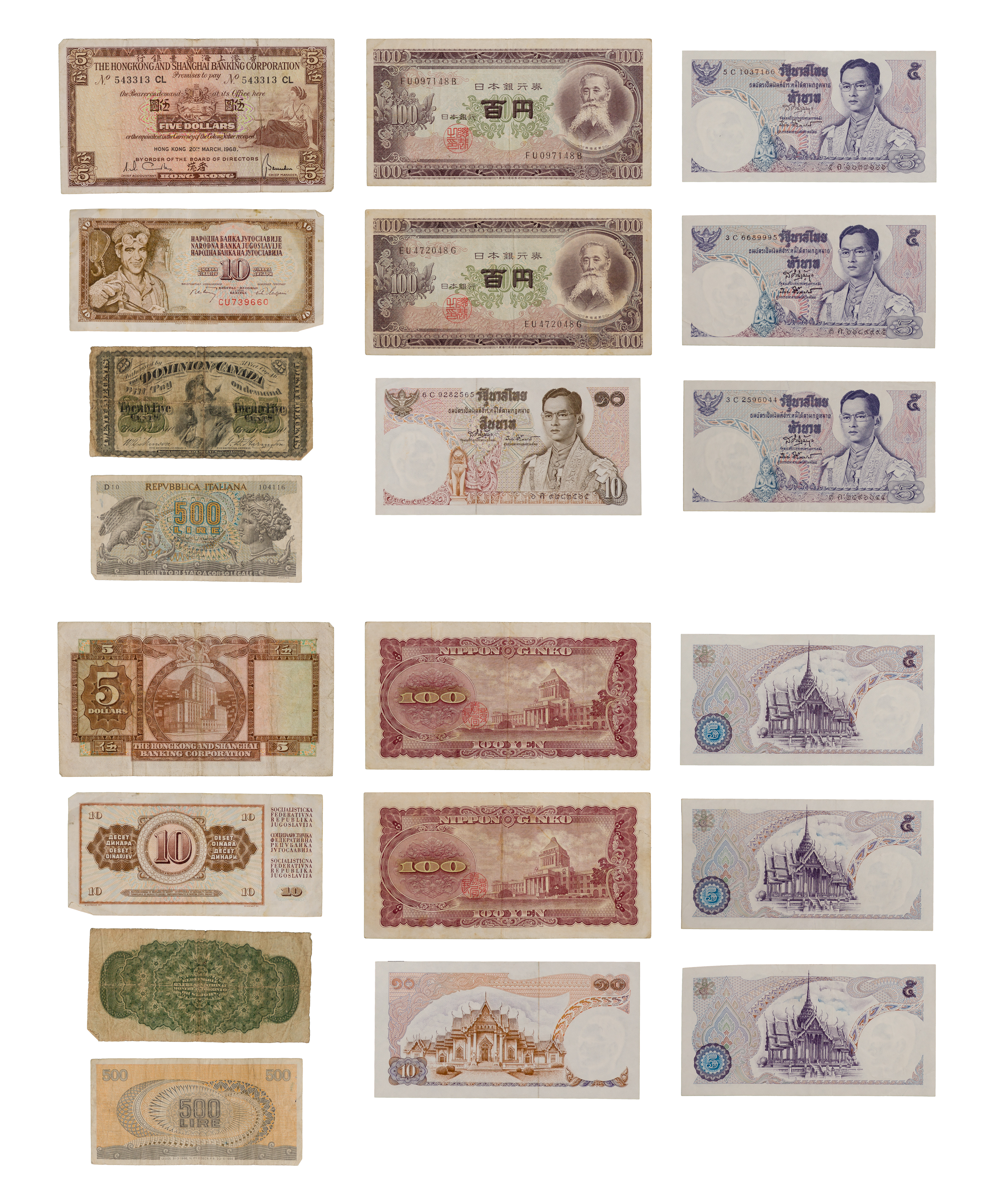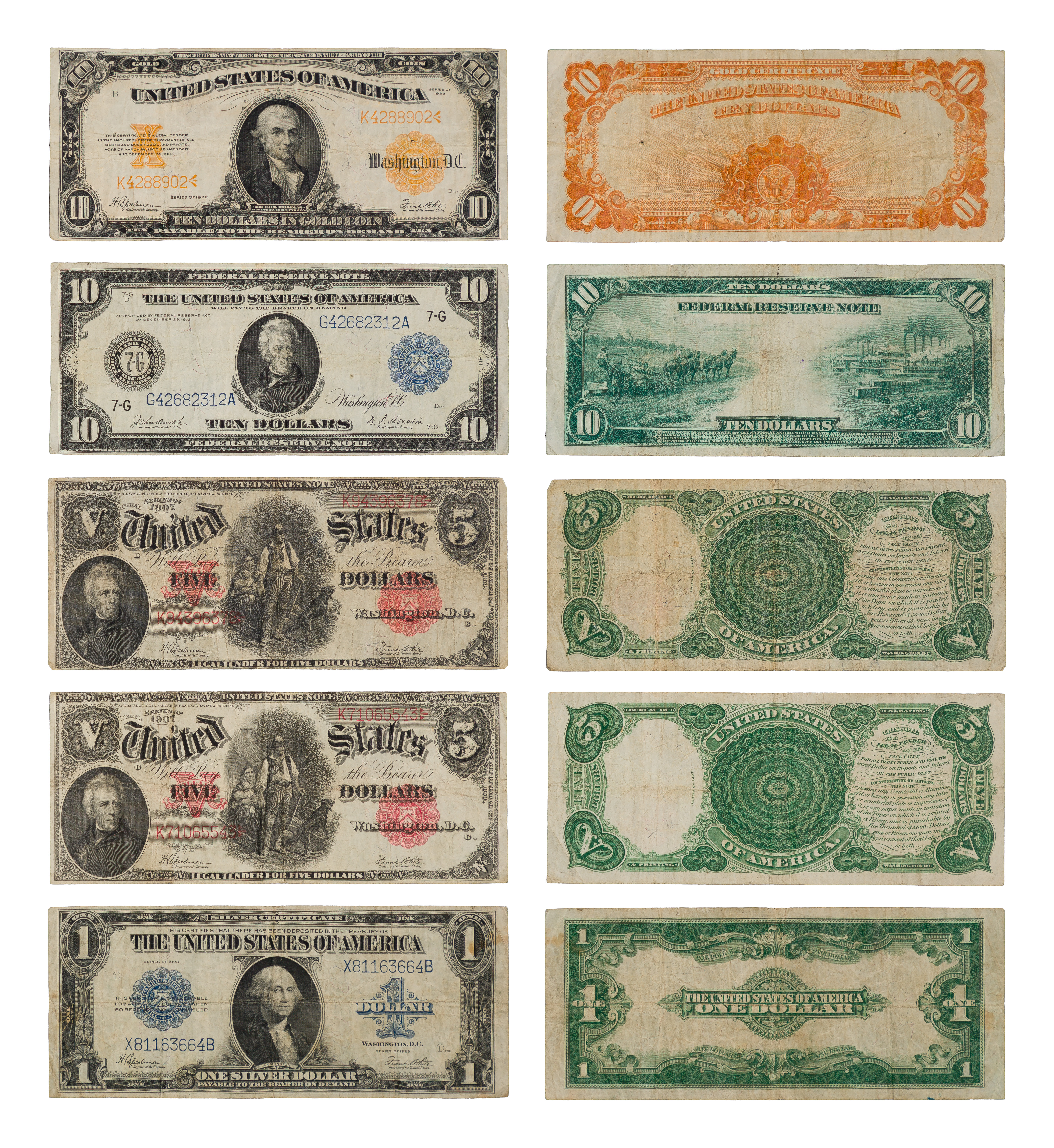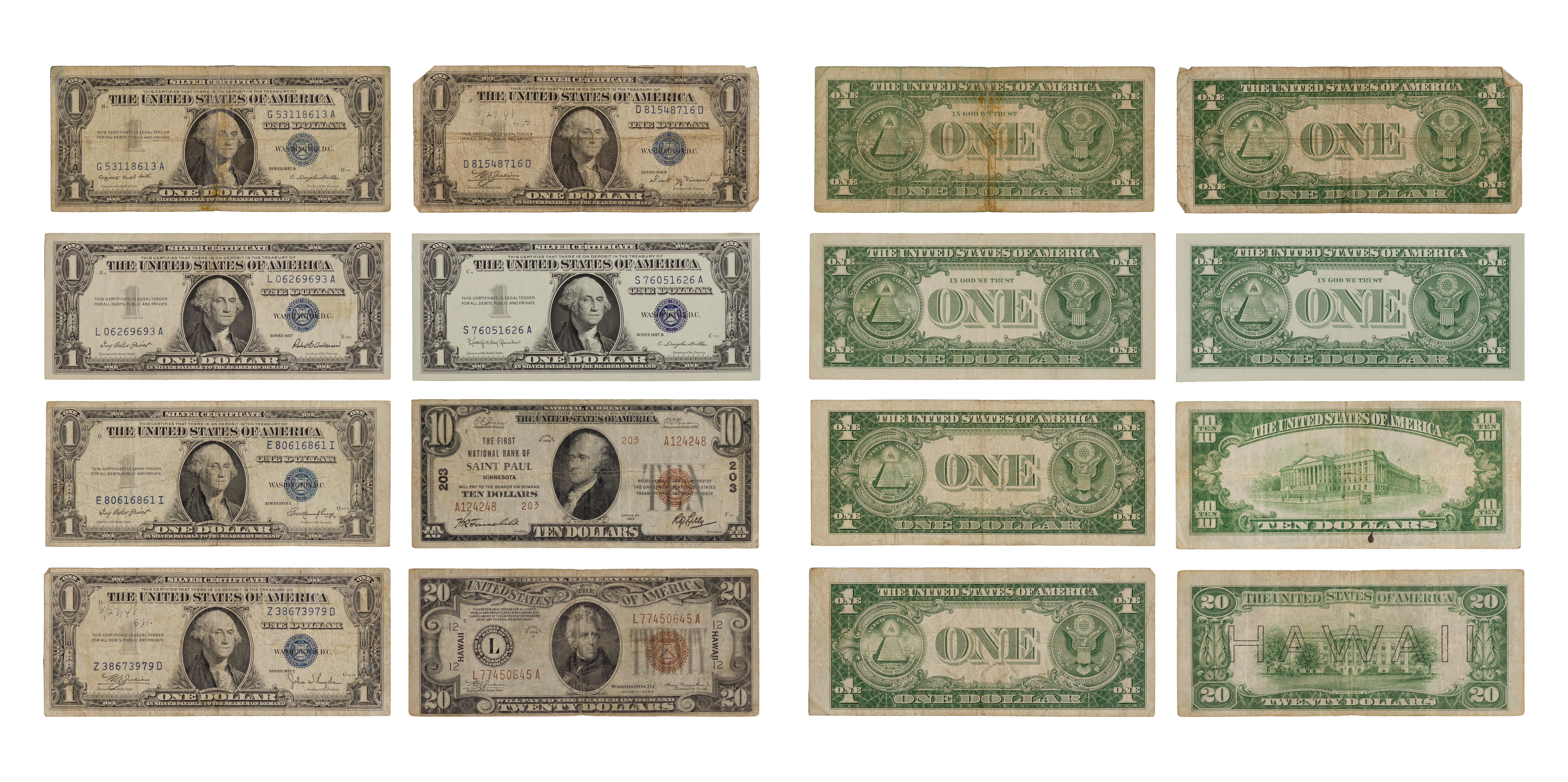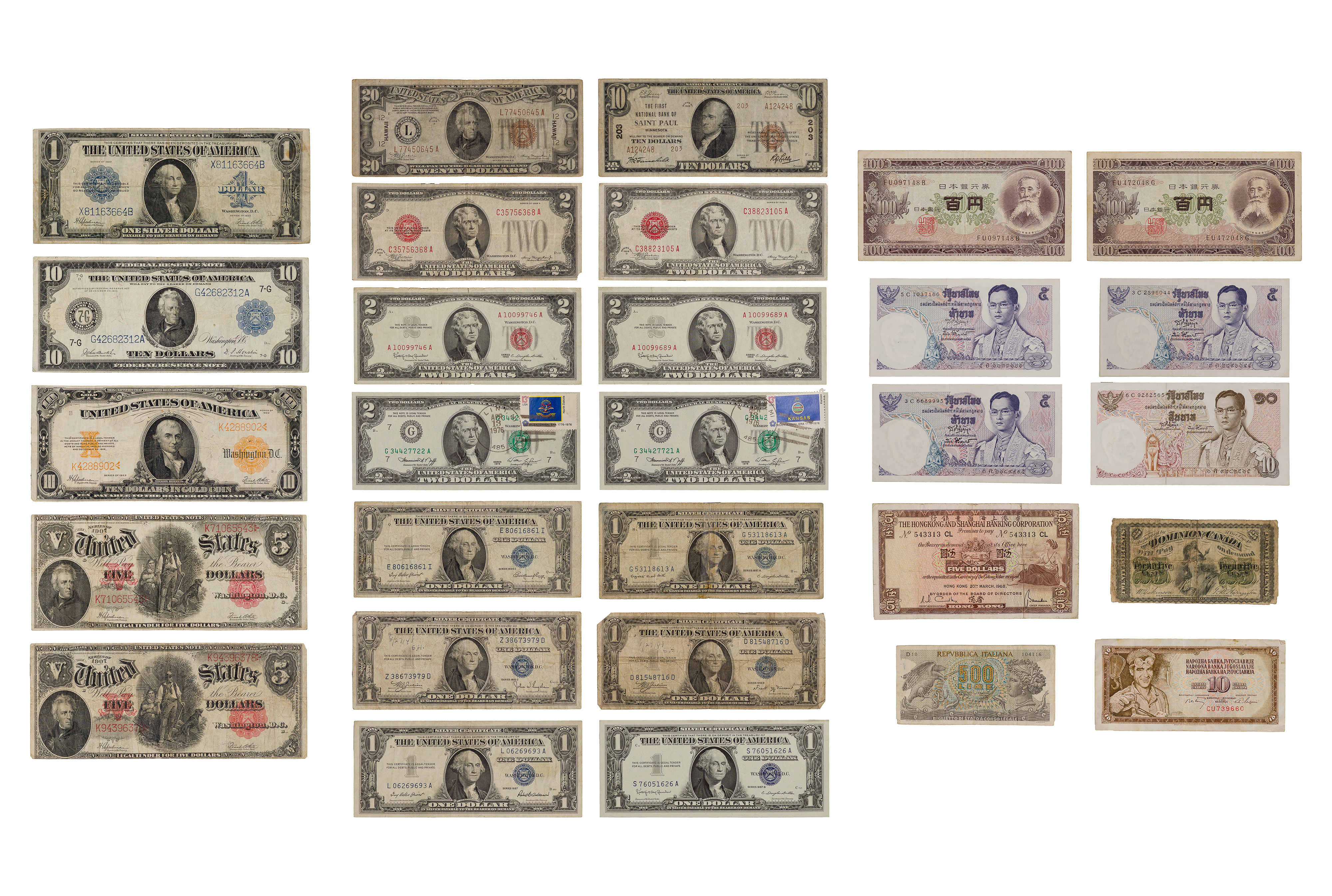 Including a 1922 $10 gold certificate, a 1914 $10 federal reserve, (2) 1907 $5 wood chopper, a 1923 $1 silver certificate, a 1934-A $20 Hawaii, a 1929 $10 St. Paul national, (2) 1928-D $2, (2) 1963 $2, (2) 1976 $2 postal cancellations, (6) $1 silver certificates and (10) foreign bank notes