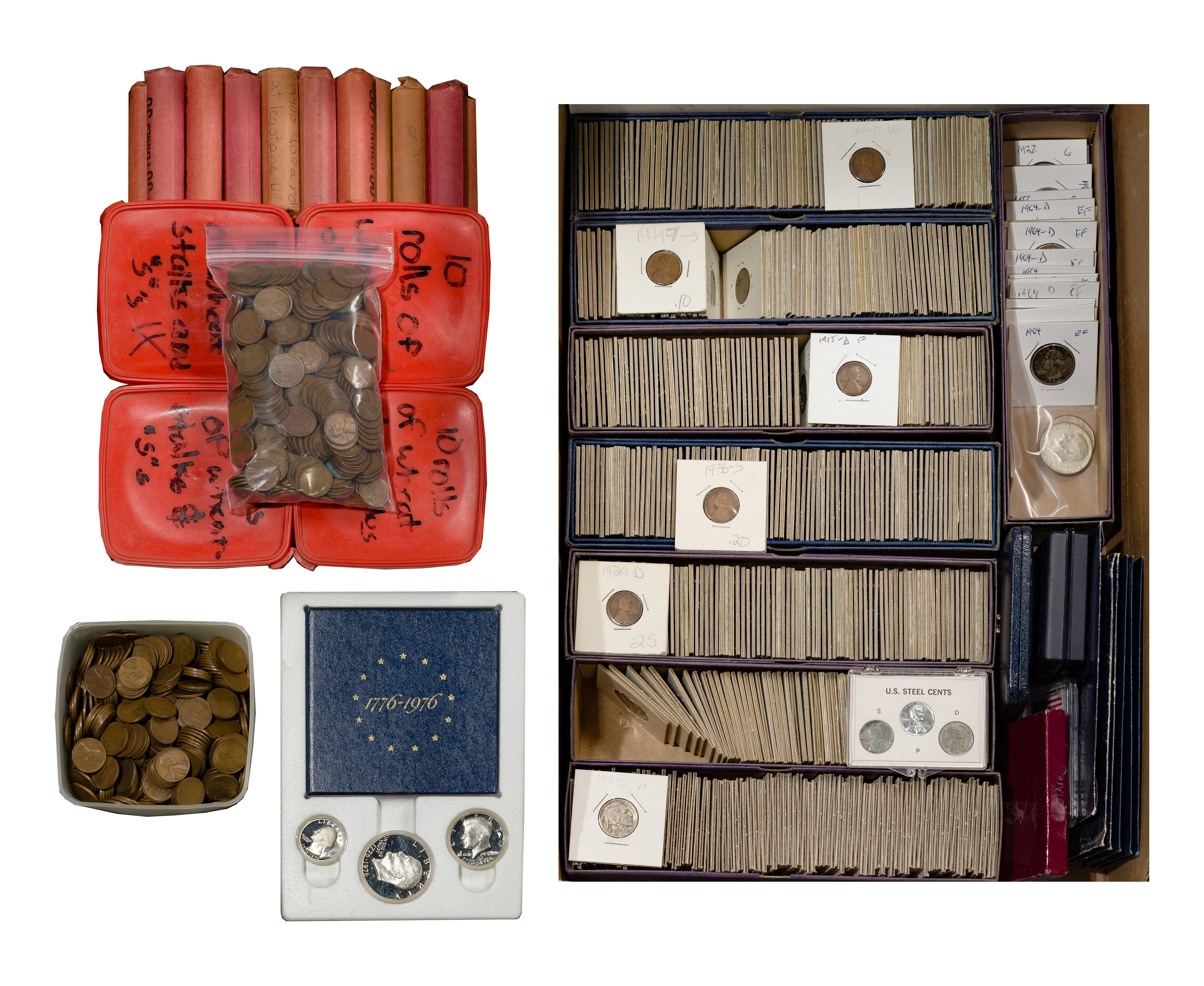 Including $6.00 face value US 90% silver 25c, S1.00 face value US 40% silver 50c, a Shield 5c, (3) Liberty 5c, approximately (105) Buffalo 5c, (13) War Nickels, (24) Jefferson 5c, approximately (85) rolls of wheat and memorial 1c, approximately (350) loose wheat and memorial 1c, (3) 1971, a 1972 and (2) 1974 uncirculated Eisenhower $1, a 1999 Susan B. Anthony proof $1, a 1982 Washington 250th anniversary, a 1973 bicentennial sterling silver medal, a 1976 bicentennial silver proof set and a 2003 $1 silver eagle MS68 PCGS