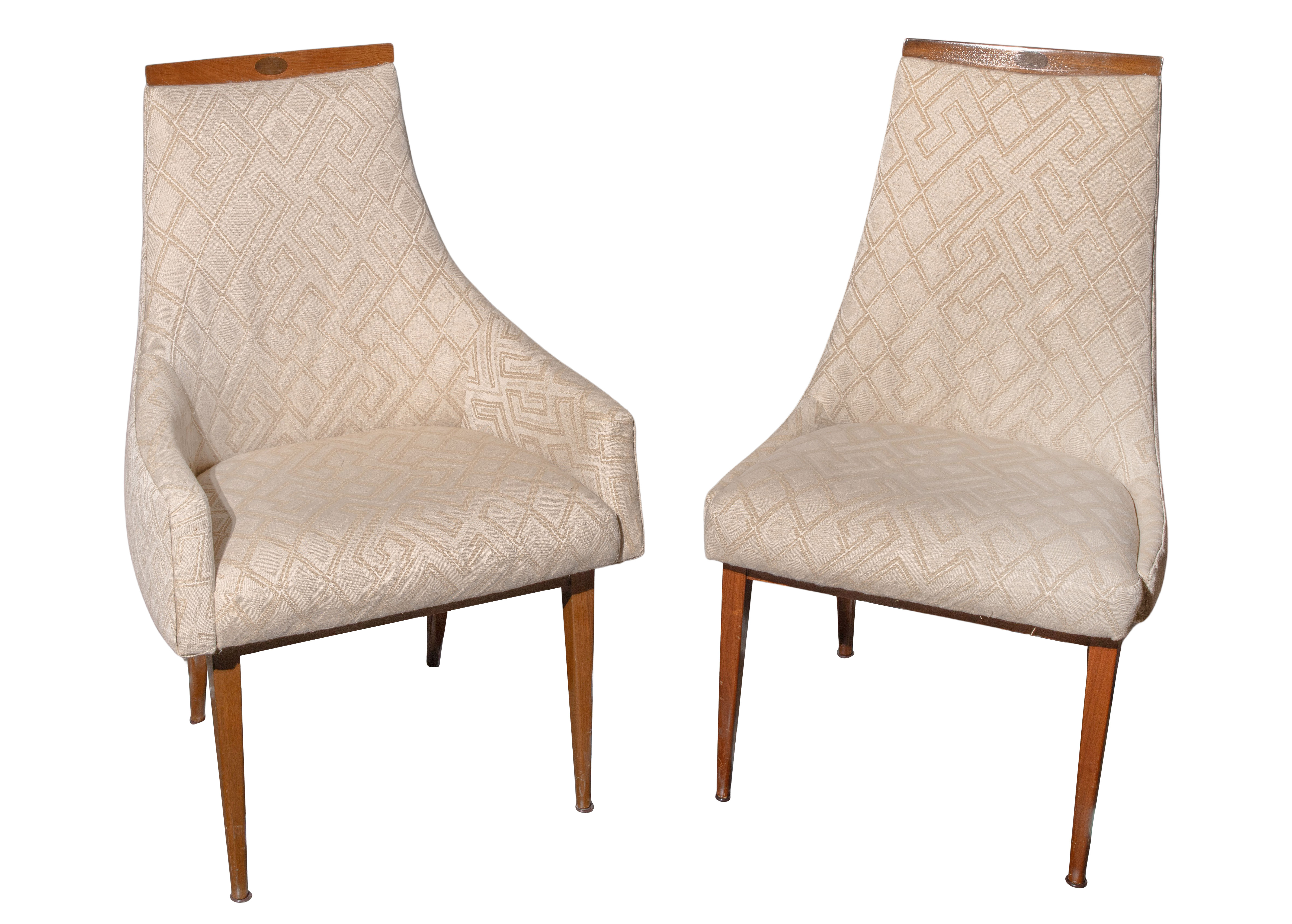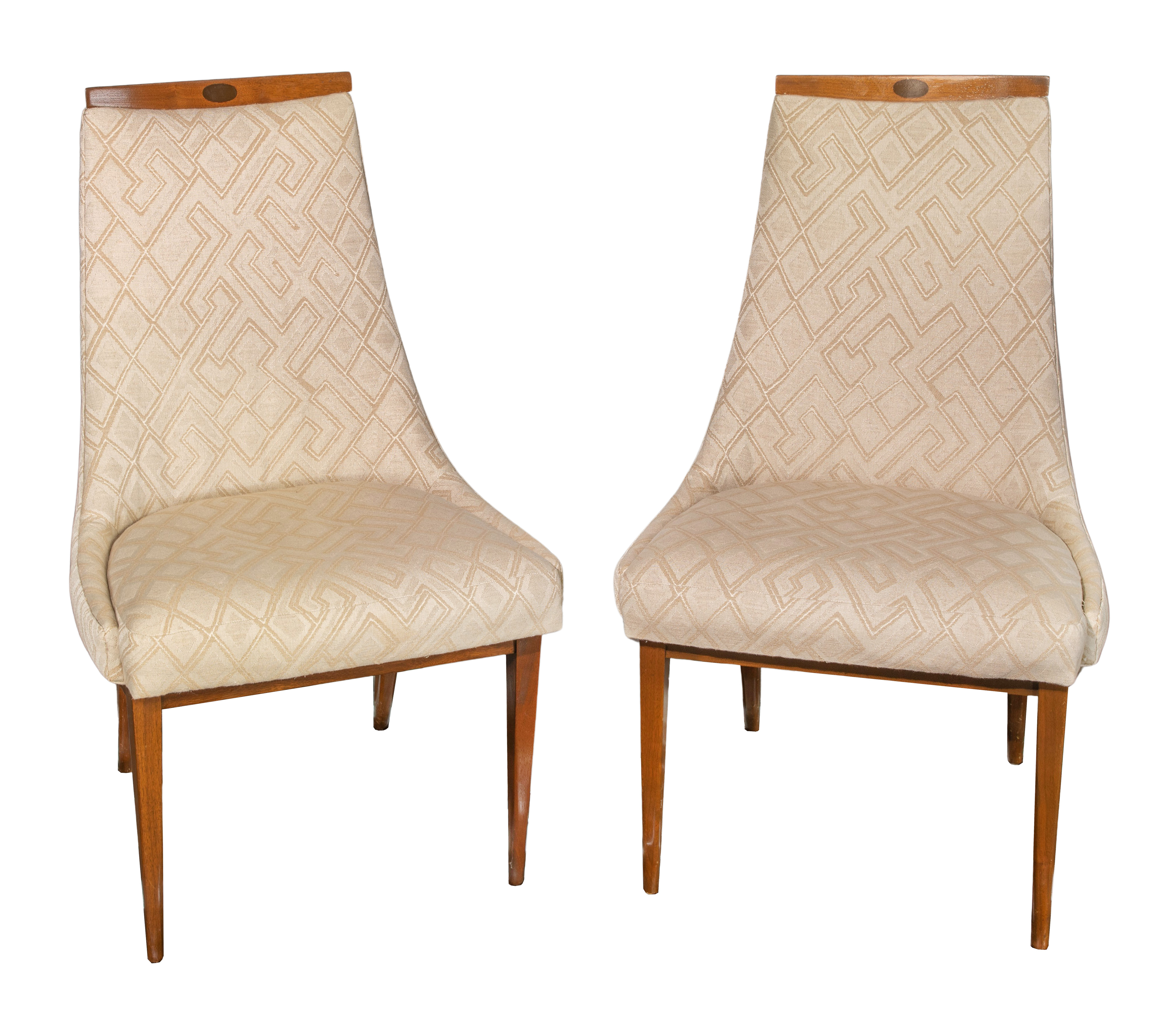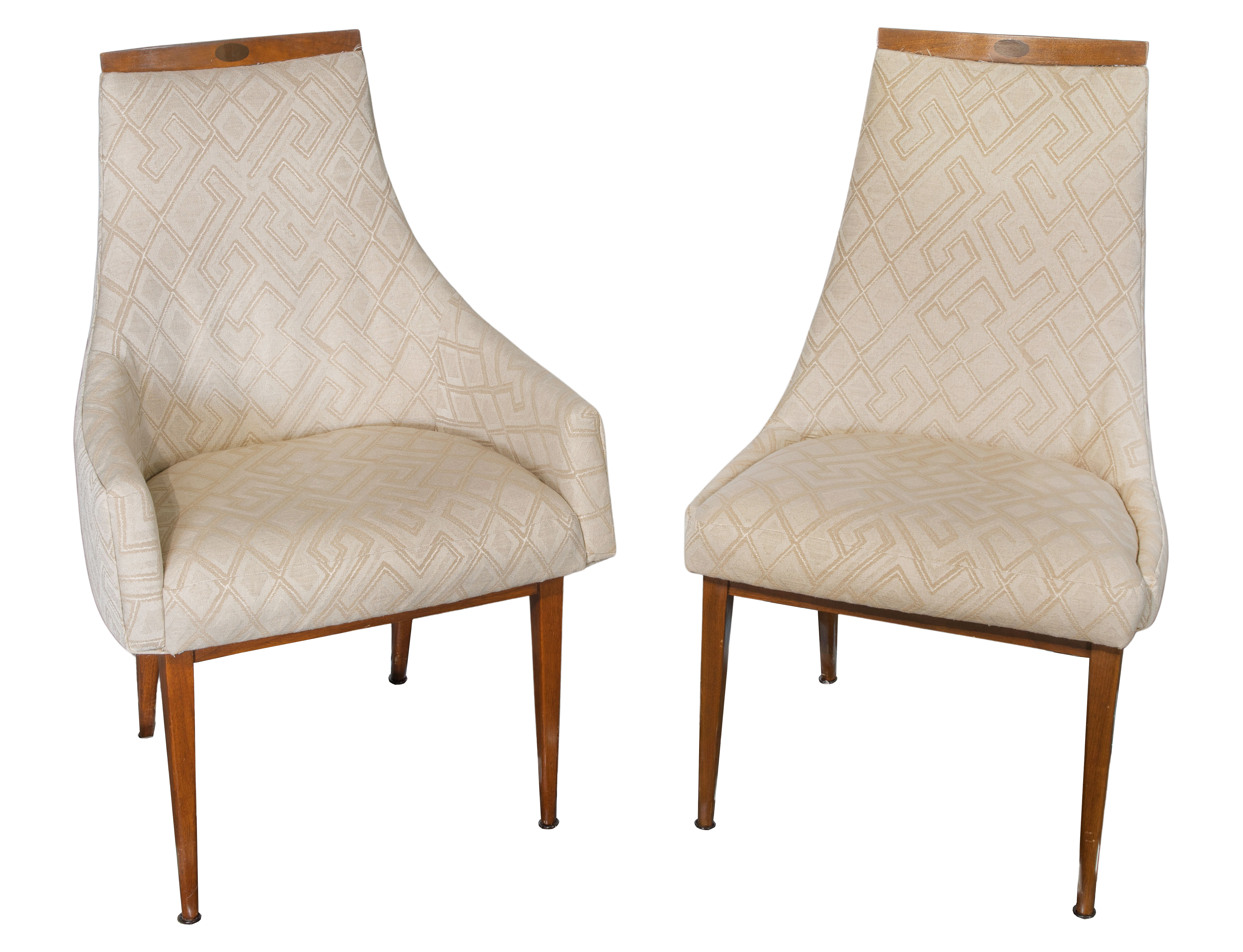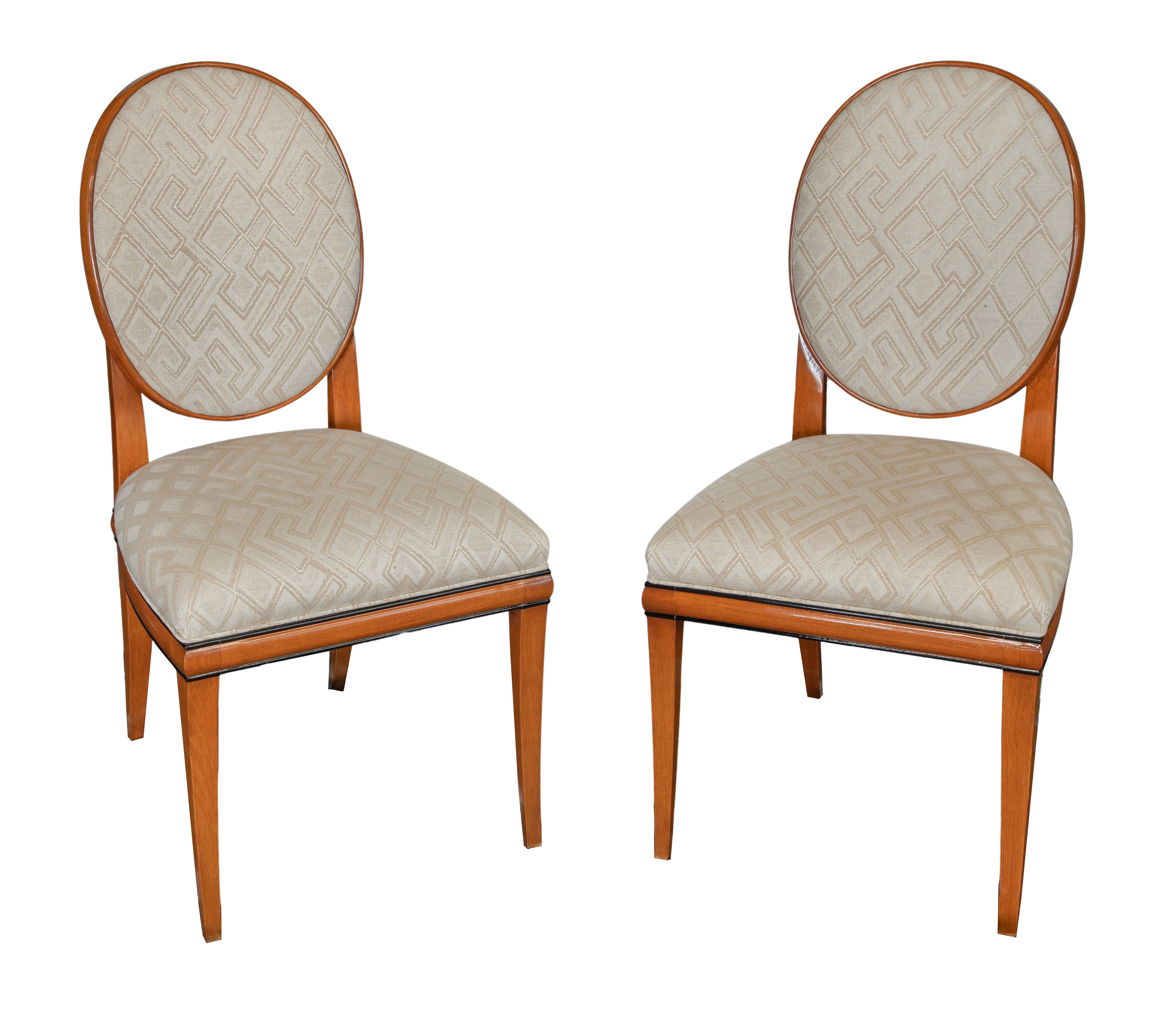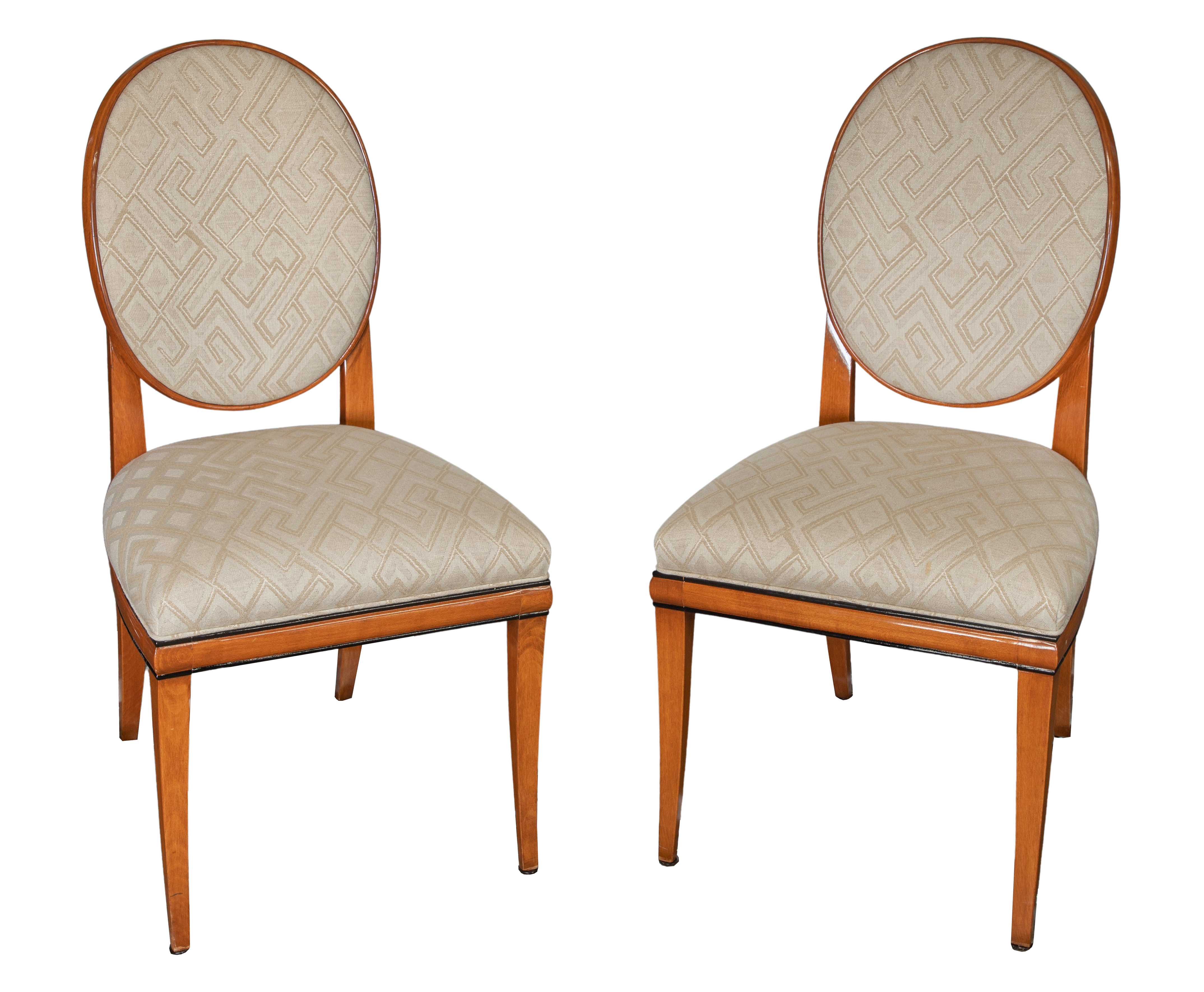 (10) total items including a set of (4) oval back upholstered side chairs having black accents and tags on the underside; together with a set of (6) upholstered slipper side chairs having wood band tops