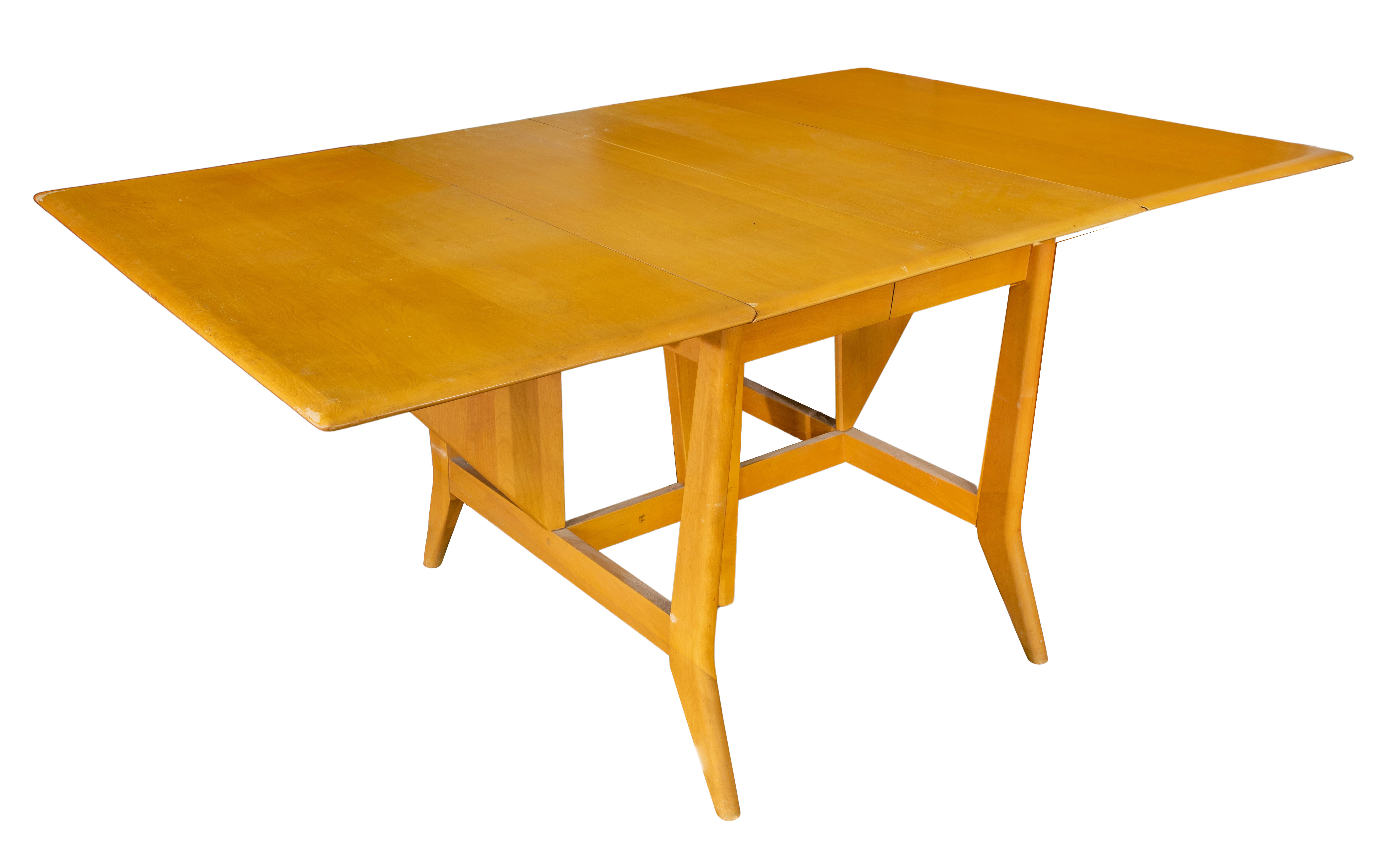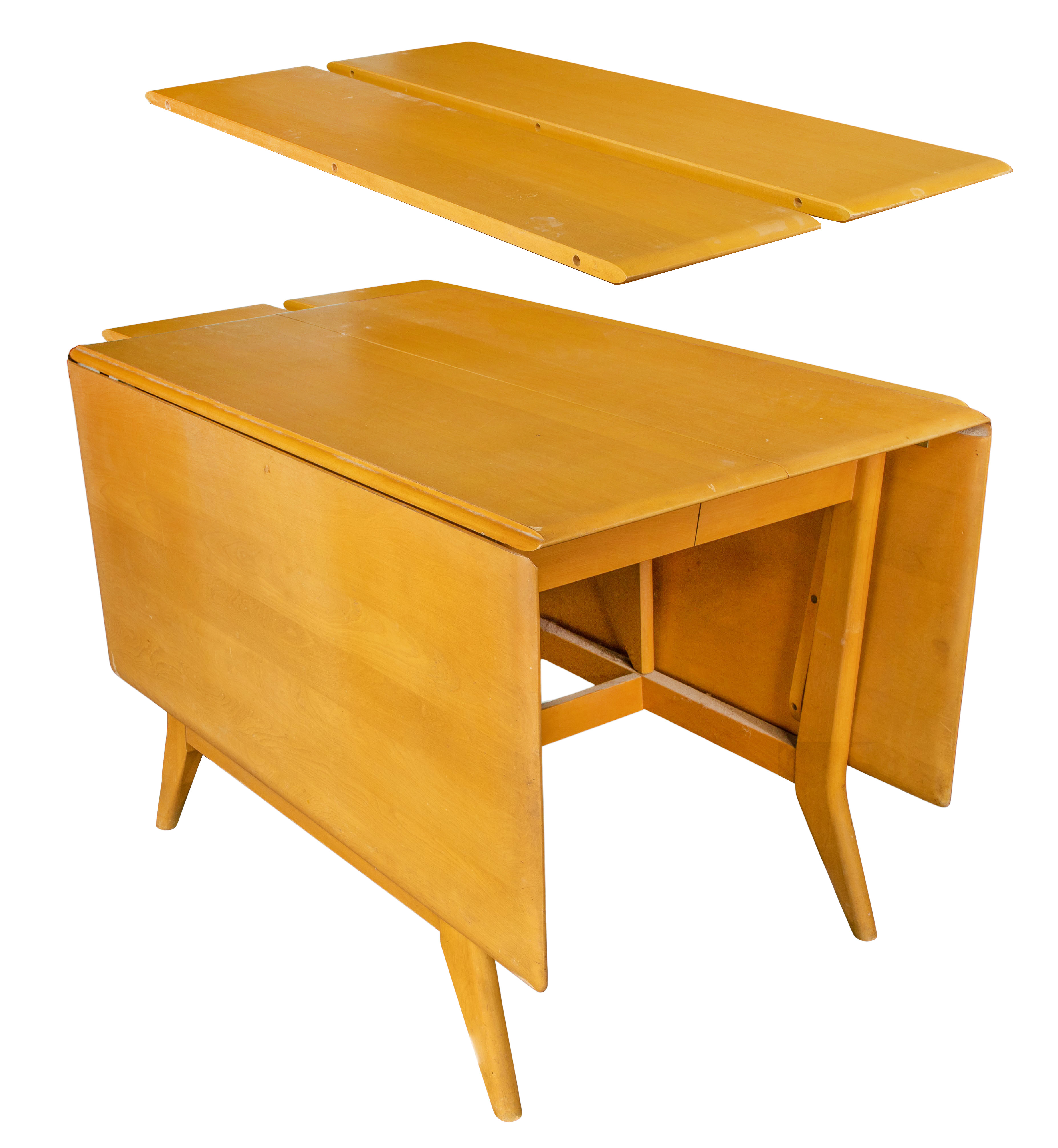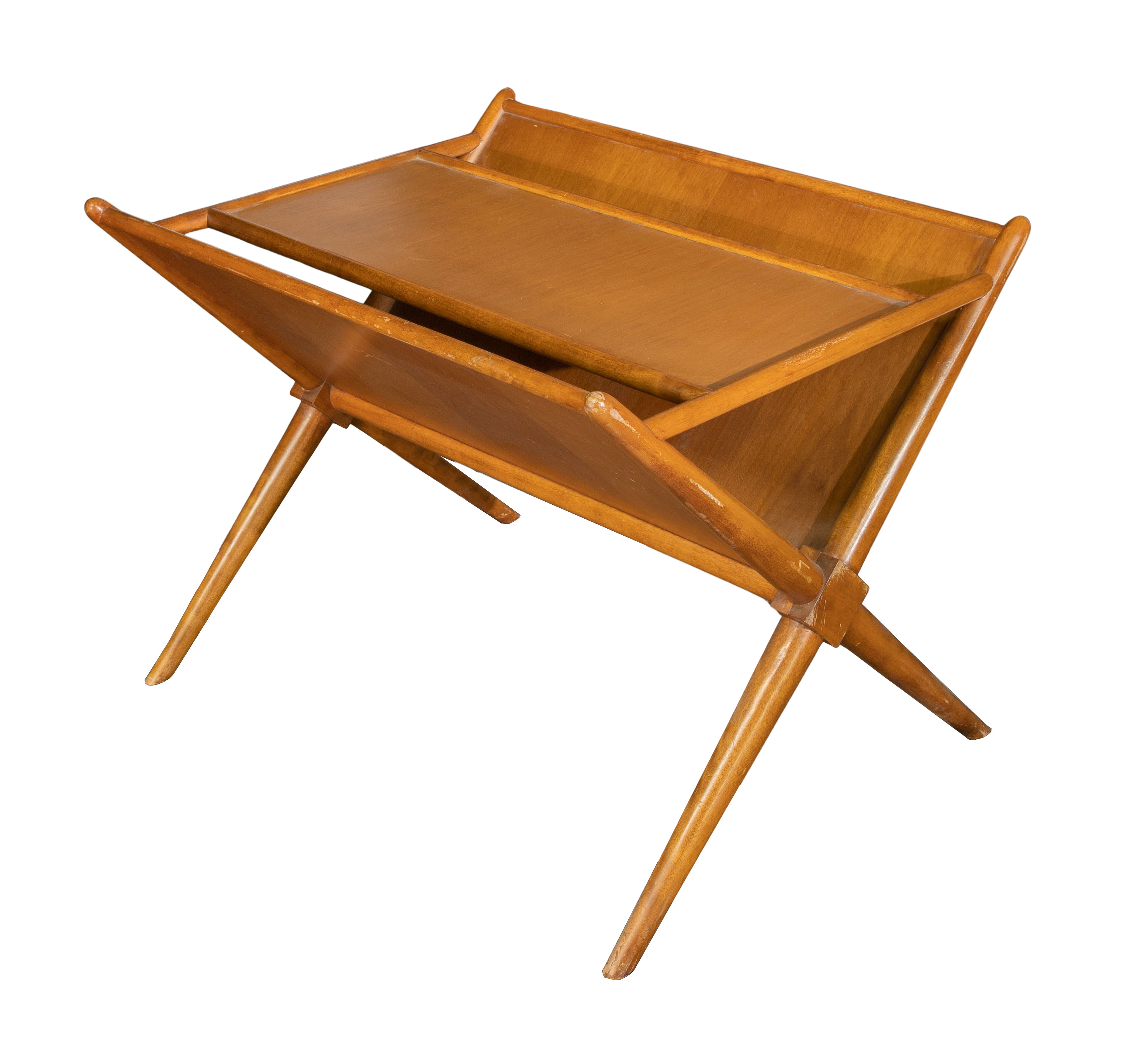 Walnut magazine rack designed by T. H. Robsjohn-Gibbings as well as a maple Heywood Wakefield set having a drop leaf table, (4) upholstered chairs and (2) leaves
