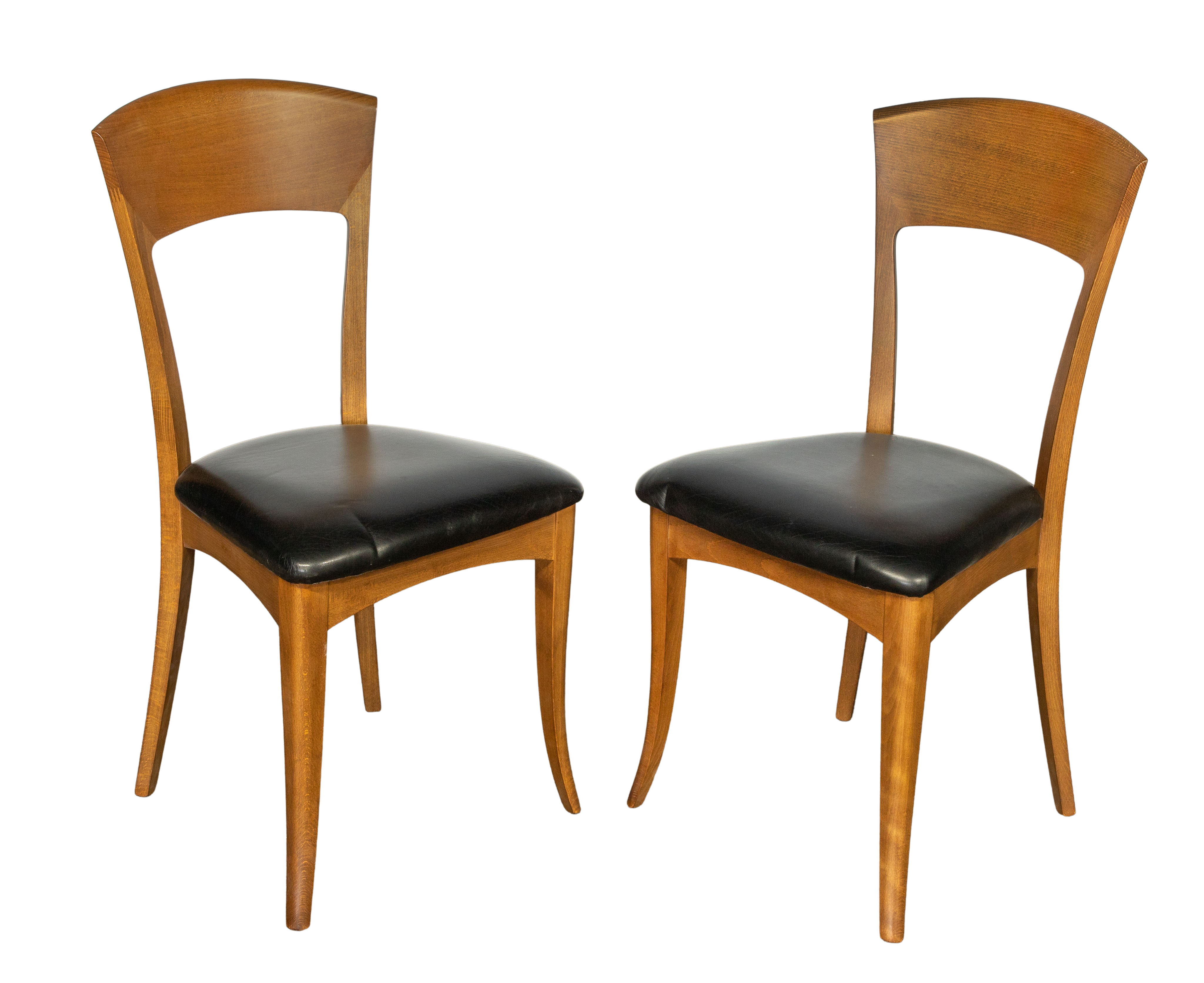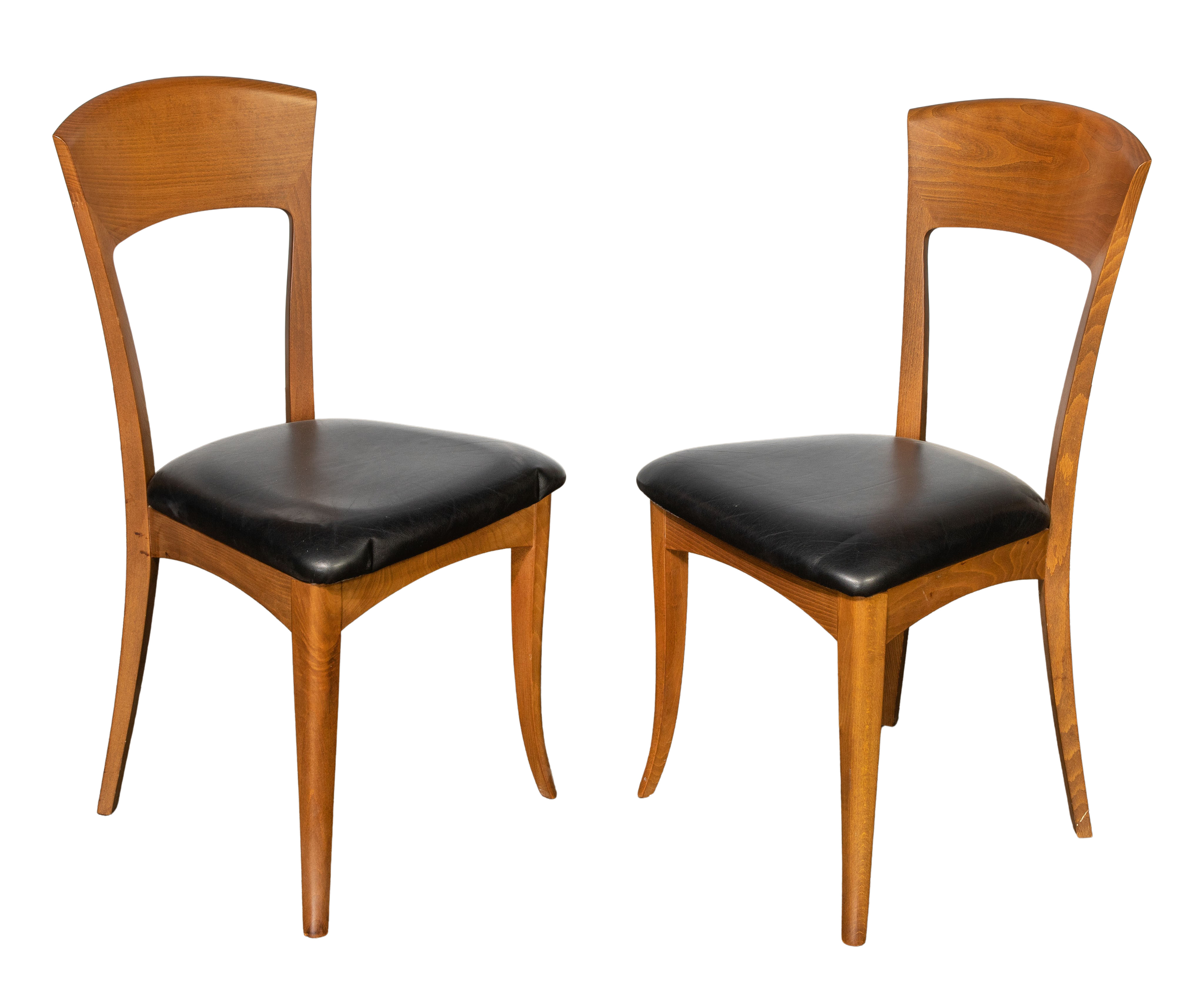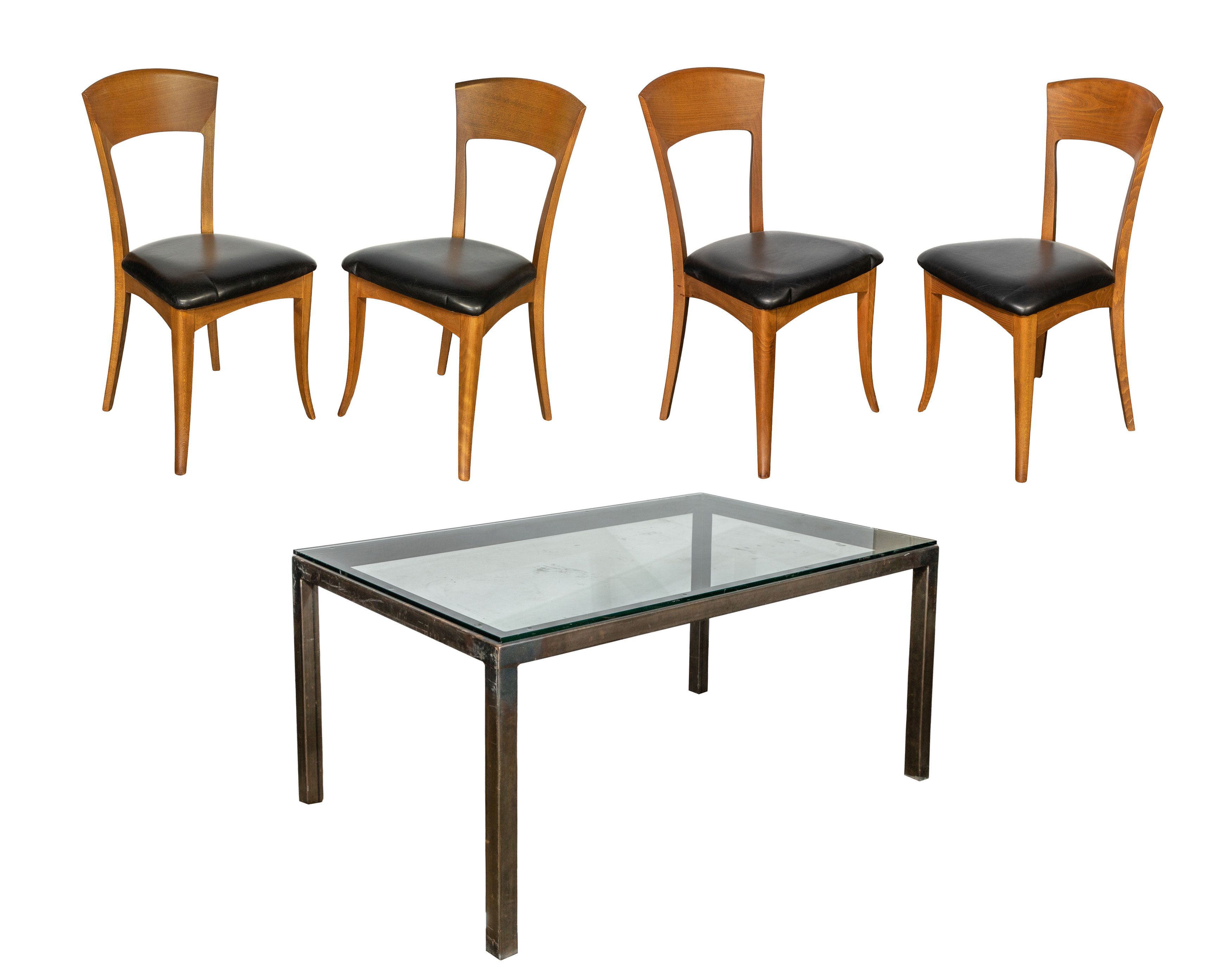 (5) total items including a set of (4) chairs having black leather upholstery, applied tag to the underside of each chair; together with a brushed aluminum table with glass top