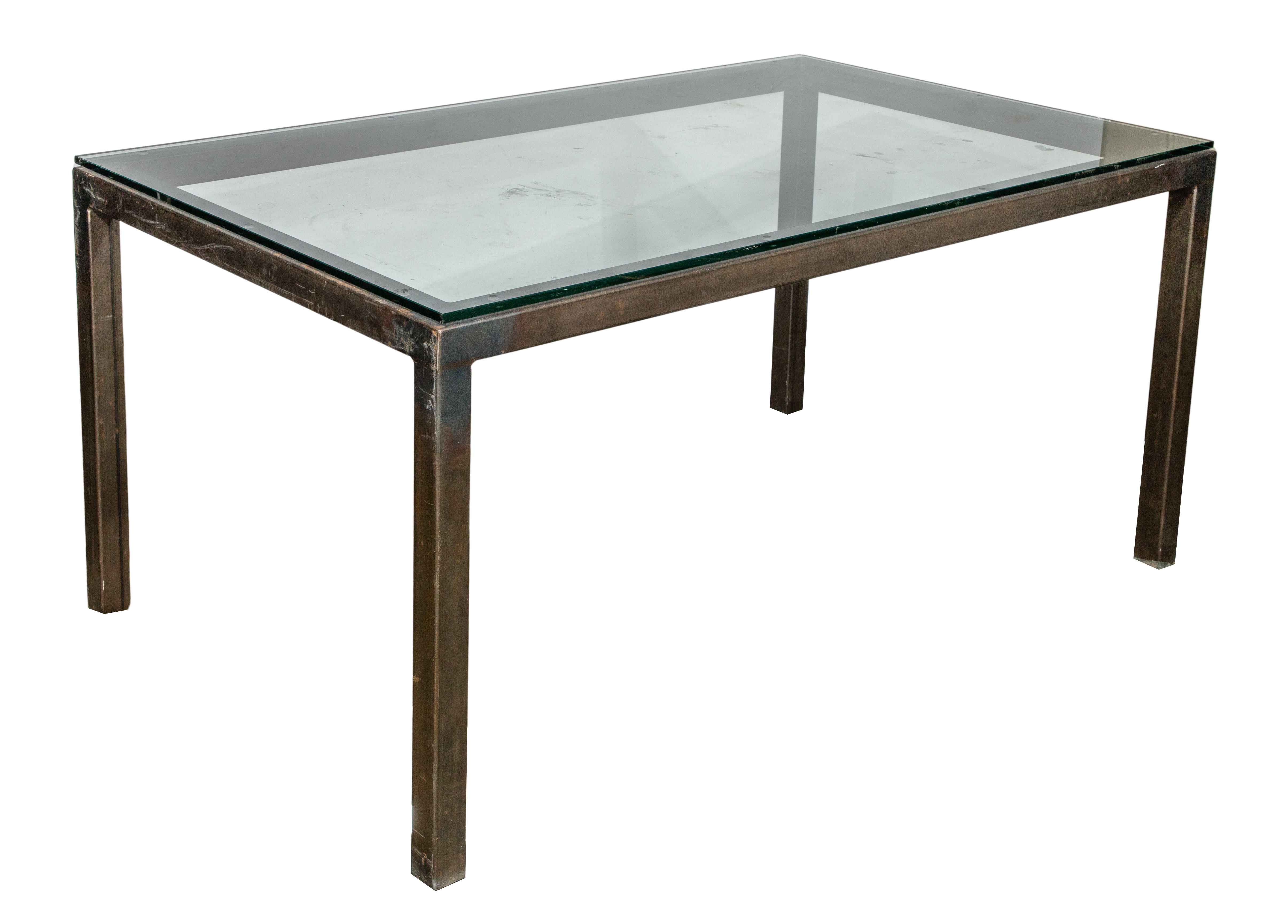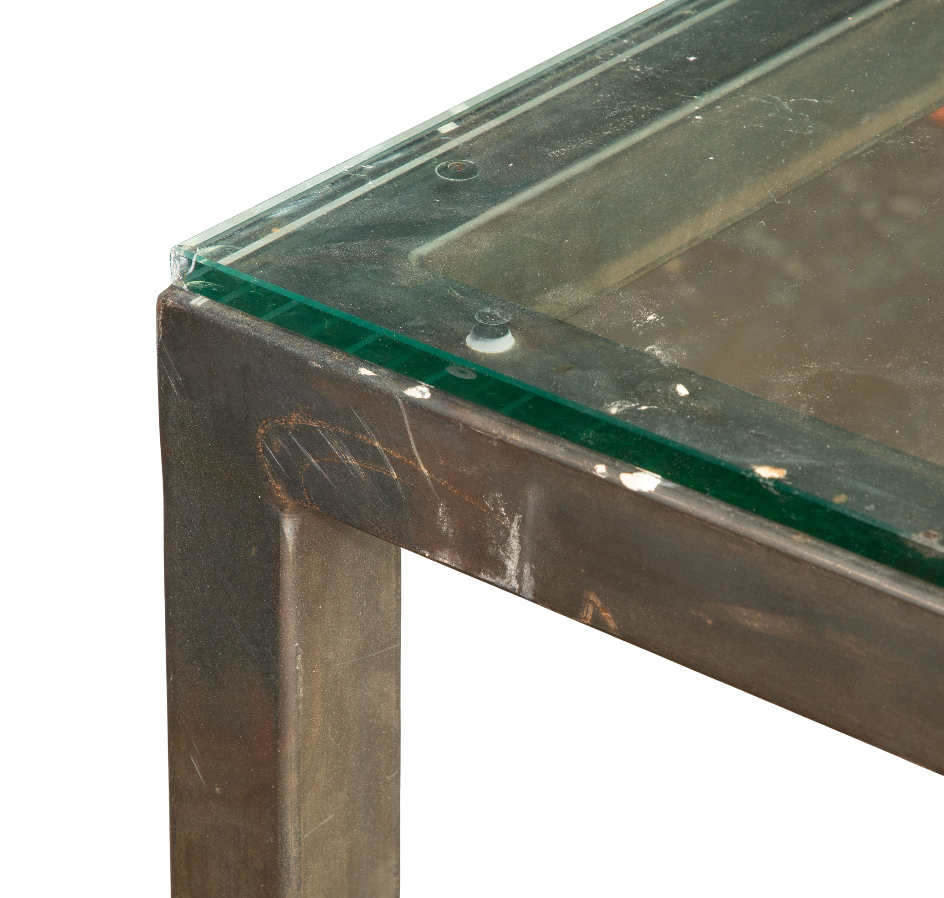 Condition: each cushion having indent to the leather, glass having heavy scratches, chips on the corners, white paint spots