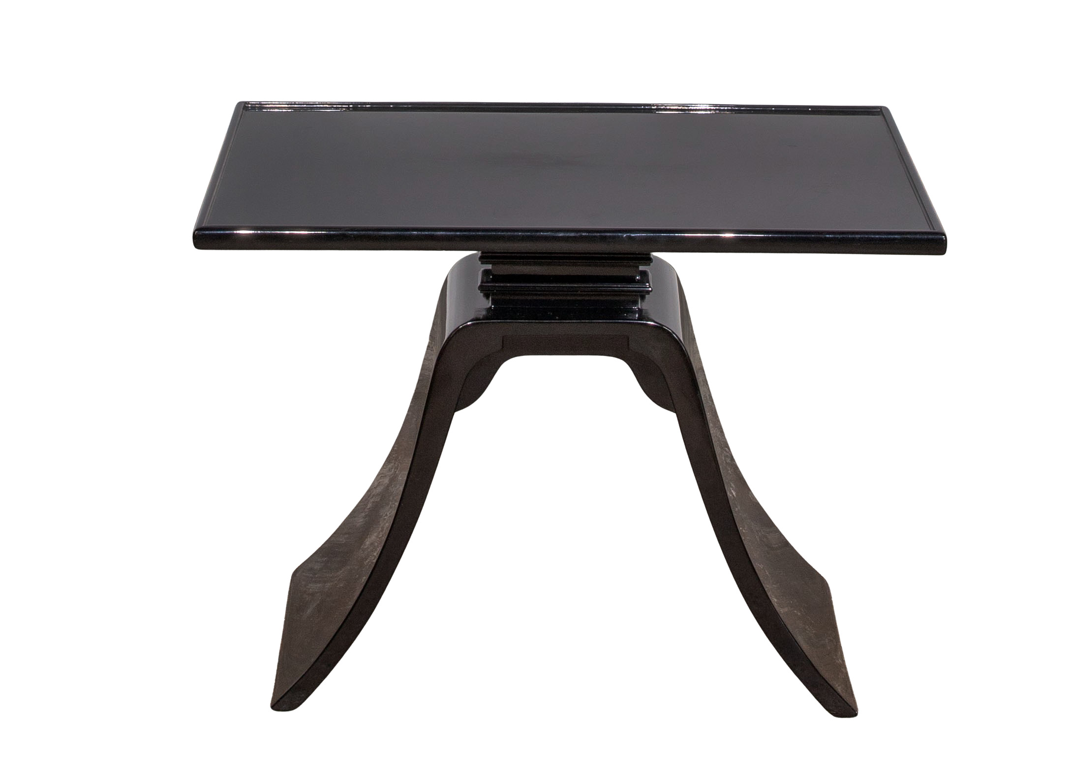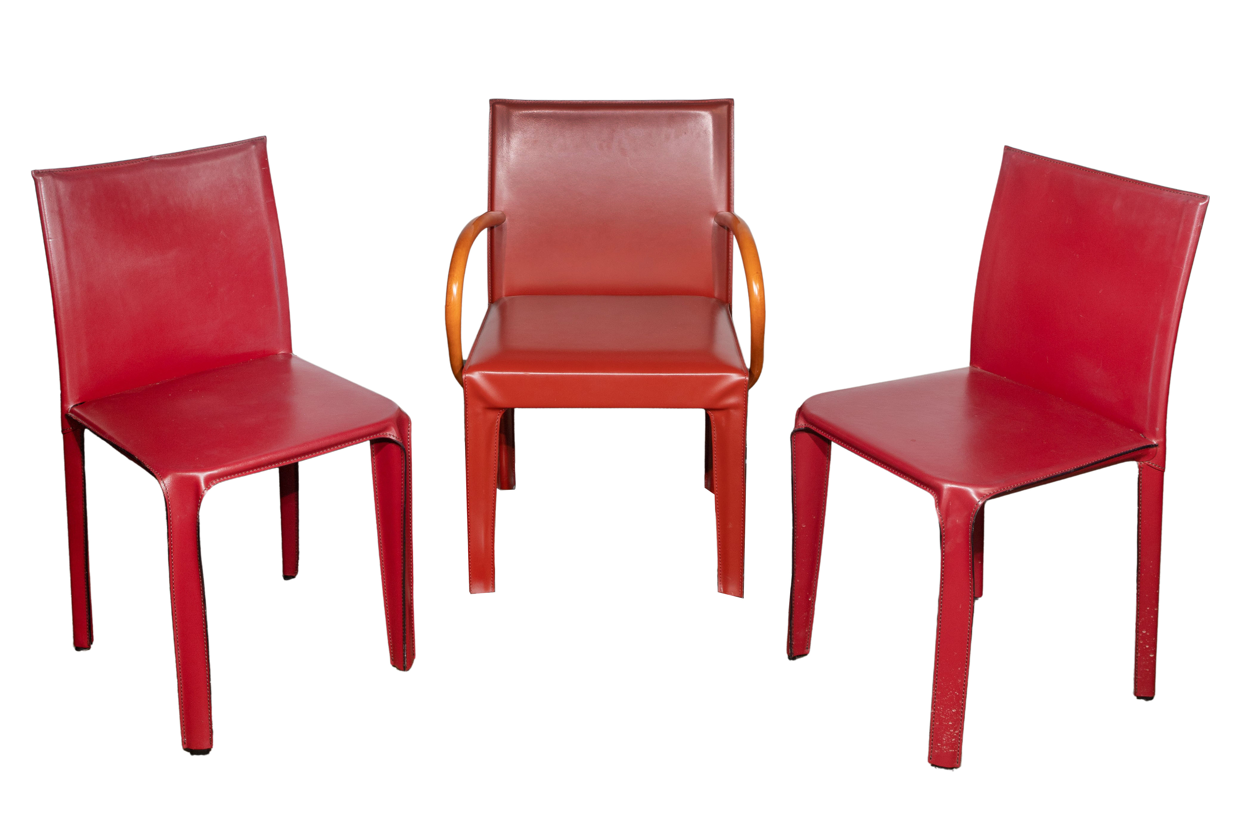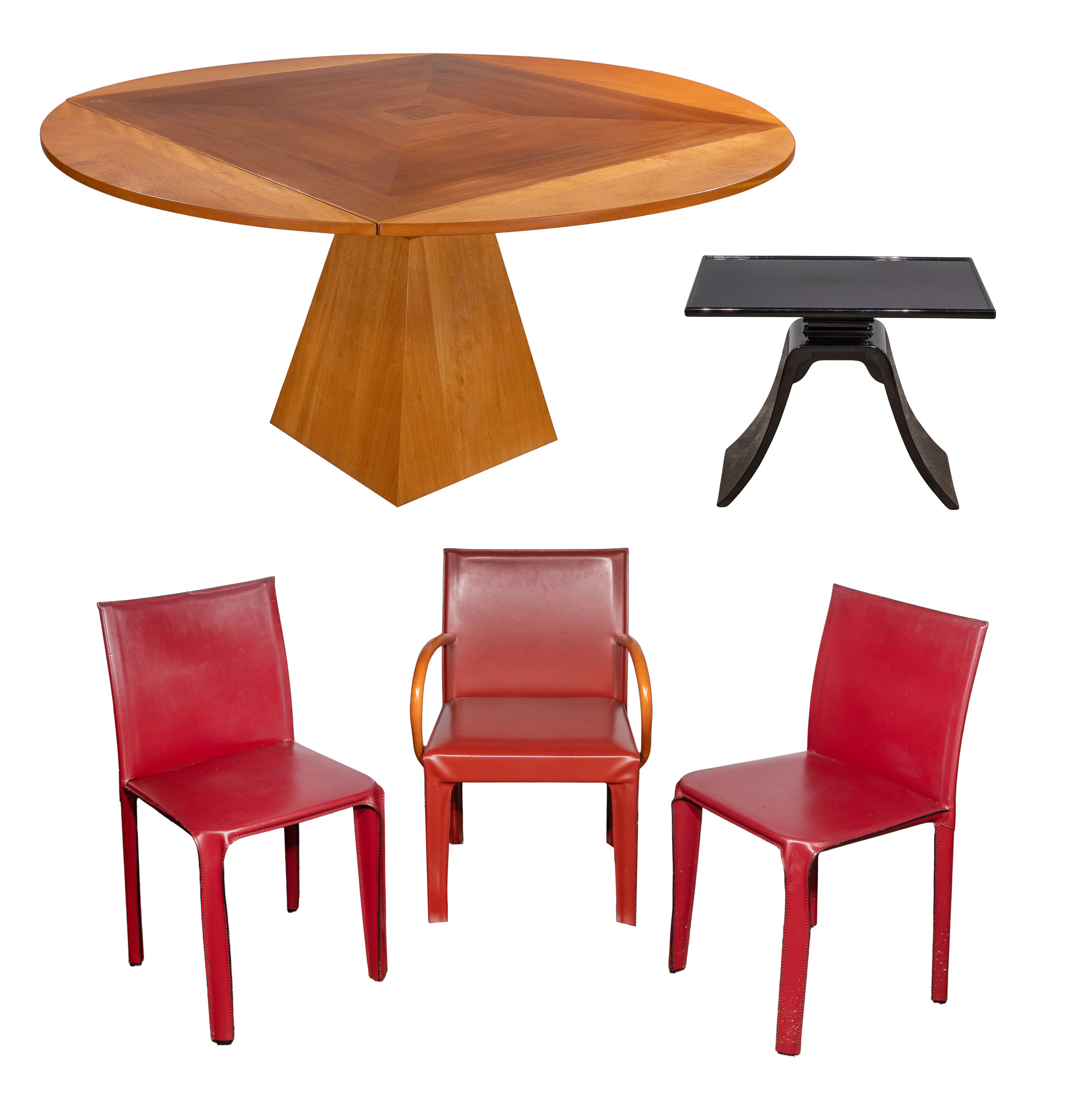 (5) items including a Chelsea style square table that converts to round, a pair of oxblood leather chairs, a Brentwood style oxblood leather arm chair and an Asian style black lacquered side table