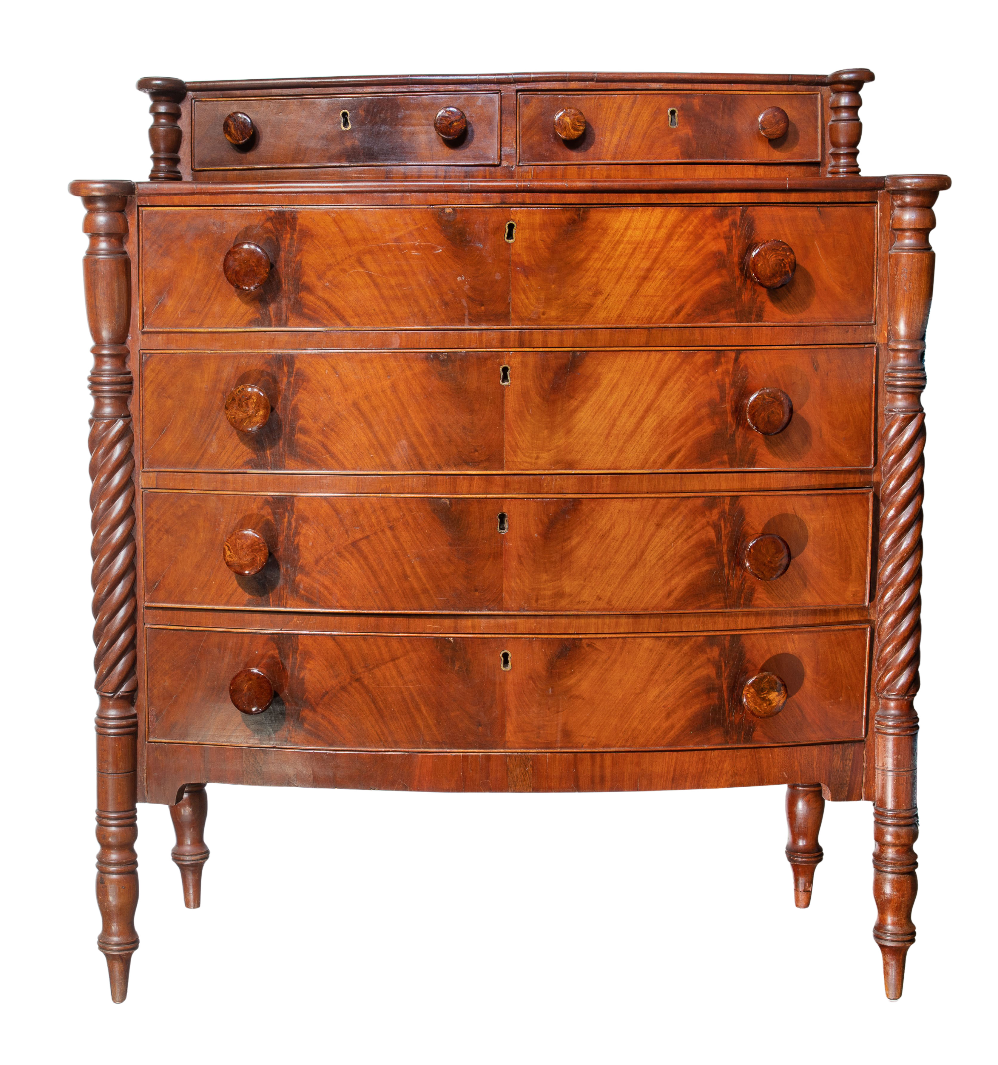 (2) items including a bow front chest having turret corners, flanked by fluted barley twist columns on turned legs and two smaller set-back drawers over four larger bow front drawers as well as a George III serpentine front chest having four drawers, rounded corners and scalloped skirt on bracket feet