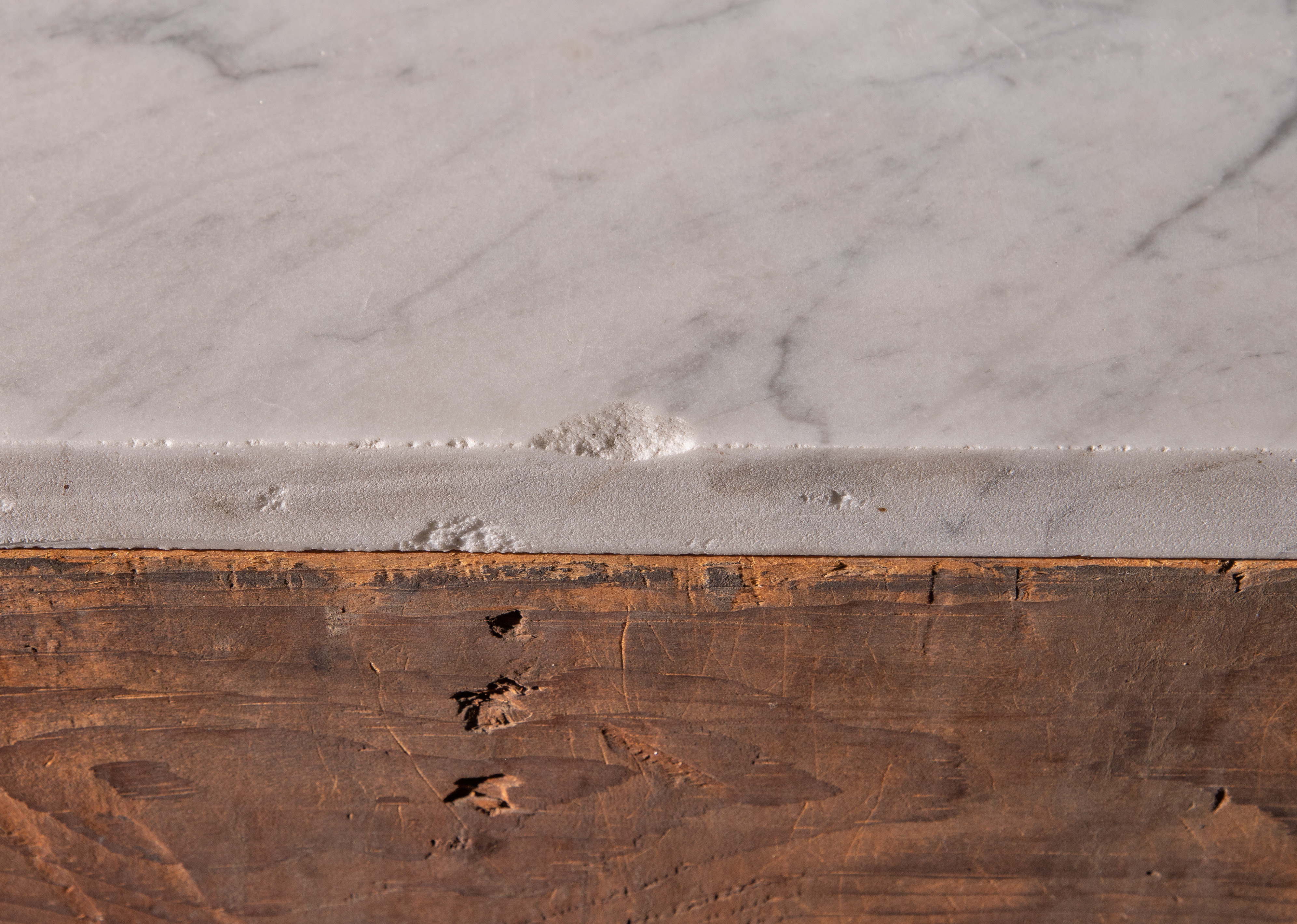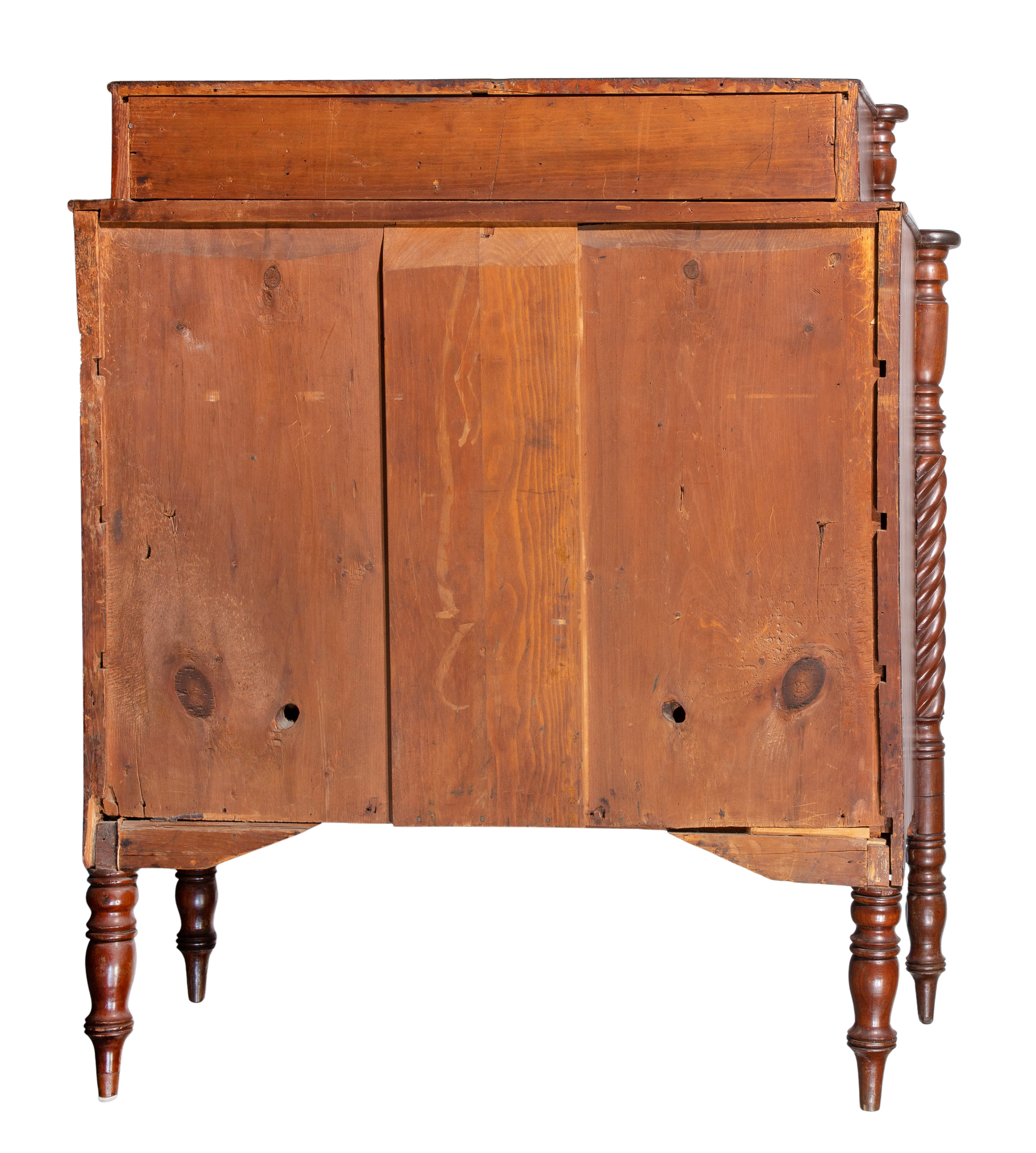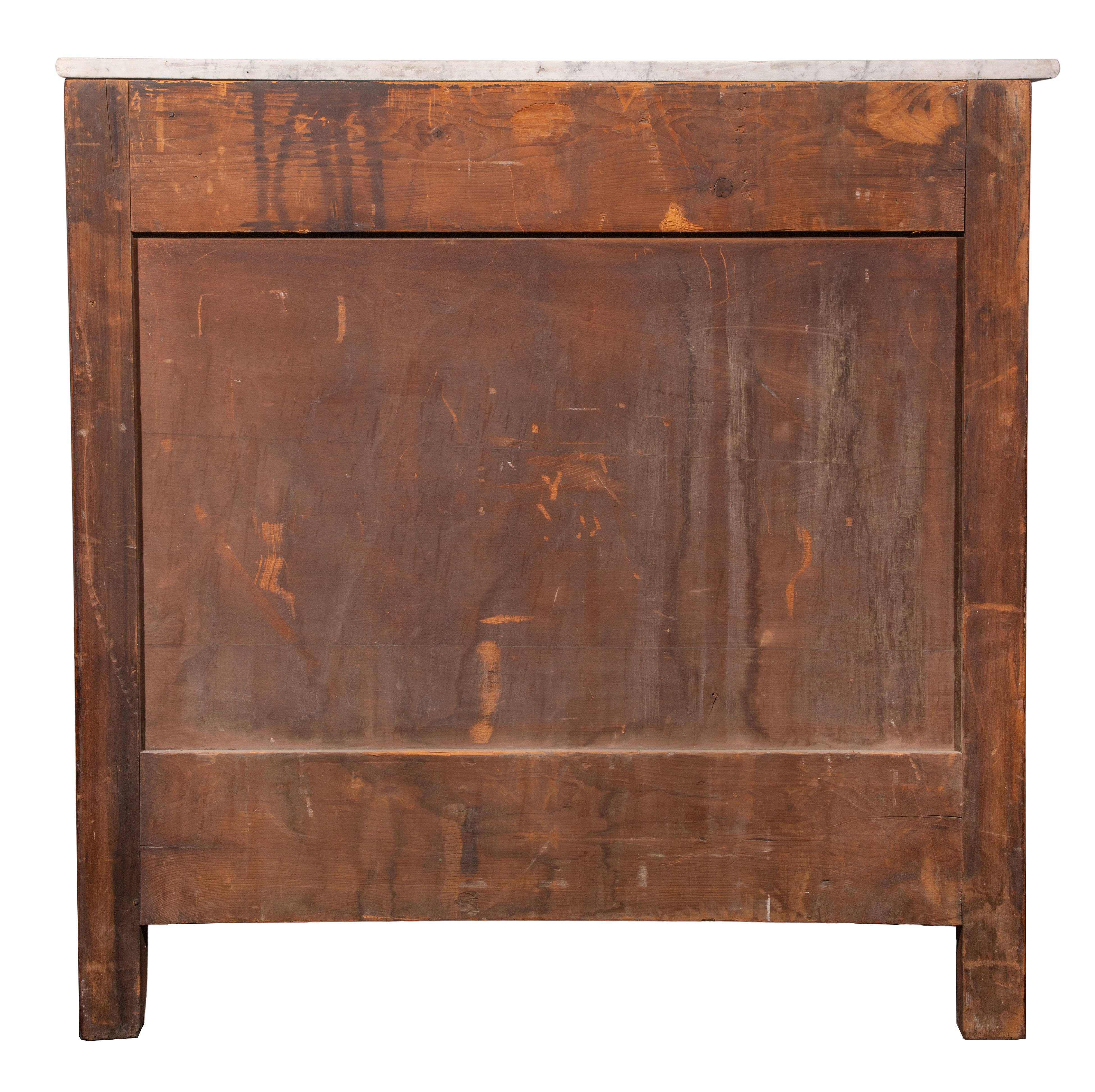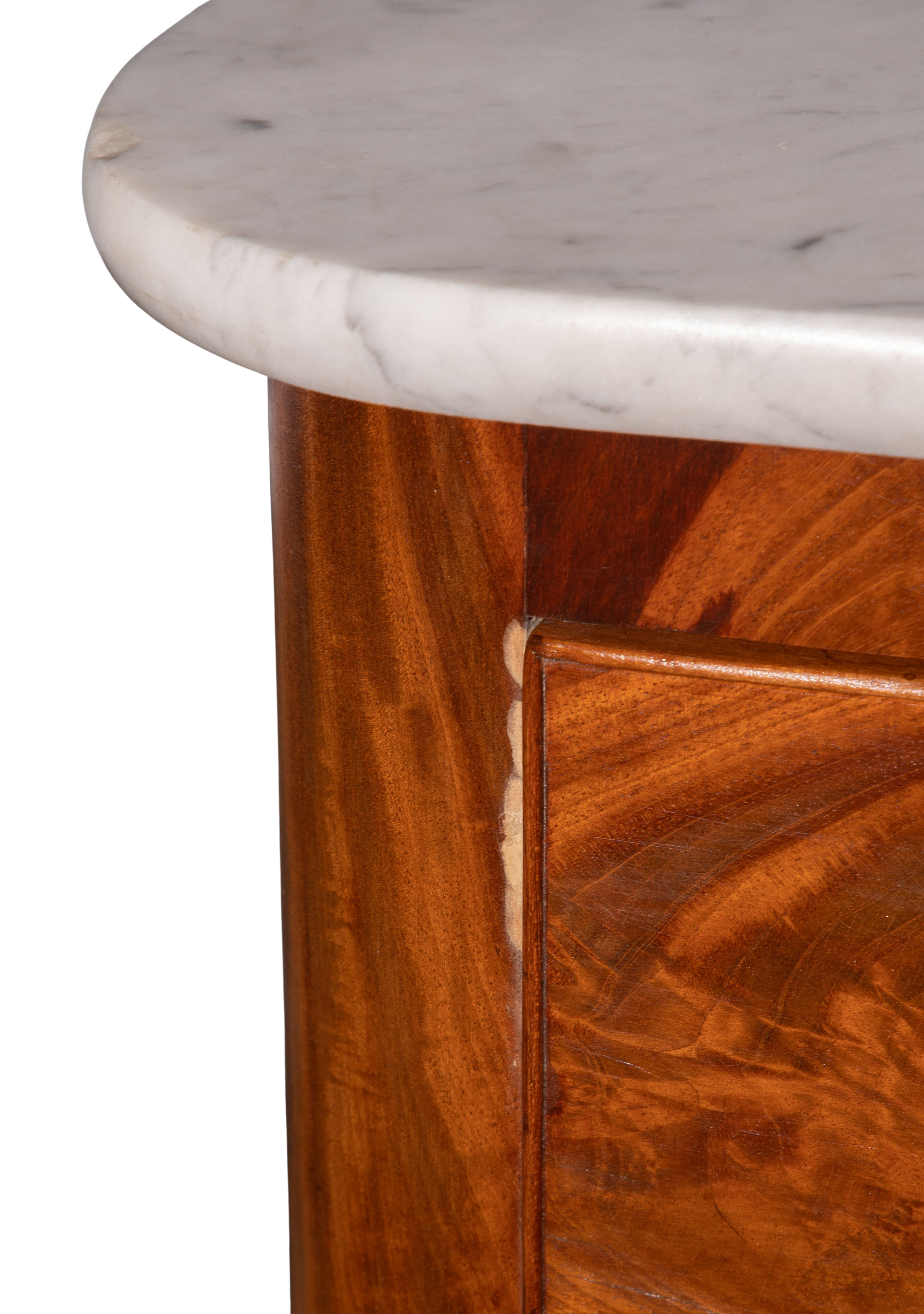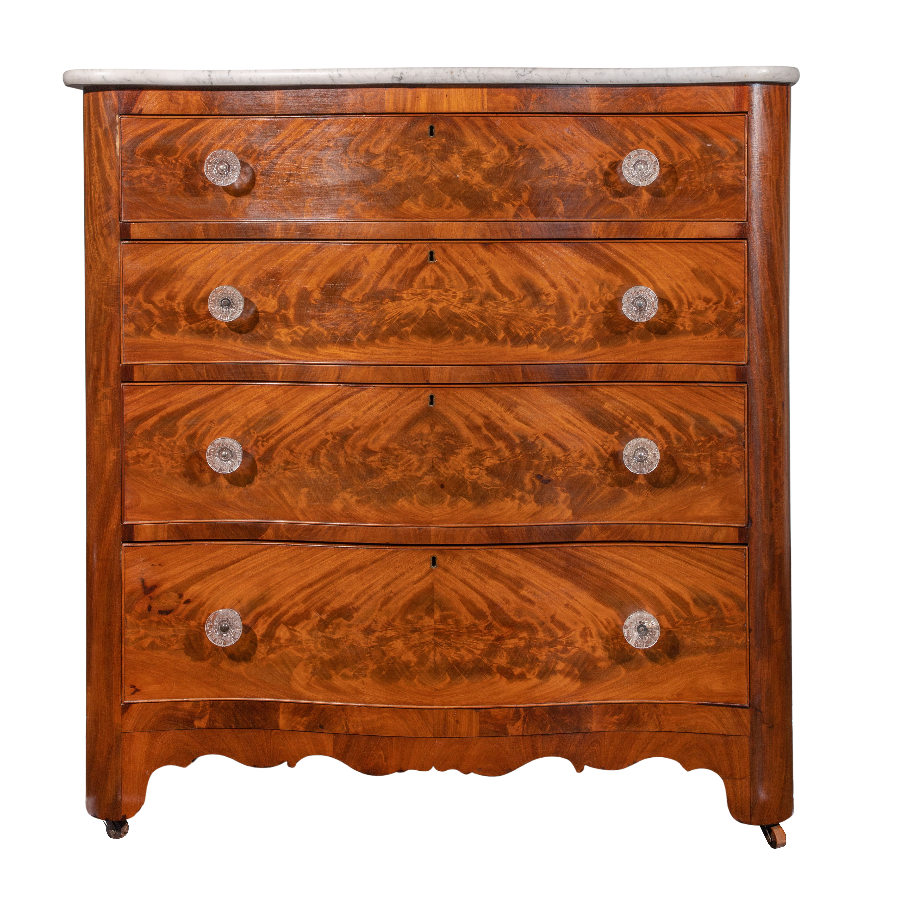Condition: overall light to moderate wear consistent with normal use, bow front having a loose leg, cracks, scratches, nicks, chips, veneer cracking and missing, serpentine having nicks, cracks to finish, refinished, chips to marble top, marble top having evidence of a top piece missing, knobs not original to piece