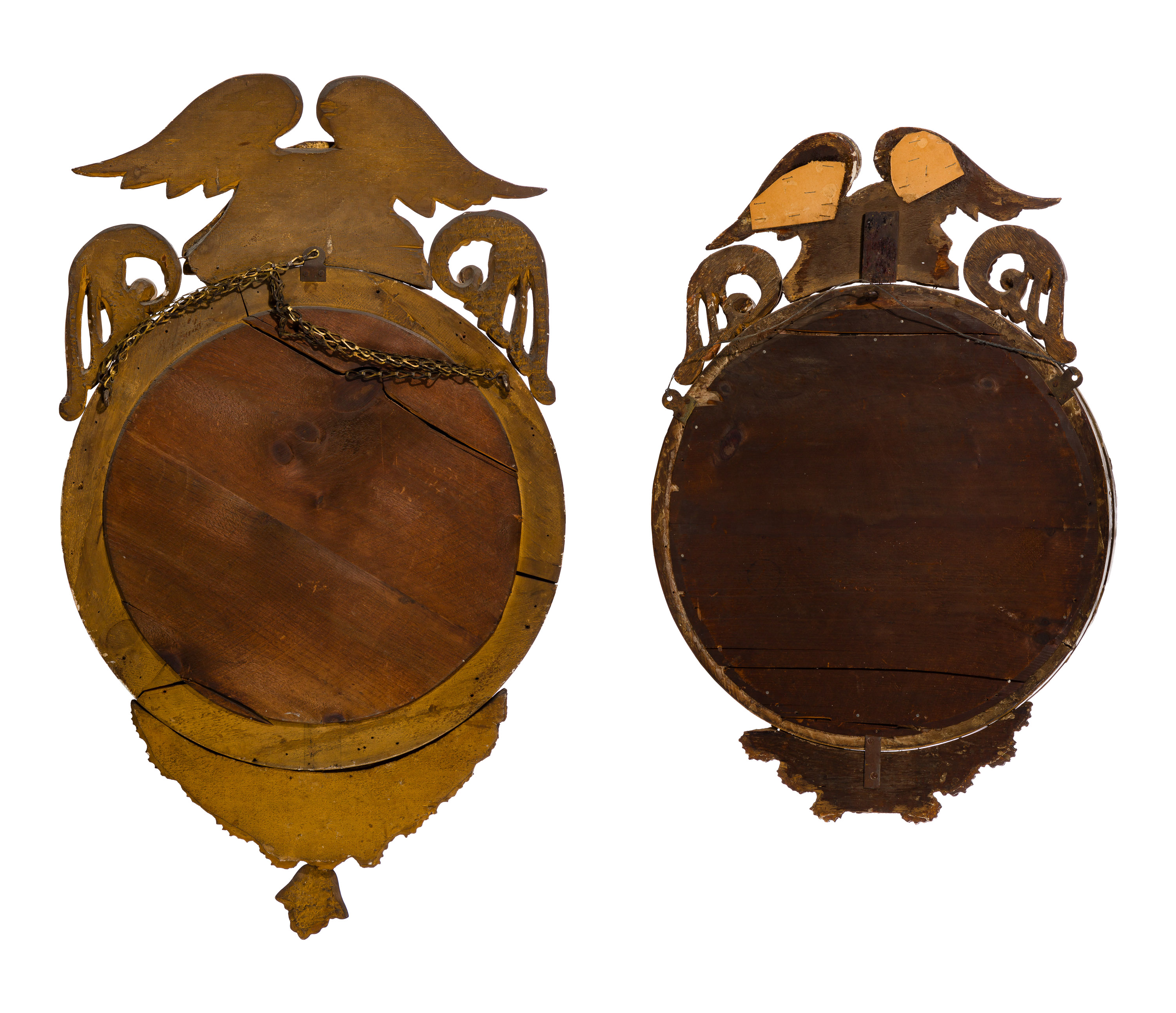 (2) similar items, both having hand carved gilt wood eagles perched on rocks, circular frames with spheres, center having a bulls eye convex mirror, larger having a sphere on a chain in eagles mouth