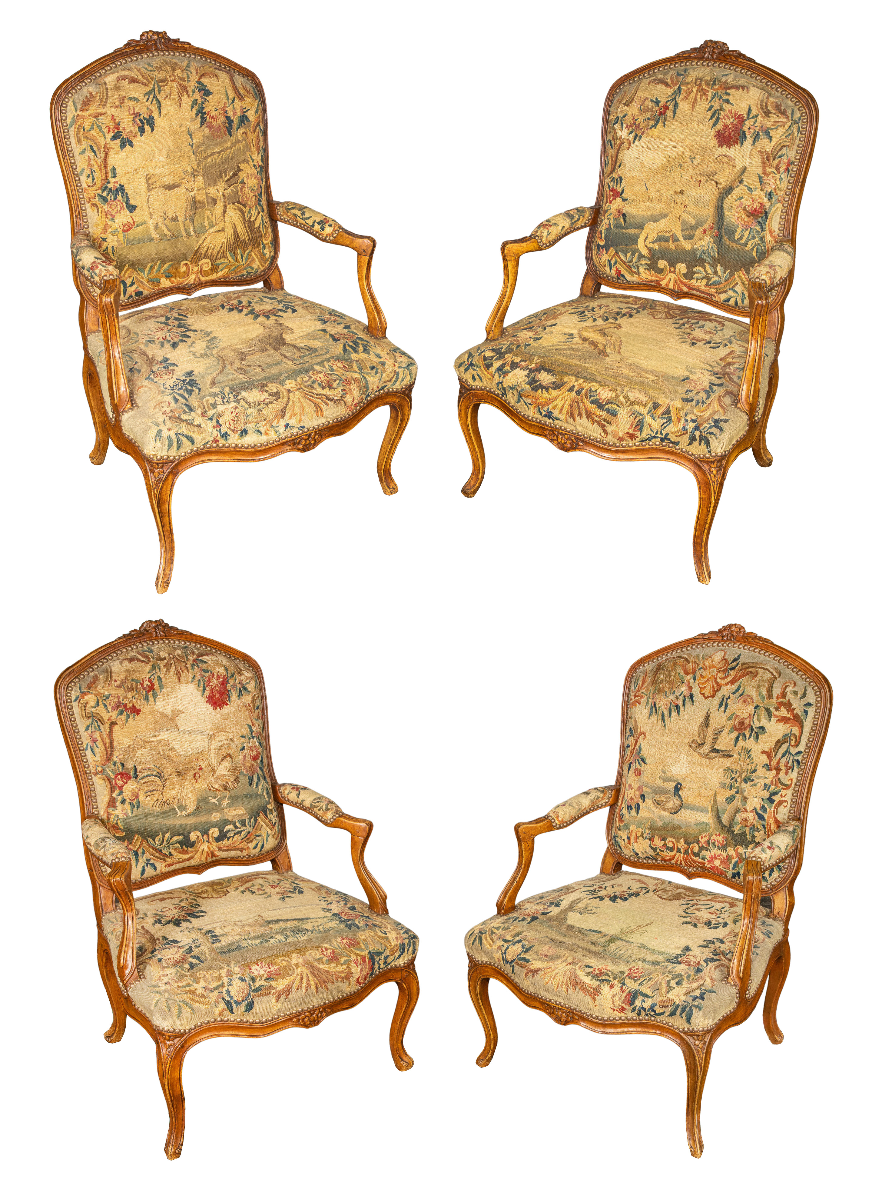 A set of four, having varying animal motif tapestry upholstery and carved wood frames