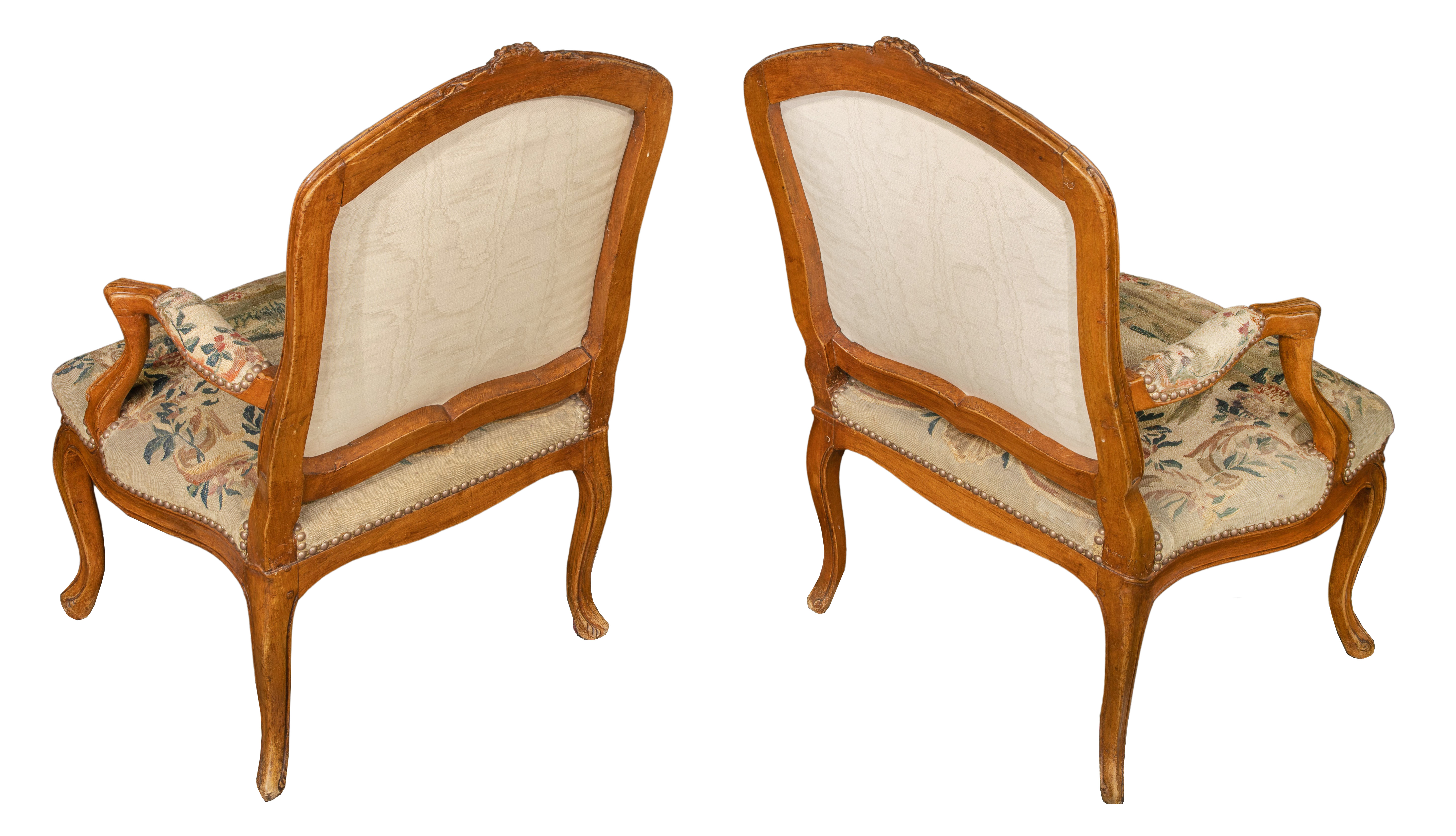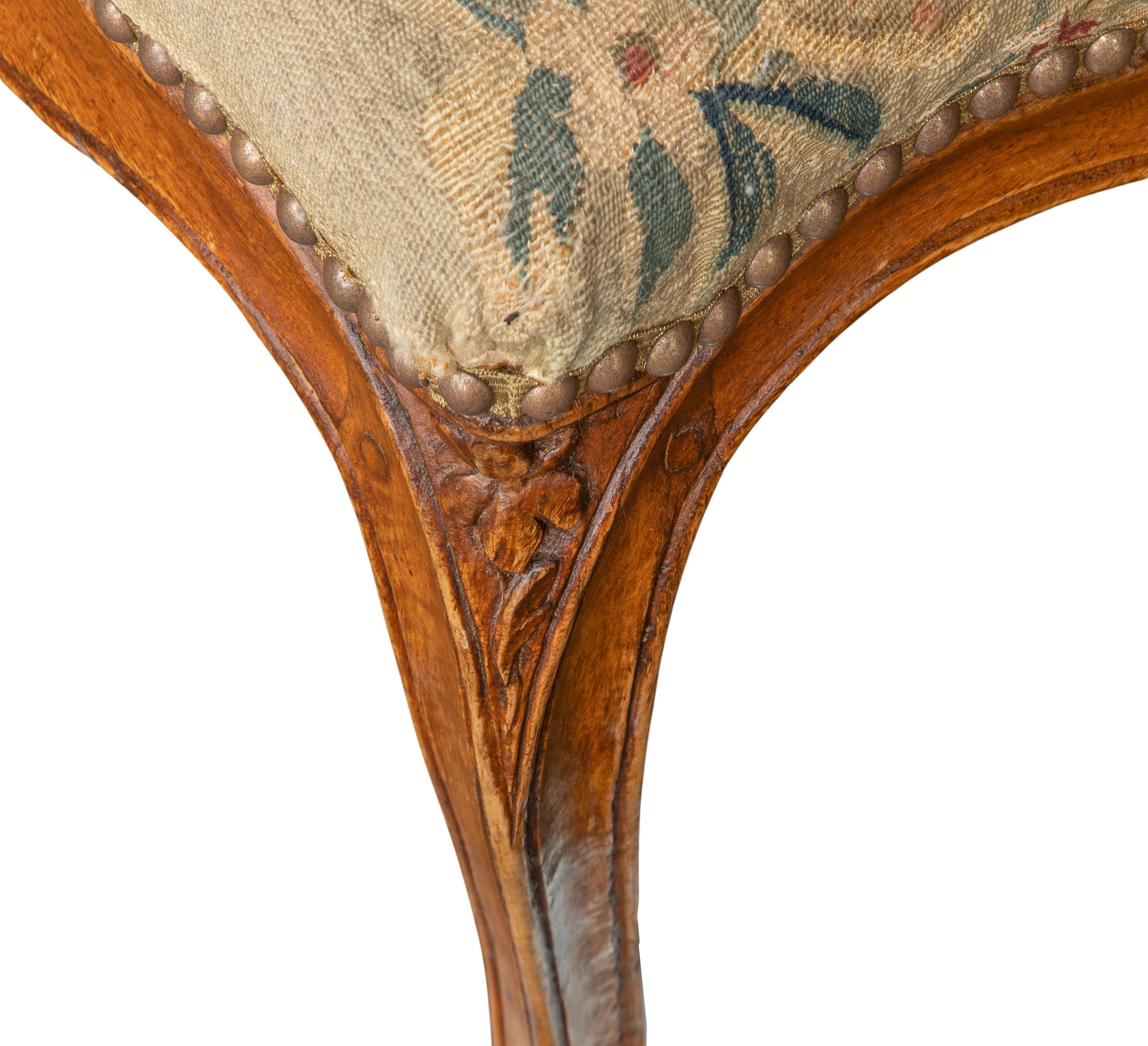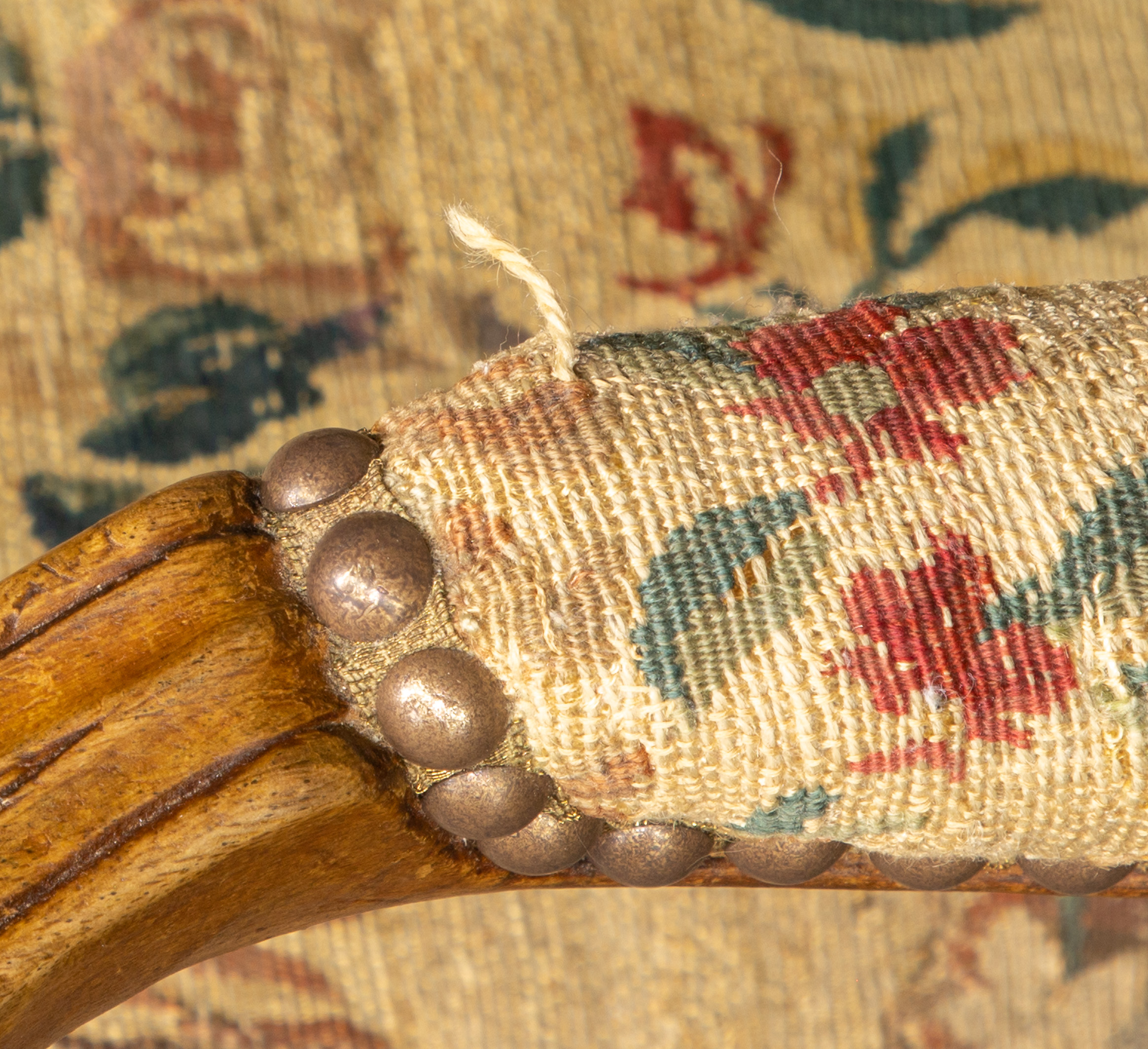 Condition: upholstery has minor soiling, some pulled strings, chair arms loose, one wood frame having old repairs on arch, chips, finish loss
