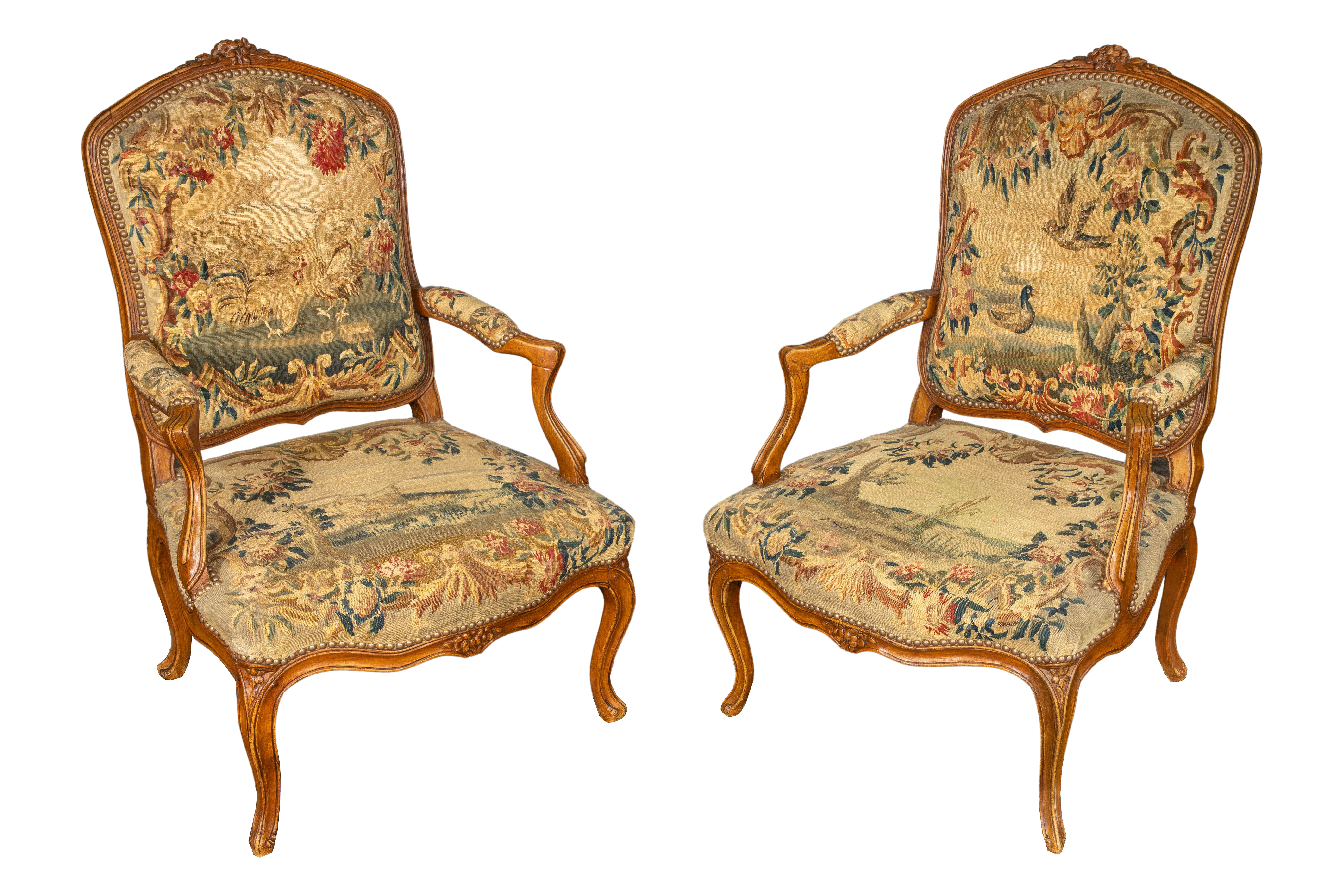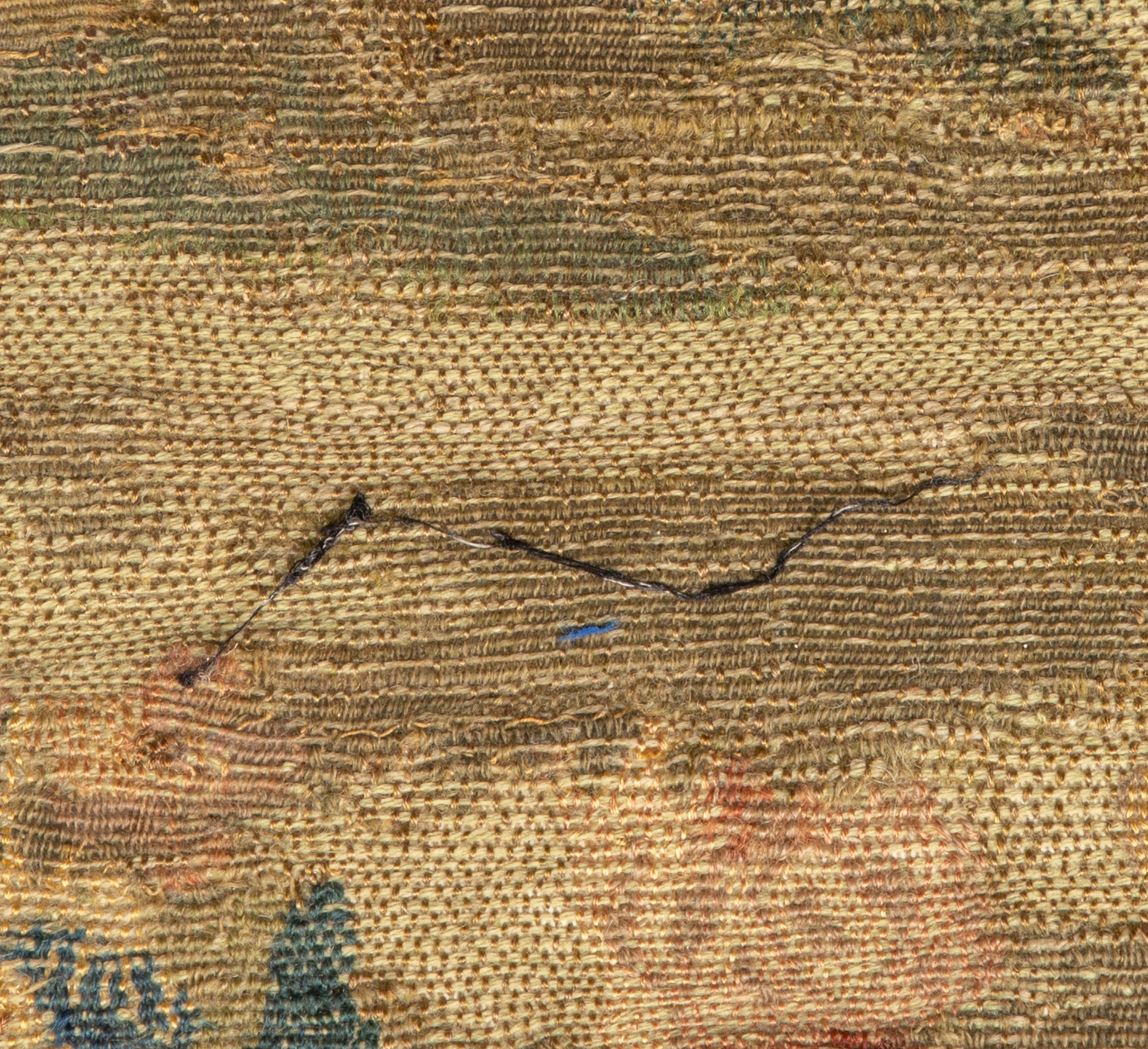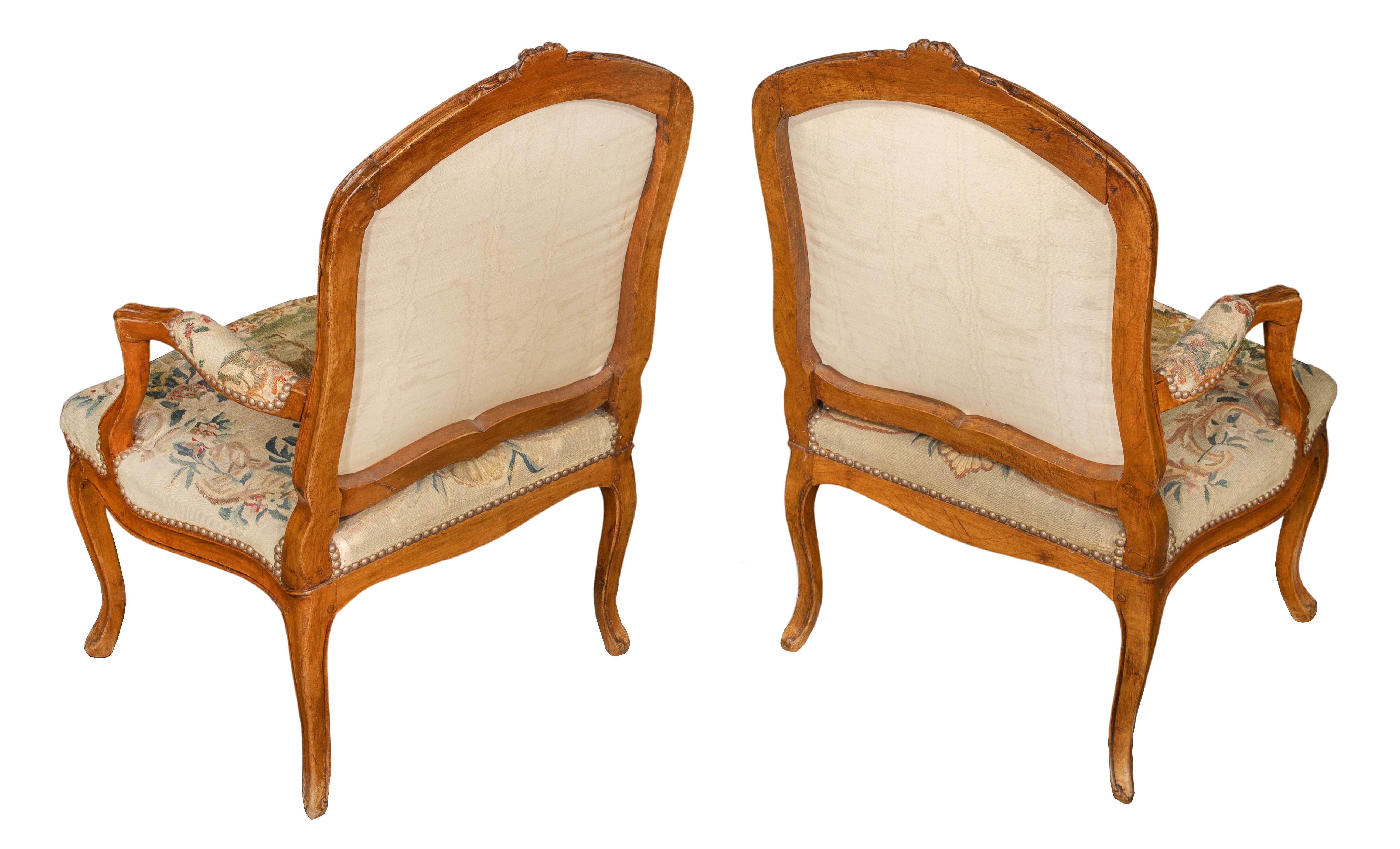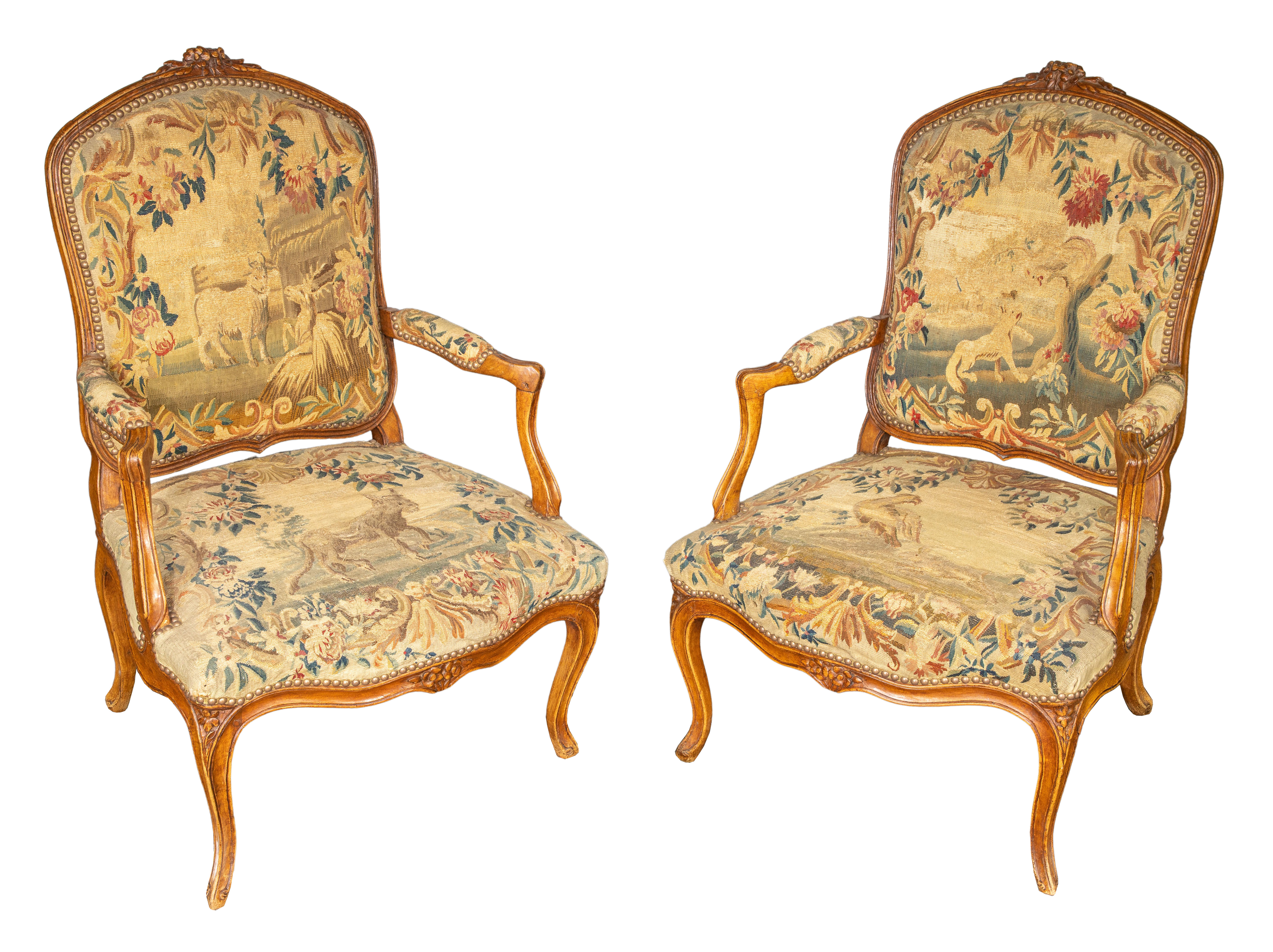 Condition: upholstery has minor soiling, some pulled strings, chair arms loose, one wood frame having old repairs on arch, chips, finish loss