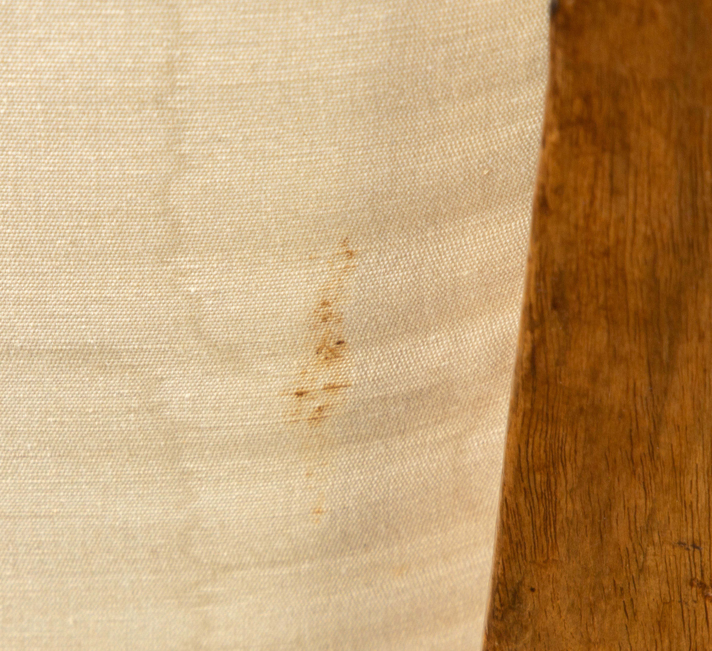 upholstery has minor soiling, some pulled strings, chair arms loose, one wood frame having old repairs on arch, chips, finish loss