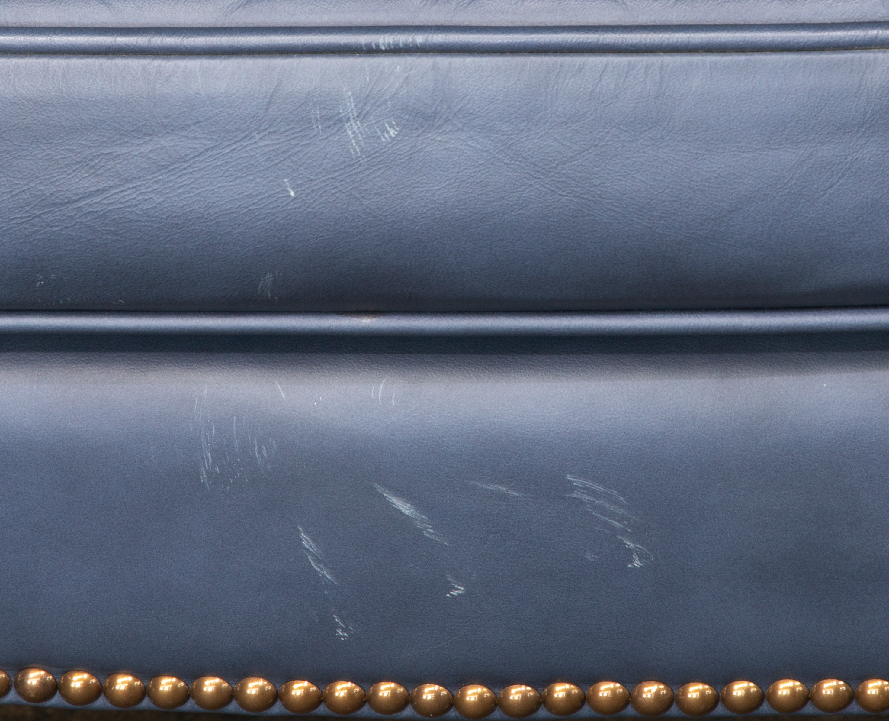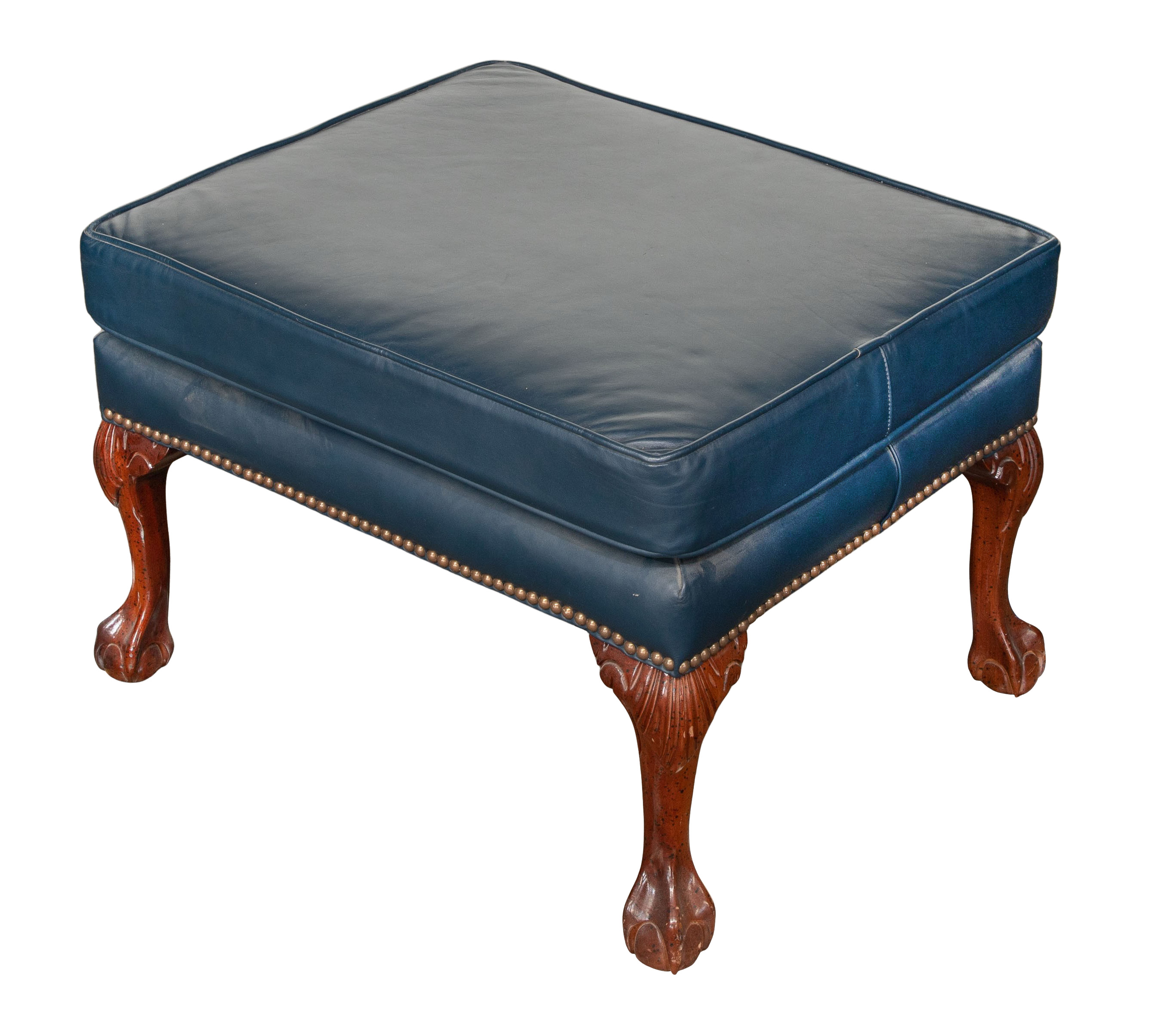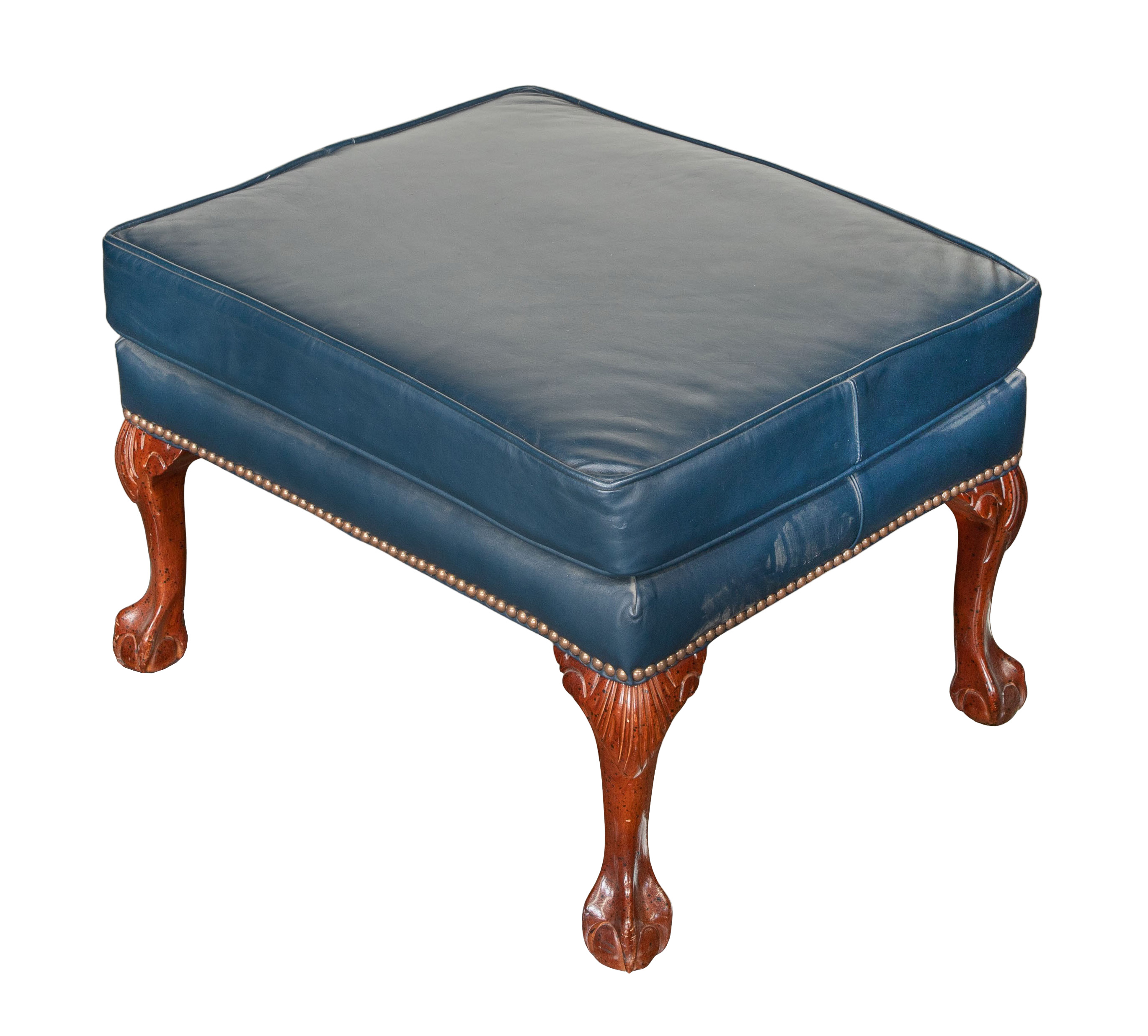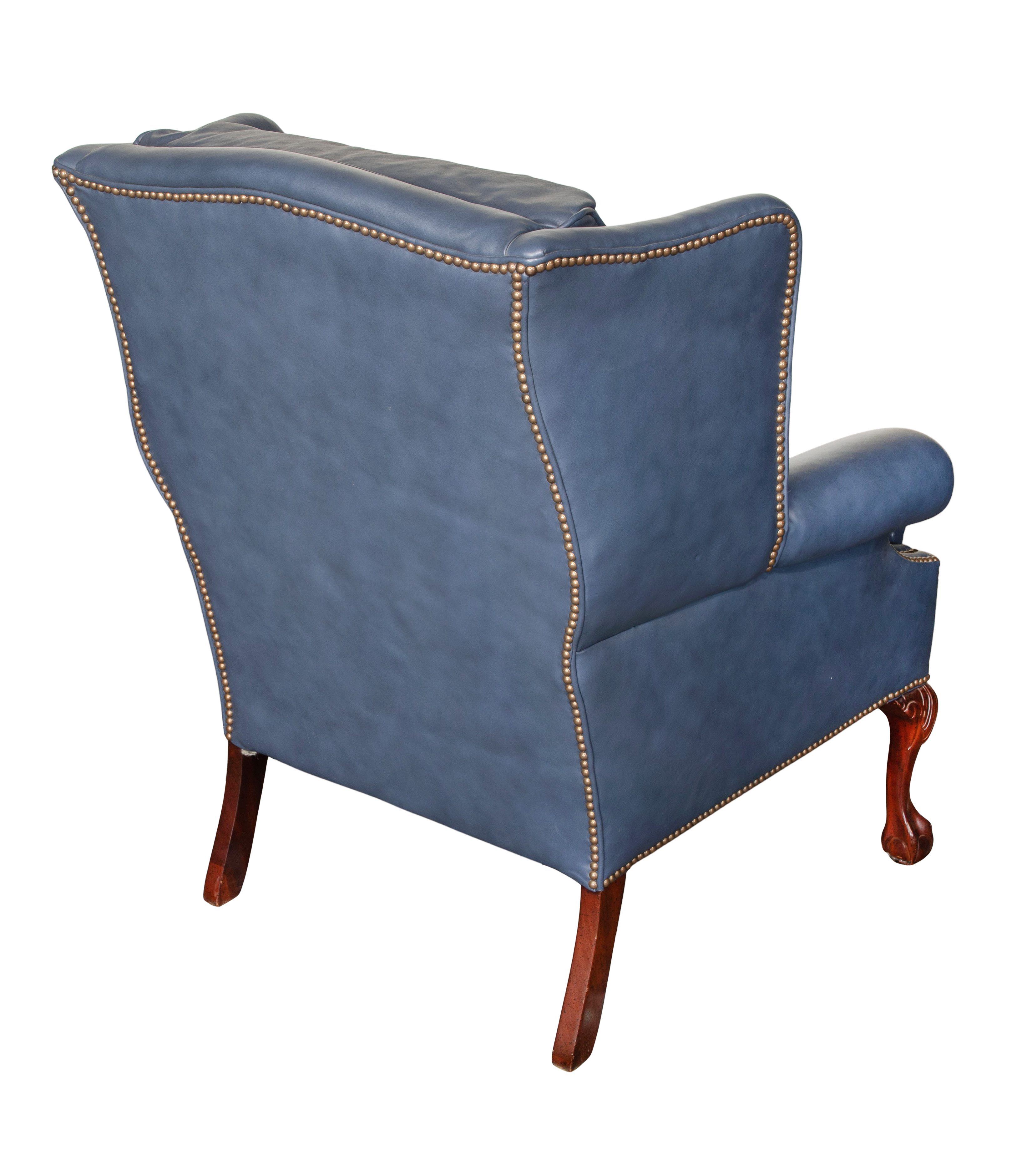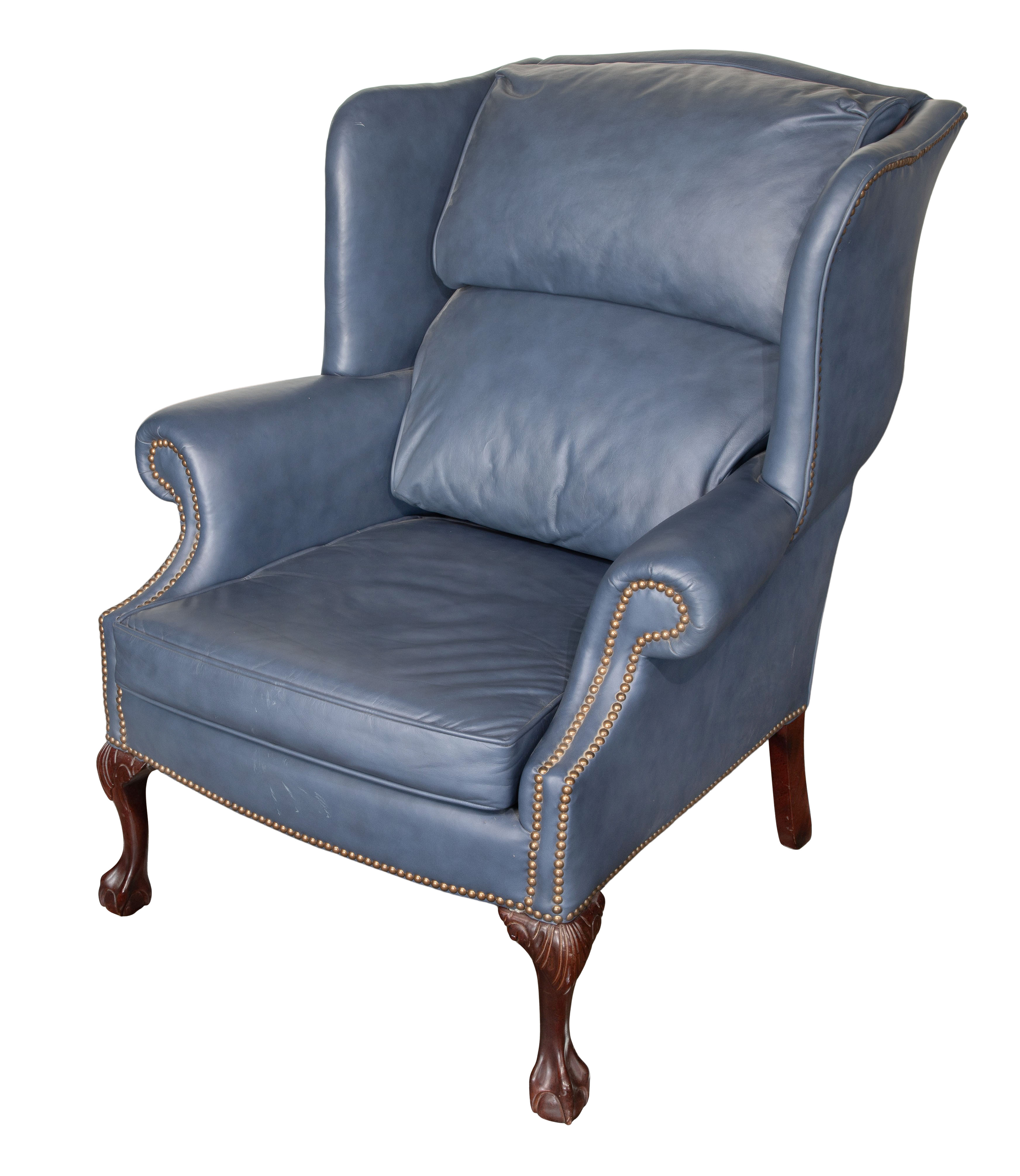 Having blue leather with brass nailhead trim and ball and claw feet, attached label under chair cushion