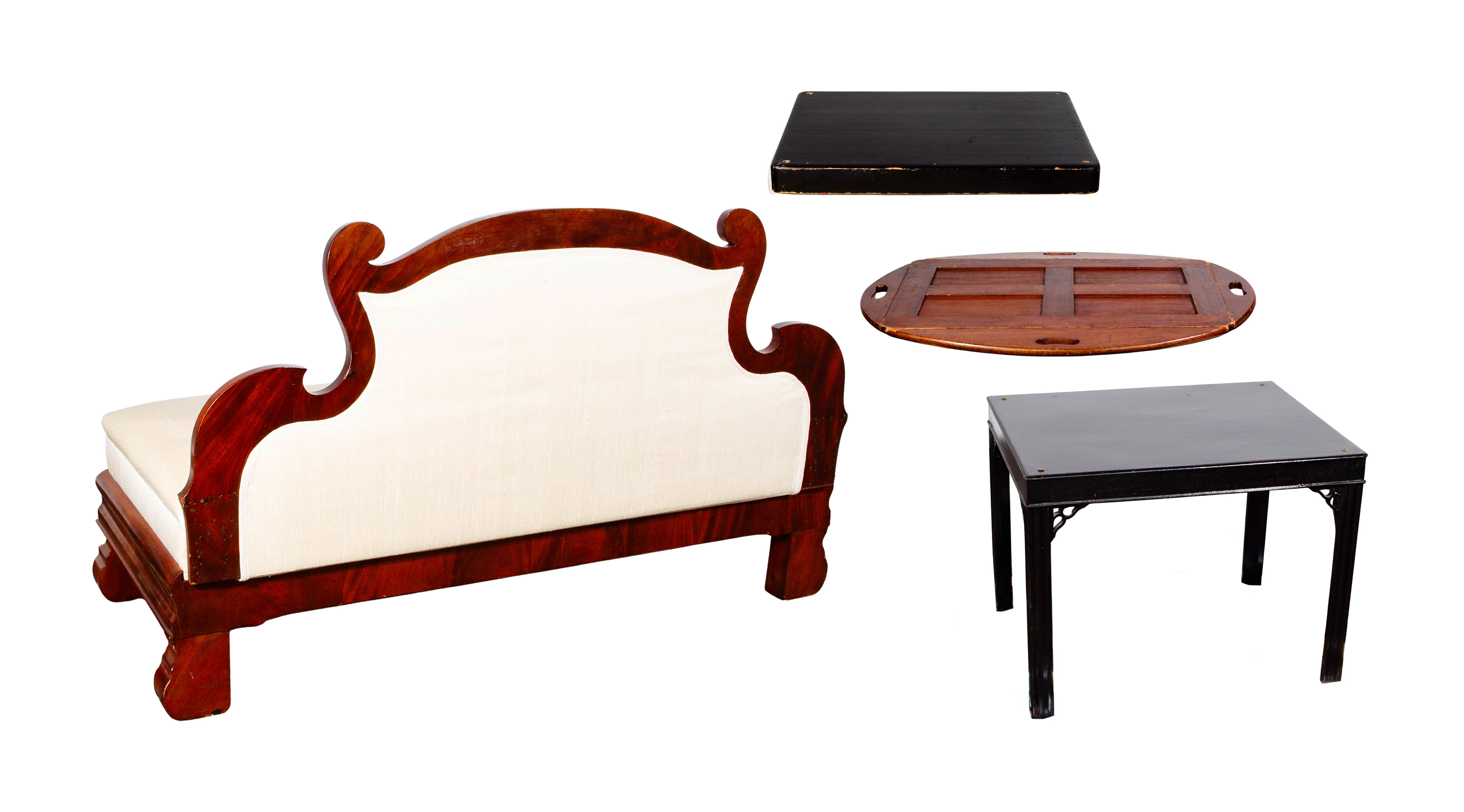 Condition: overall light to moderate wear consistent with normal use, settee having minor wear to wood finish, table having nicks, chips, scuffs, scratches and minor finish wear, tray having separating joints, nicks, cracks, finish wear, lacquer table having scratches, nicks and chips to lacquer and tray, tray top having fading and gilt wear