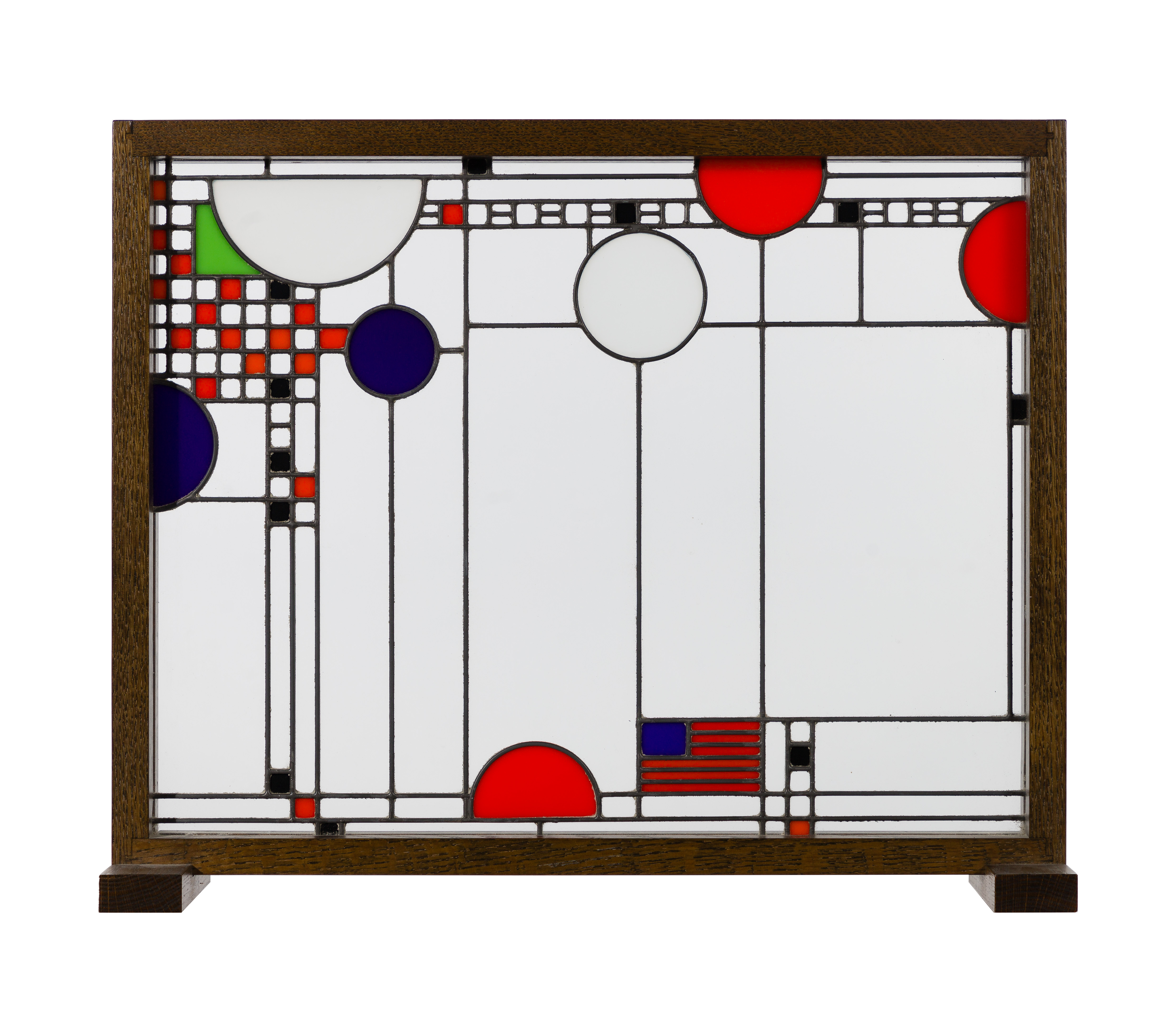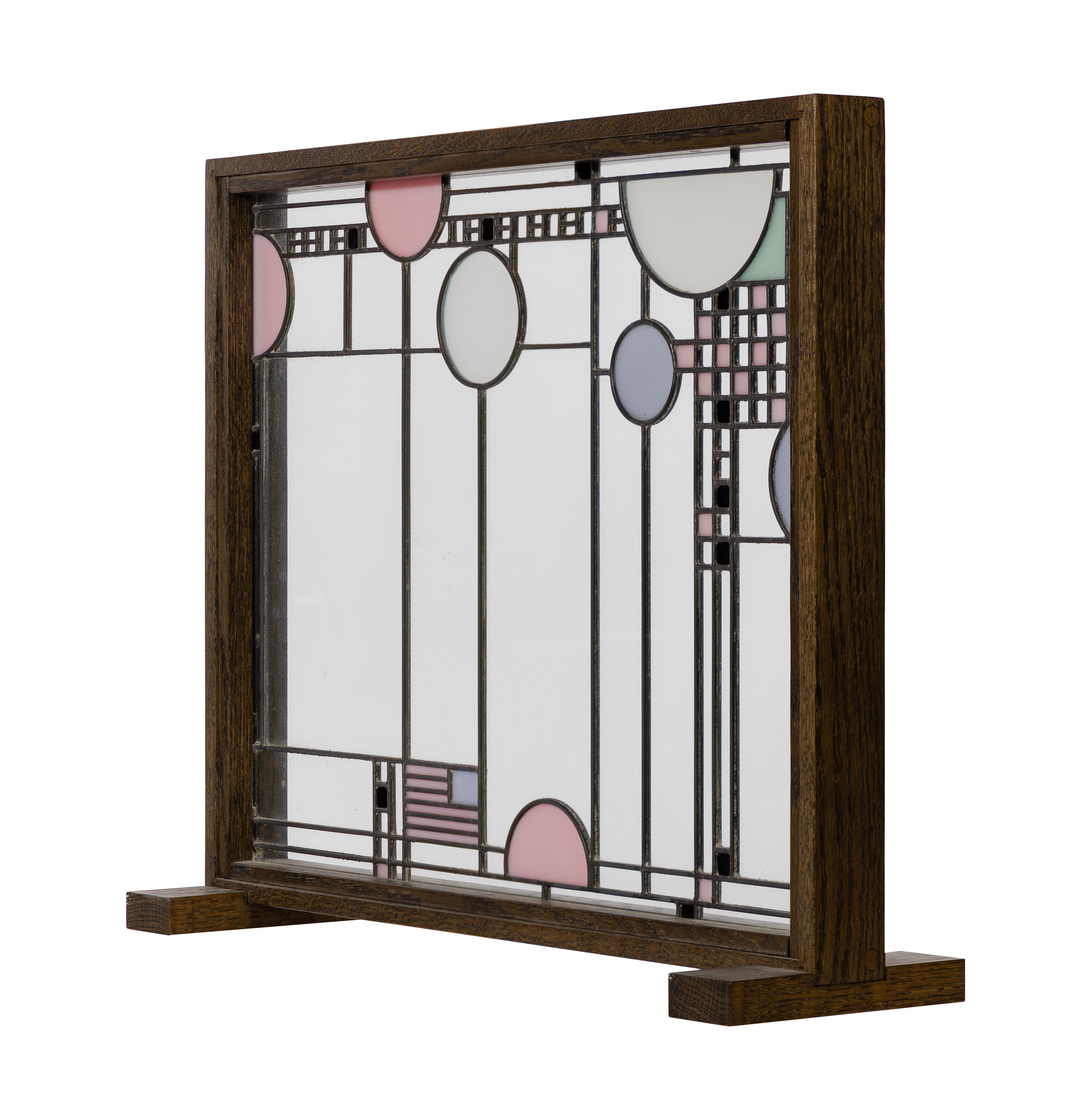 c.1960 reproduction of the stained glass windows from Frank Lloyd Wright’s Coonley Playhouse, having the American flag, geometric and circular patterns, in a wood stand having feet