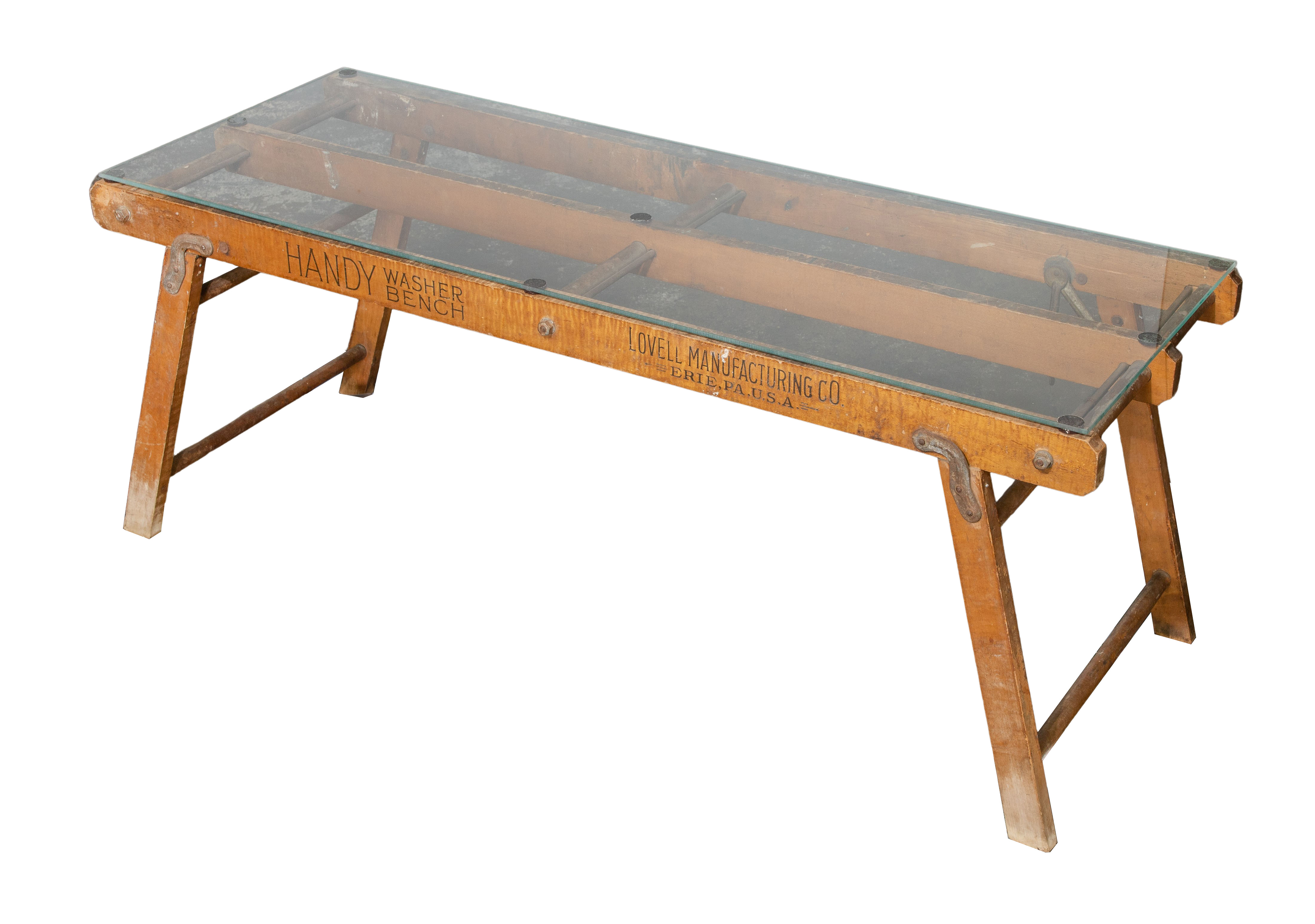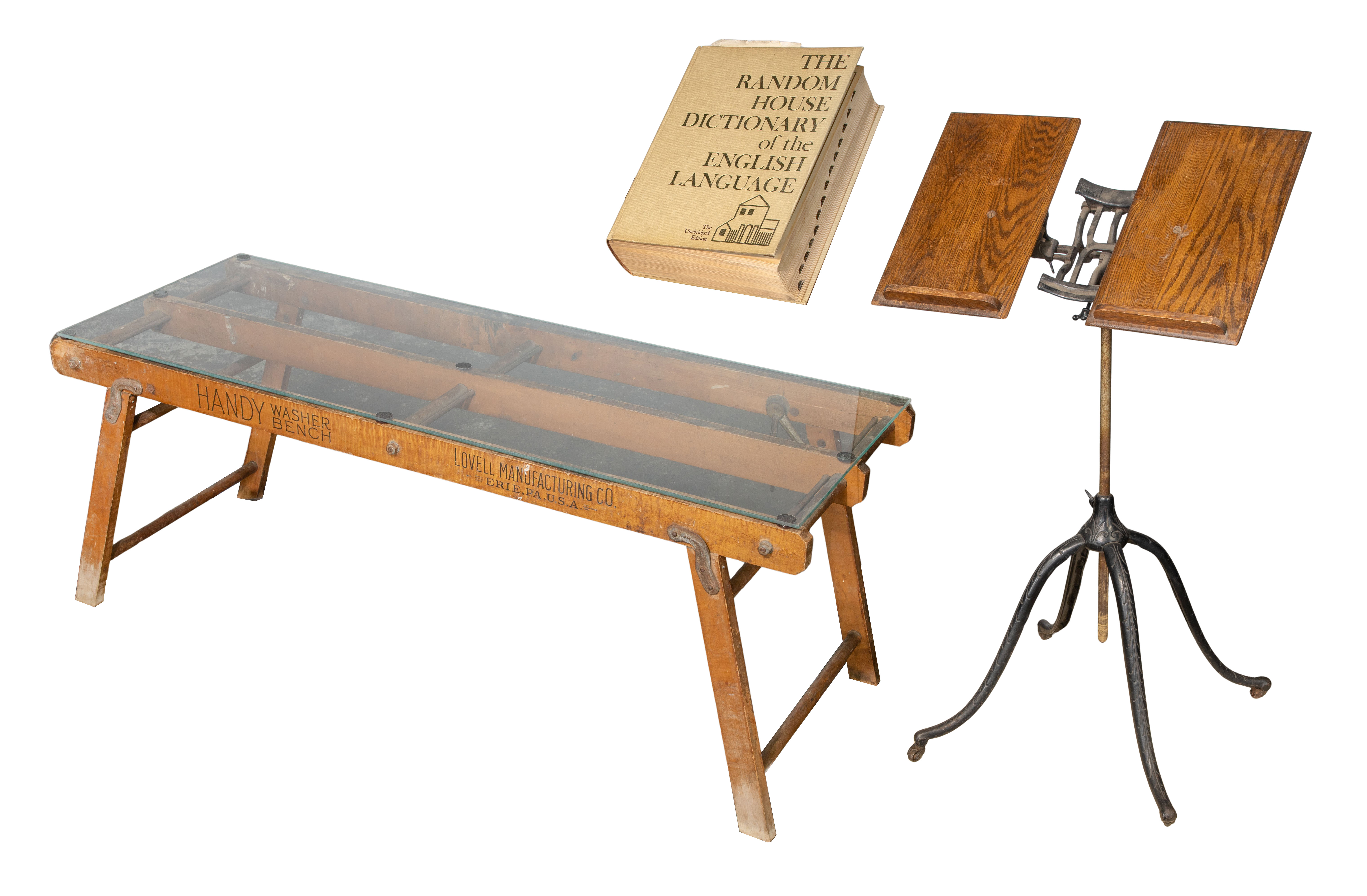 (3) total items including a Victorian music stand on casters; together with a Lovell Handy Washer Bench with glass top fashioned as a coffee table and an English language dictionary