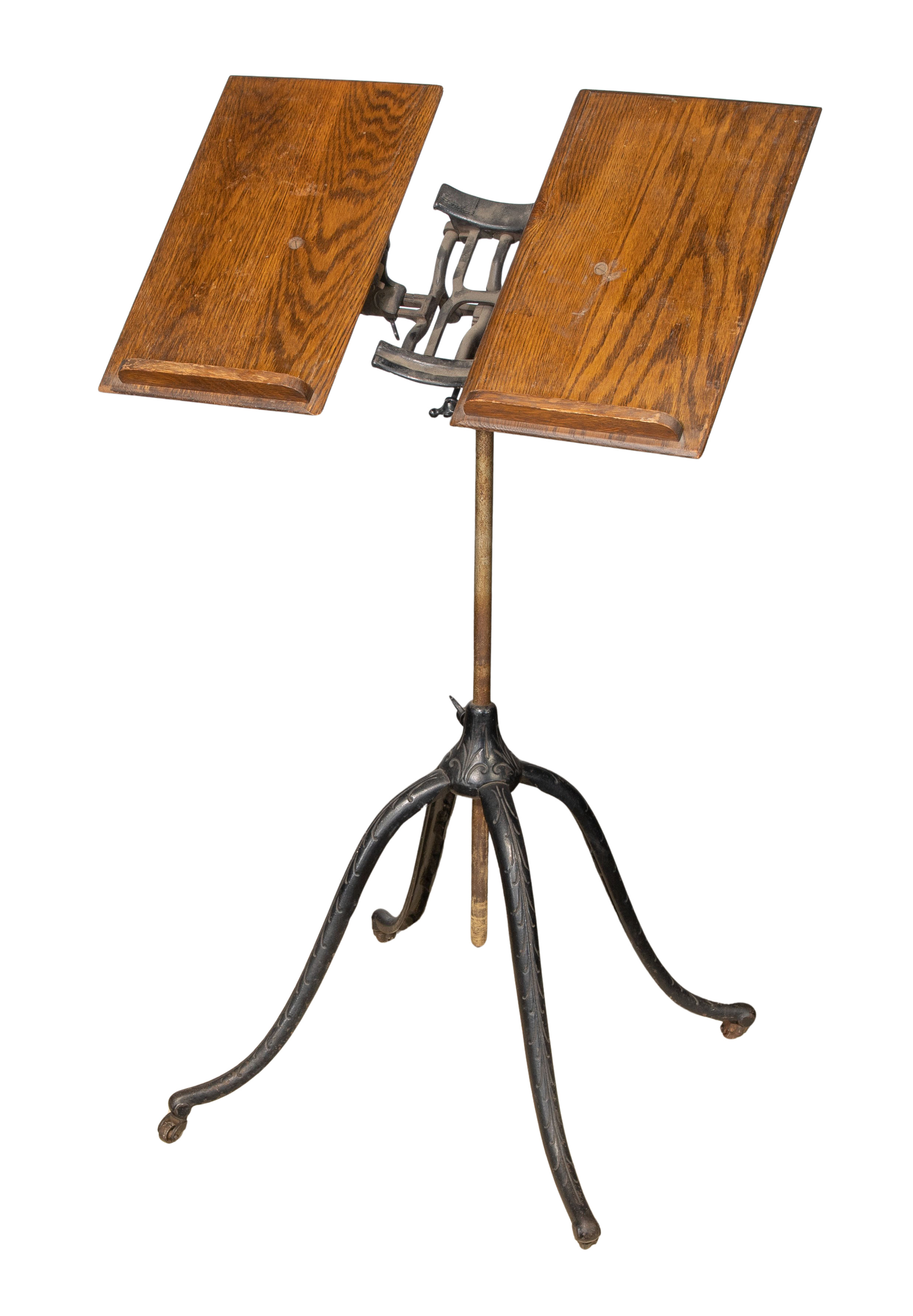 Condition: music stand showing wear to wood and metal, missing parts, casters not working properly, washer bench refurbished, dictionary having foxing