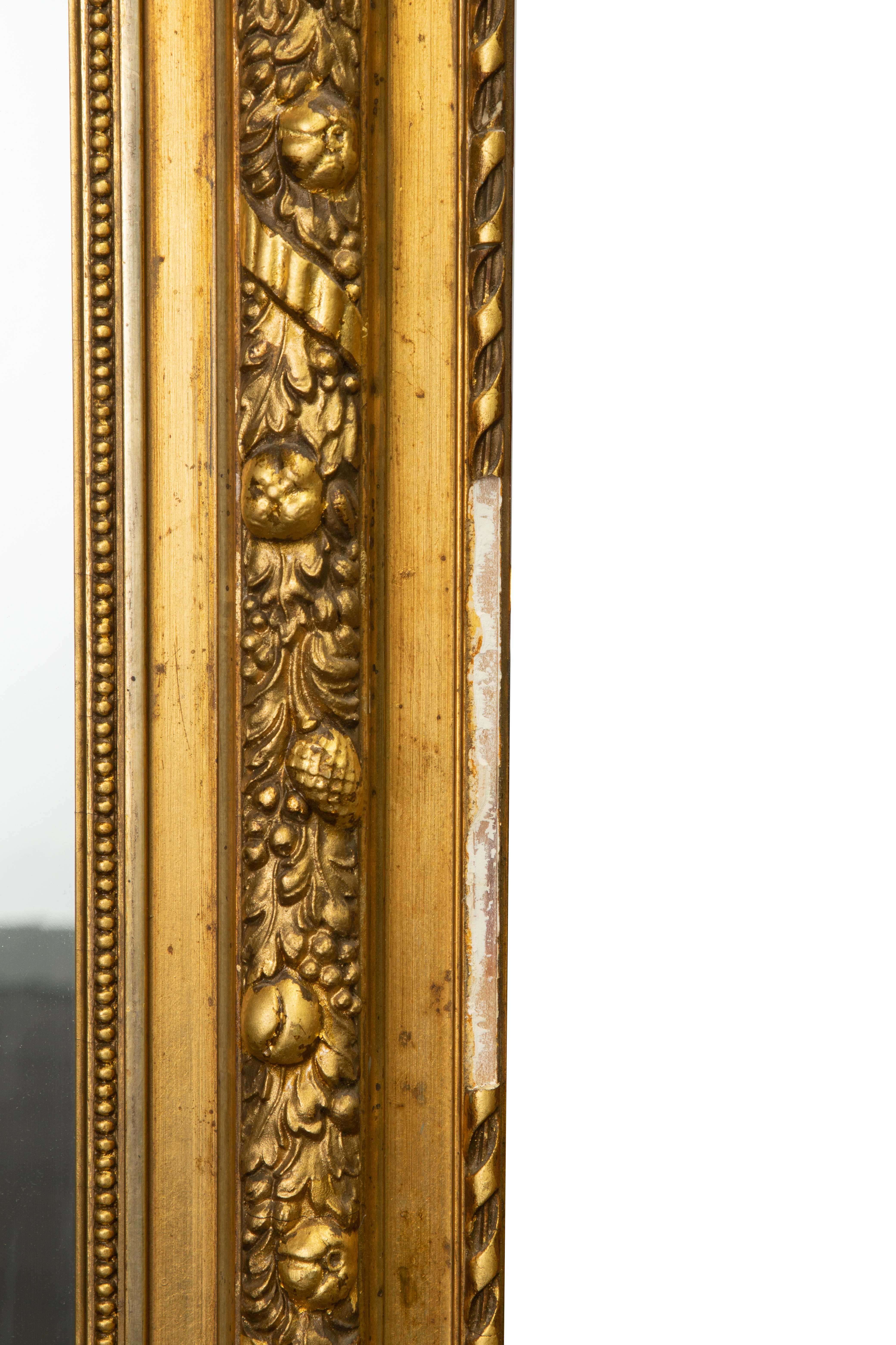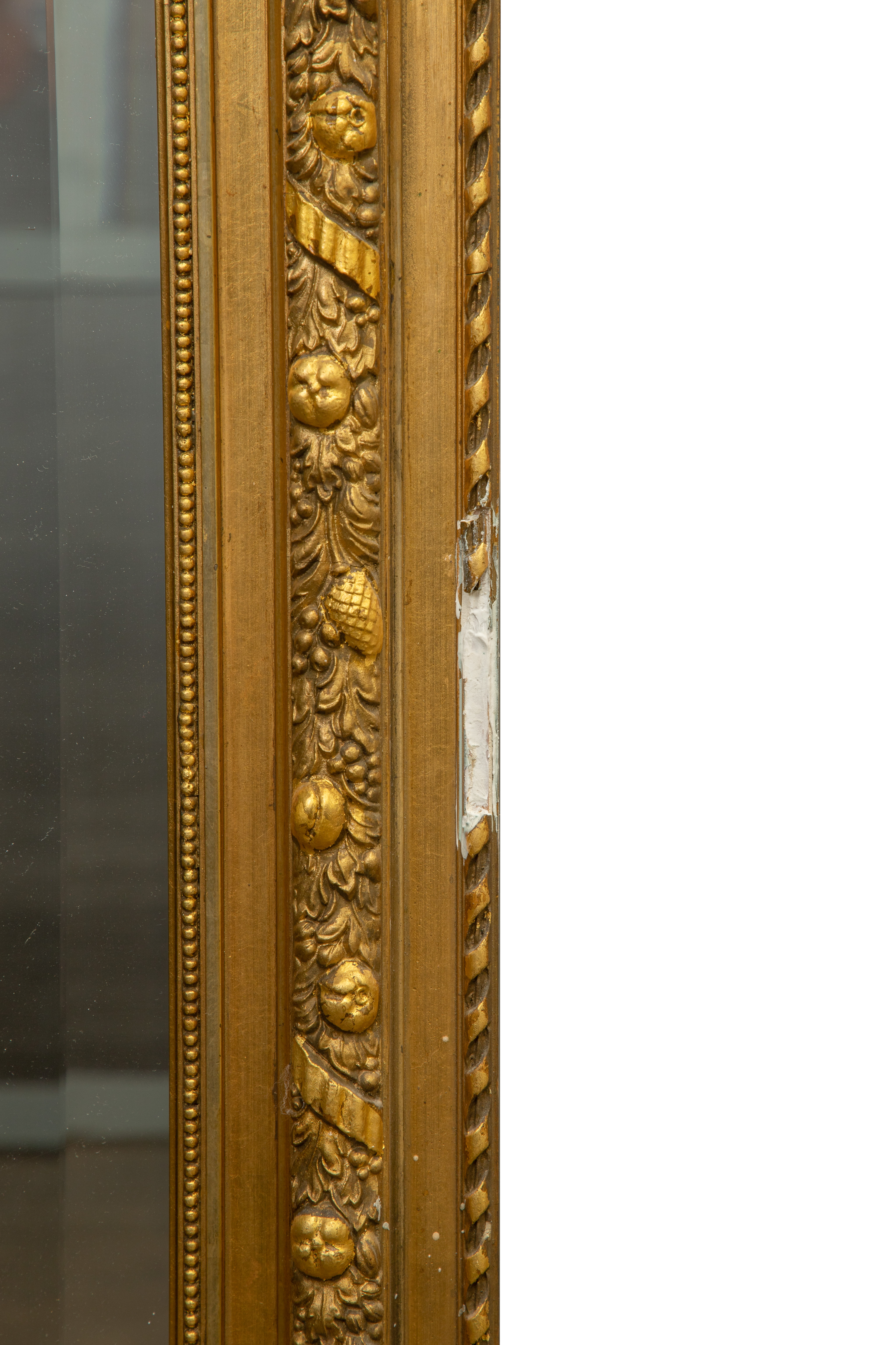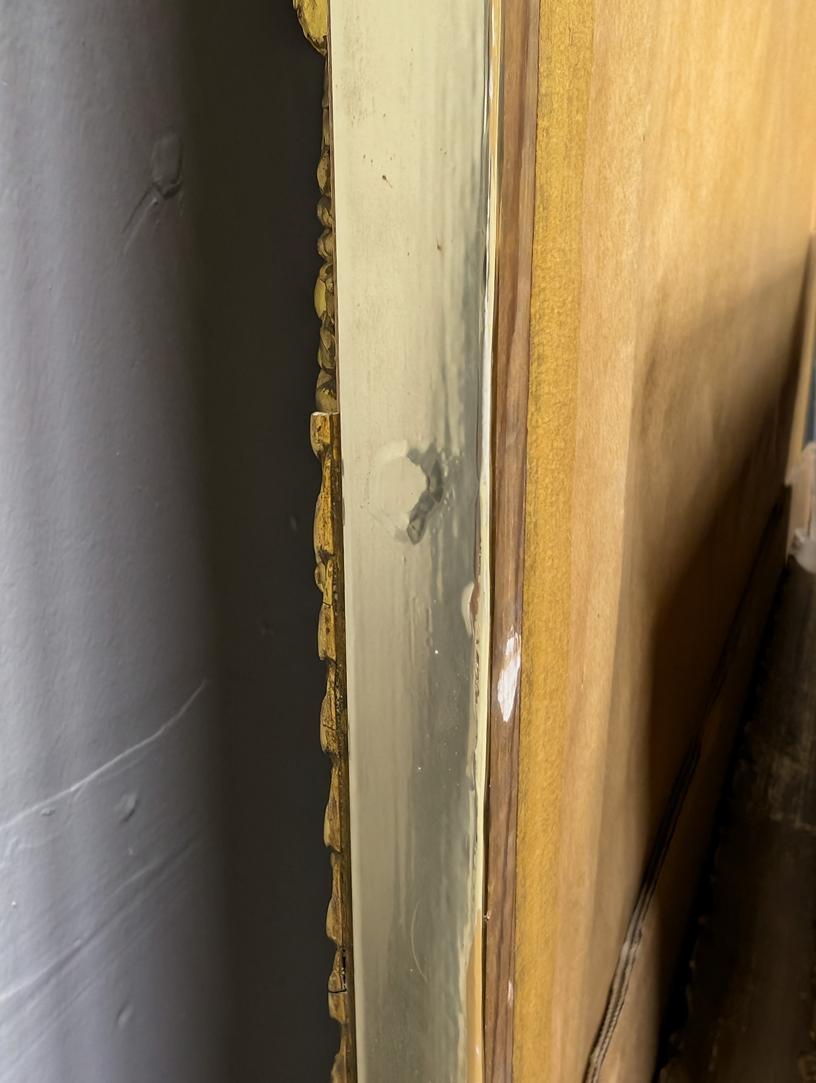 Having a carved gesso flower, leaf and scroll motif, beveled glass