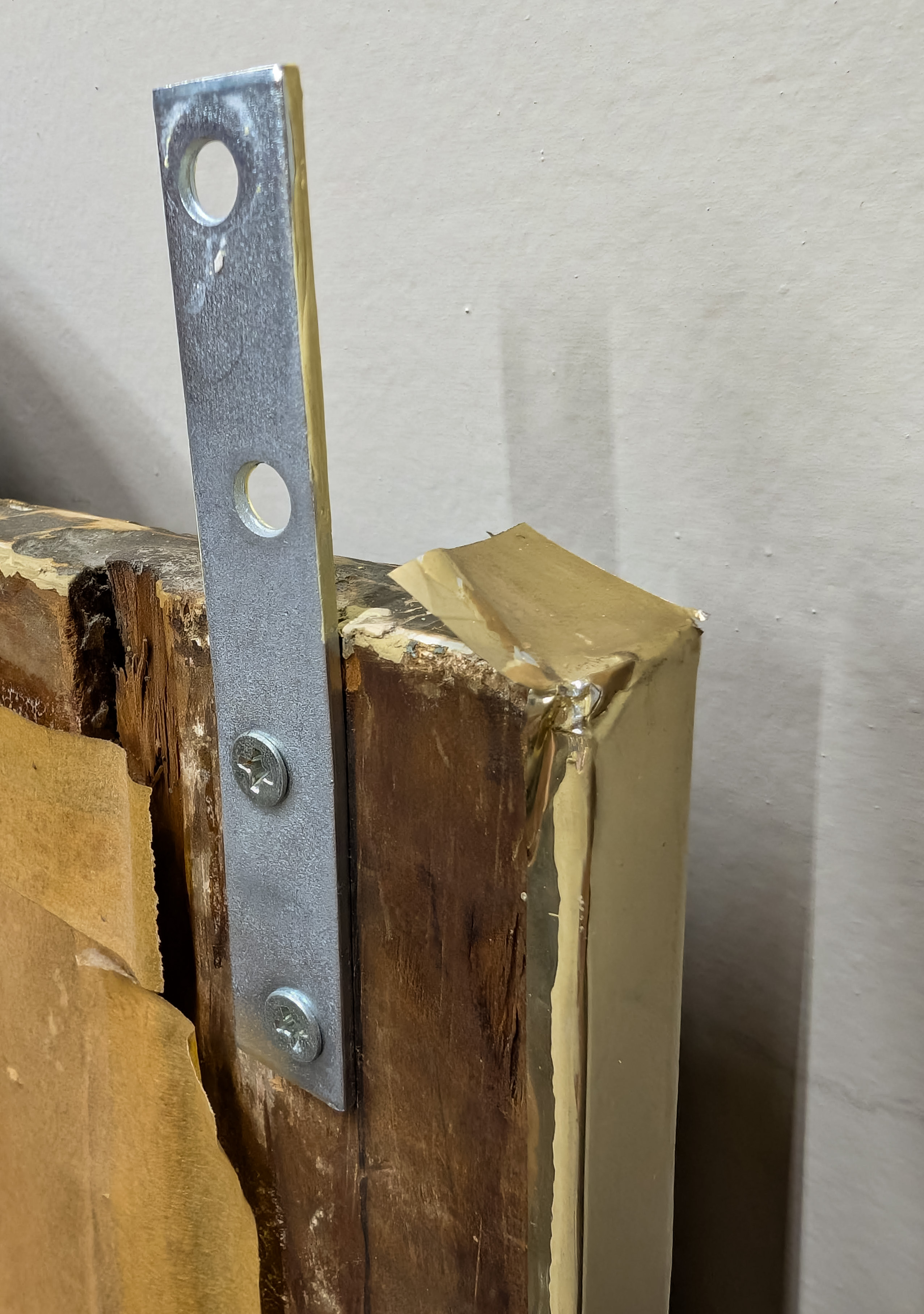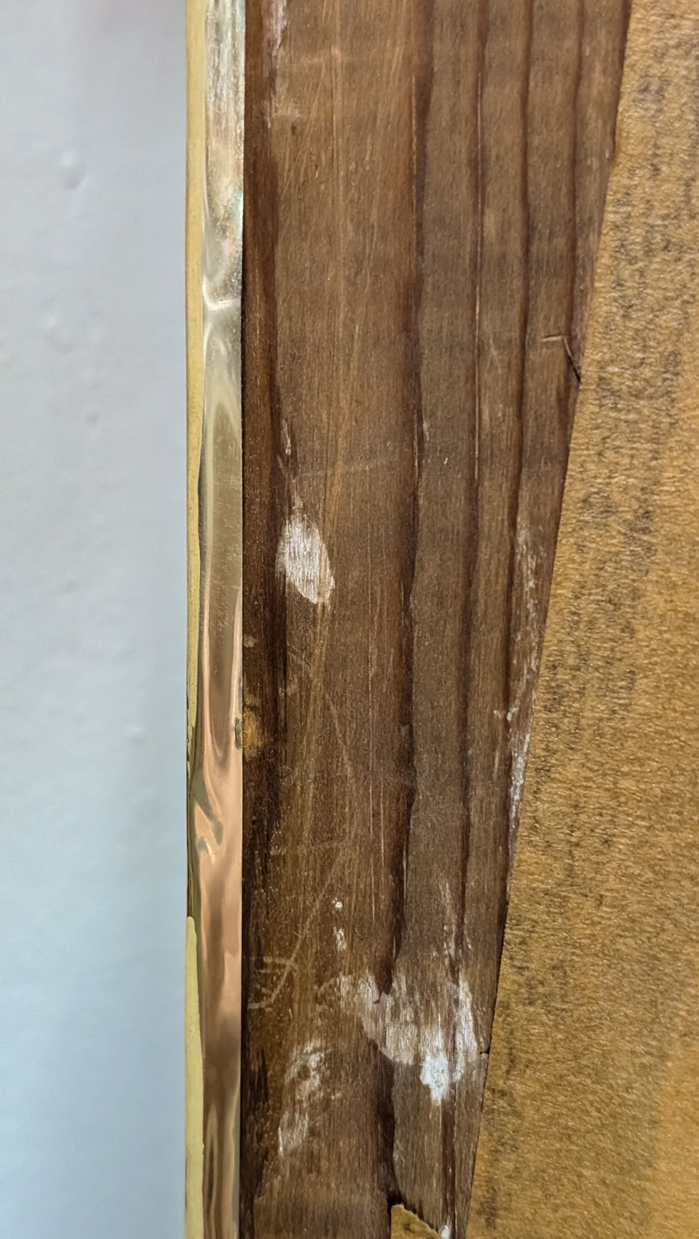 missing sections of gesso, small chips throughout, gold tape attached to edges