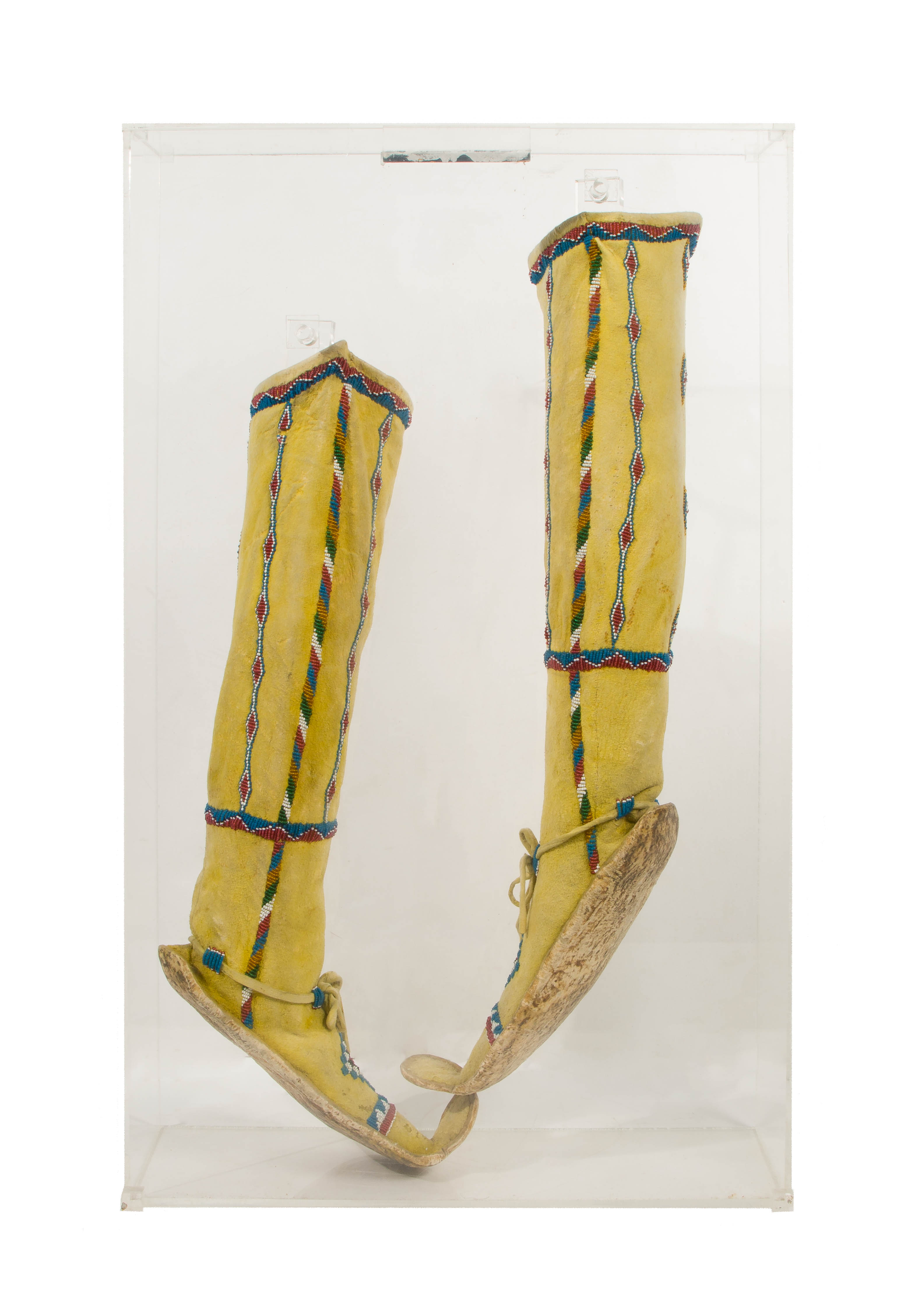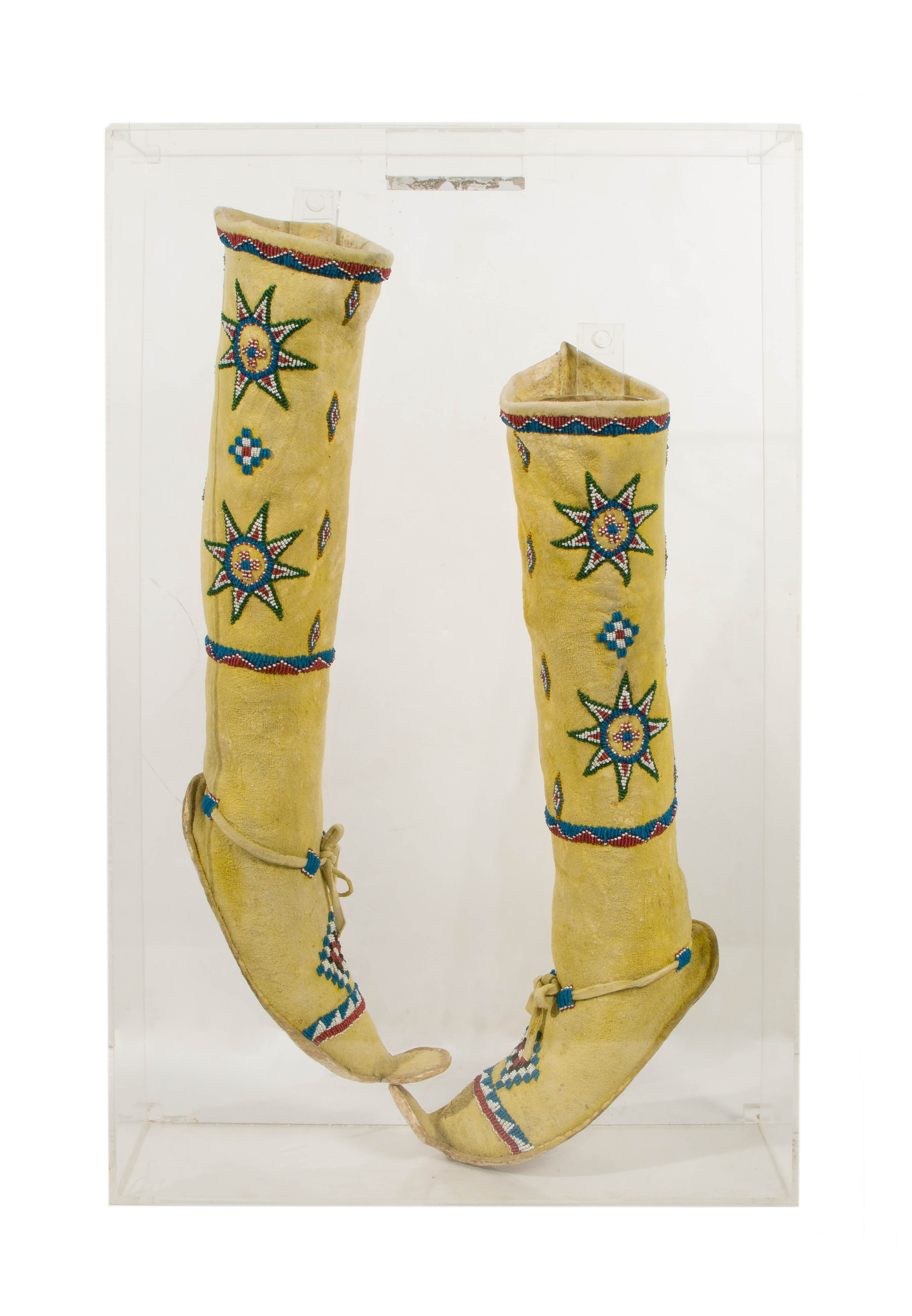 A pair of animal hide knee high boots having hand stitched glass bead designs overall and a cactus kicker nose at toe, presented in an acrylic case