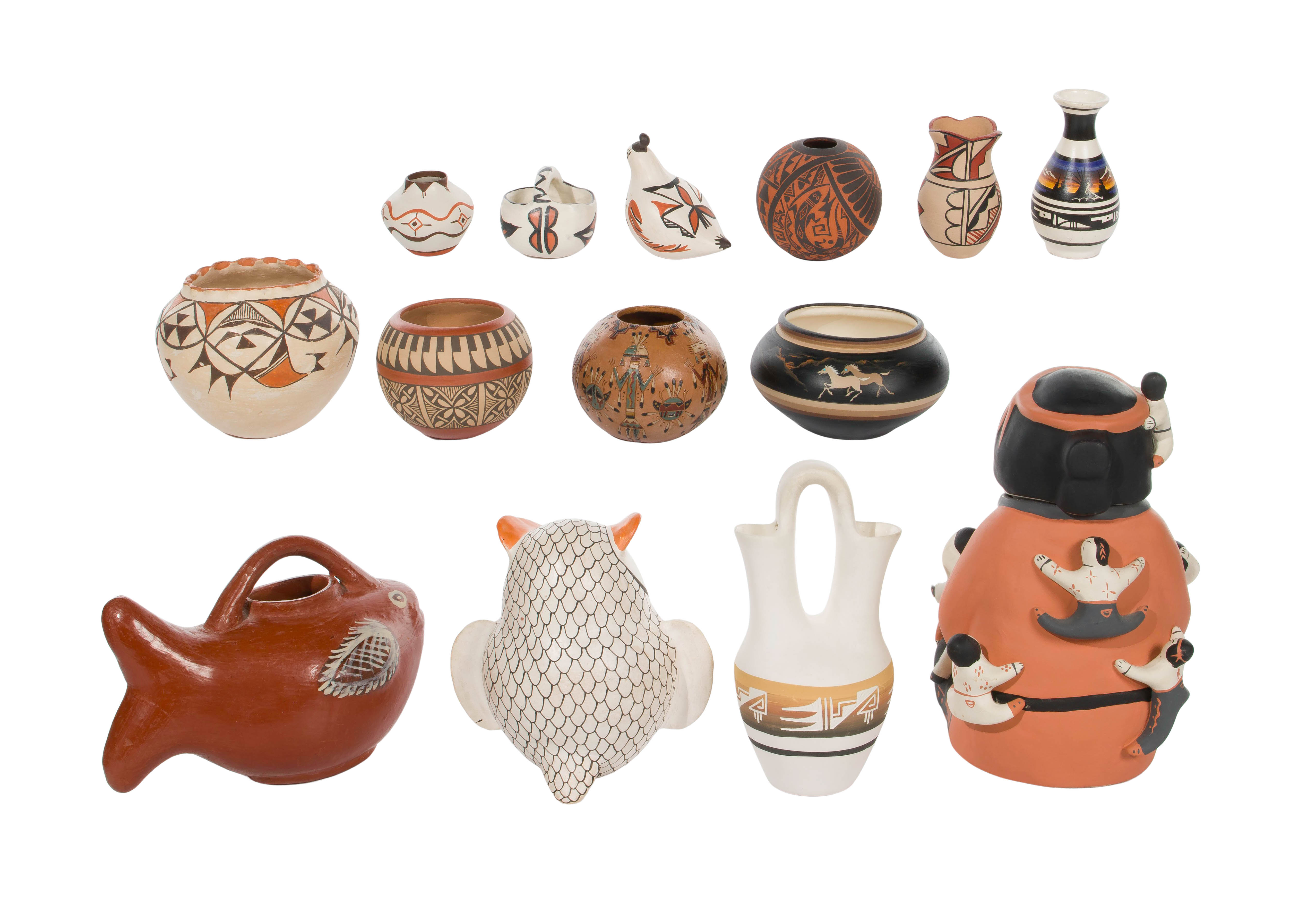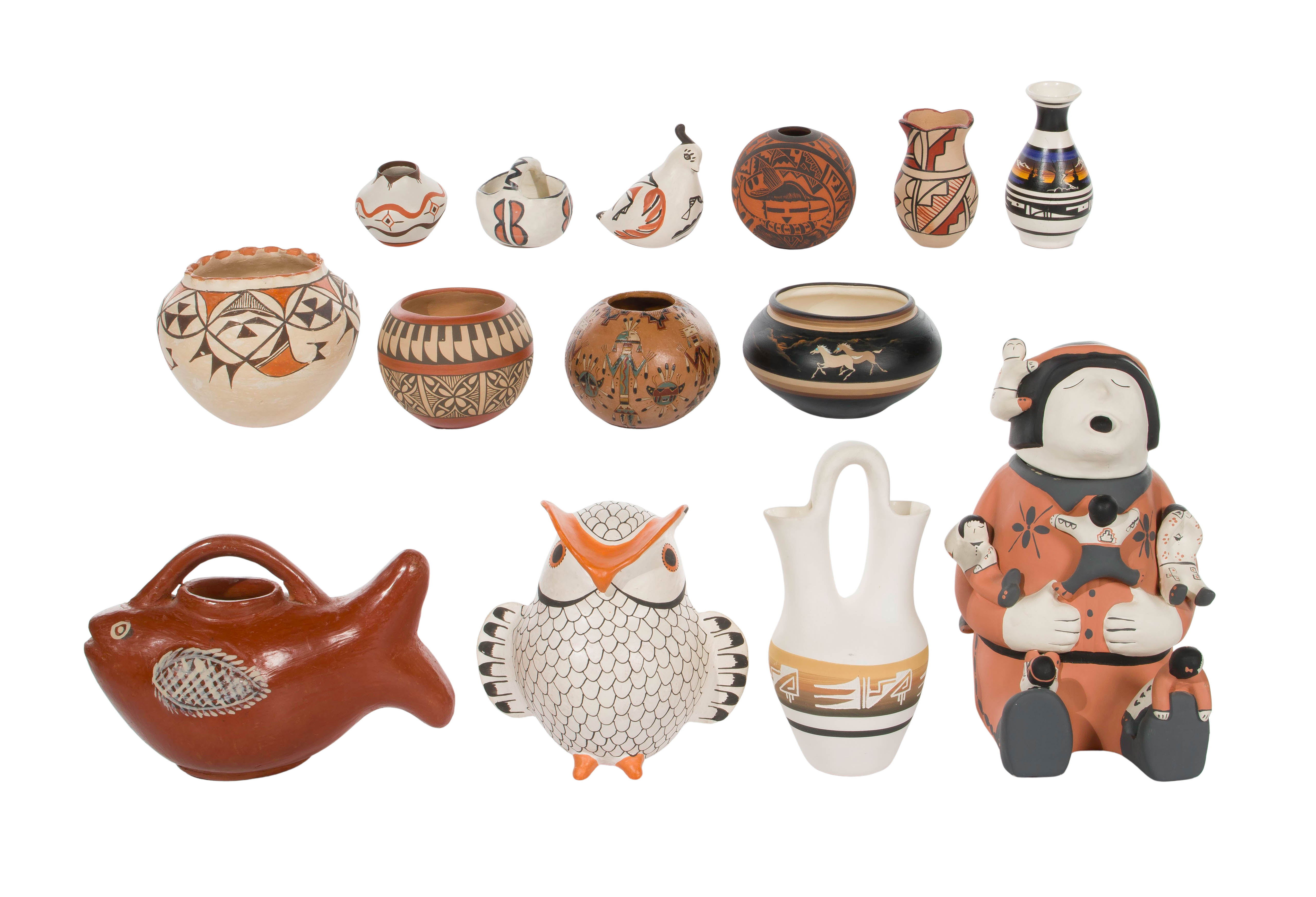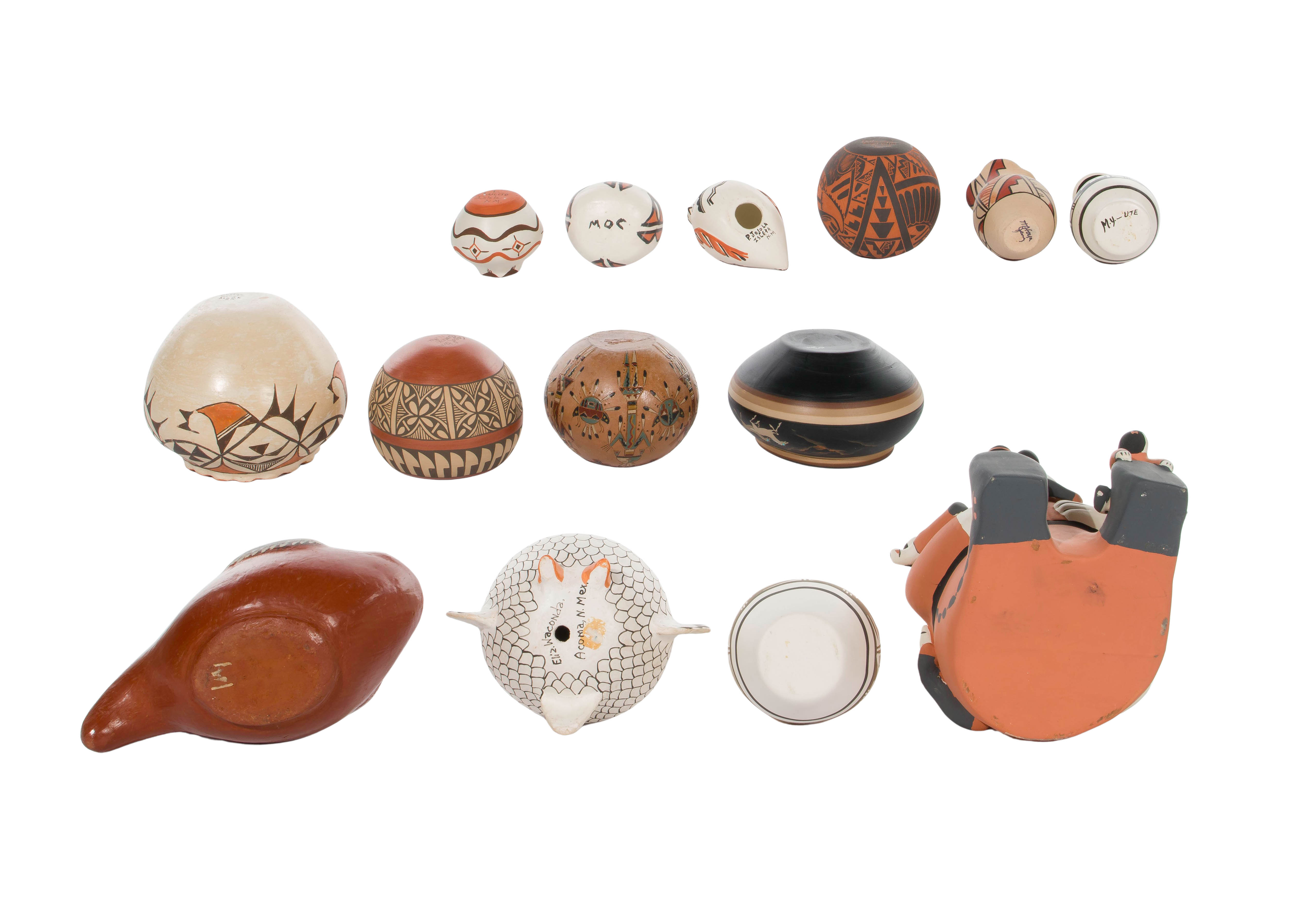(14) total items including an unsigned storyteller lidded jar, an ink signed Carol Pecos bowl and a vase having an indistinct Toya family signature from Jemez Pueblo, an Elizabeth Waconda owl effigy, a Santana Concha ruffled rim jar and an Ergil Vallo (Dalawepi) sgraffito jar from Acoma, a P. Jojola quail effigy and an L. Luceto jar from Isleta, a marked Hopi Toad bowl retaining Hopi Toad gallery paper insert and a small basket form pot initialed ‘JOW’; together with a Navajo kachina motif jar having an indistinct cipher and a sgraffito wedding bottle marked ‘Navajo’ underside, a Ute vase initialed ‘M.Y.’ and a Mexican glazed pottery fish shaped pitcher