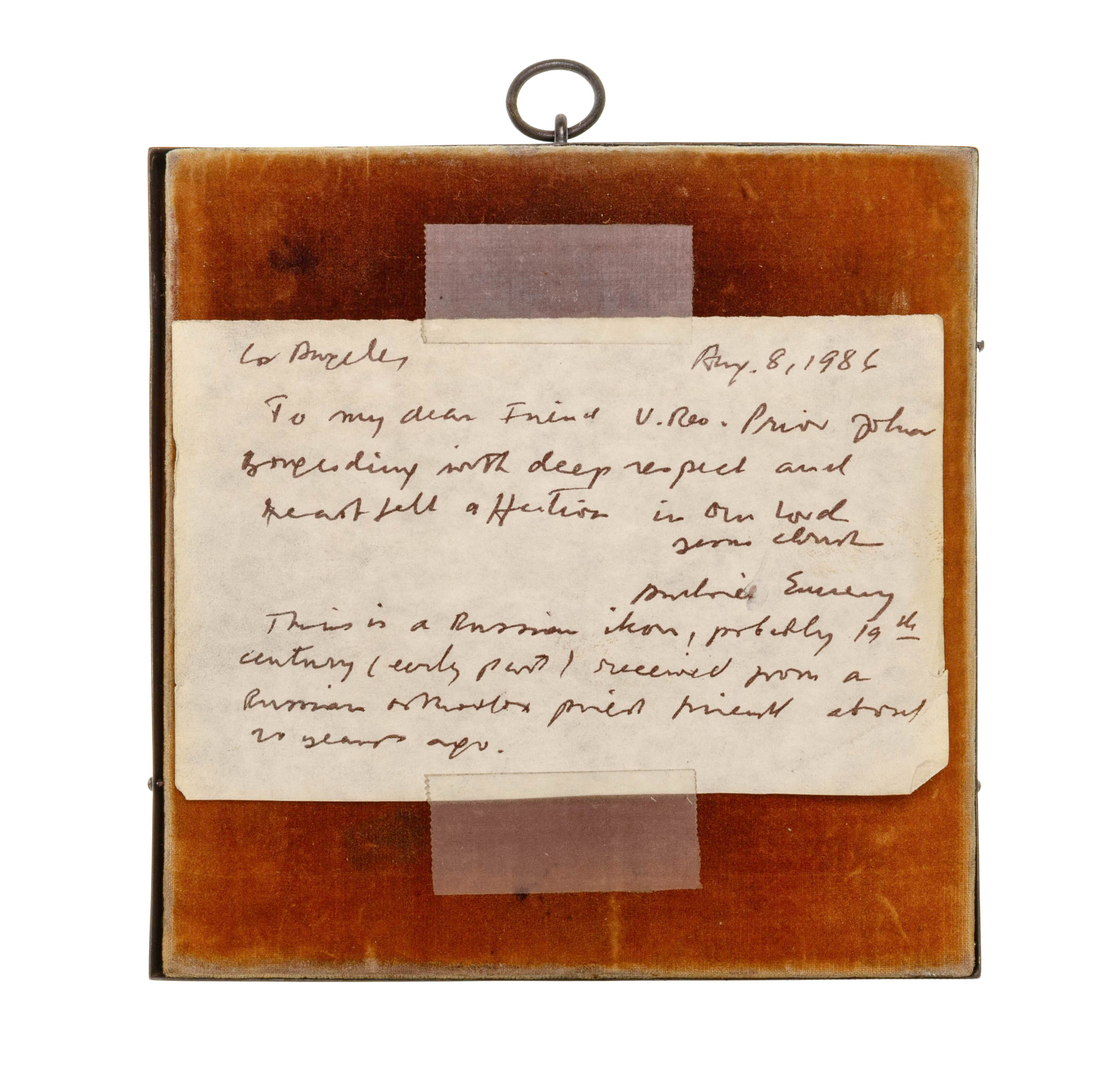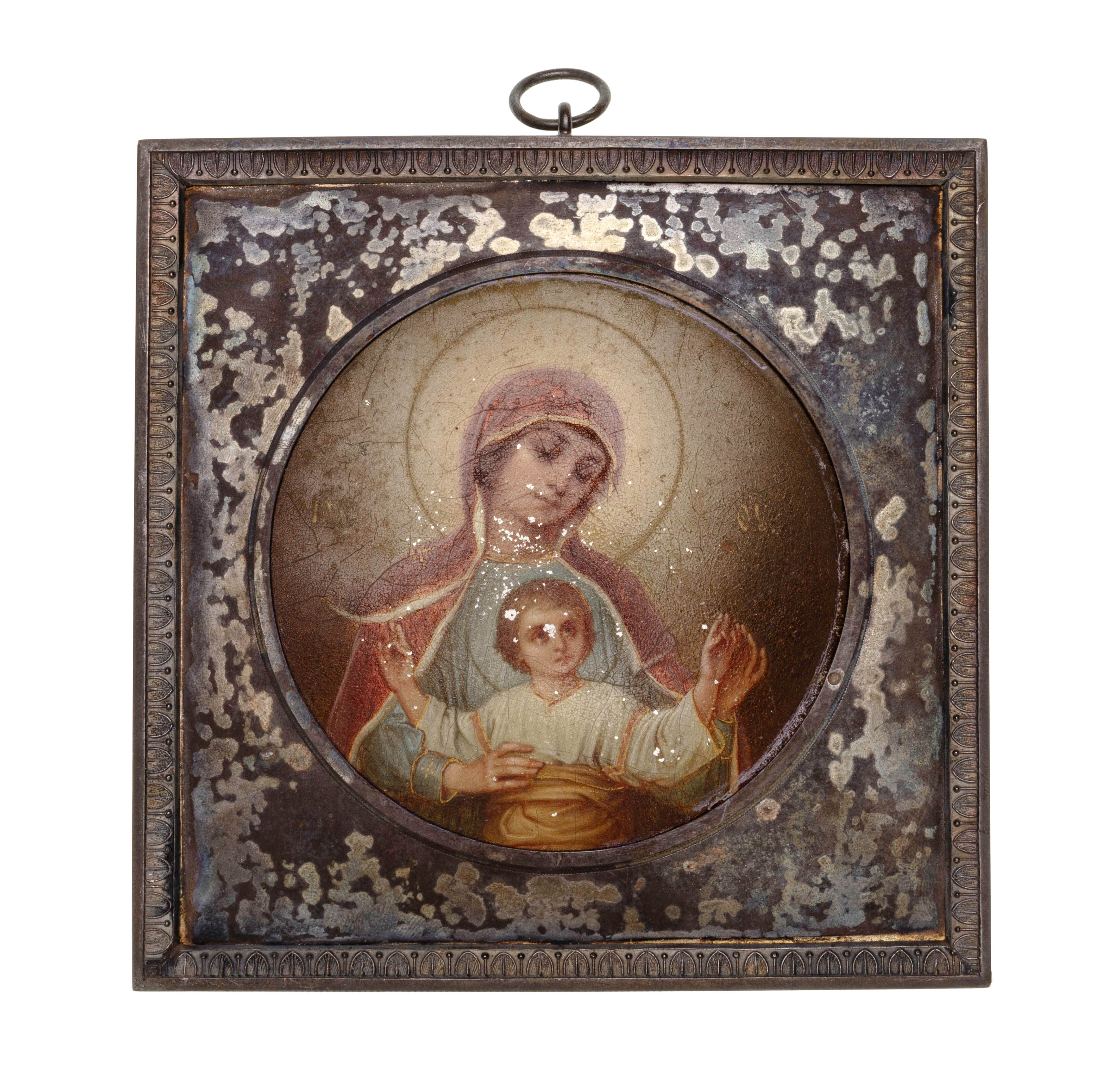 c.1910, silver oklad decorated with leaf border, hand painted depiction of Mother Mary and child on tin (hallmarked and marked ’84’ on edge)