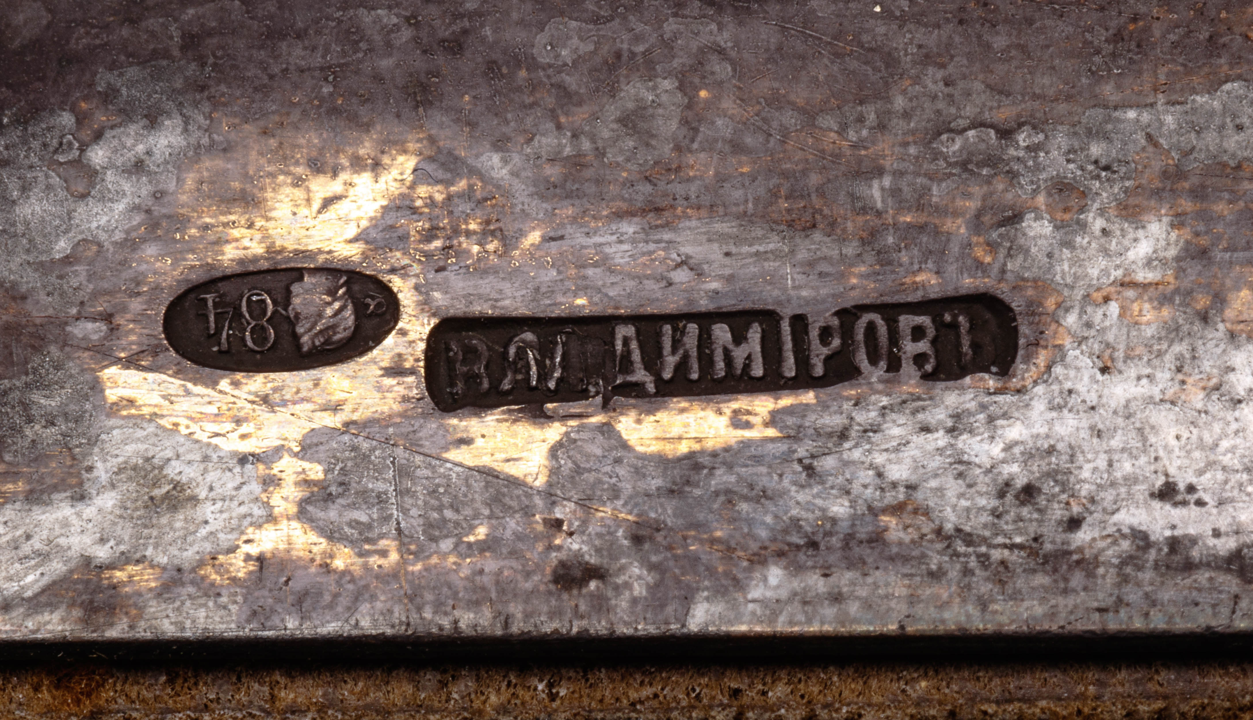 Condition: heavy tarnish to the silver, tin having paint loss and craquelure, missing a screw on the edge, acid tested as silver but purity unknown