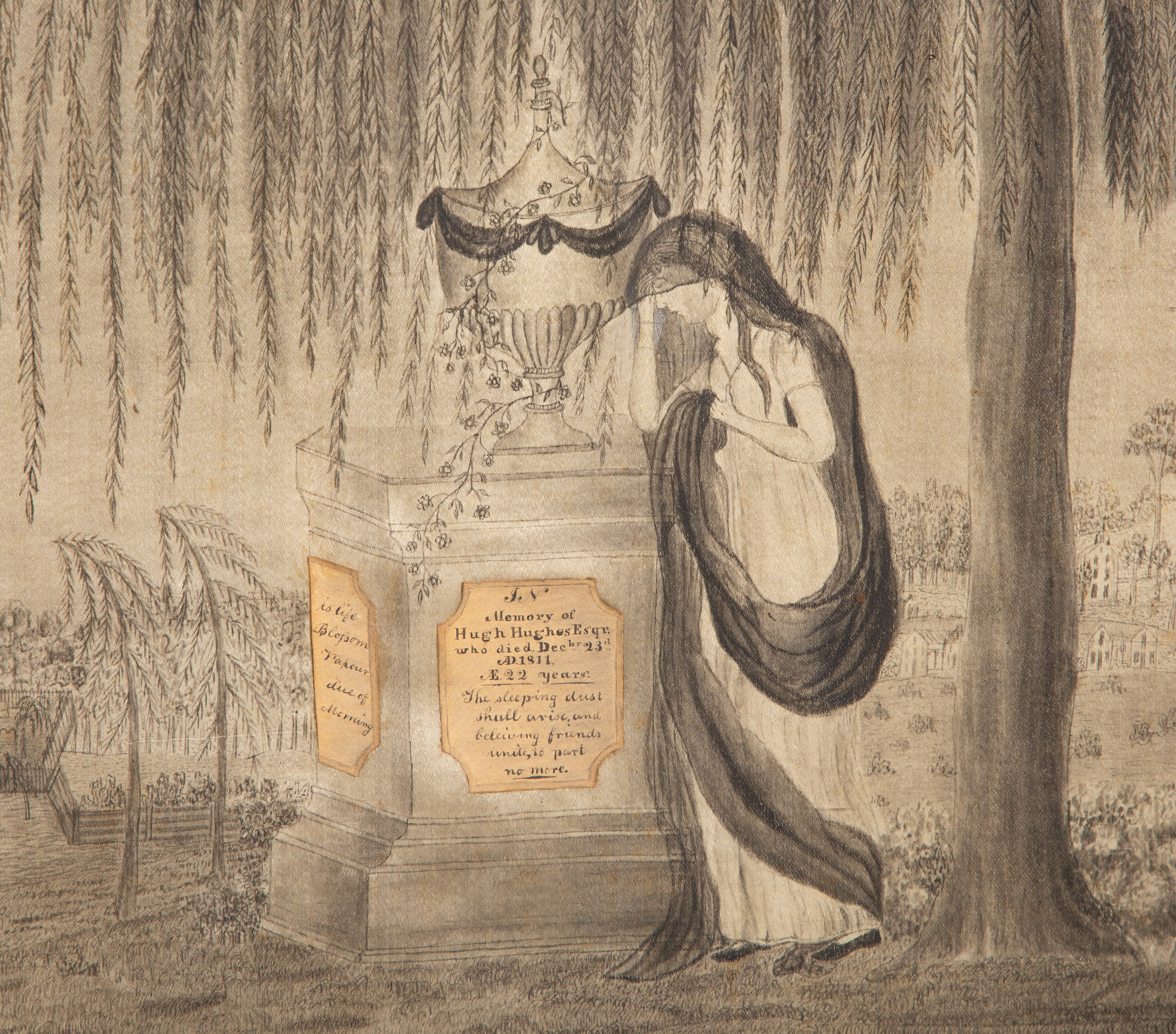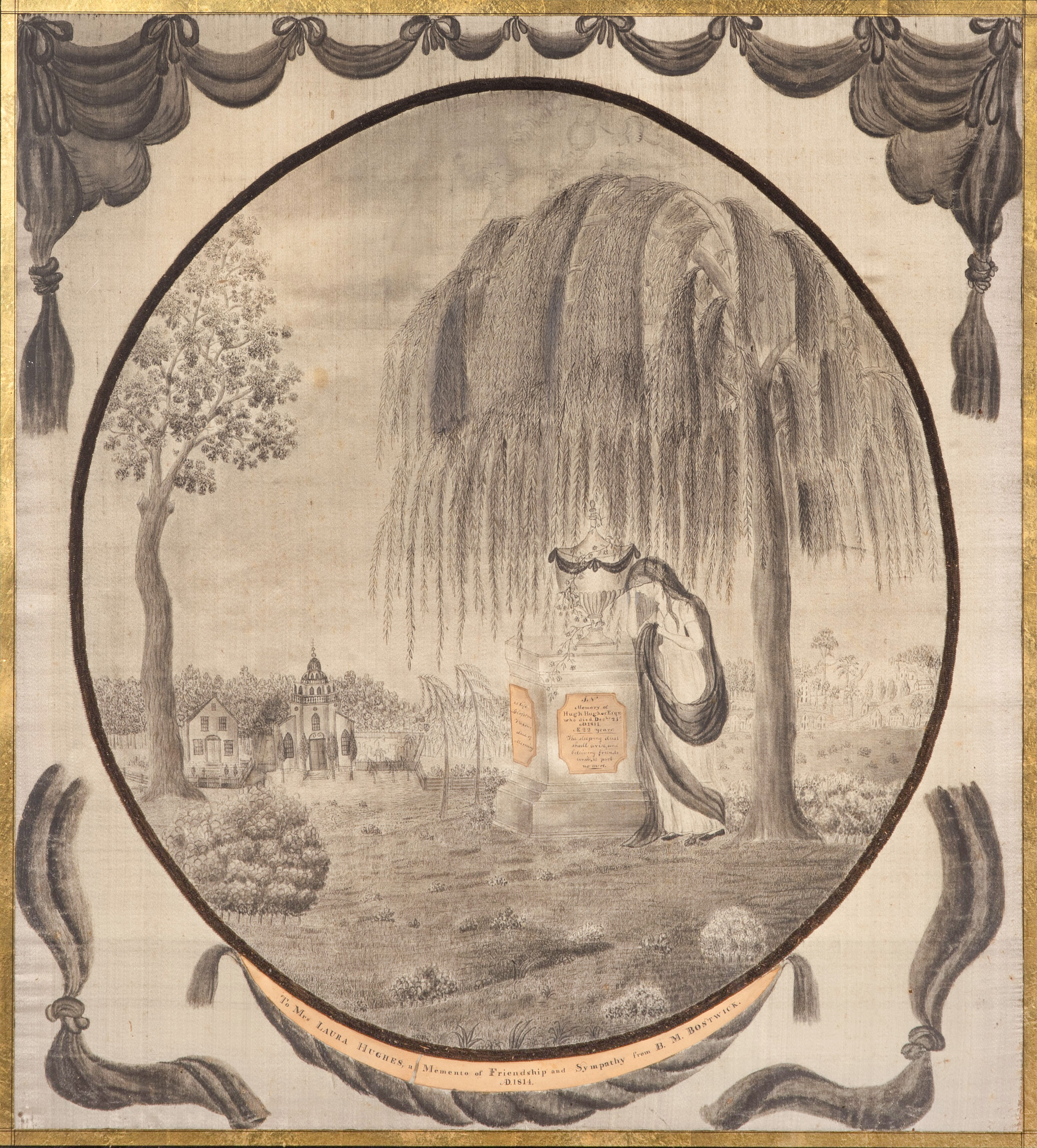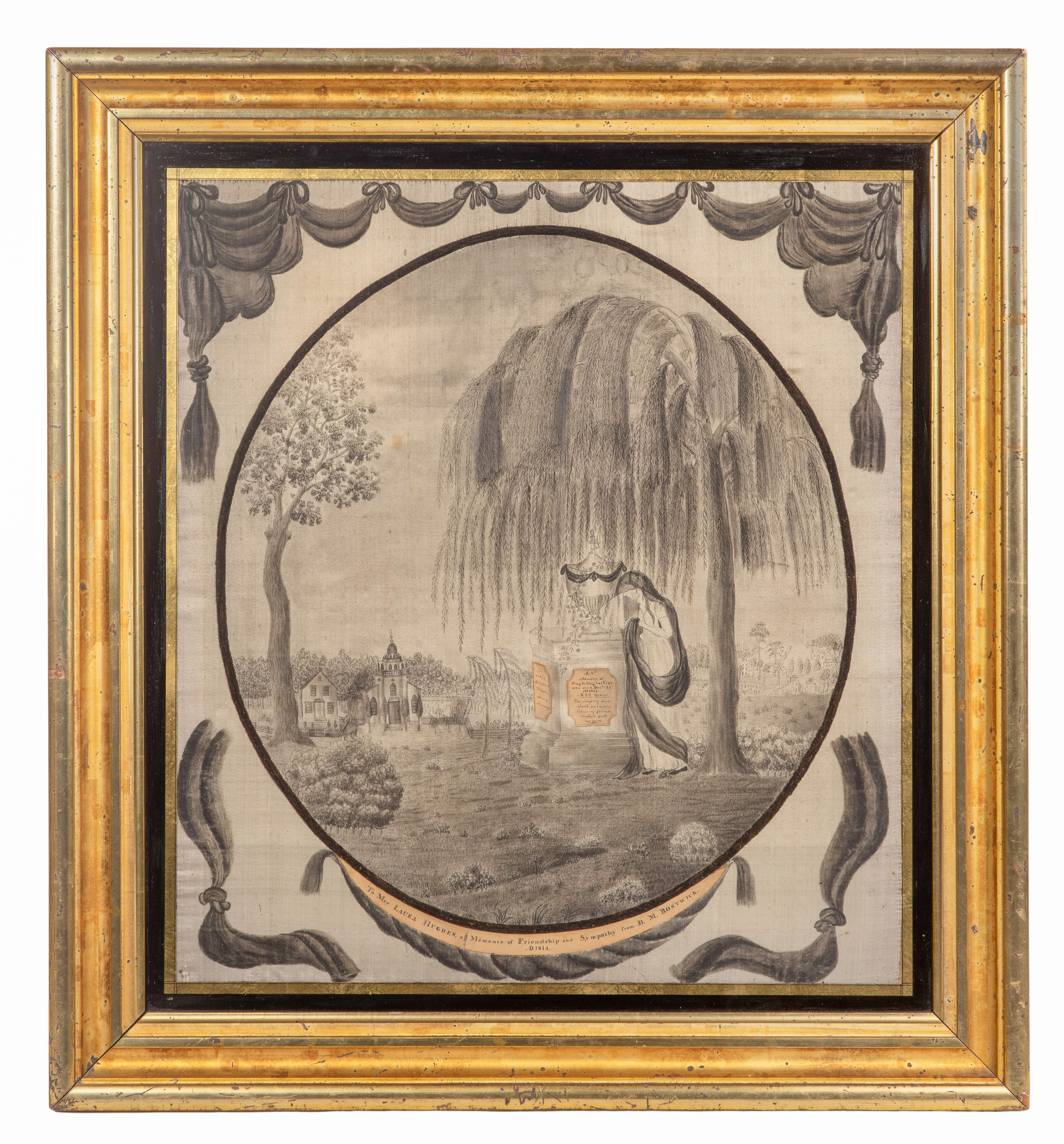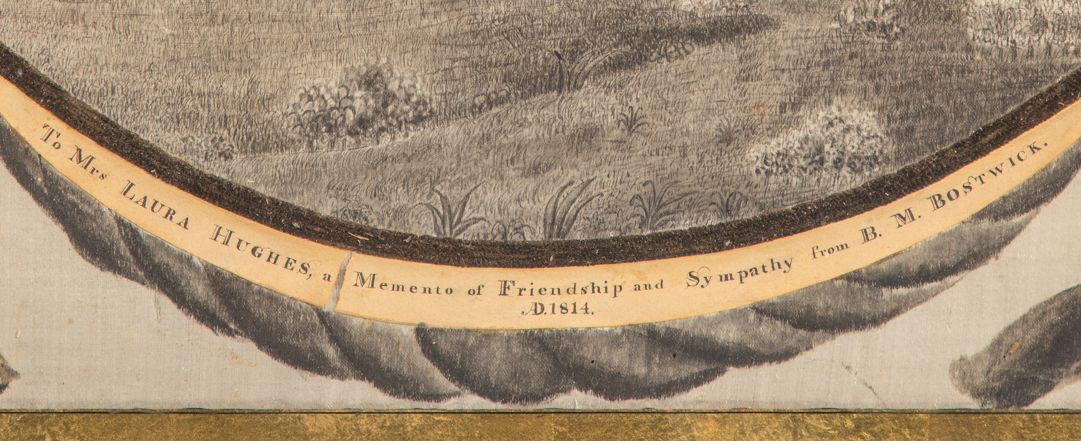 Having a depiction of a female mourner at a tomb beneath a weeping willow, amid a landscape having a church and houses within an oval panel having applied ribbon outline and watercolor drapery swag above and below, applied paper elements having ink inscriptions to tomb (of Hugh Hughes) and below oval, the later reading ‘To Mrs. Laura Hughes, a Memento of Friendship and Sympathy from B. M. Bostwick / D.1814’, behind reverse painted and gilt glass in a gold-tone lacquered wood frame