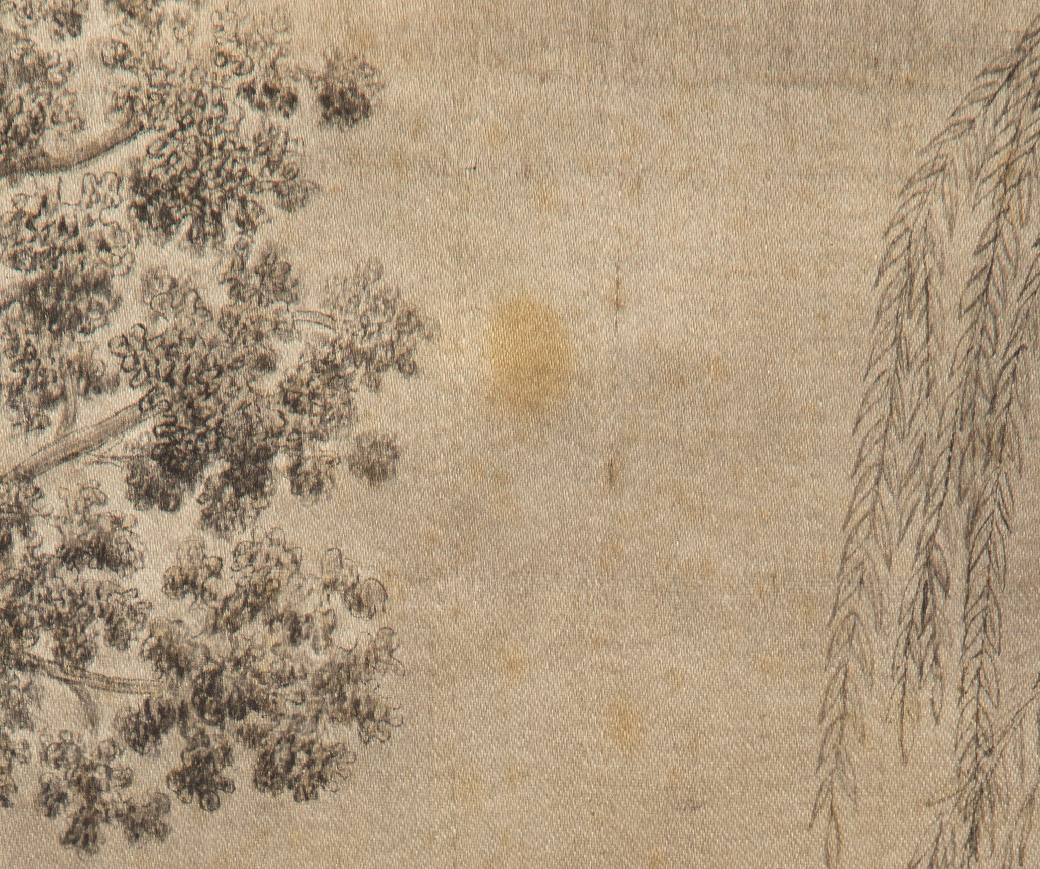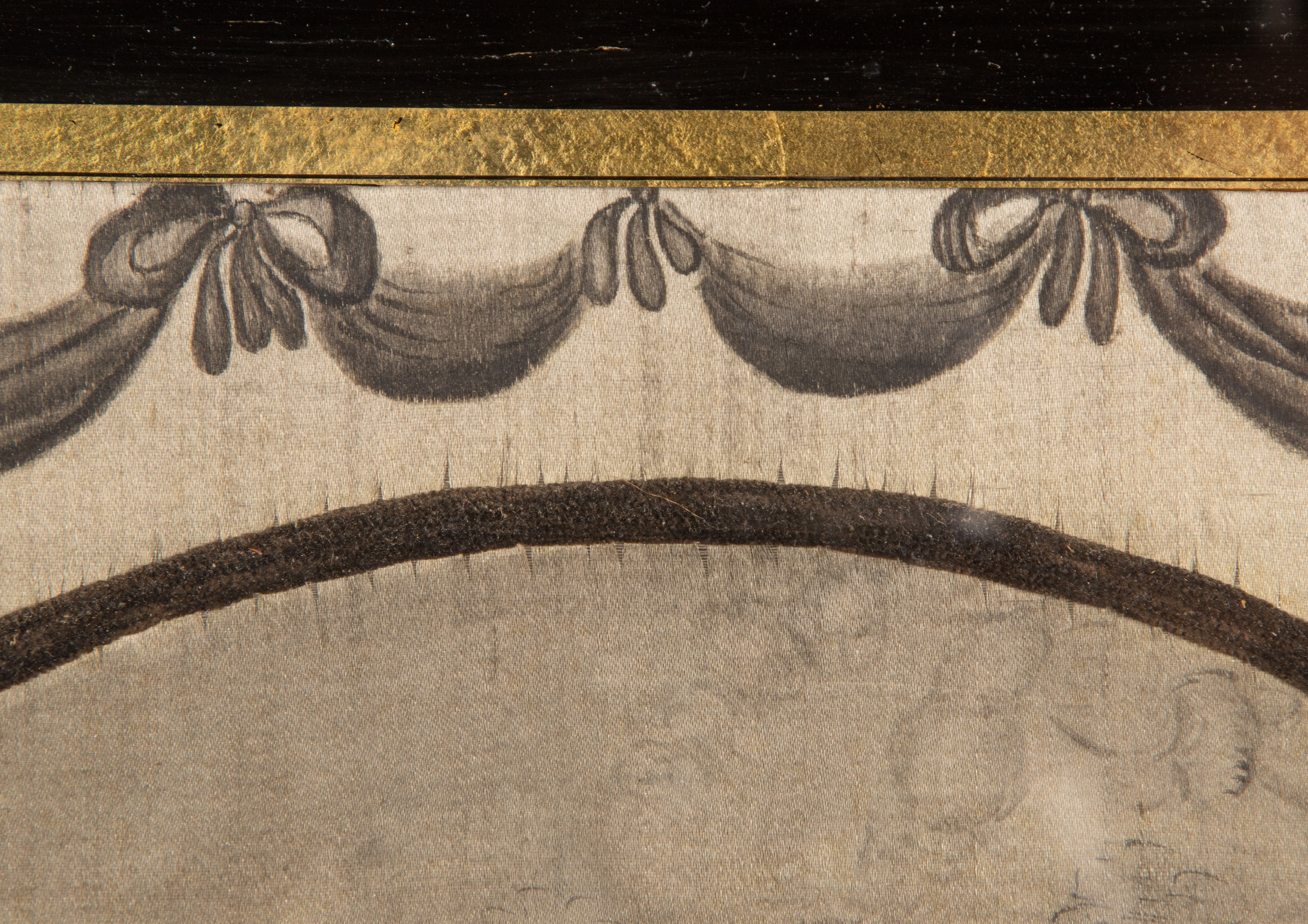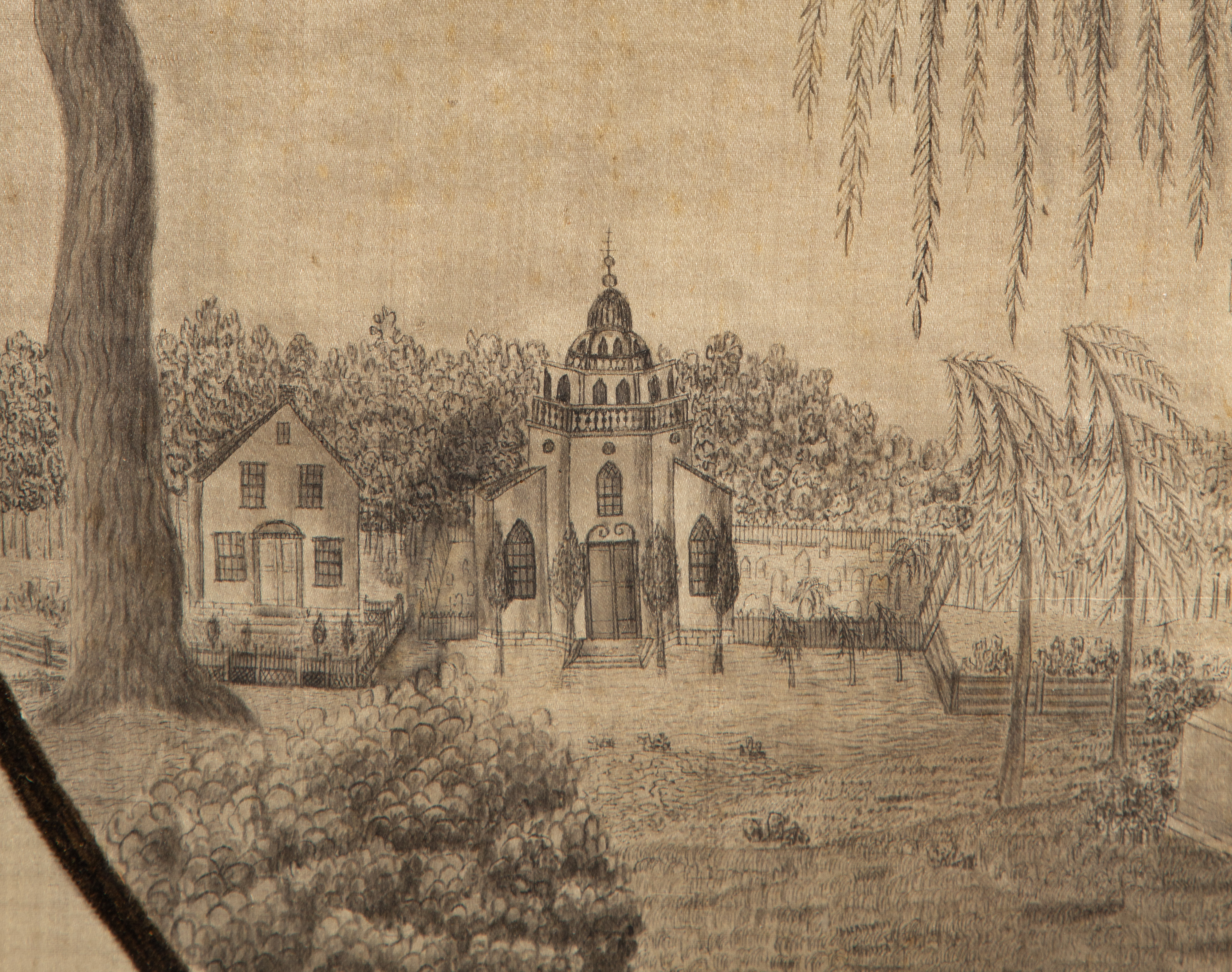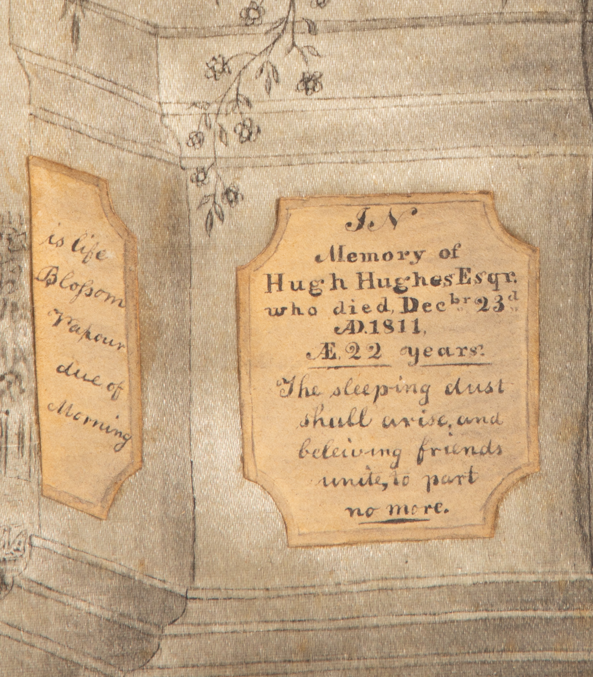 Having a depiction of a female mourner at a tomb beneath a weeping willow, amid a landscape having a church and houses within an oval panel having applied ribbon outline and watercolor drapery swag above and below, applied paper elements having ink inscriptions to tomb (of Hugh Hughes) and below oval, the later reading ‘To Mrs. Laura Hughes, a Memento of Friendship and Sympathy from B. M. Bostwick / D.1814’, behind reverse painted and gilt glass in a gold-tone lacquered wood frame