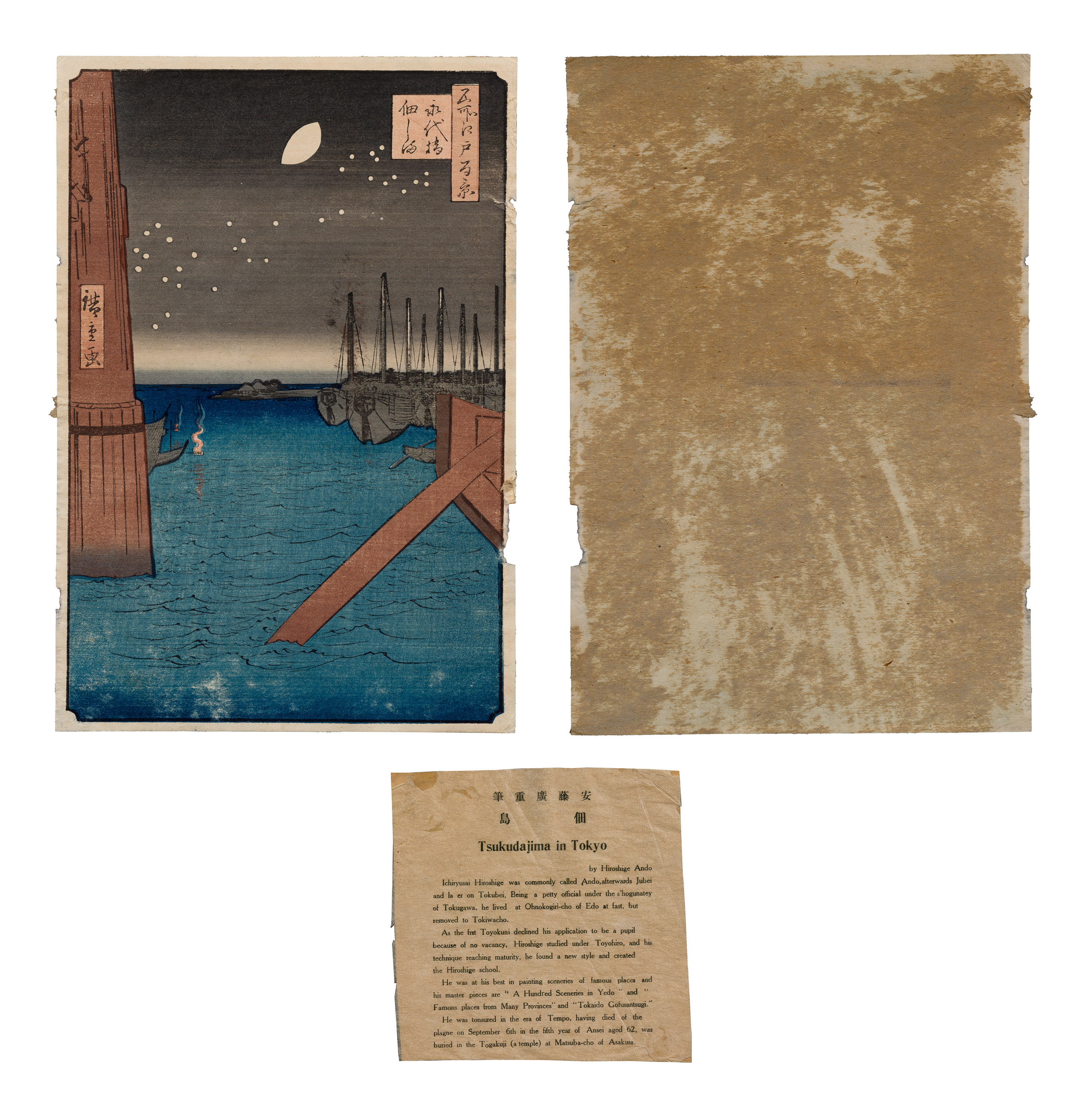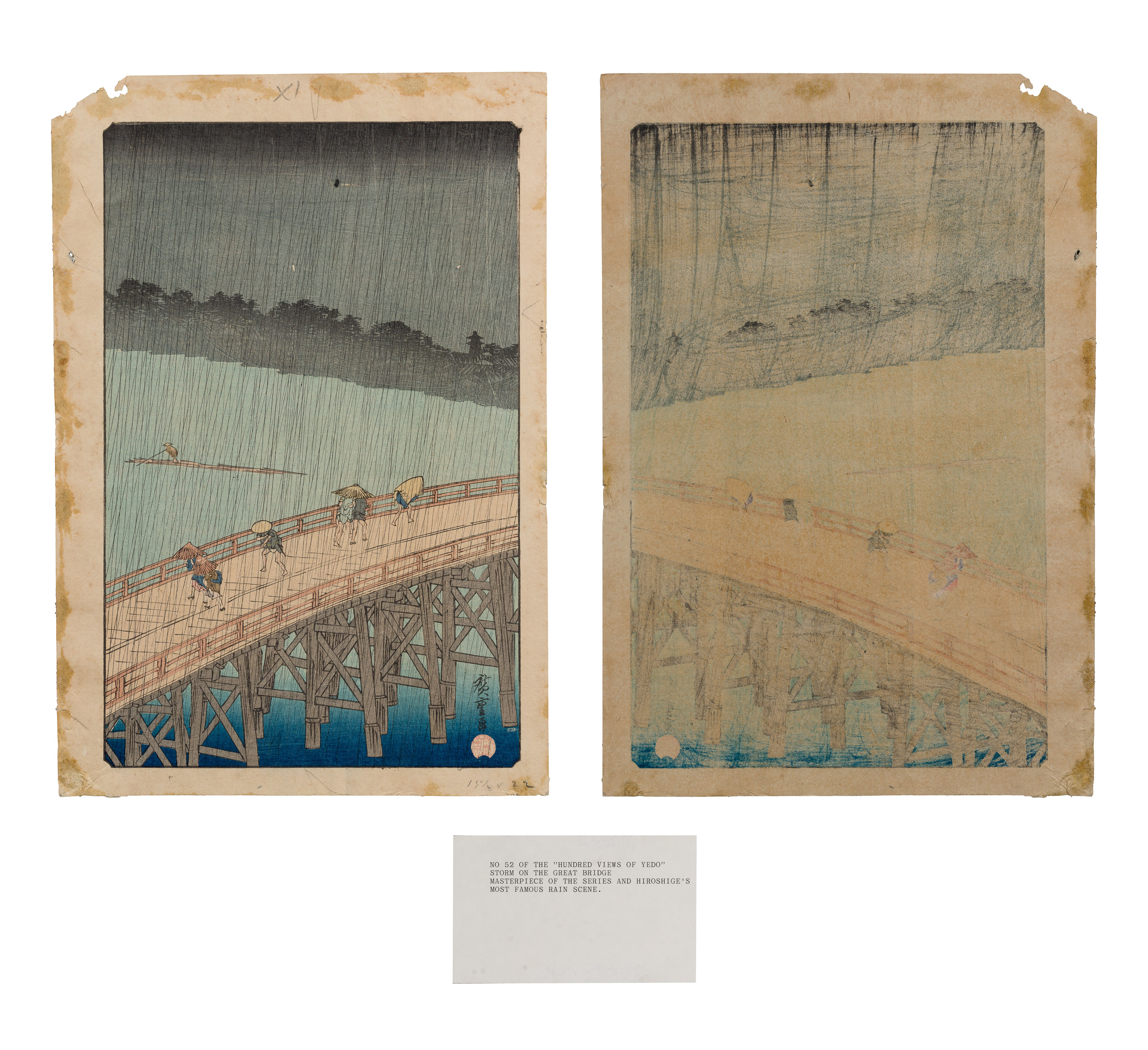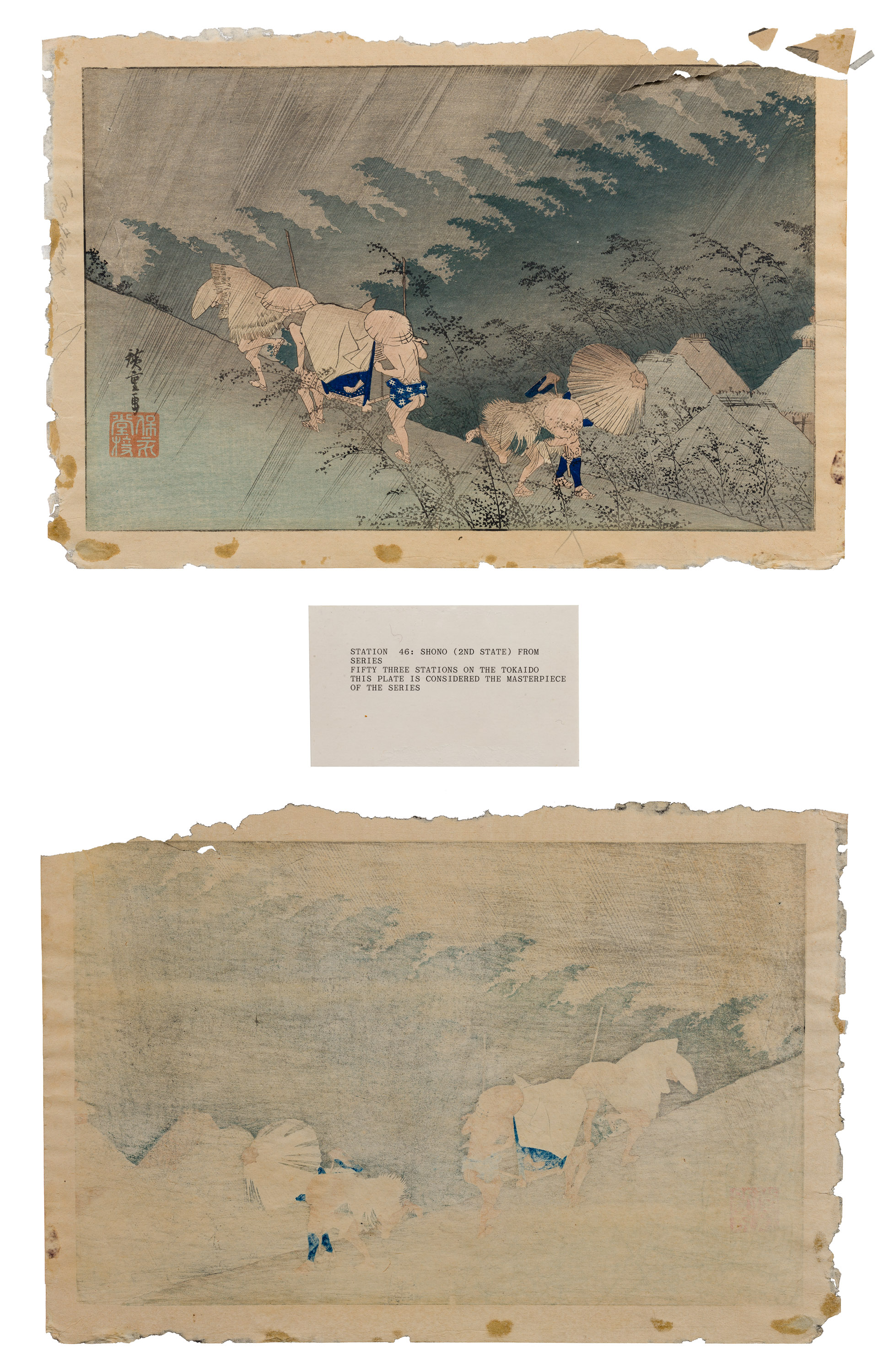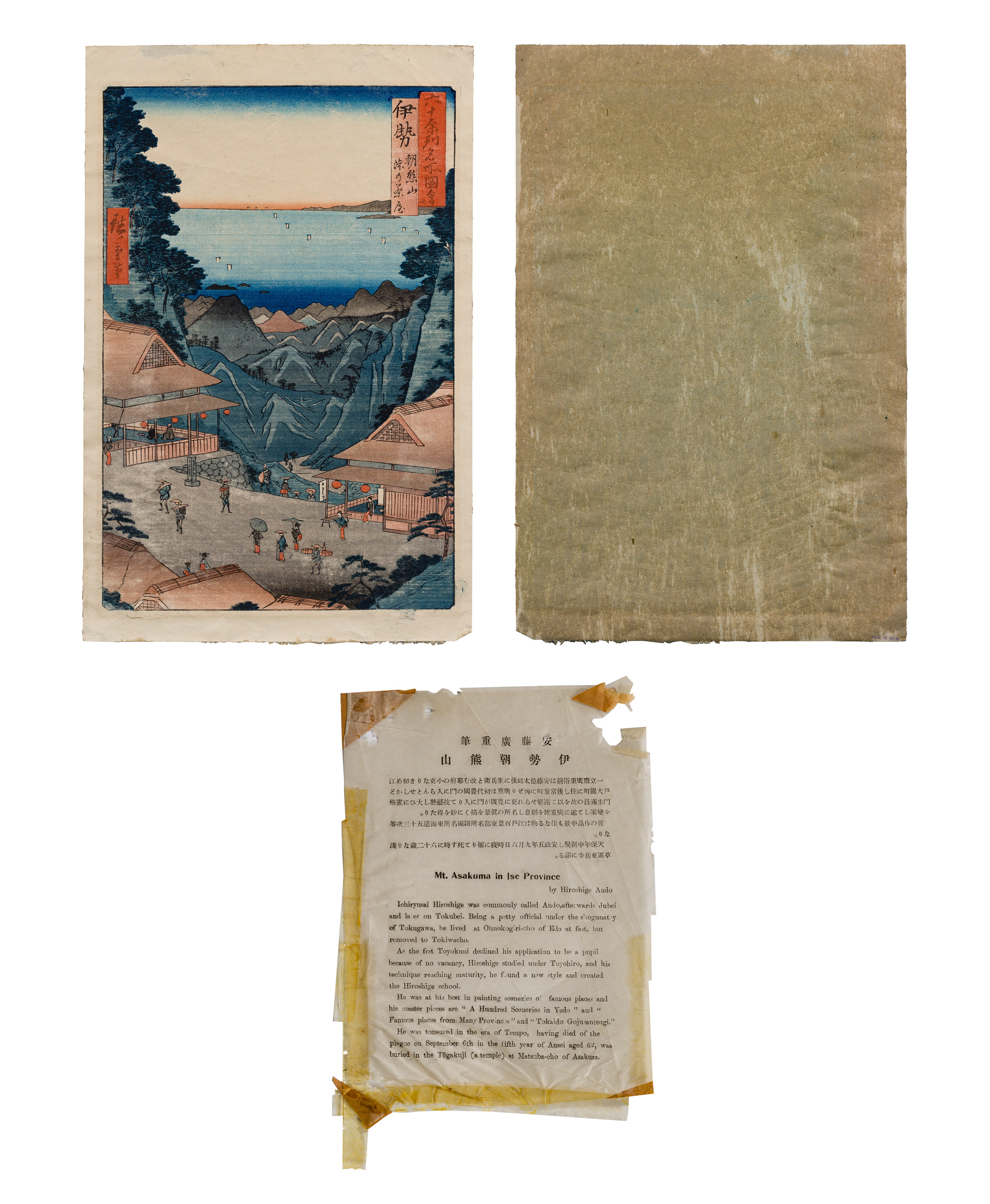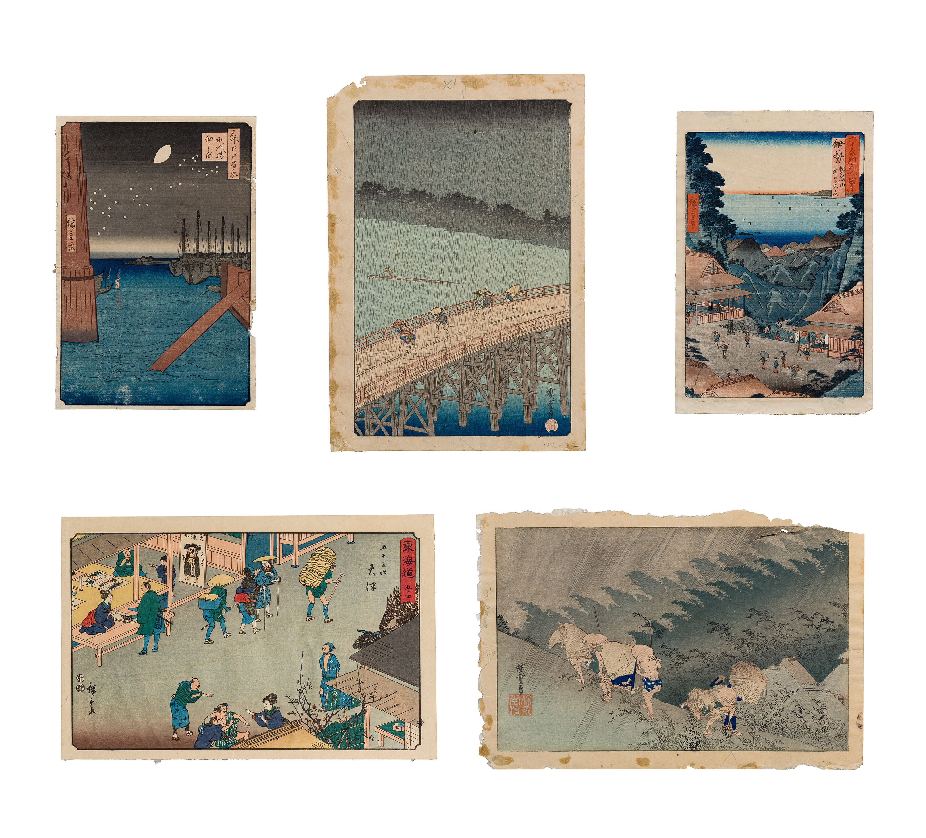 (5) items including ‘Storm on the Great Bridge’ from ‘A Hundred Views of Edo’, ‘Shono (Station 46)’ and ‘Otsu (Station 54)’ from ‘Fifty-three Stations of Tokaido’, all oban size, as well as (2) ogata-chuban size ‘Mt. Asakuma in Ise Province’ and ‘Tsukudajima in Tokyo’, both having identifying labels, all full sheets having margins, unframed