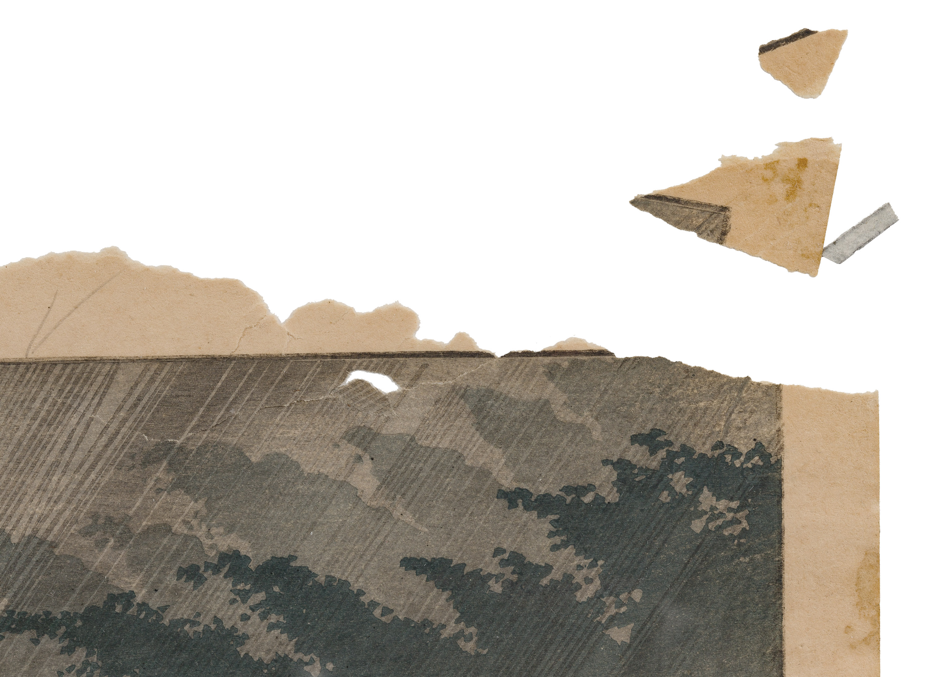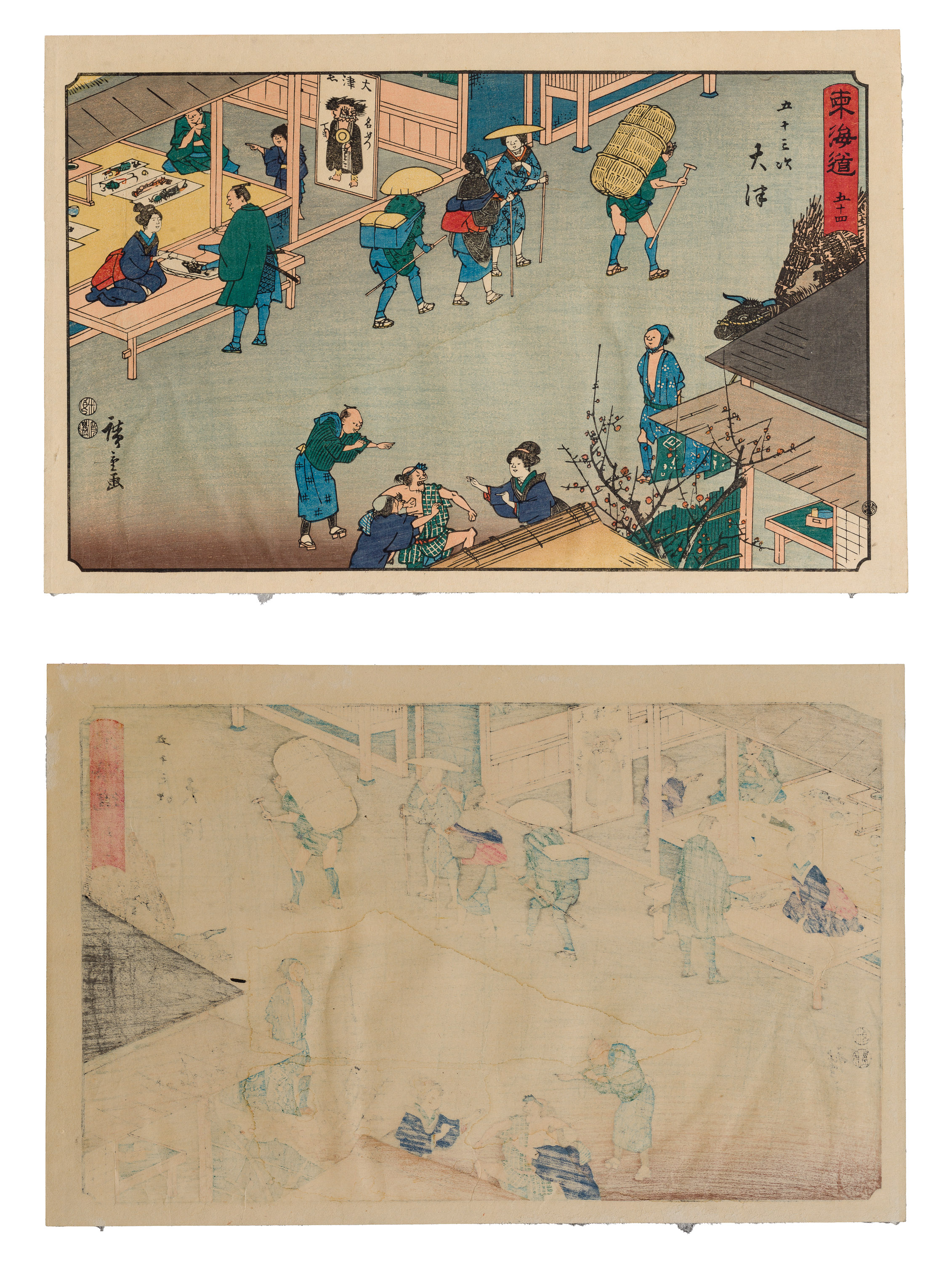 Condition: overall light wear consistent with normal use, toning, edge wear, occasional light stains or discoloration, ‘Storm on the Great Bridge’, ‘Shono (Station 46)’ and ‘Tsukudajima’ having chips and losses (loose pieces of ‘Shono’ present), ‘Otsu (Station 54)’ having repaired insect damage