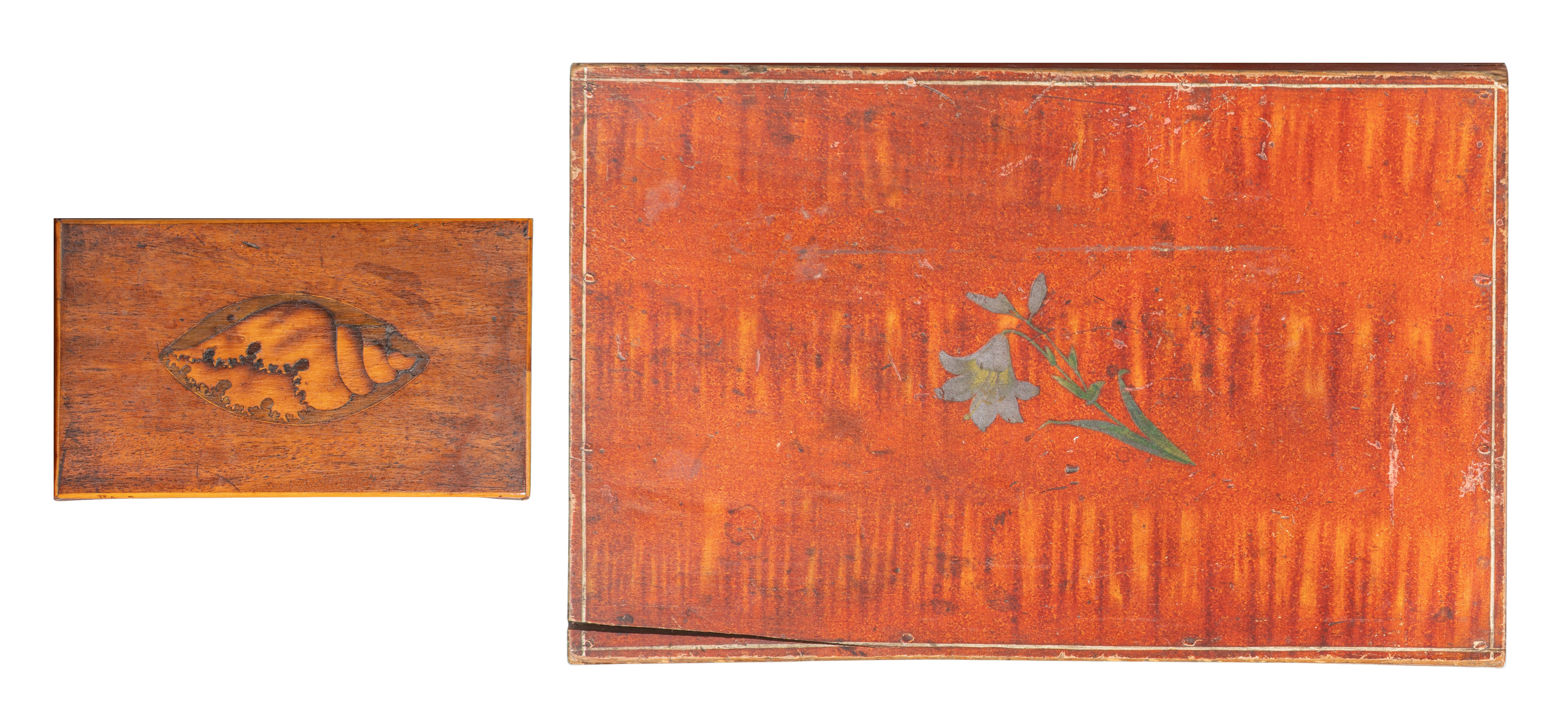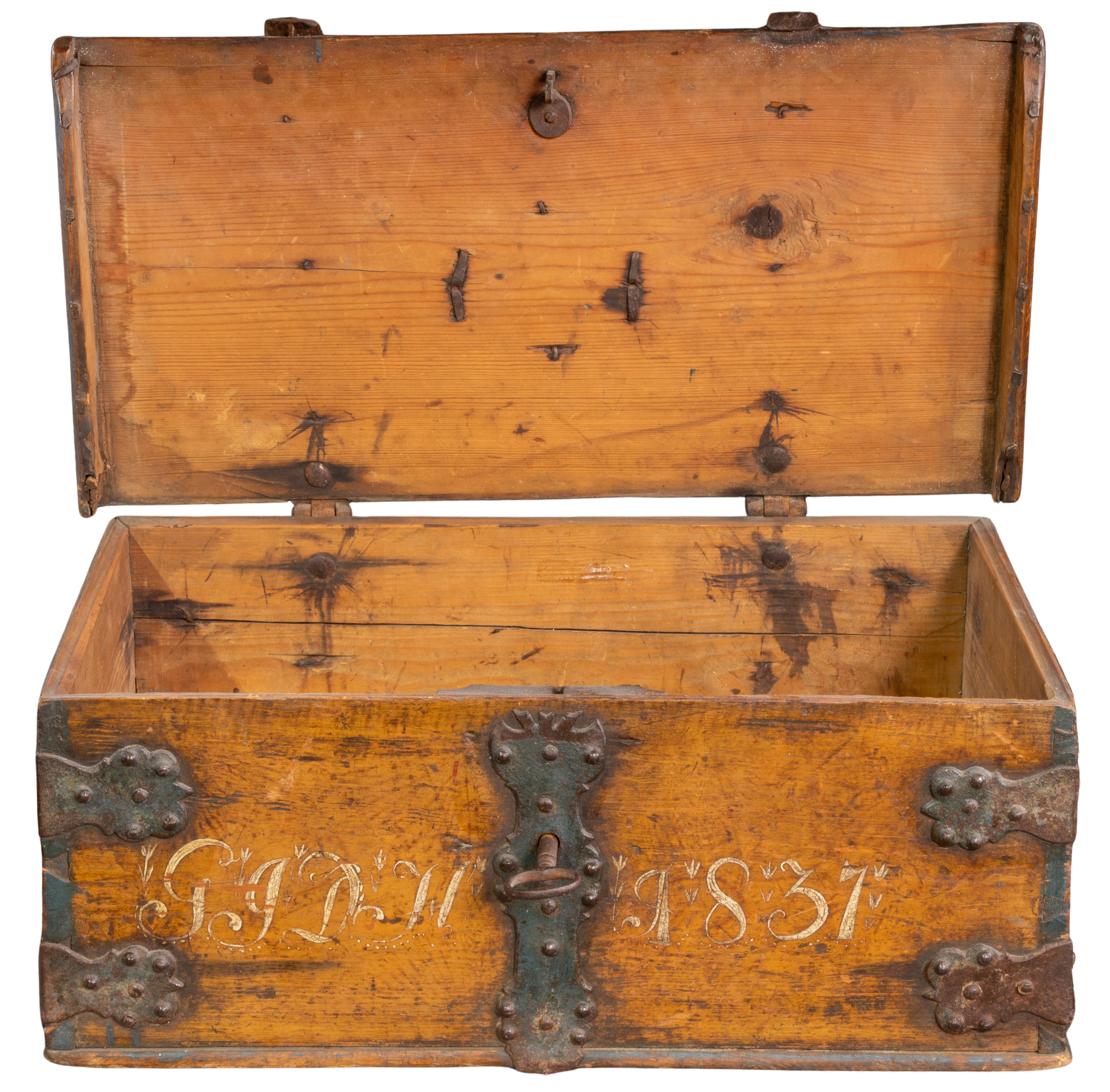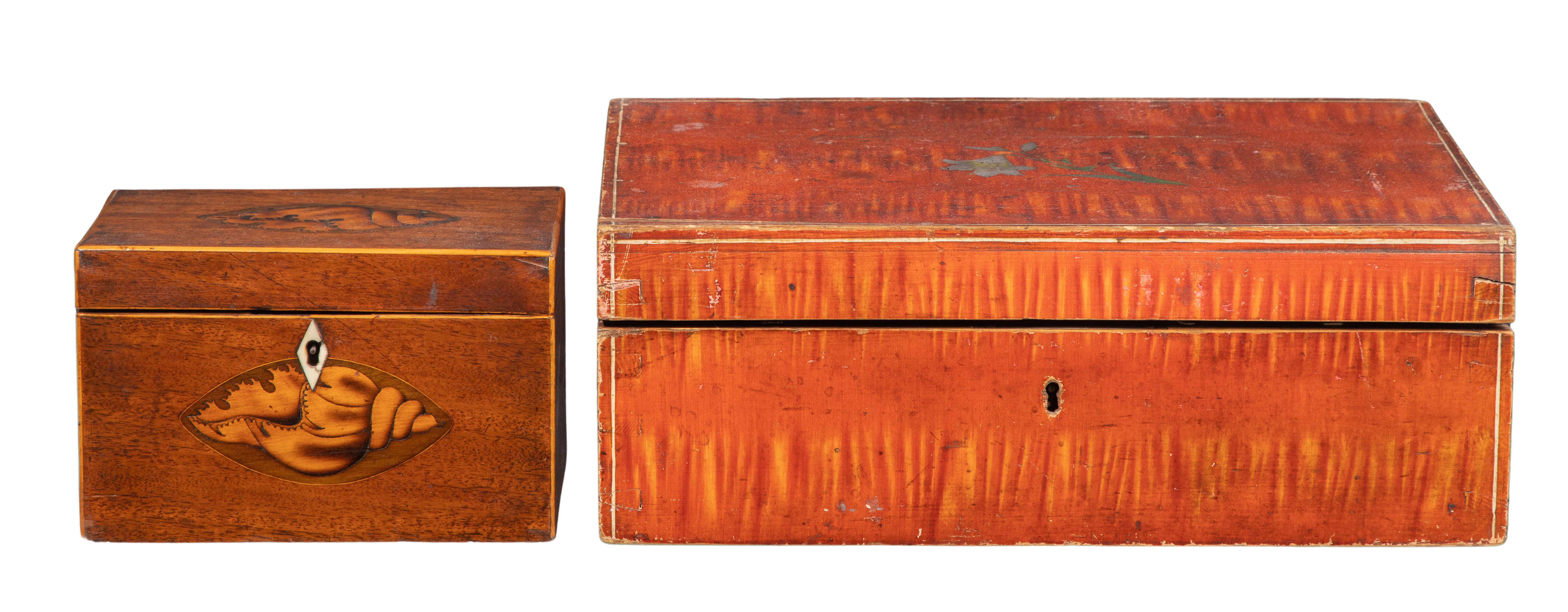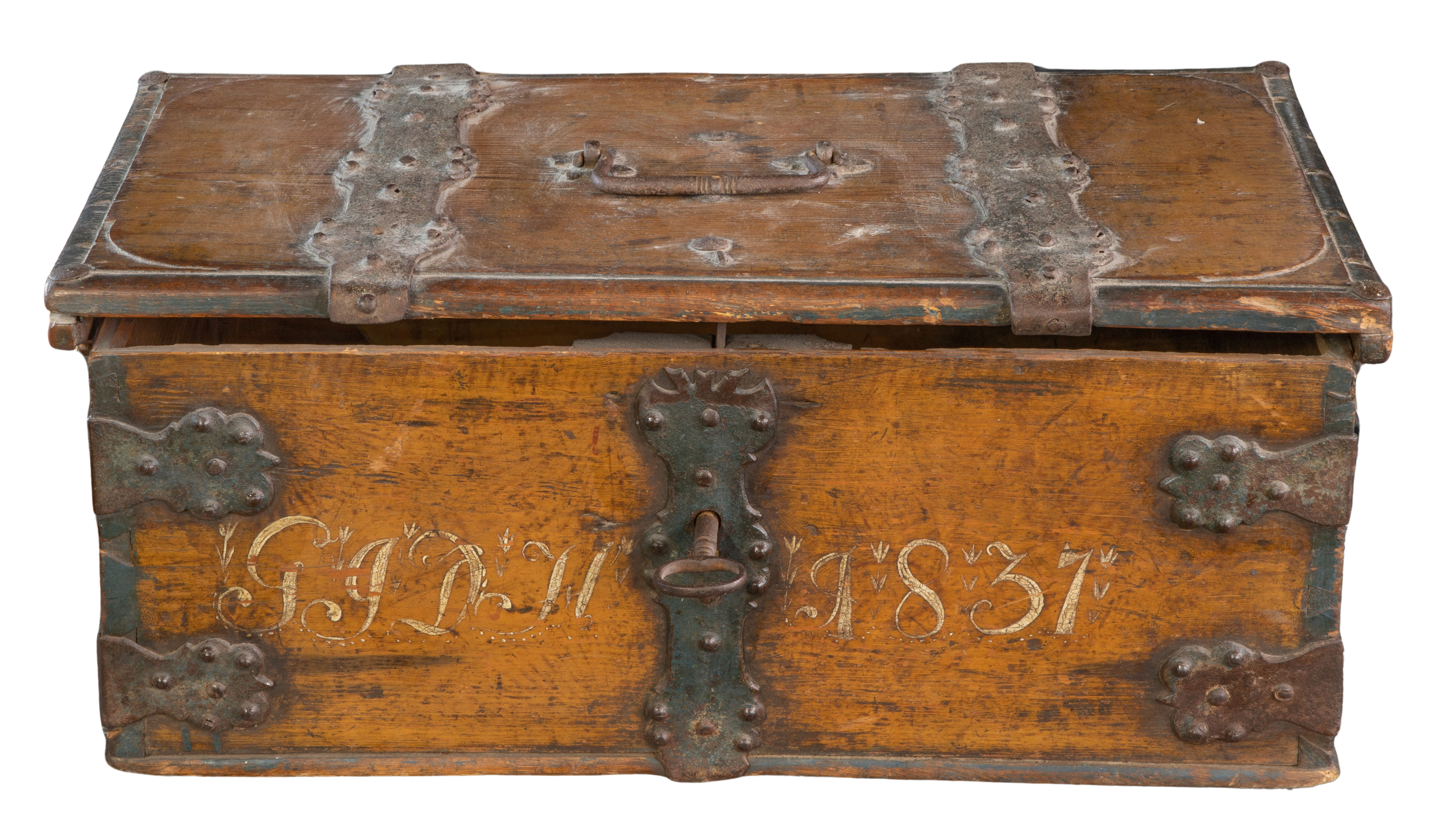 (3) total items including a wood and iron strong box dated 1837 and initialed on the front, including key; together with a lap desk having floral motif and a hinged tobacco box having shell motif