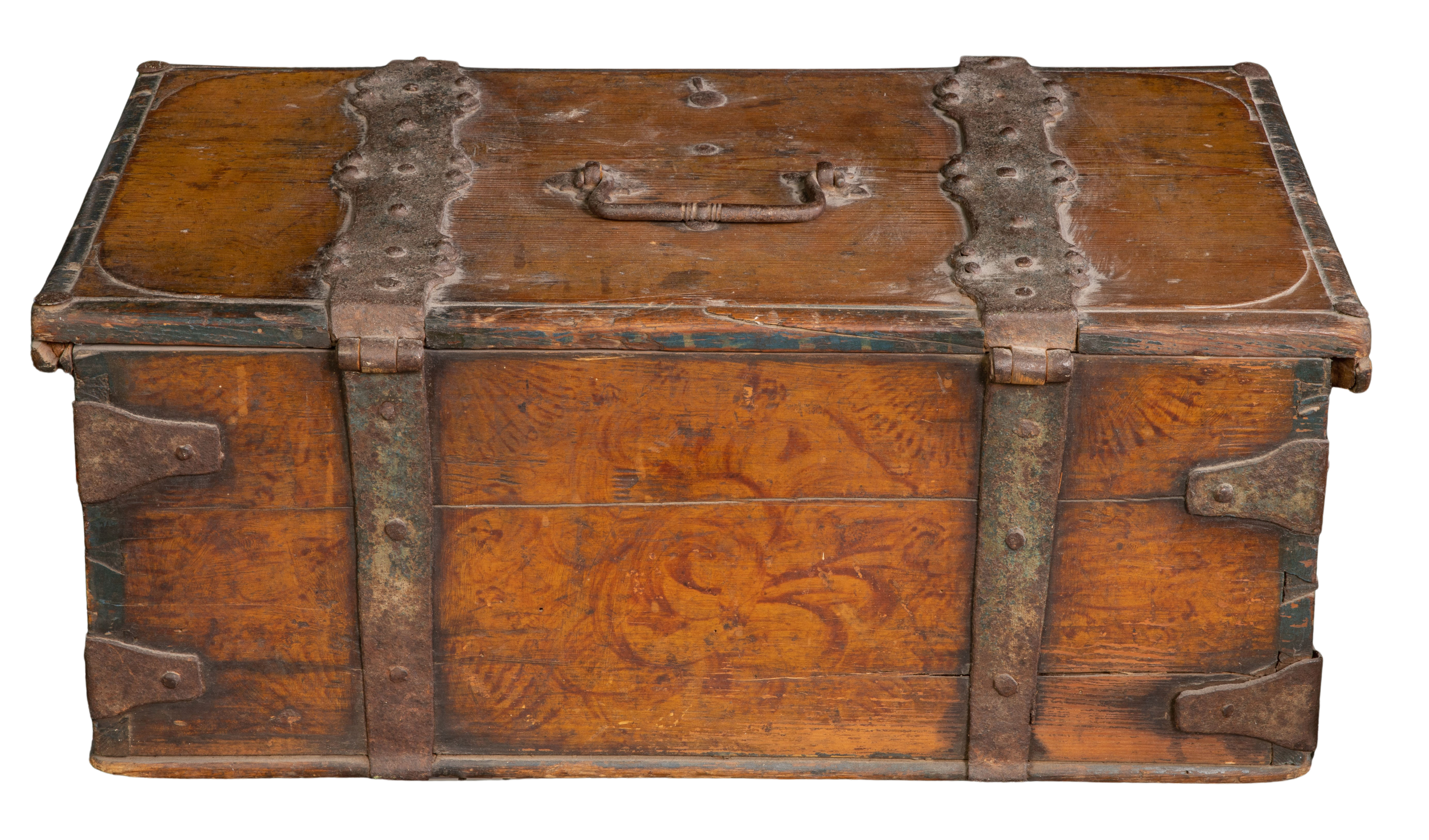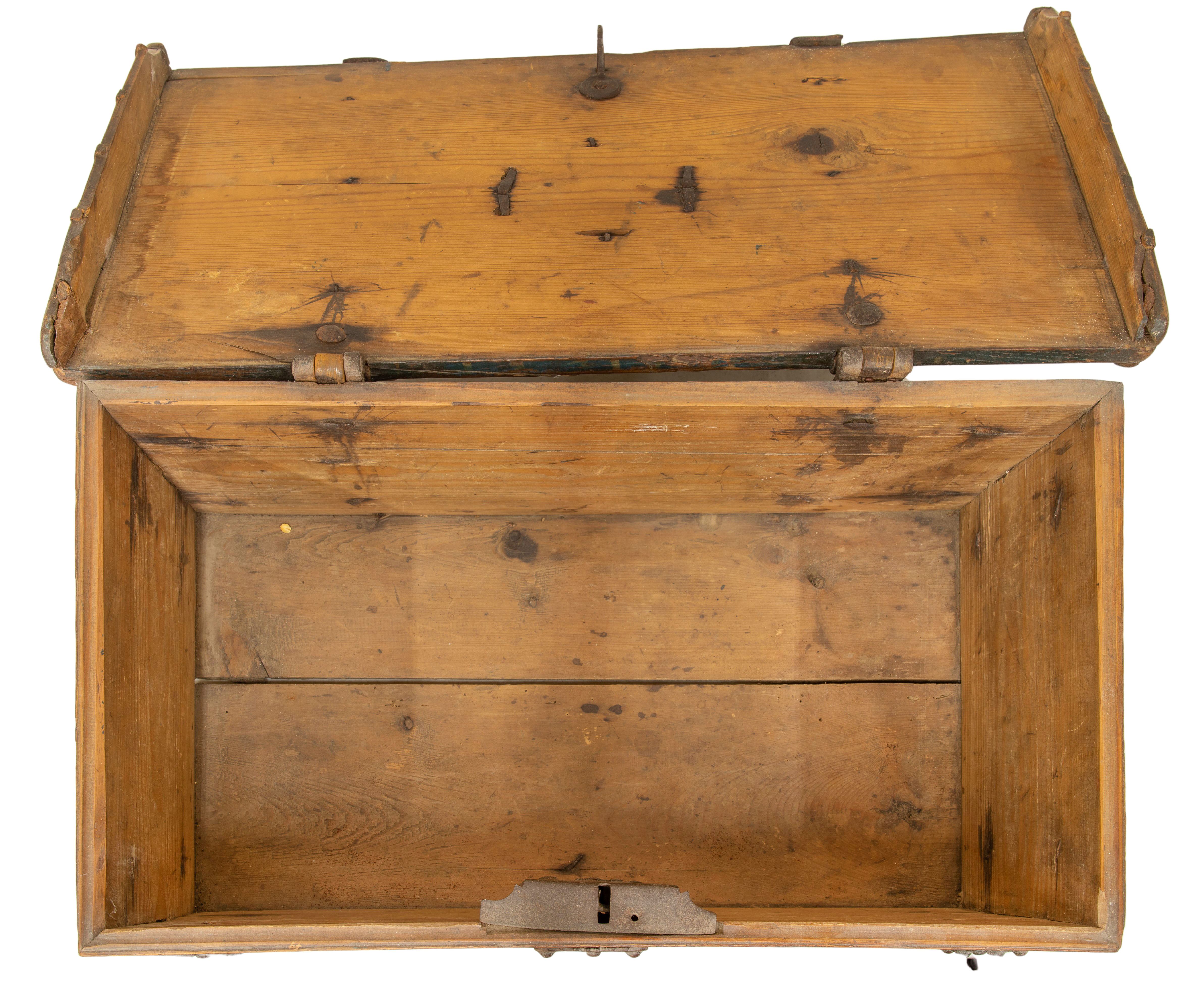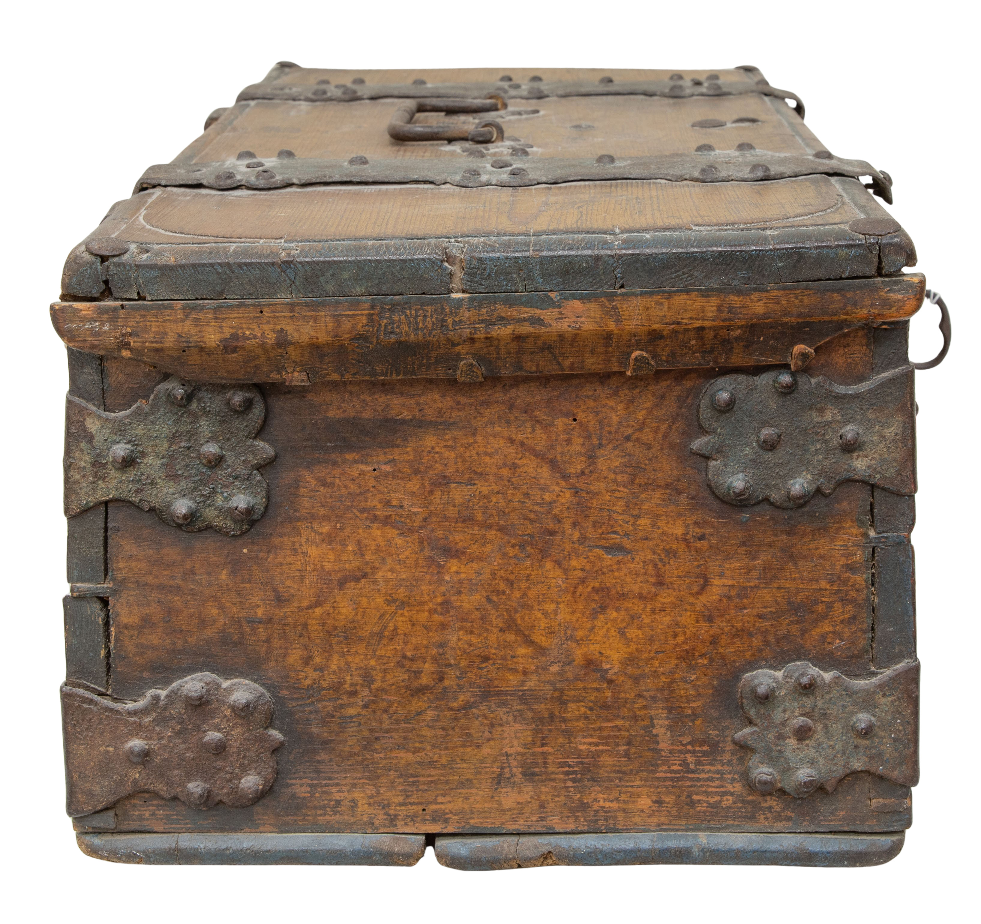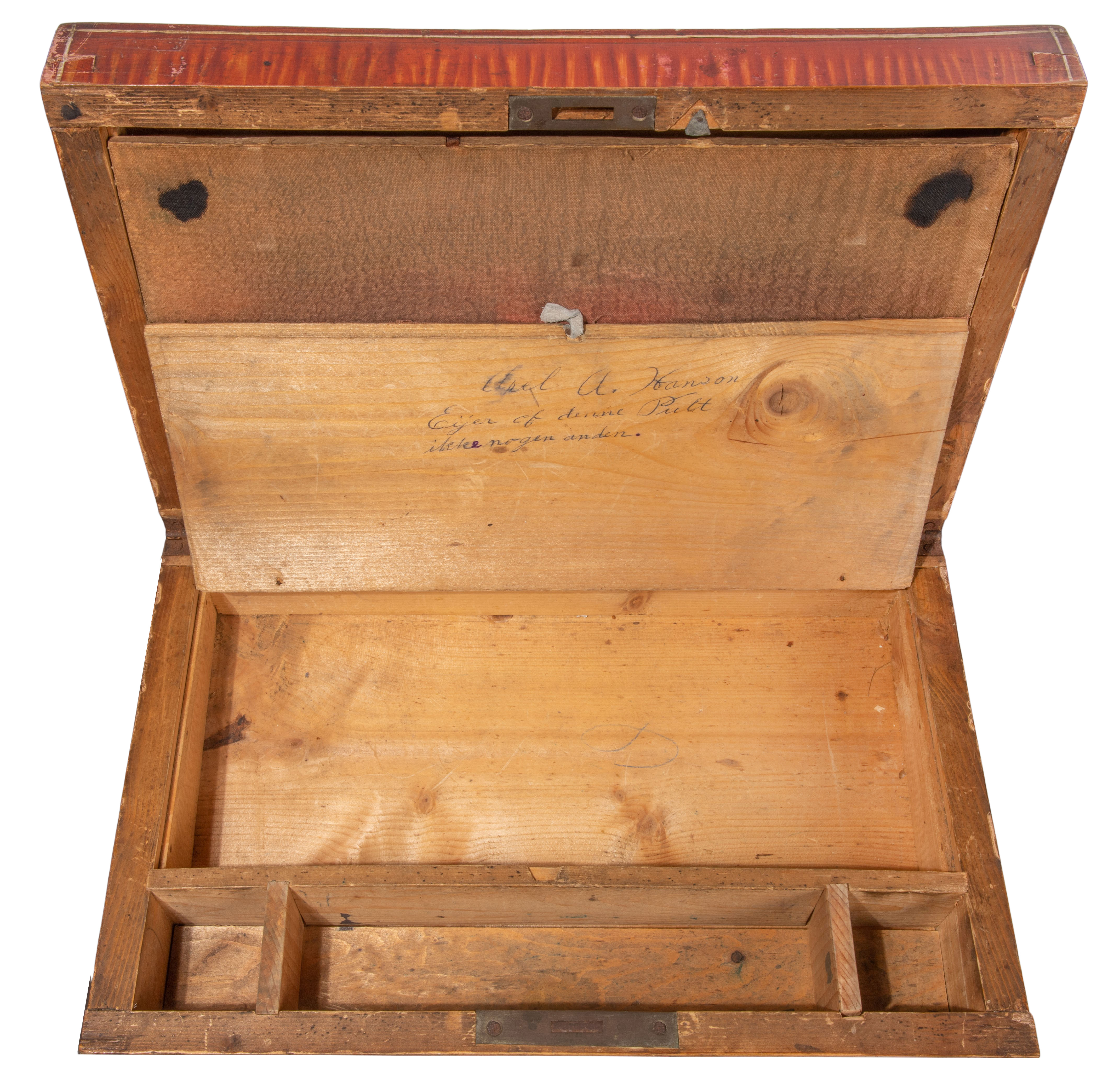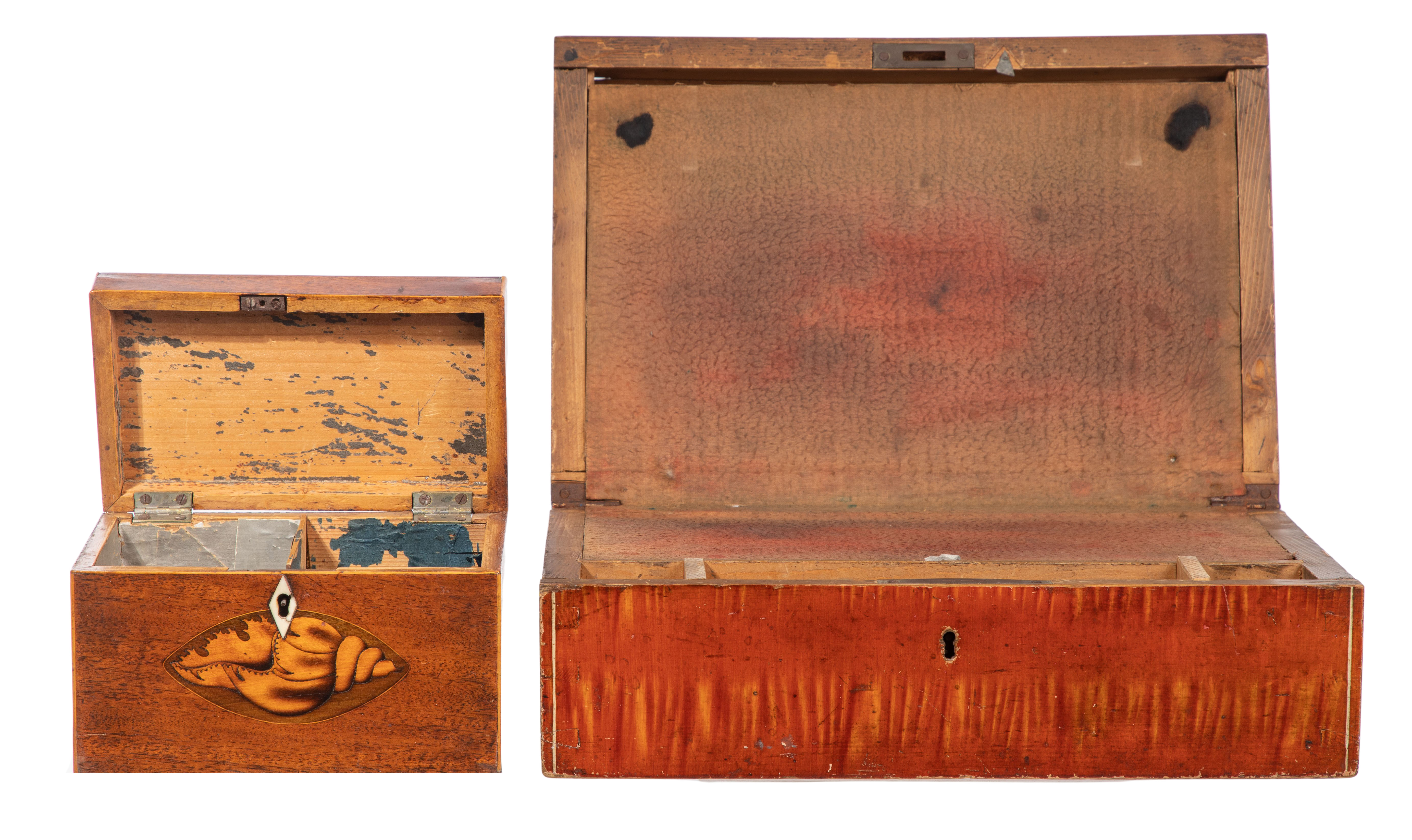 (3) total items including a wood and iron strong box dated 1837 and initialed on the front, including key; together with a lap desk having floral motif and a hinged tobacco box having shell motif