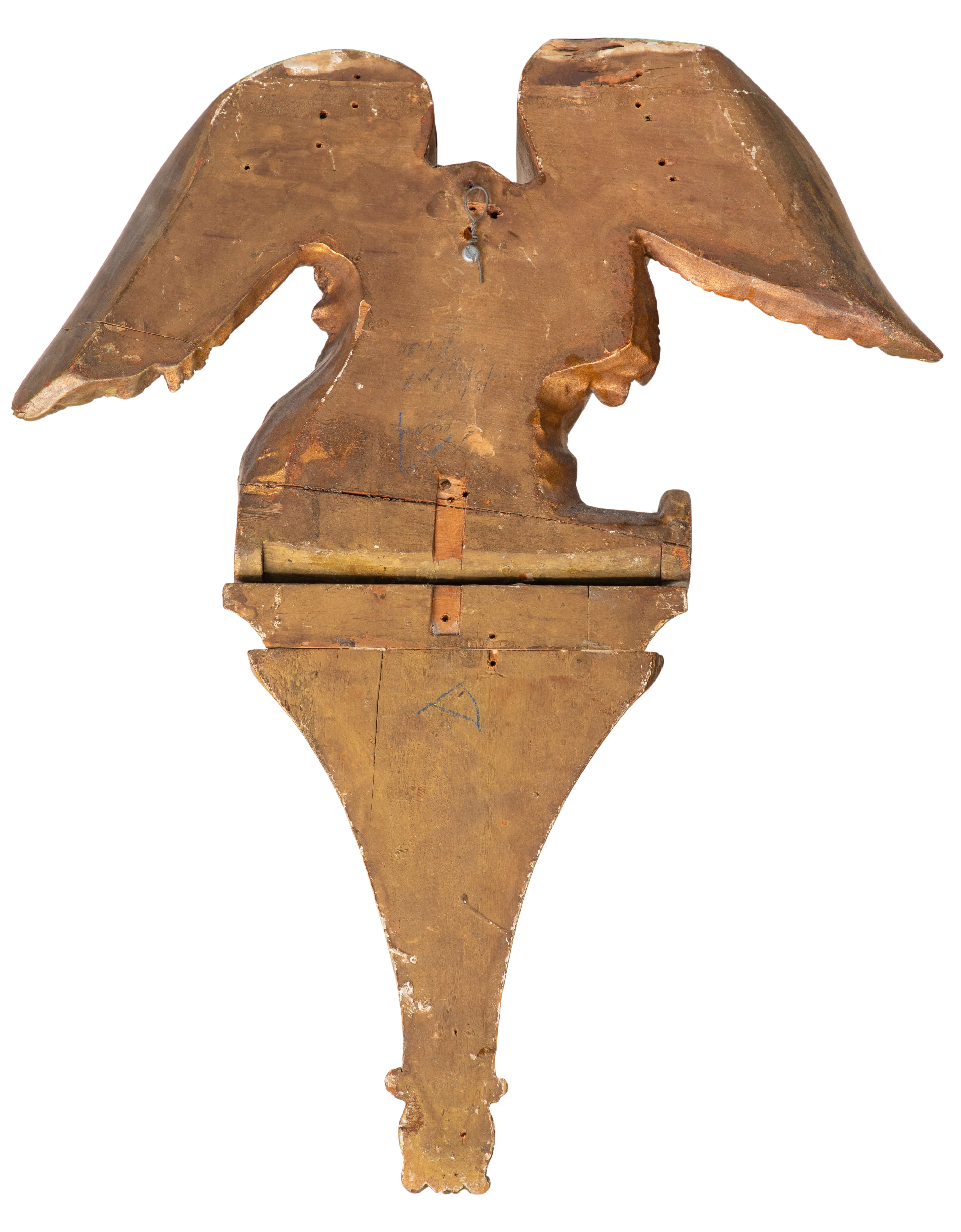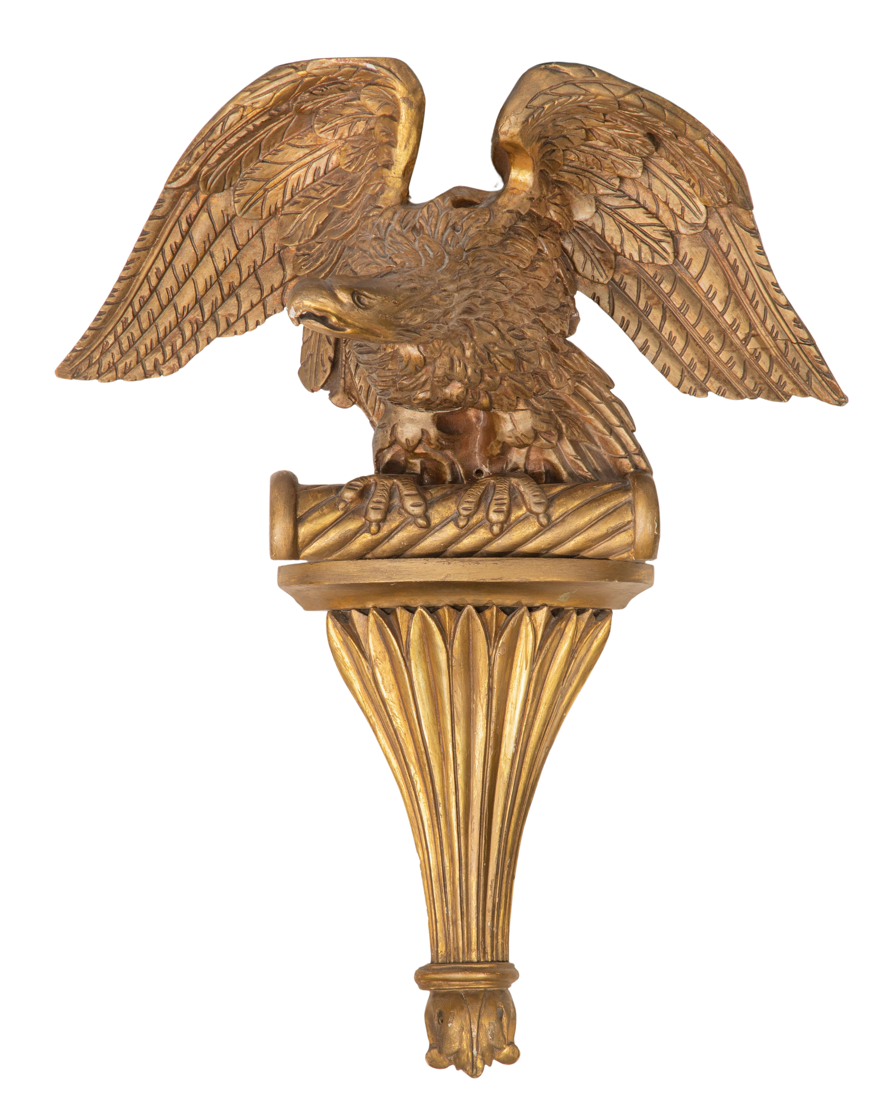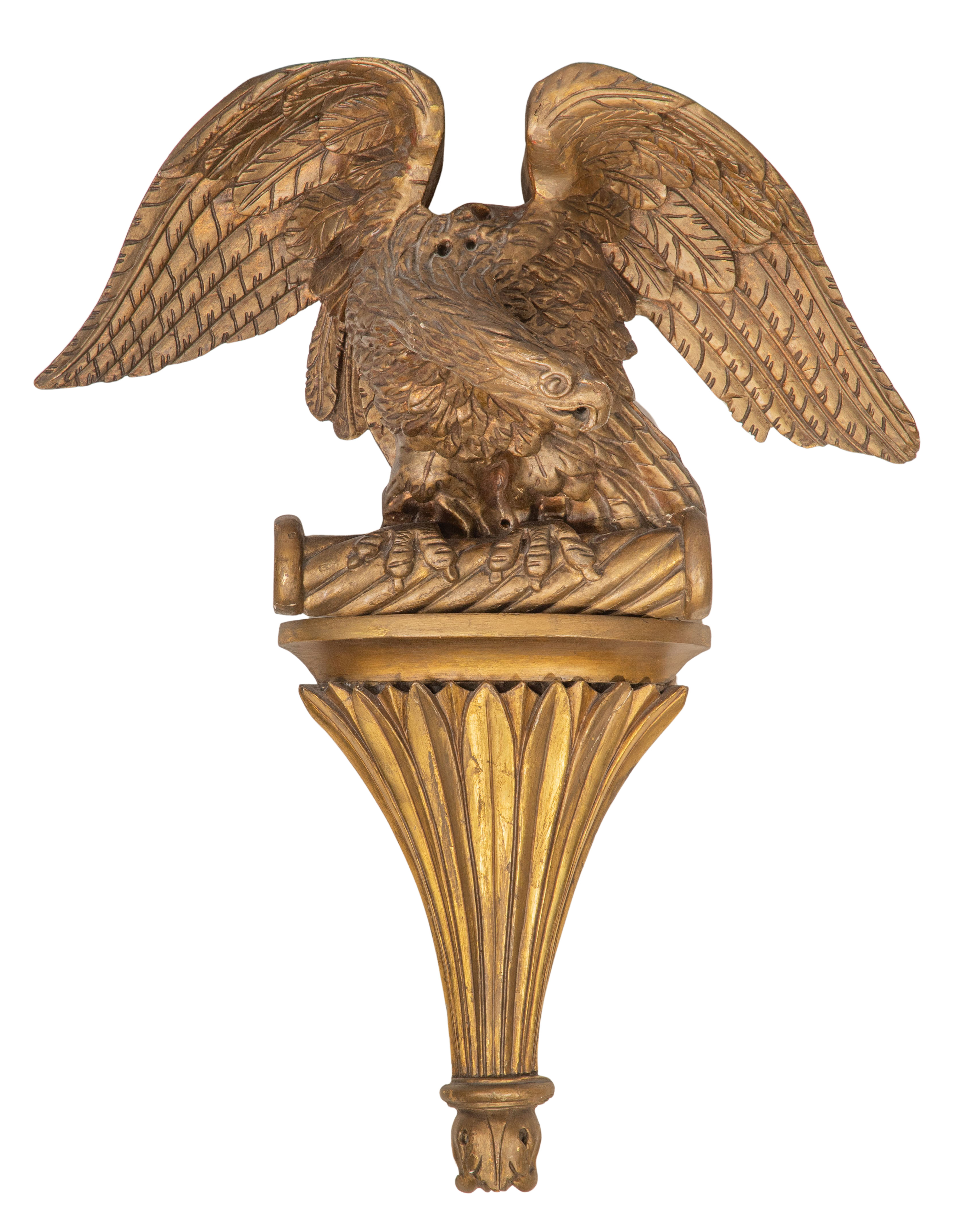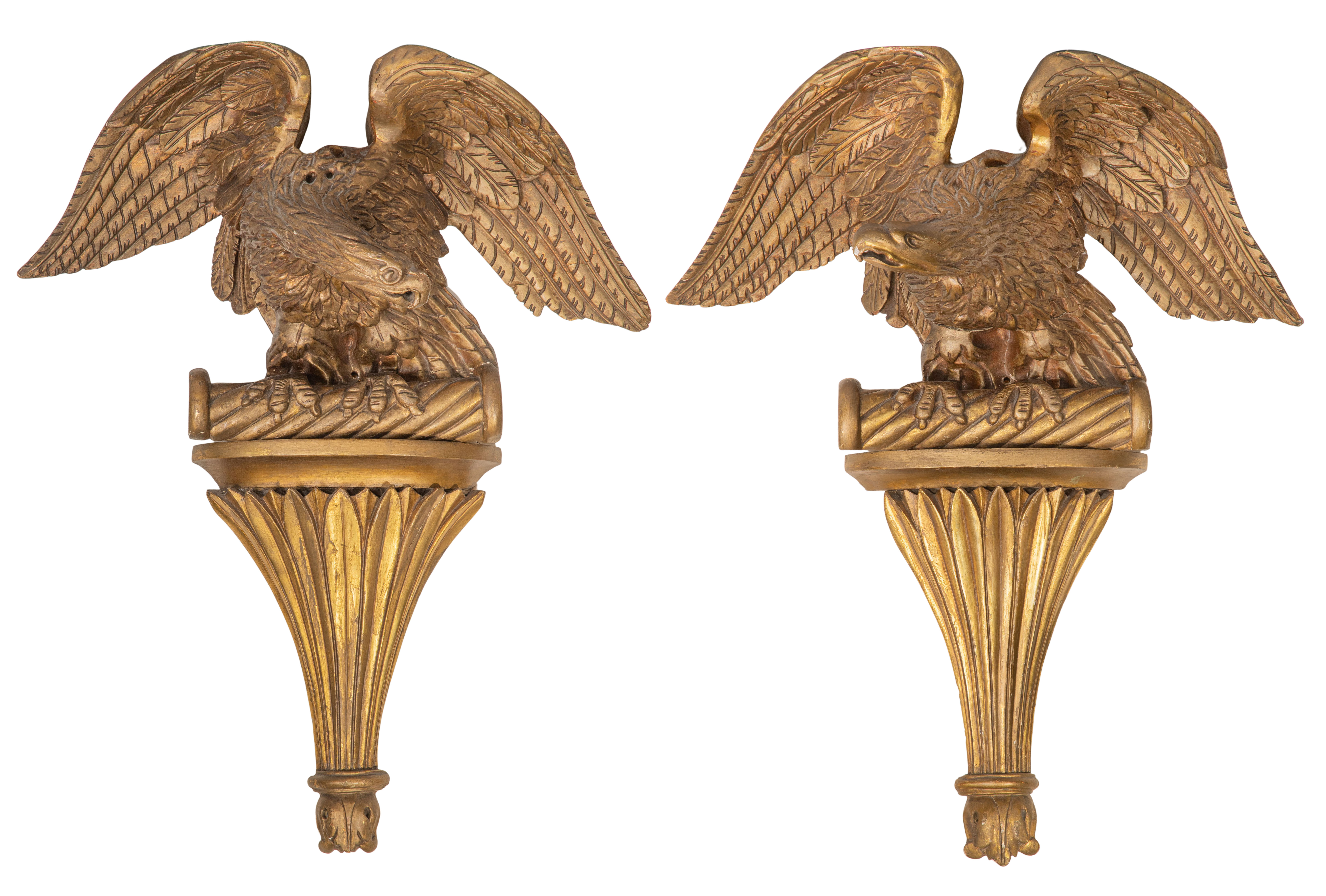 A pair of hand carved wall hangings having a perched spread wing federal style eagle design