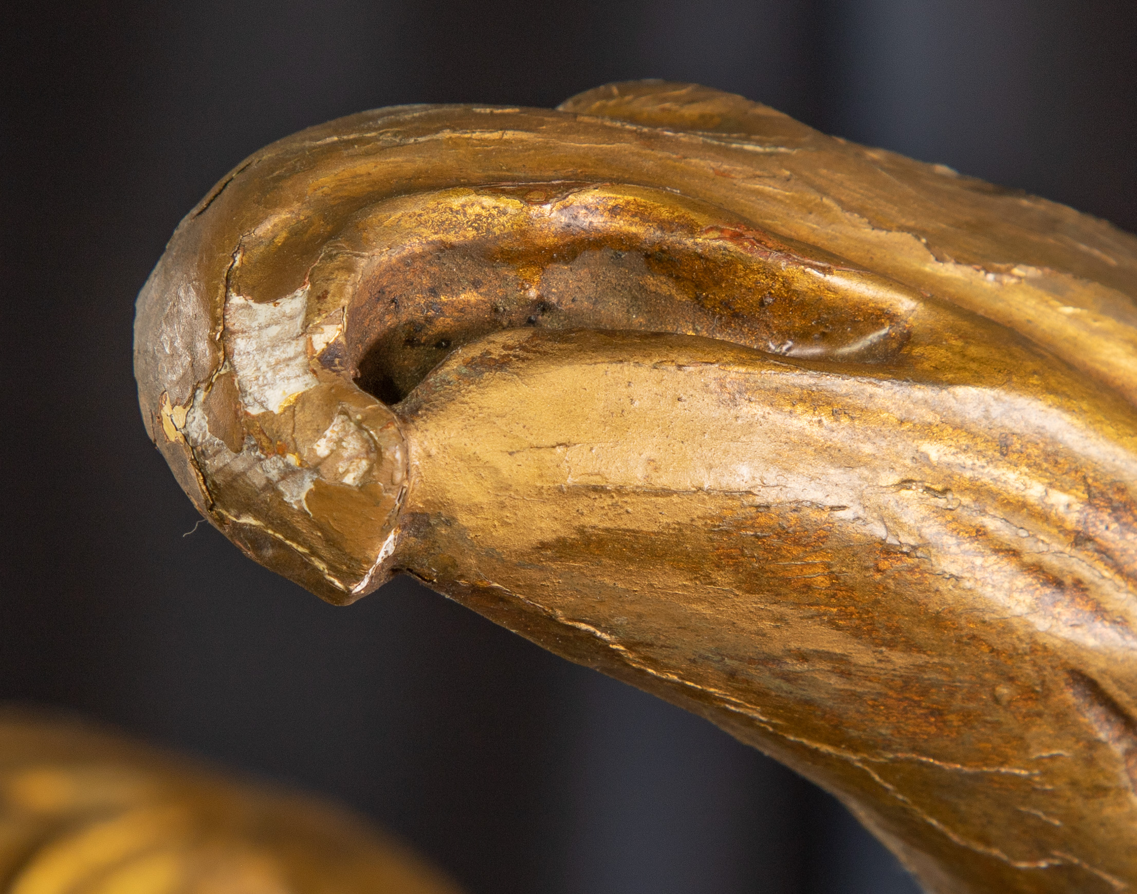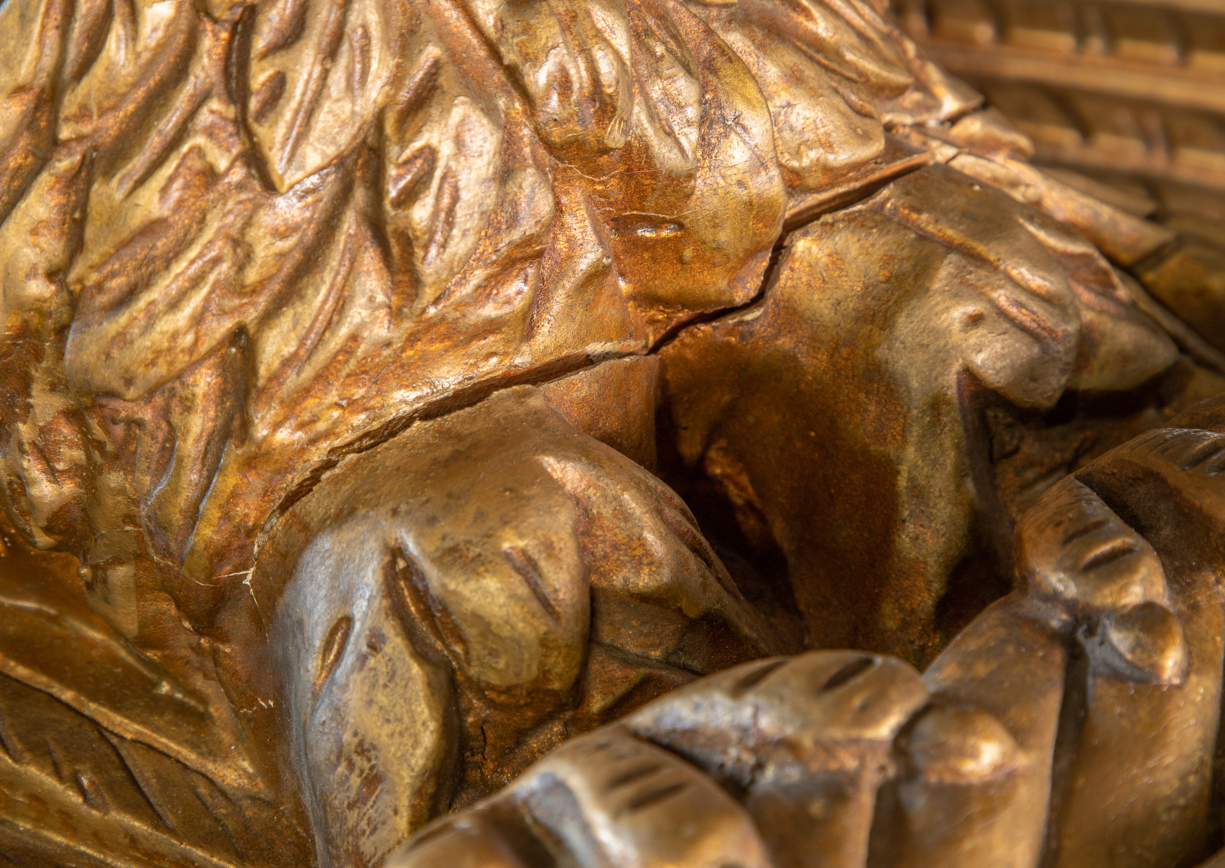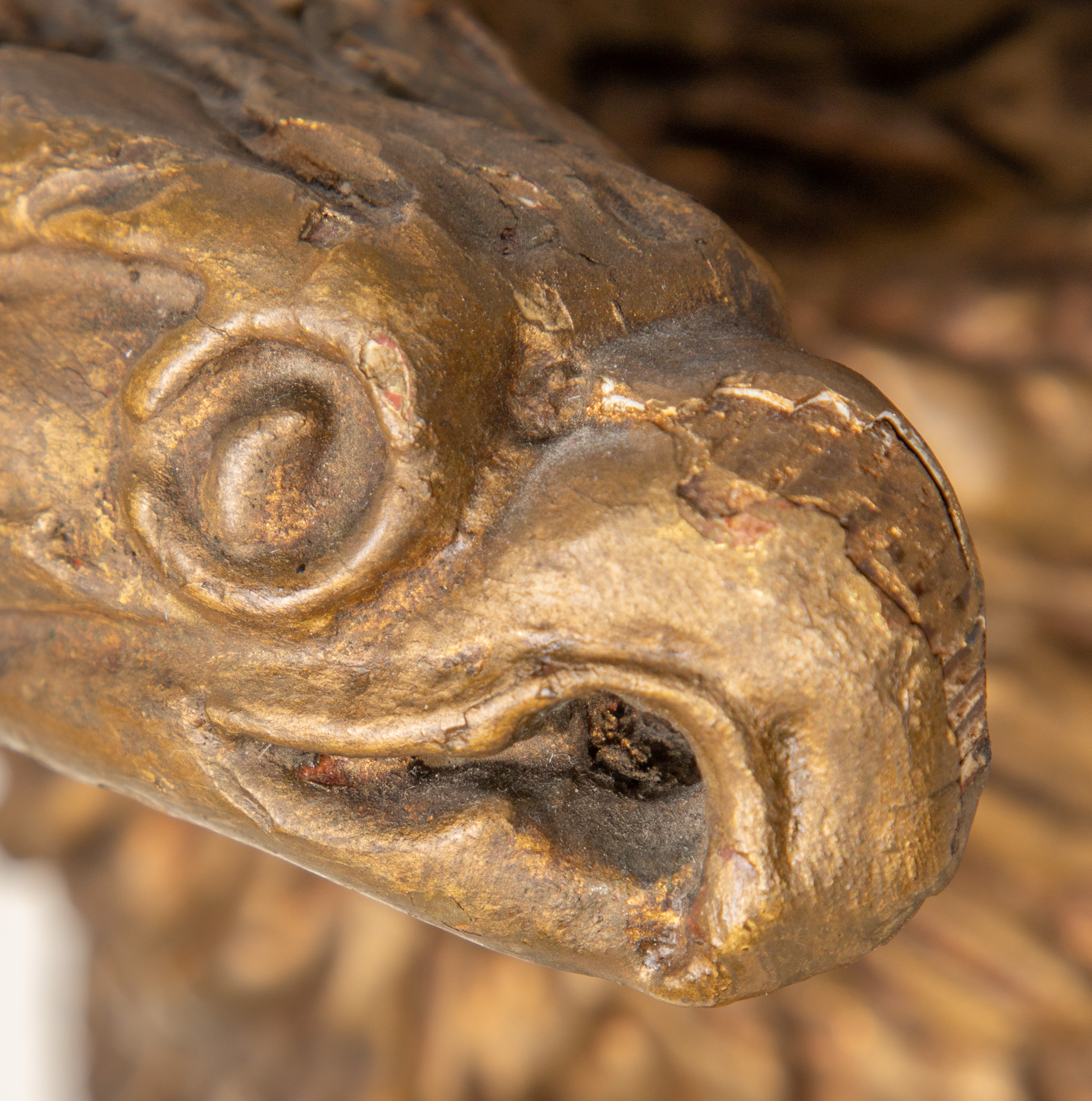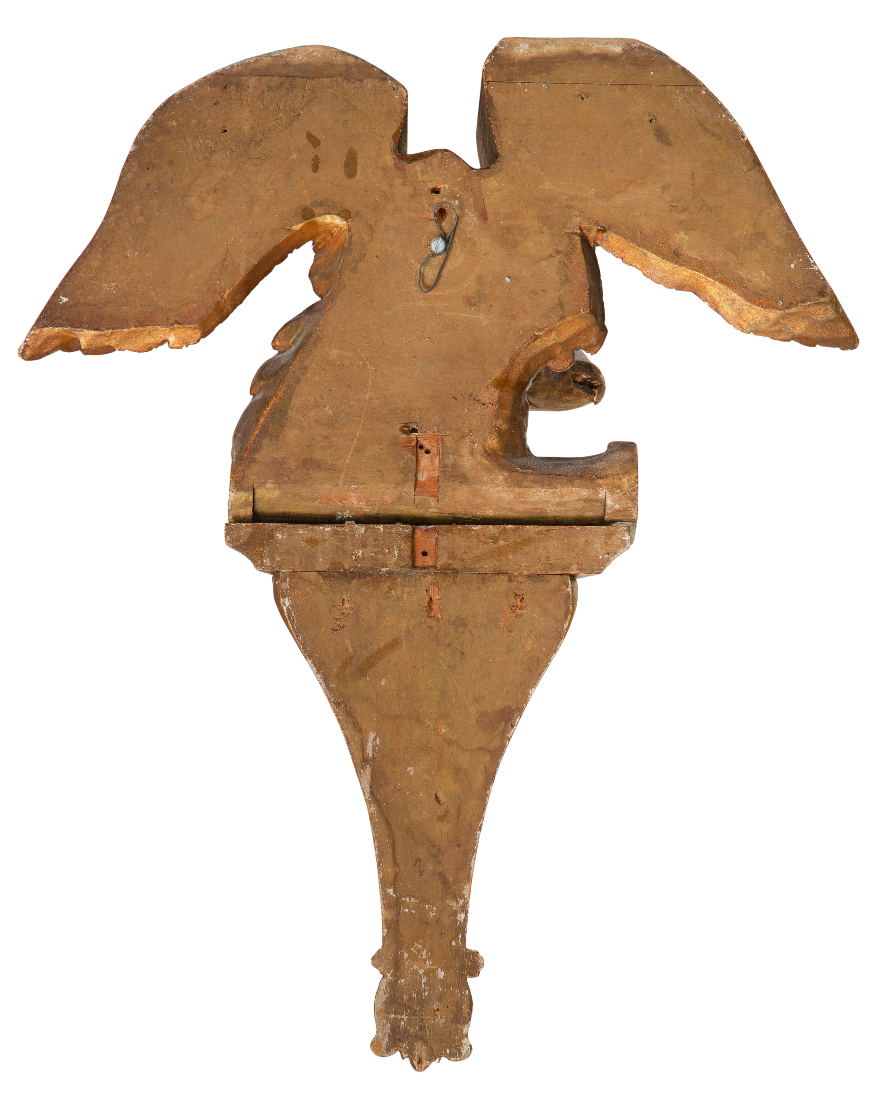 A pair of hand carved wall hangings having a perched spread wing federal style eagle design