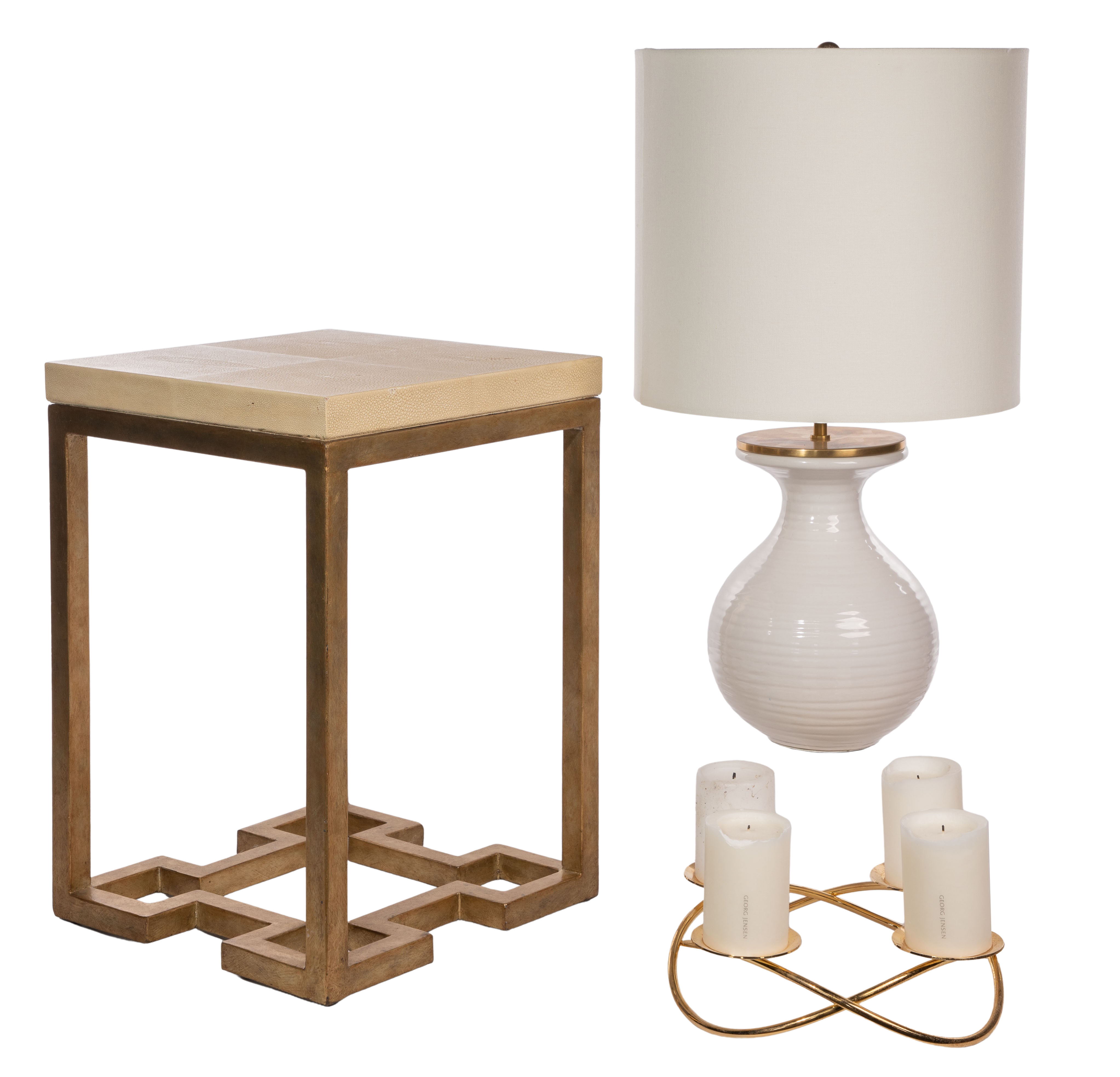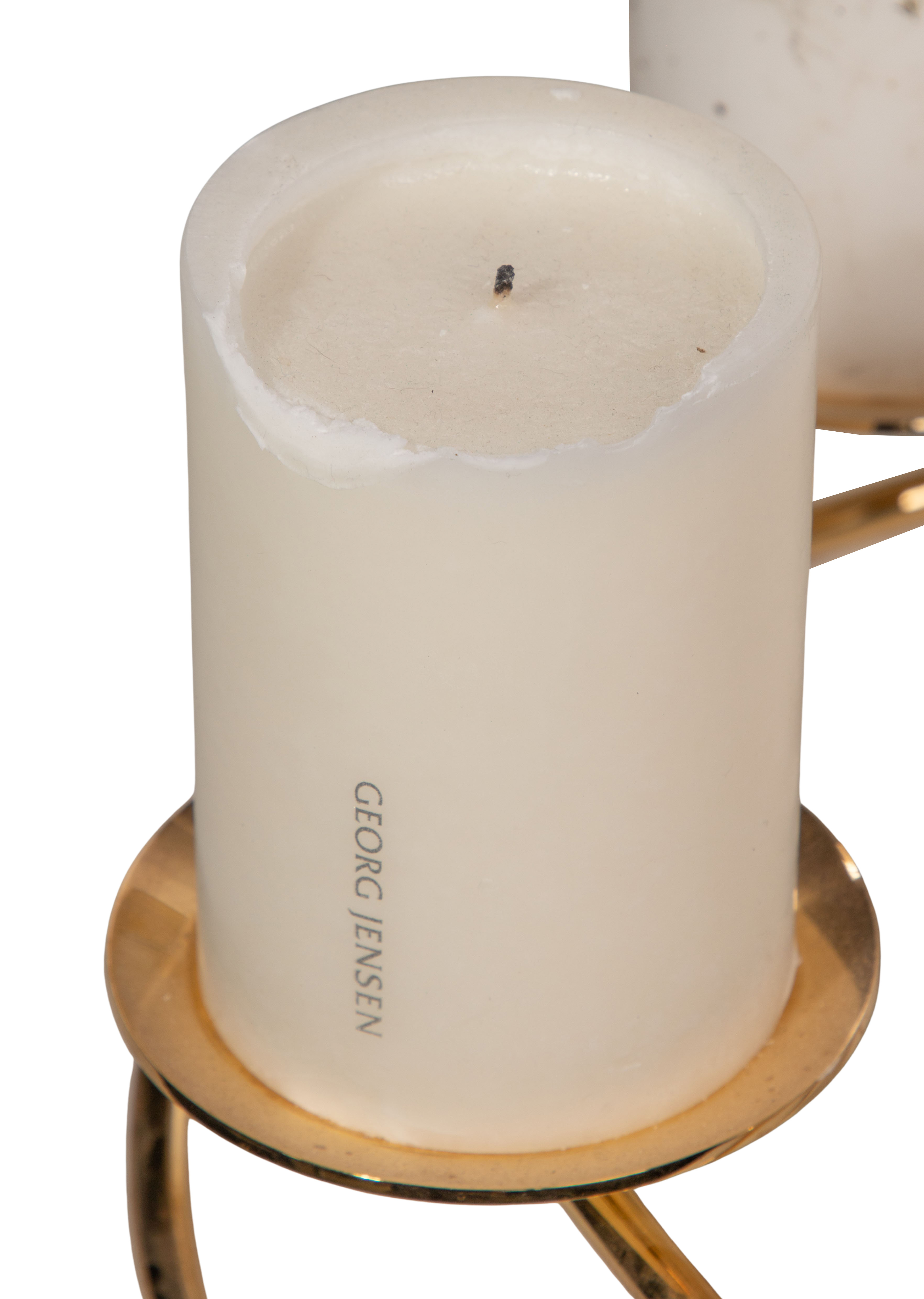 (3) items including an Intertek glazed white pottery lamp having a shade, a lamp stand and a candle holder retaining four Georg Jensen candles