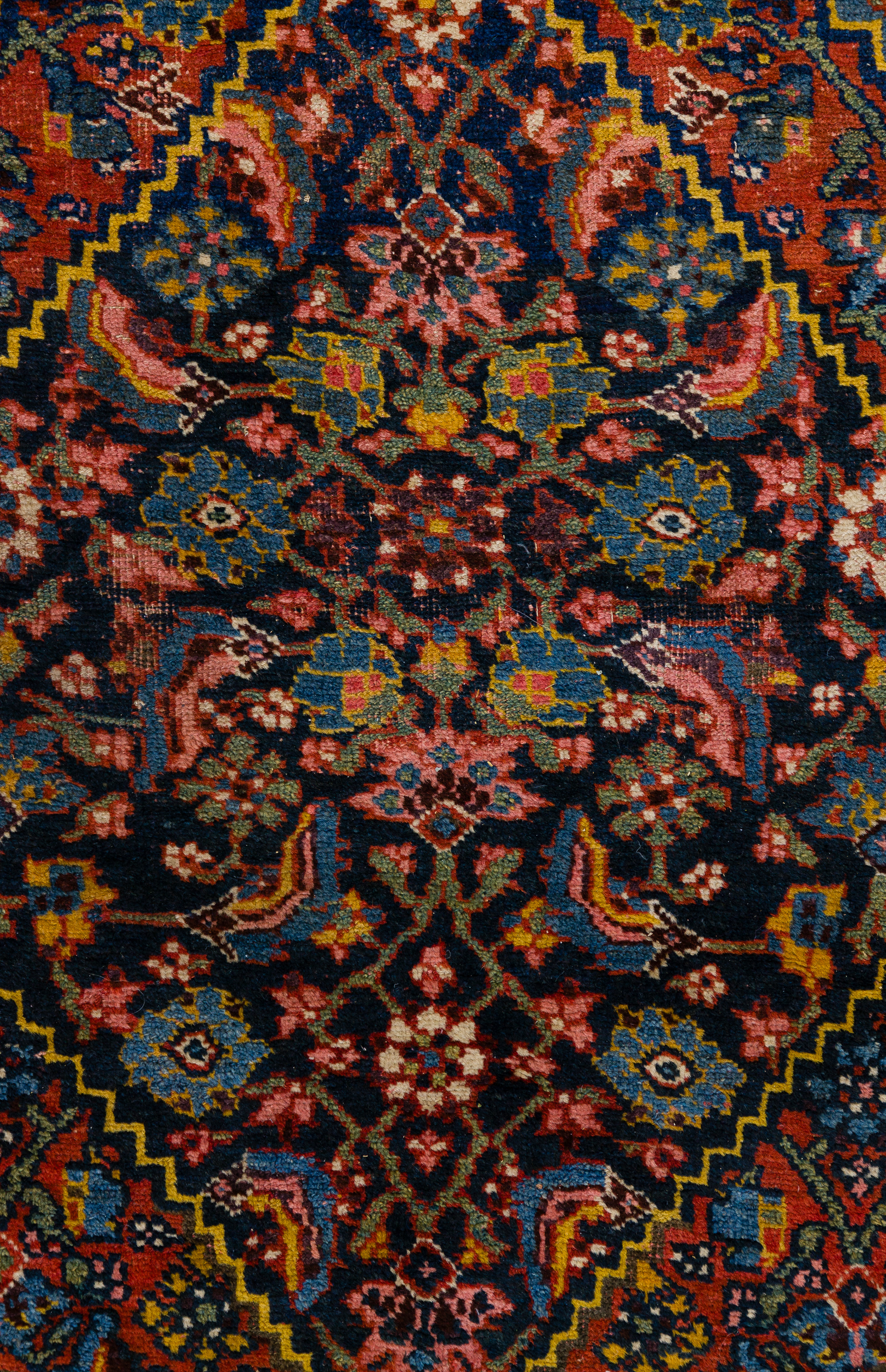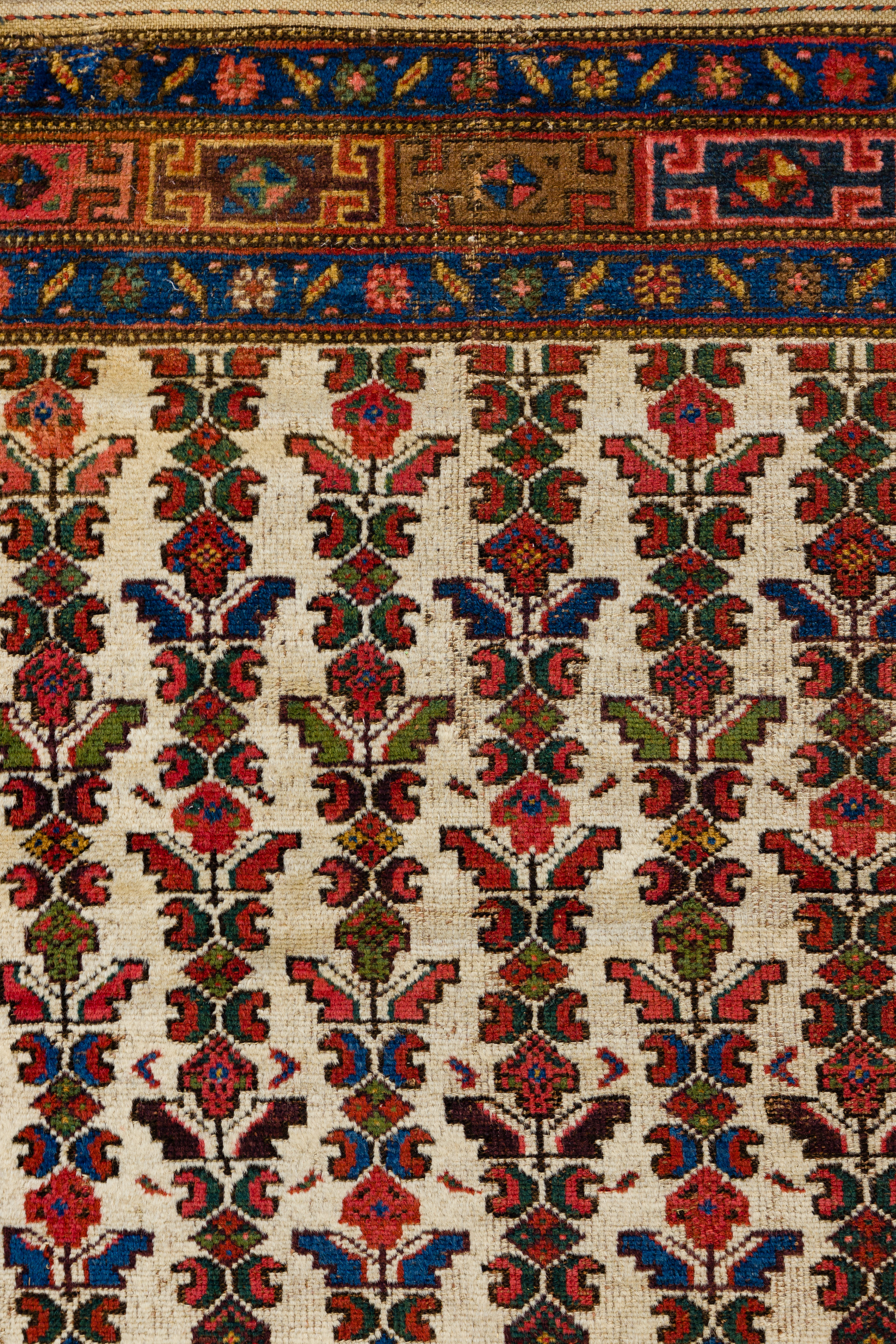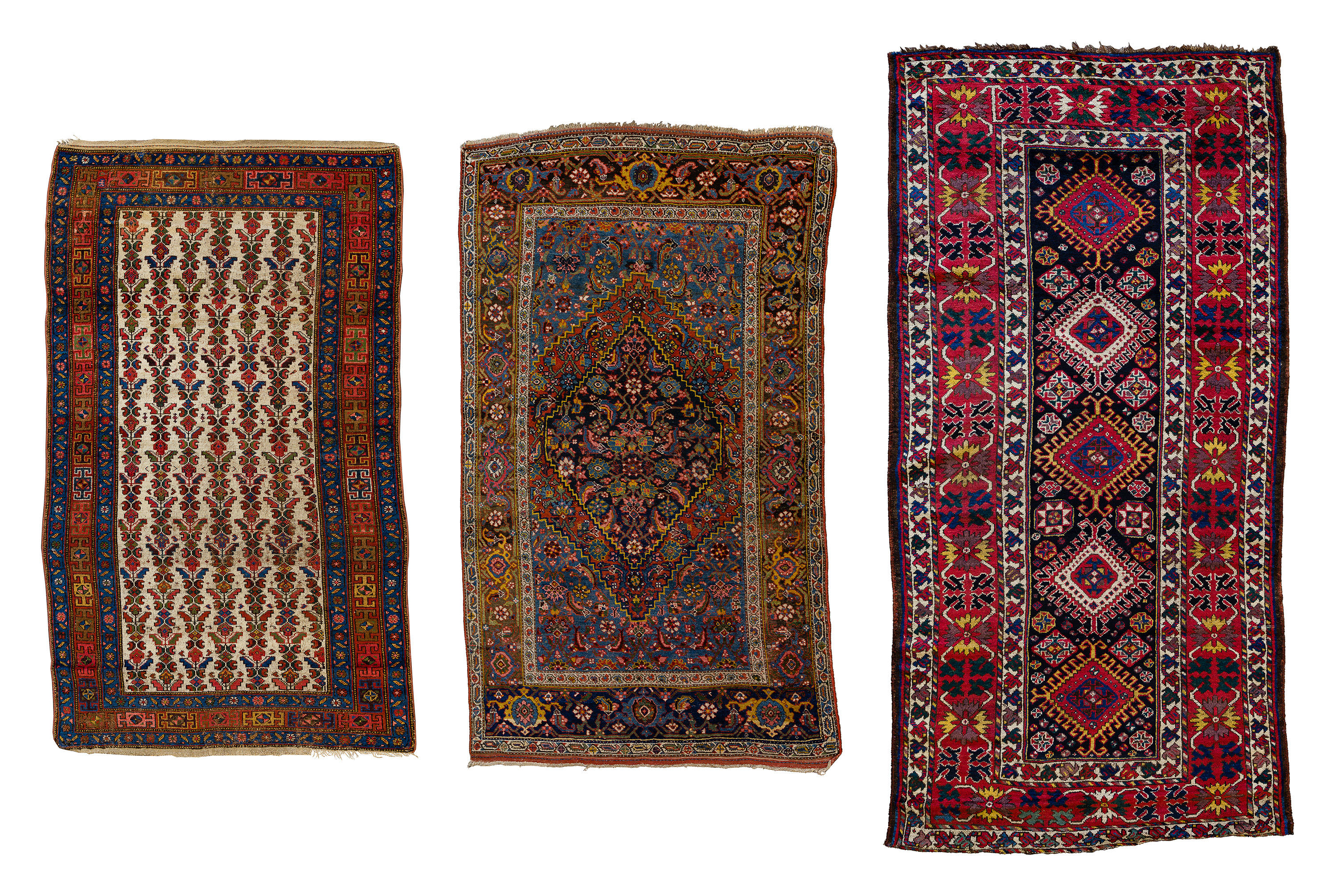 (3) items including a hand knotted having an abstract geometric design in hues of green, gold, rust and mauve on a blue field (largest), a hand knotted having an abstract geometric design in hues of blue, green and rust on a cream field (6 ft. 6 in. by 4 ft.) and an abstract floral in hues of rust, green, gold and yellow on a blue field (7 ft by 4 ft. 1.5 in)